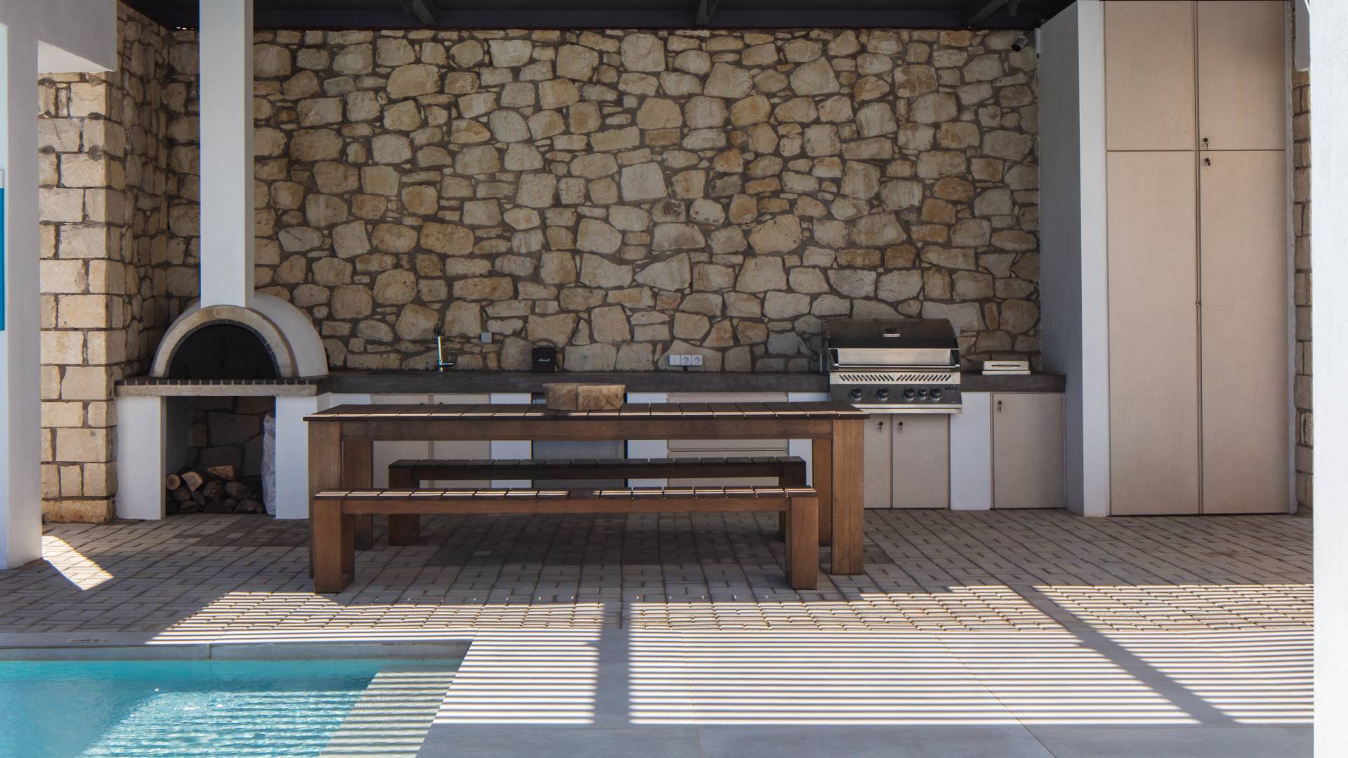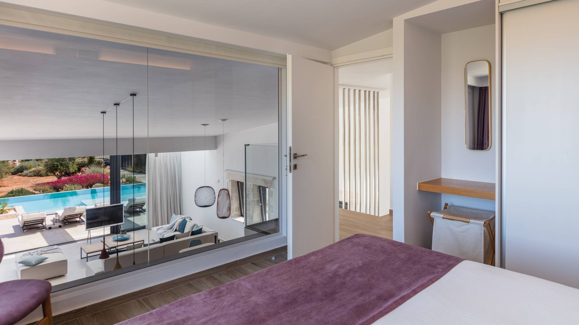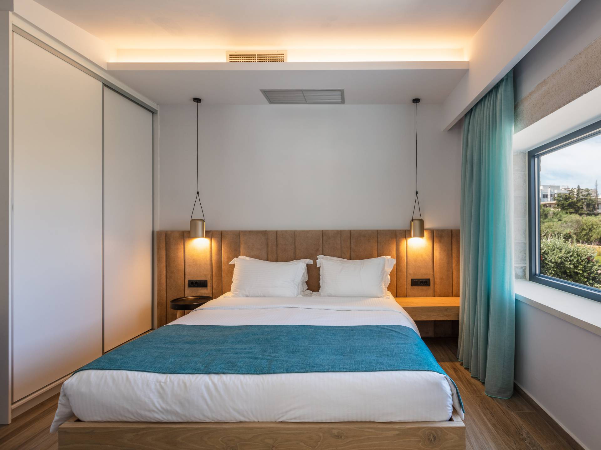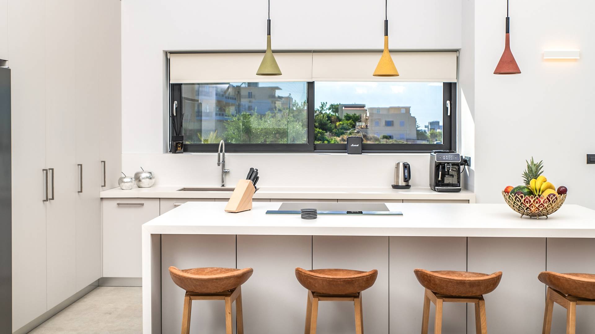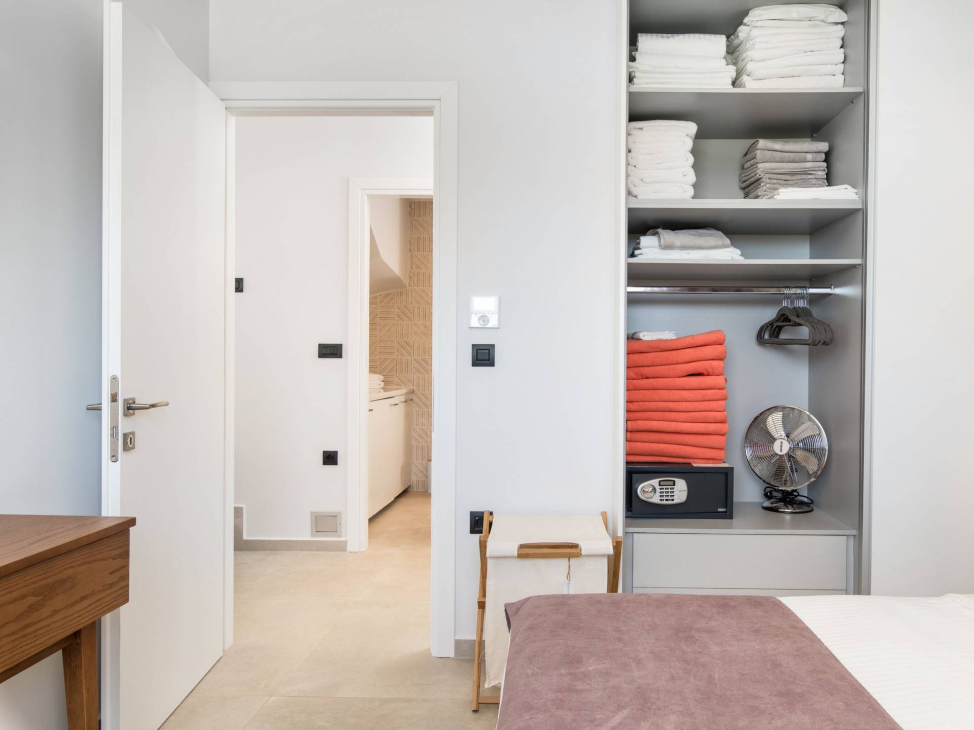 El cómodo sofá de la esquina, colocado en la parte delantera de la sala de estar, frente a la pared de la ventana realmente enorme, ofrece vistas increíblemente hermosas de los jardines, la piscina, el mar y una puesta de sol realmente hermosa. El sistema de audio de última tecnología, TV LED de pantalla plana vía satélite, reproductor de DVD, computadora portátil e impresora completan el equipamiento de la sala en términos de instalaciones y comodidades. Uno de los dos dormitorios principales, ubicado en la planta baja, tiene una cómoda cama de matrimonio de 1,60 x 2,00, mientras que en el segundo la cama con unas dimensiones iniciales de 1,80 x 2,00 se puede convertir en dos camas individuales de 0,90 x 2,00. Todos los productos para dormir provienen de la galardonada empresa COCO-MAT, ofreciendo así un sueño saludable y de calidad a quienes confiarán en nosotros para sus vacaciones.