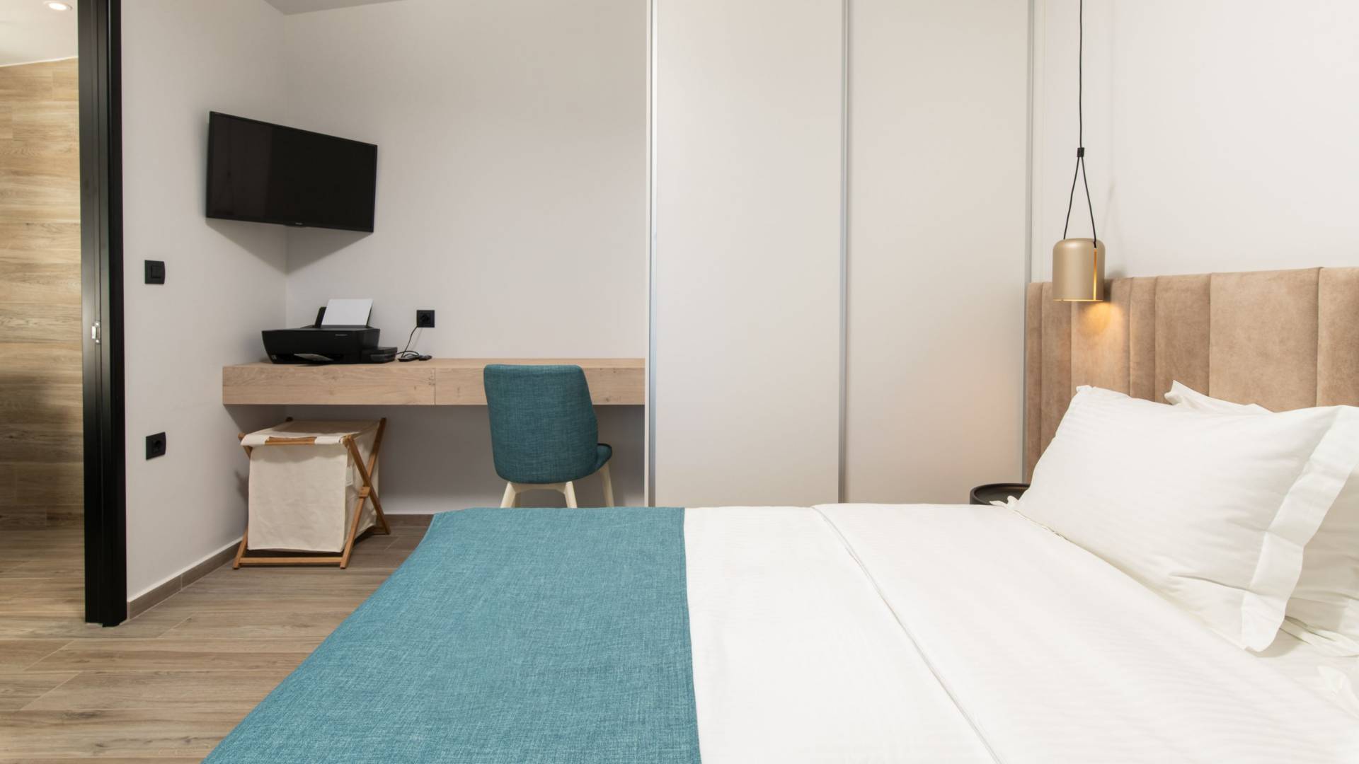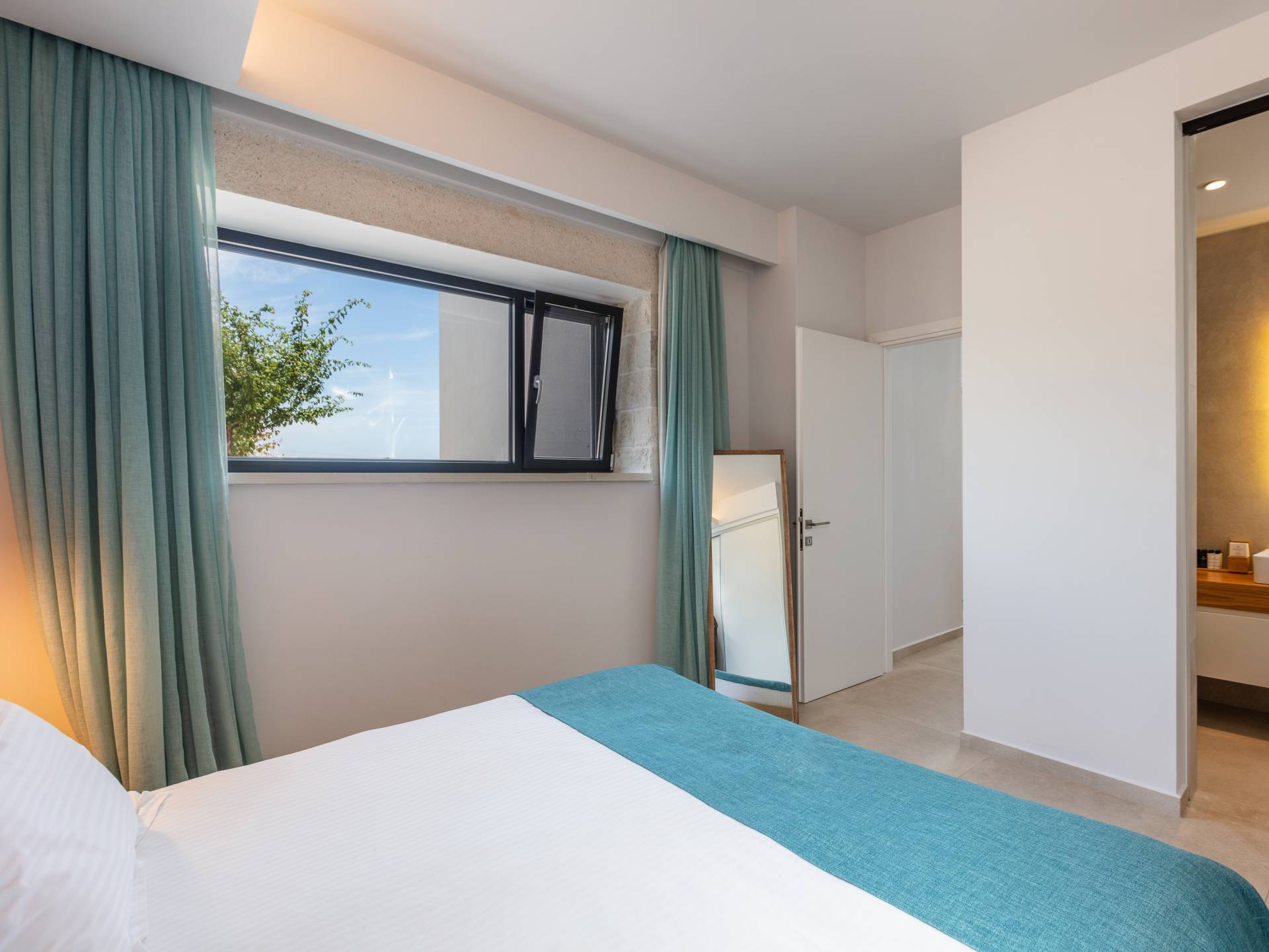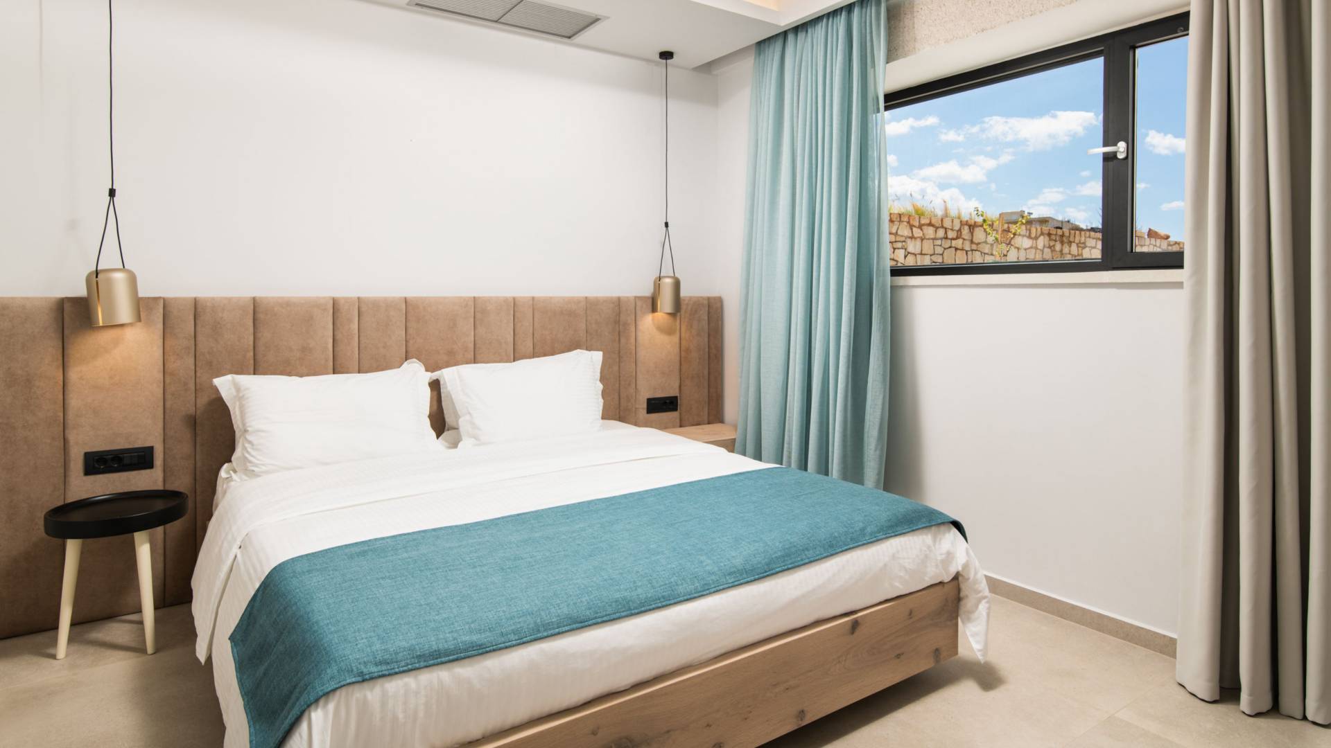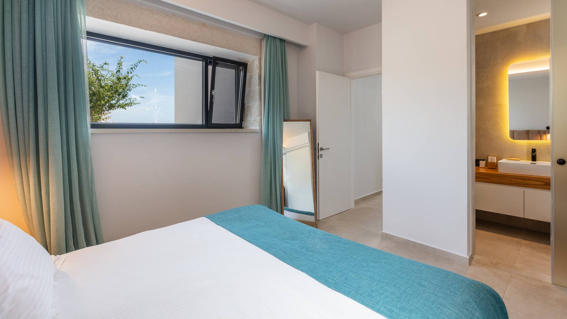 El cómodo sofá de la esquina, colocado en la parte delantera de la sala de estar, frente a la pared de la ventana realmente enorme, ofrece vistas increíblemente hermosas de los jardines, la piscina, el mar y una puesta de sol realmente hermosa. El sistema de audio de última tecnología, TV LED de pantalla plana vía satélite, reproductor de DVD, computadora portátil e impresora completan el equipamiento de la sala en términos de instalaciones y comodidades. Uno de los dos dormitorios principales, ubicado en la planta baja, tiene una cómoda cama de matrimonio de 1,60 x 2,00, mientras que en el segundo la cama con unas dimensiones iniciales de 1,80 x 2,00 se puede convertir en dos camas individuales de 0,90 x 2,00. Todos los productos para dormir provienen de la galardonada empresa COCO-MAT, ofreciendo así un sueño saludable y de calidad a quienes confiarán en nosotros para sus vacaciones.