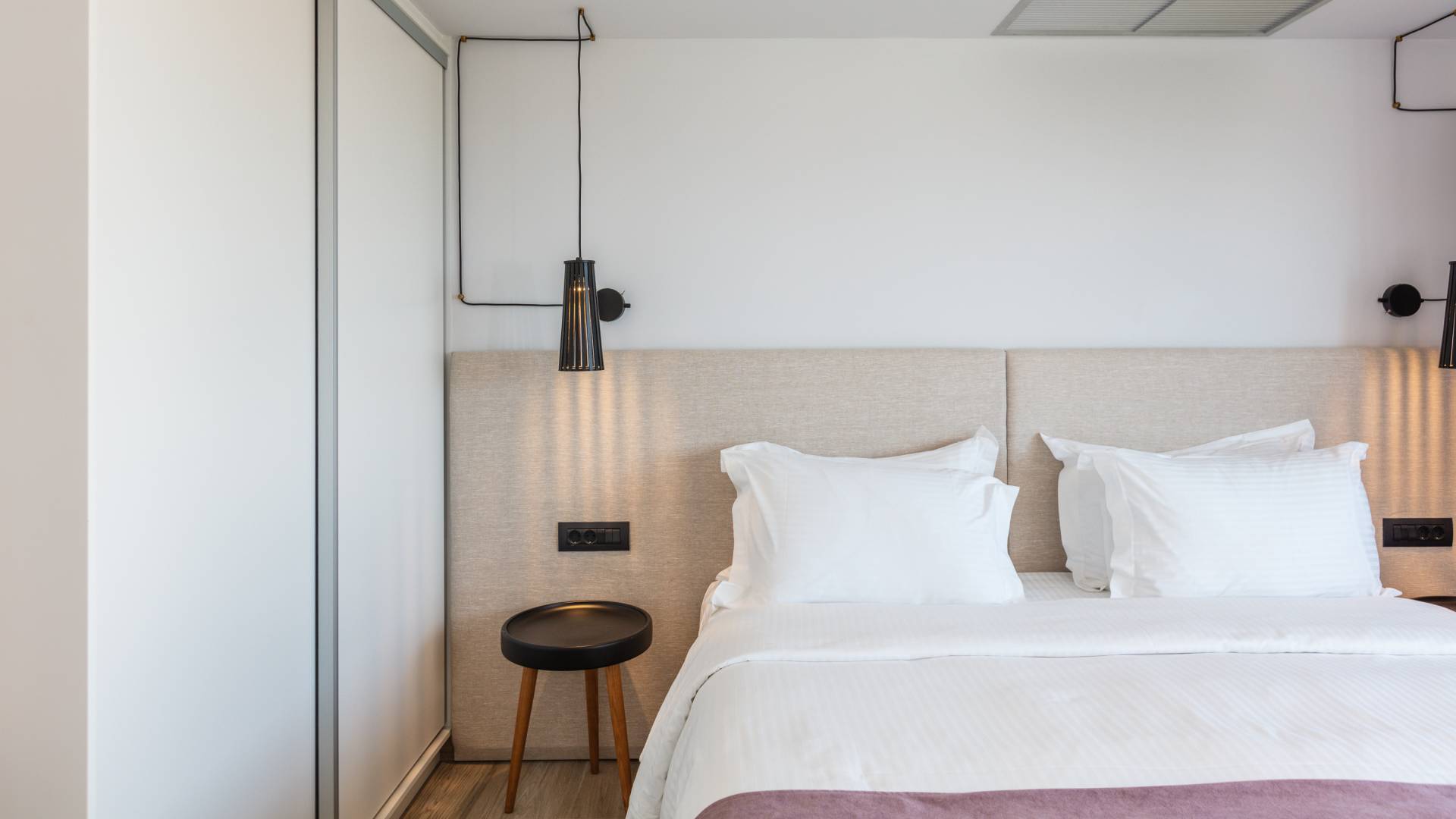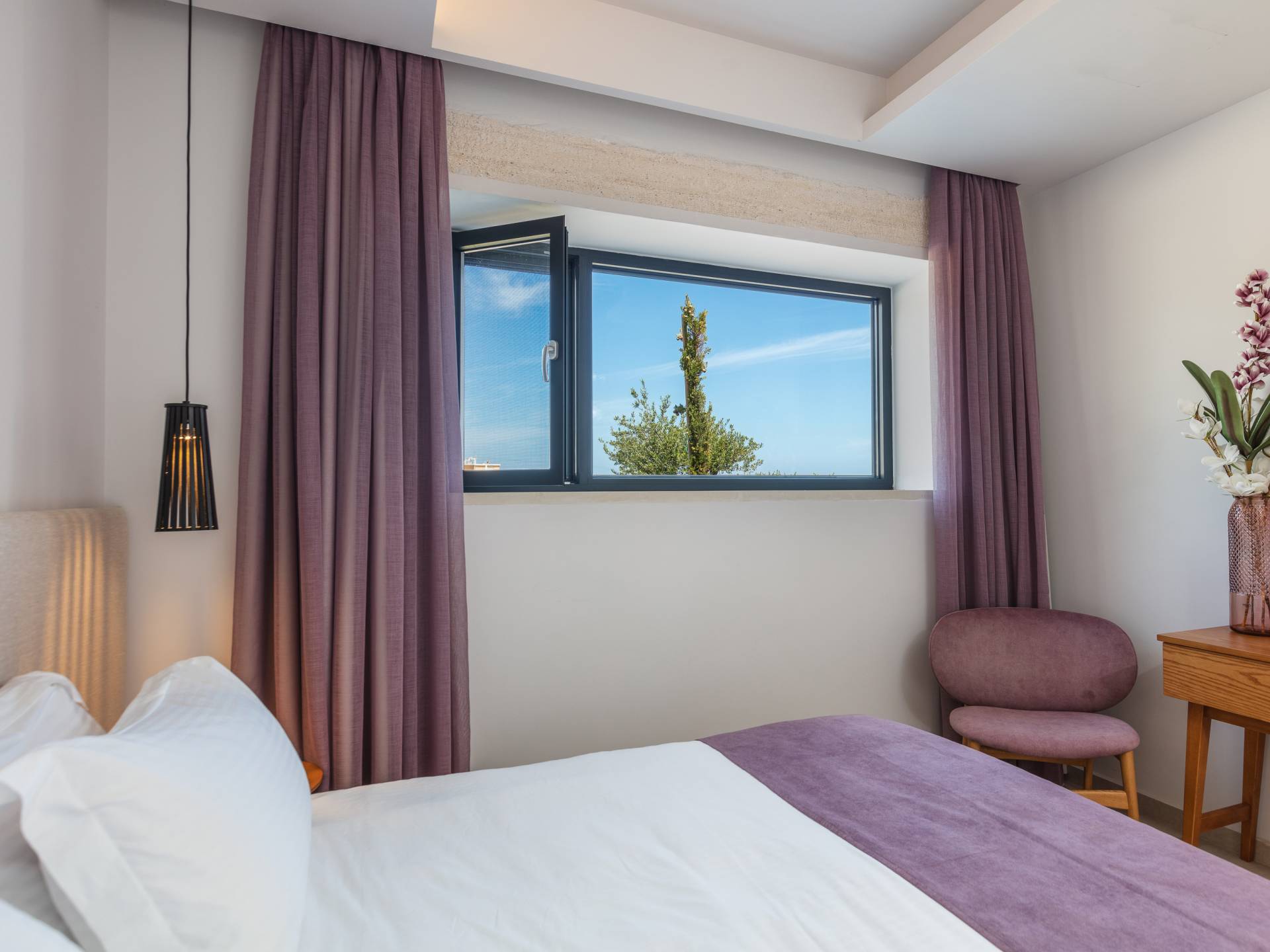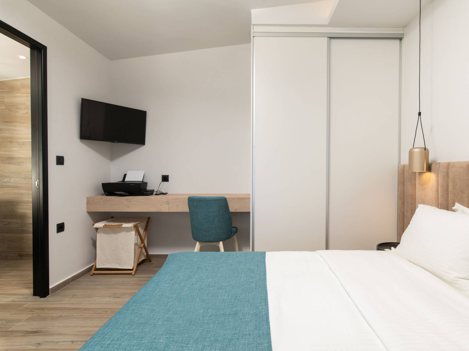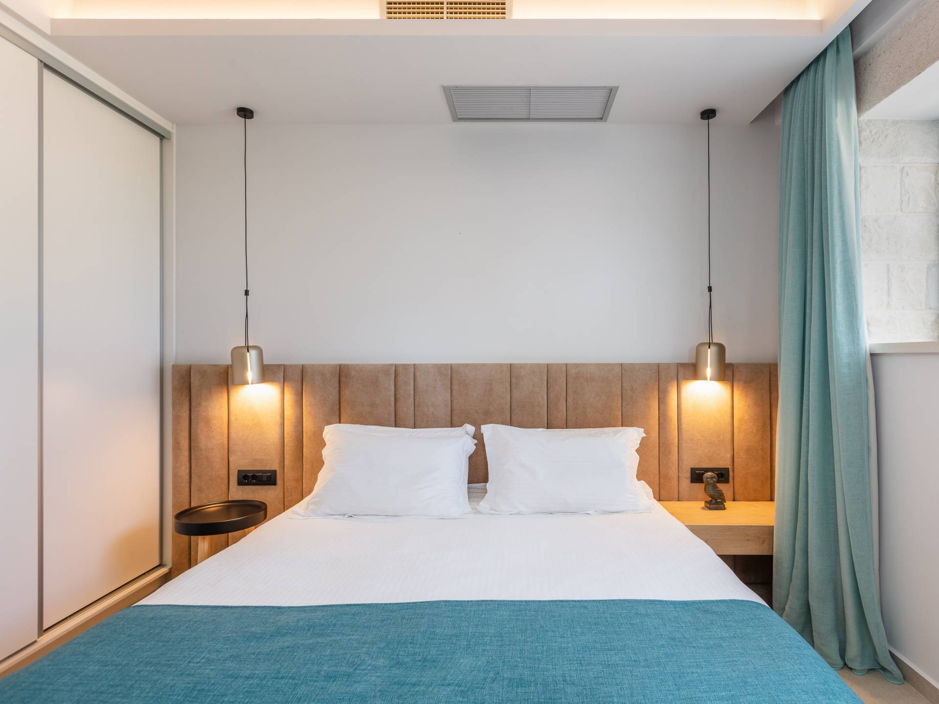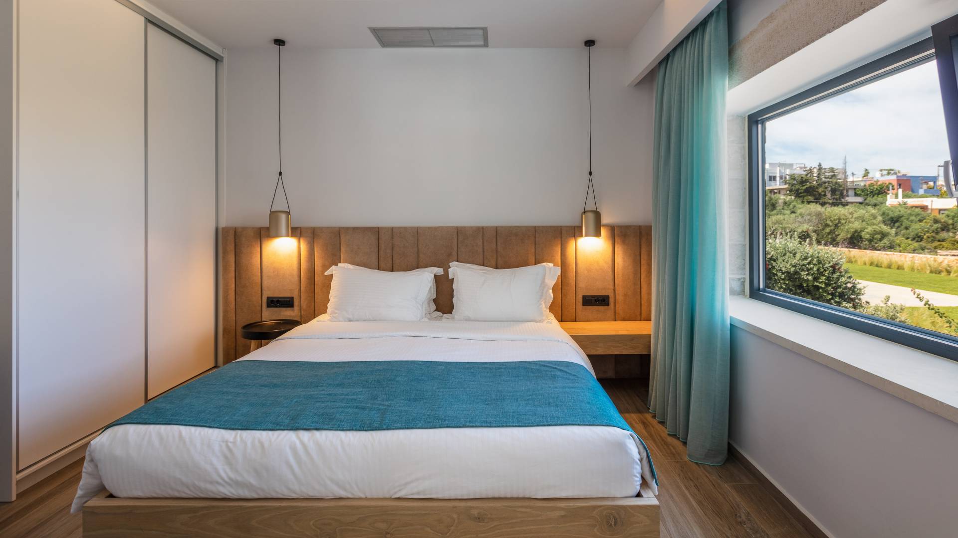 El cómodo sofá de la esquina, colocado en la parte delantera de la sala de estar, frente a la pared de la ventana realmente enorme, ofrece vistas increíblemente hermosas de los jardines, la piscina, el mar y una puesta de sol realmente hermosa. El sistema de audio de última tecnología, TV LED de pantalla plana vía satélite, reproductor de DVD, computadora portátil e impresora completan el equipamiento de la sala en términos de instalaciones y comodidades. Uno de los dos dormitorios principales, ubicado en la planta baja, tiene una cómoda cama de matrimonio de 1,60 x 2,00, mientras que en el segundo la cama con unas dimensiones iniciales de 1,80 x 2,00 se puede convertir en dos camas individuales de 0,90 x 2,00. Todos los productos para dormir provienen de la galardonada empresa COCO-MAT, ofreciendo así un sueño saludable y de calidad a quienes confiarán en nosotros para sus vacaciones.