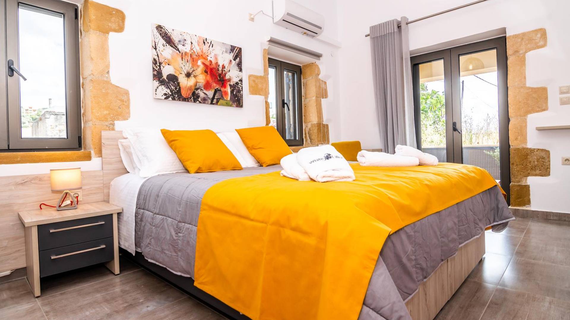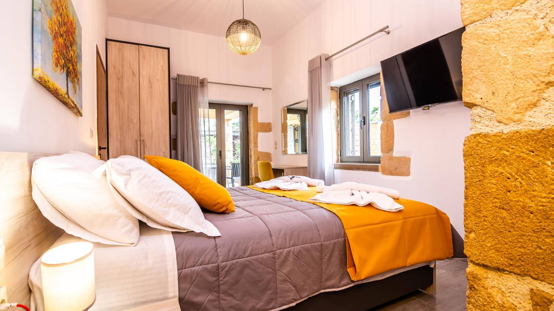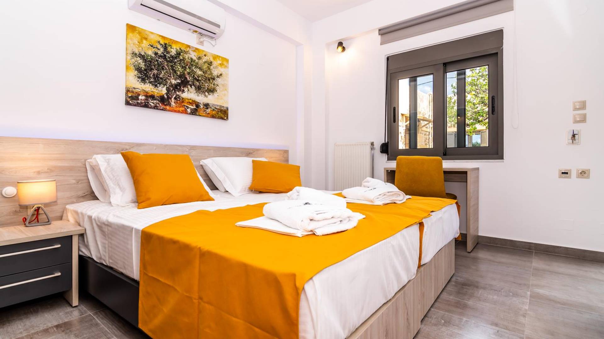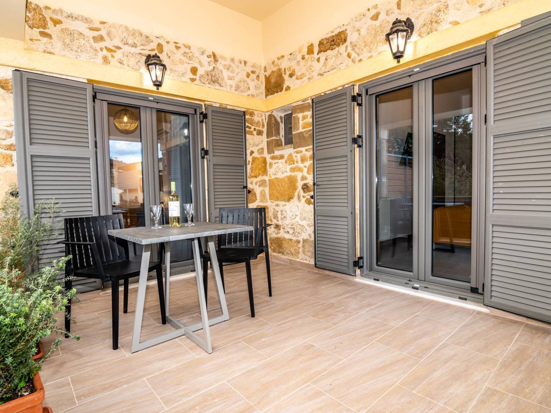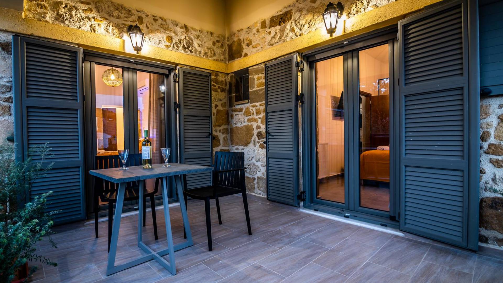 La estructura principal está construida en piedra, como una combinación de arquitectura moderna y tradicional. Tiene dos dormitorios con baño privado, sala de estar y cocina. Ambas habitaciones están equipadas con unidades de aire acondicionado independientes, televisores inteligentes planos de 42 pulgadas con conexión a Internet y 3 opciones de satélite (Hotbird, Astra). También hay cajas de seguridad, armarios, espejos y pequeñas mesas de oficina con acceso a Ethernet. Ambos dan acceso a un balcón común orientado a la calle. Uno de los dormitorios tiene una cama de matrimonio (160cm x 205cm) y el otro tiene dos camas individuales (90cm x 205cm) que también se pueden convertir en doble, todas con mesitas de noche.
