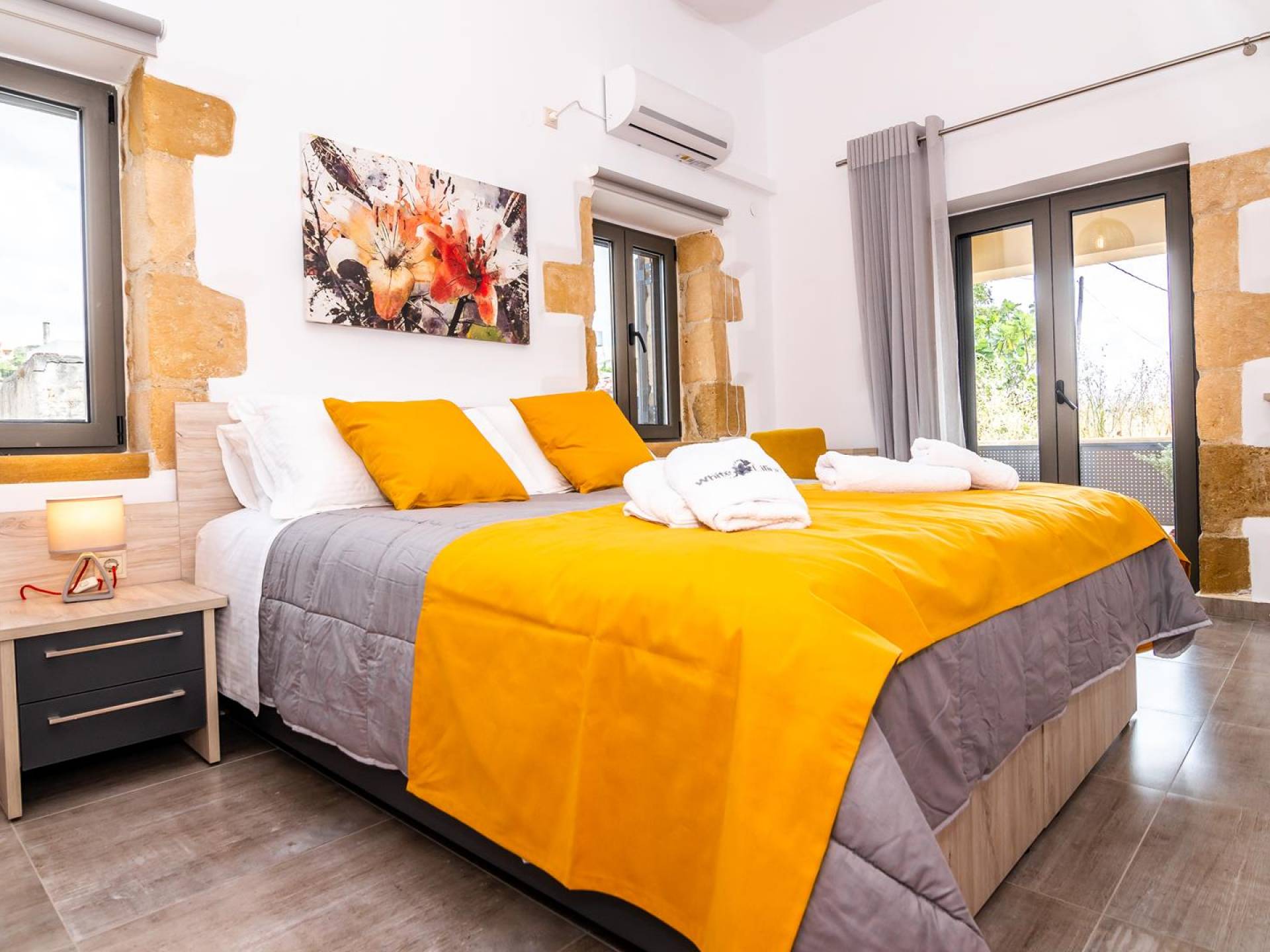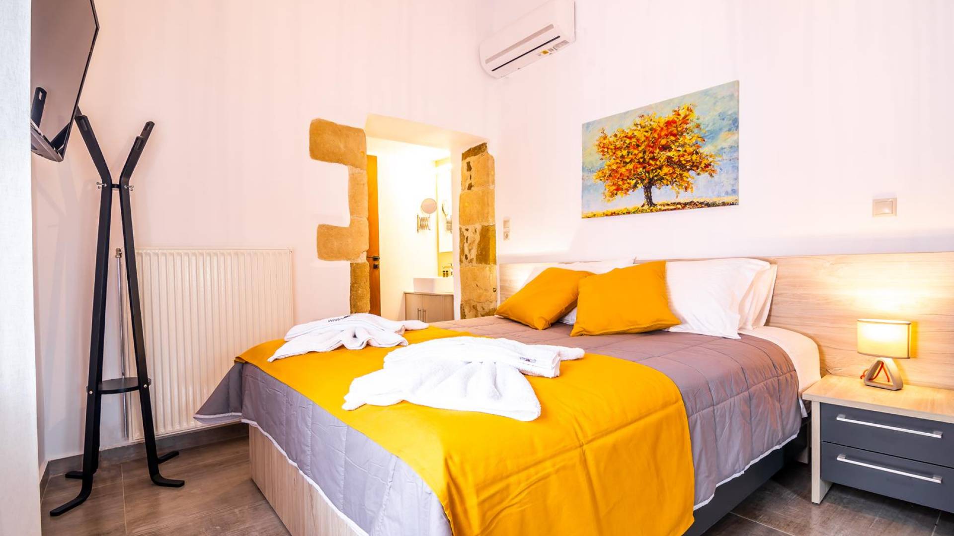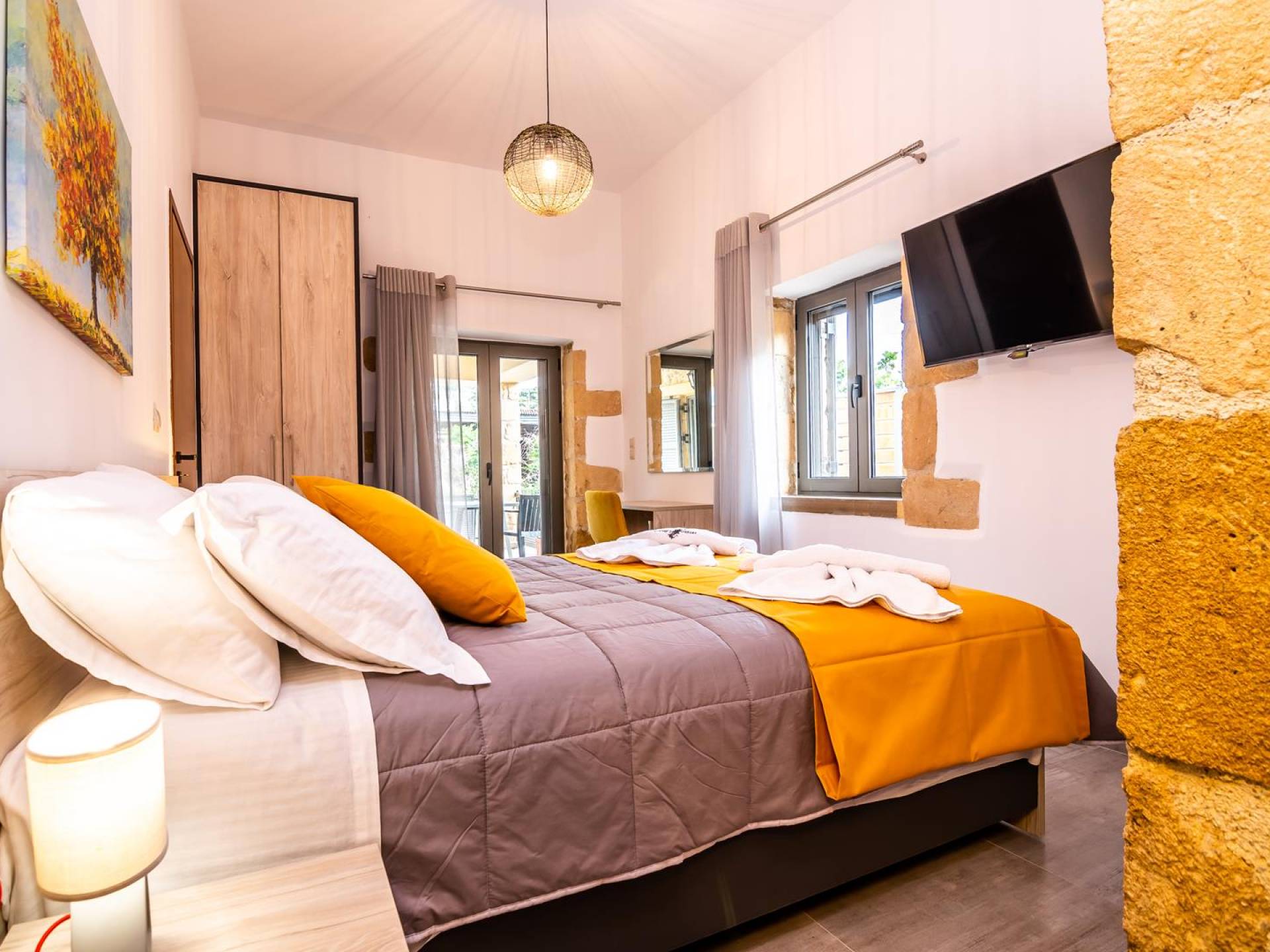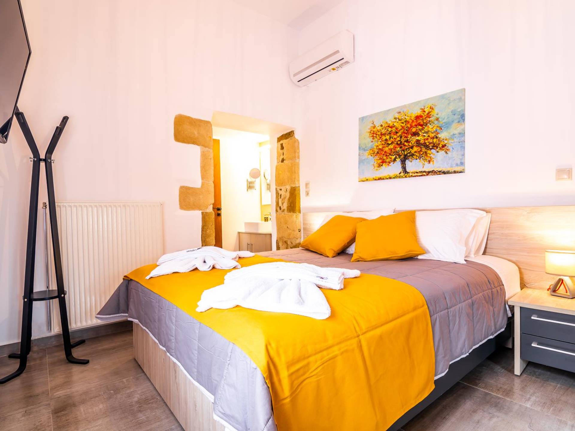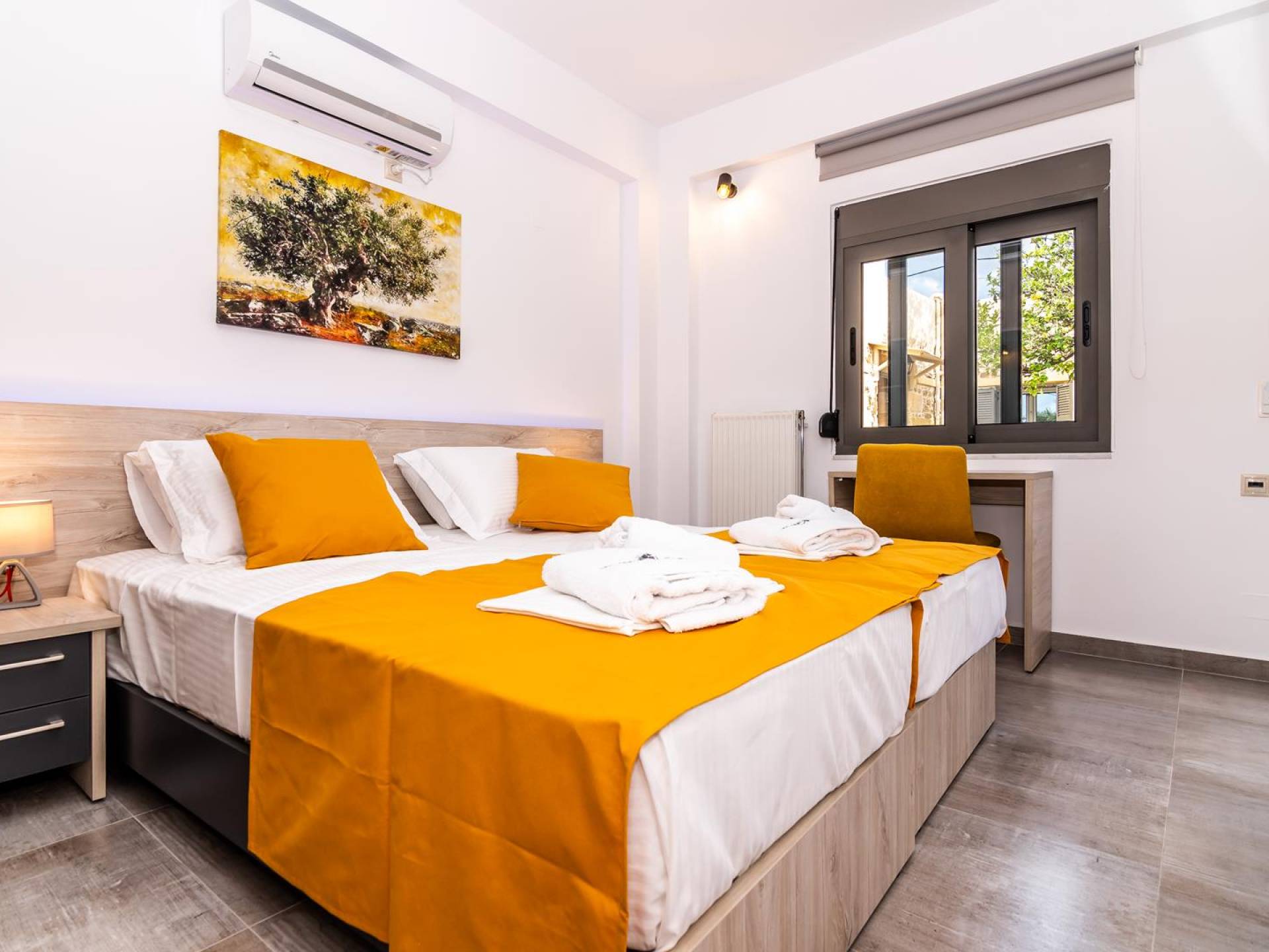 La estructura principal está construida en piedra, como una combinación de arquitectura moderna y tradicional. Tiene dos dormitorios con baño privado, sala de estar y cocina. Ambas habitaciones están equipadas con unidades de aire acondicionado independientes, televisores inteligentes planos de 42 pulgadas con conexión a Internet y 3 opciones de satélite (Hotbird, Astra). También hay cajas de seguridad, armarios, espejos y pequeñas mesas de oficina con acceso a Ethernet. Ambos dan acceso a un balcón común orientado a la calle. Uno de los dormitorios tiene una cama de matrimonio (160cm x 205cm) y el otro tiene dos camas individuales (90cm x 205cm) que también se pueden convertir en doble, todas con mesitas de noche.