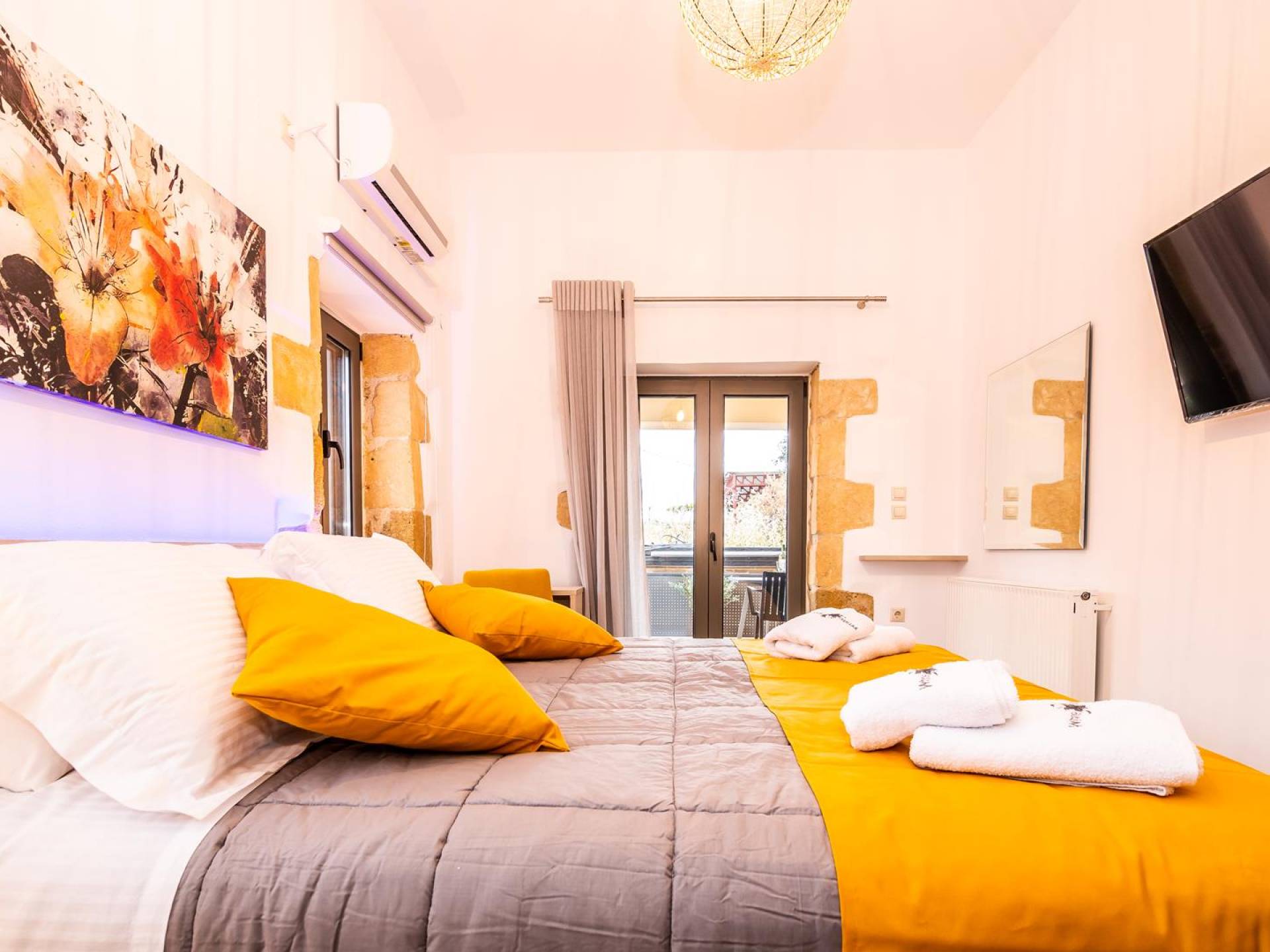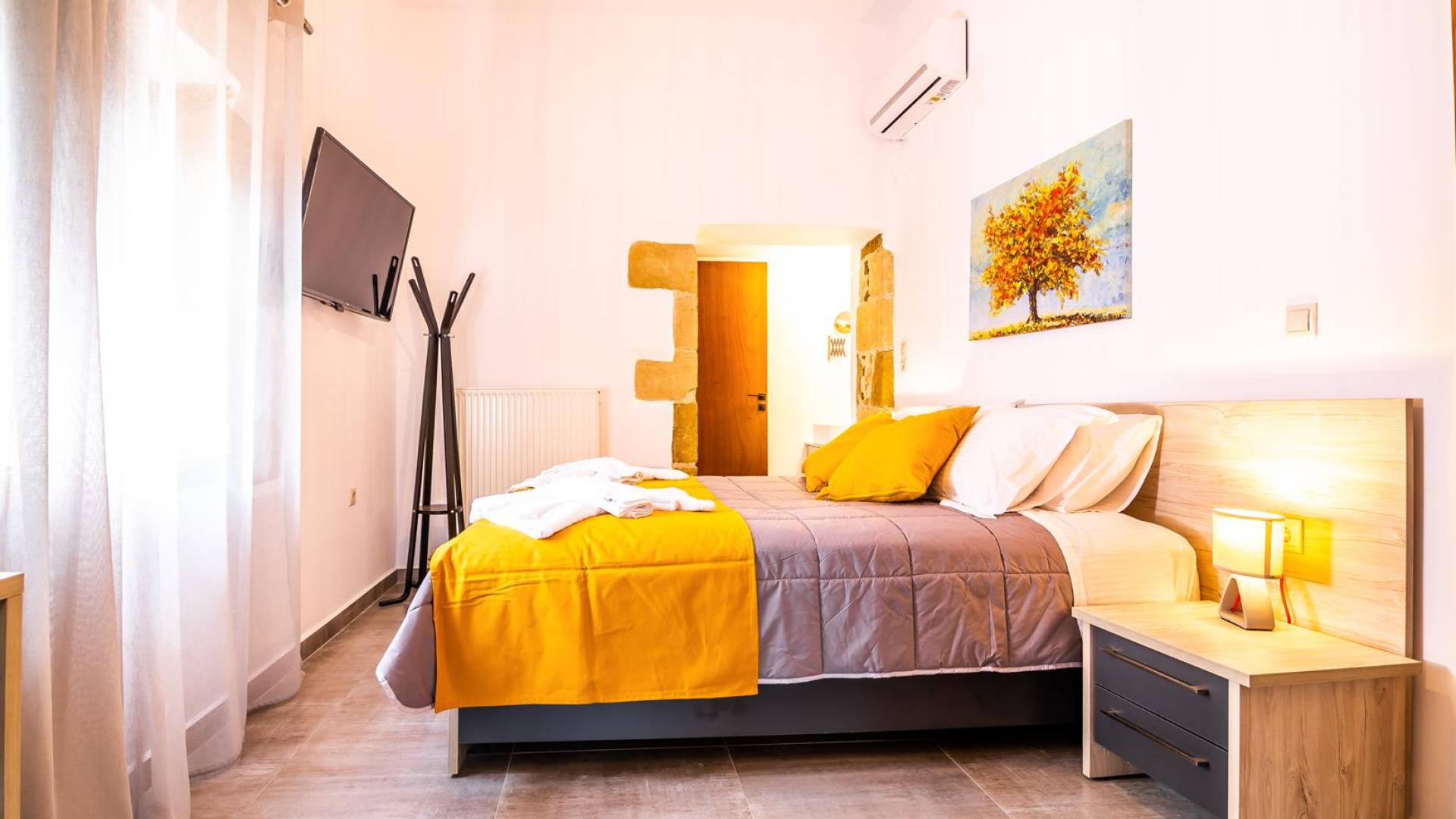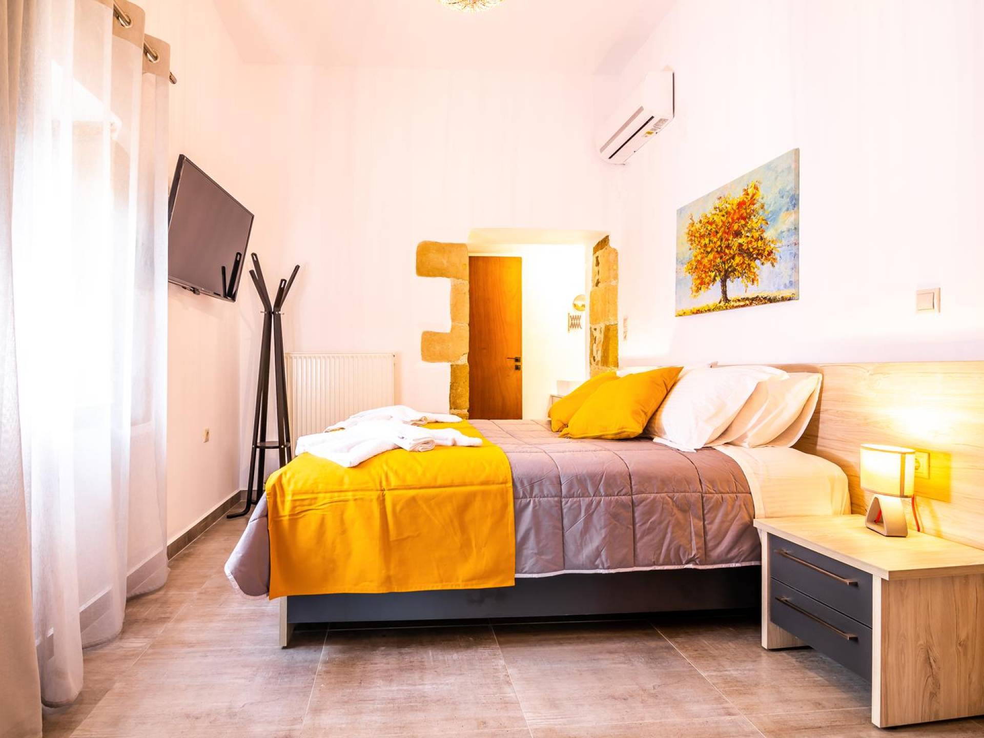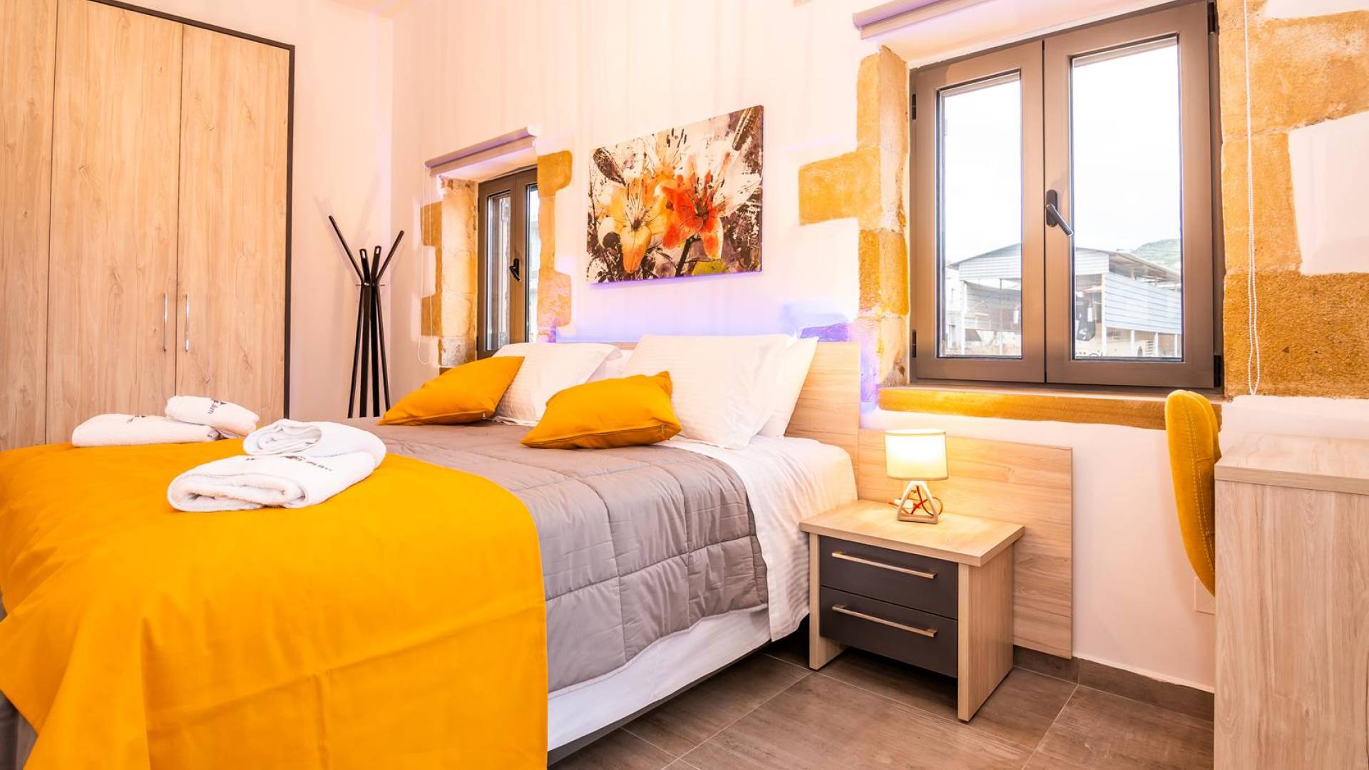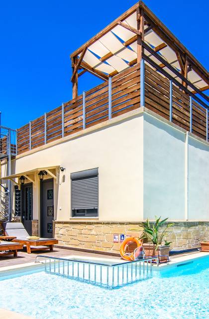 La estructura principal está construida en piedra, como una combinación de arquitectura moderna y tradicional. Tiene dos dormitorios con baño privado, sala de estar y cocina. Ambas habitaciones están equipadas con unidades de aire acondicionado independientes, televisores inteligentes planos de 42 pulgadas con conexión a Internet y 3 opciones de satélite (Hotbird, Astra). También hay cajas de seguridad, armarios, espejos y pequeñas mesas de oficina con acceso a Ethernet. Ambos dan acceso a un balcón común orientado a la calle. Uno de los dormitorios tiene una cama de matrimonio (160cm x 205cm) y el otro tiene dos camas individuales (90cm x 205cm) que también se pueden convertir en doble, todas con mesitas de noche.