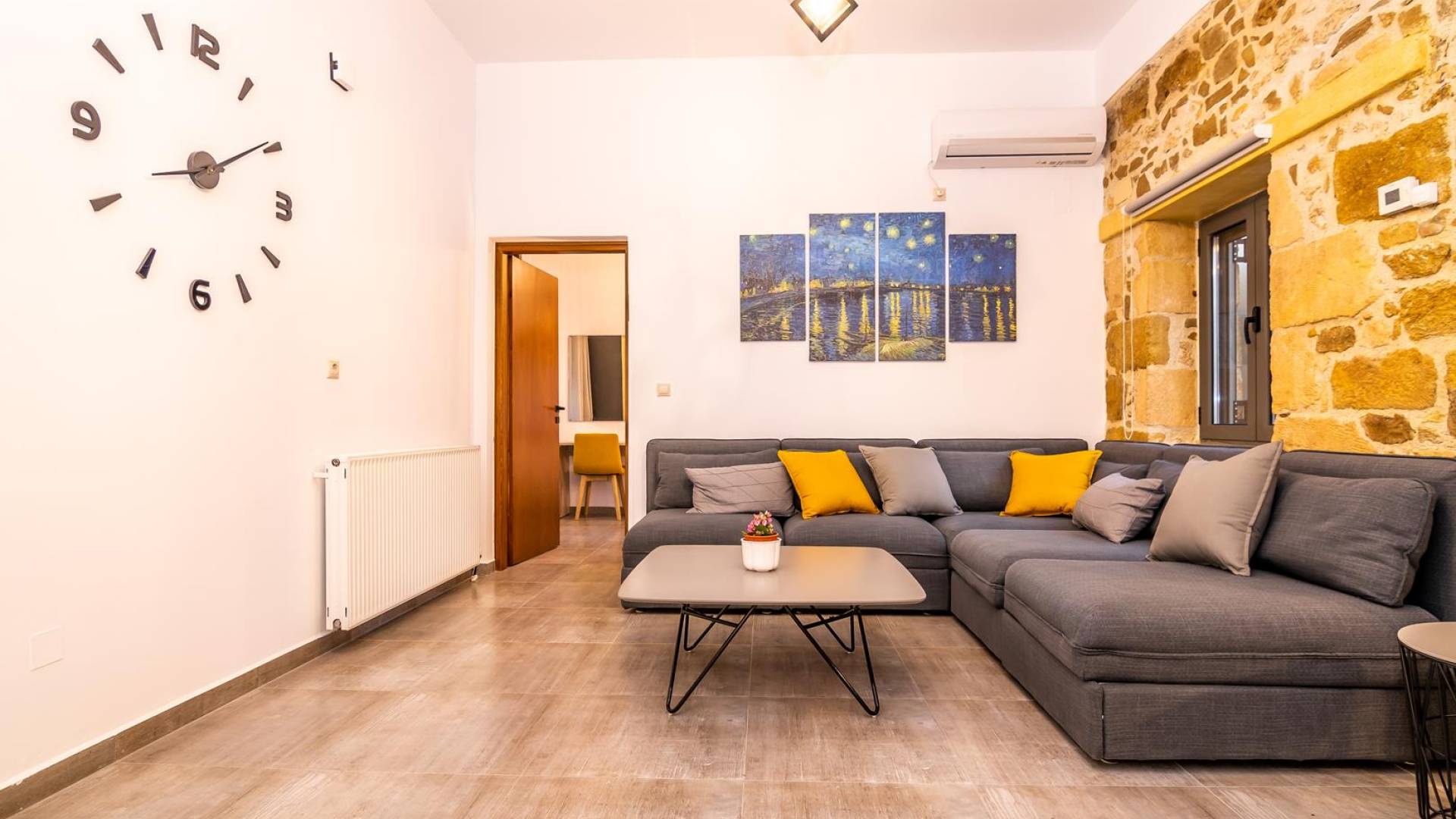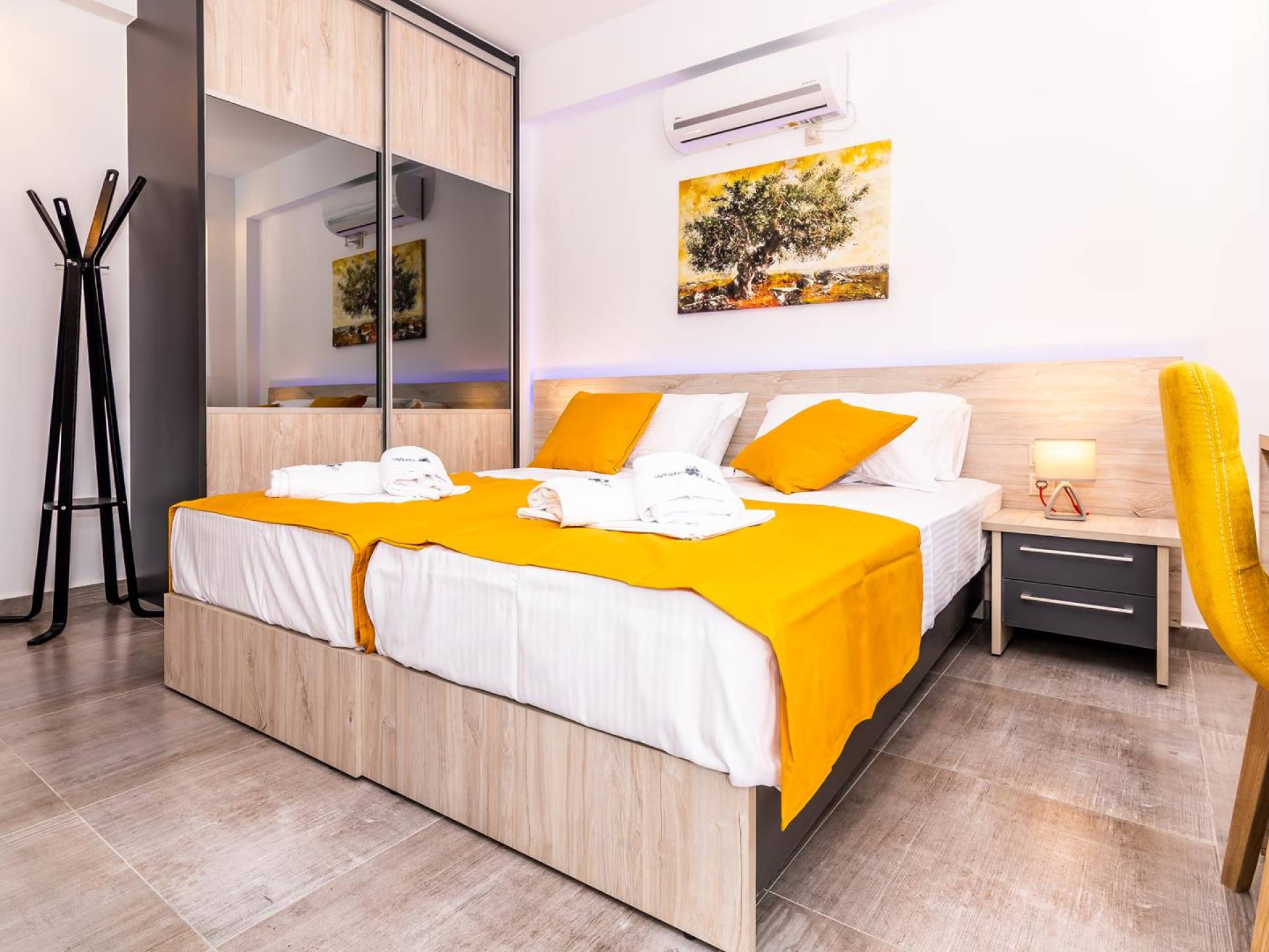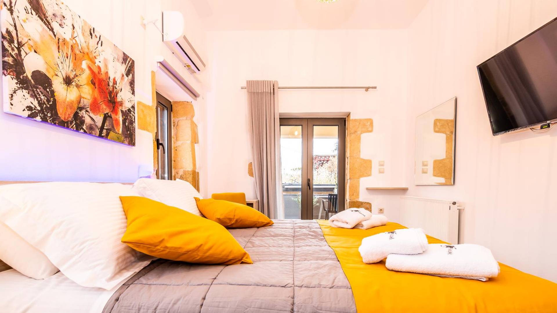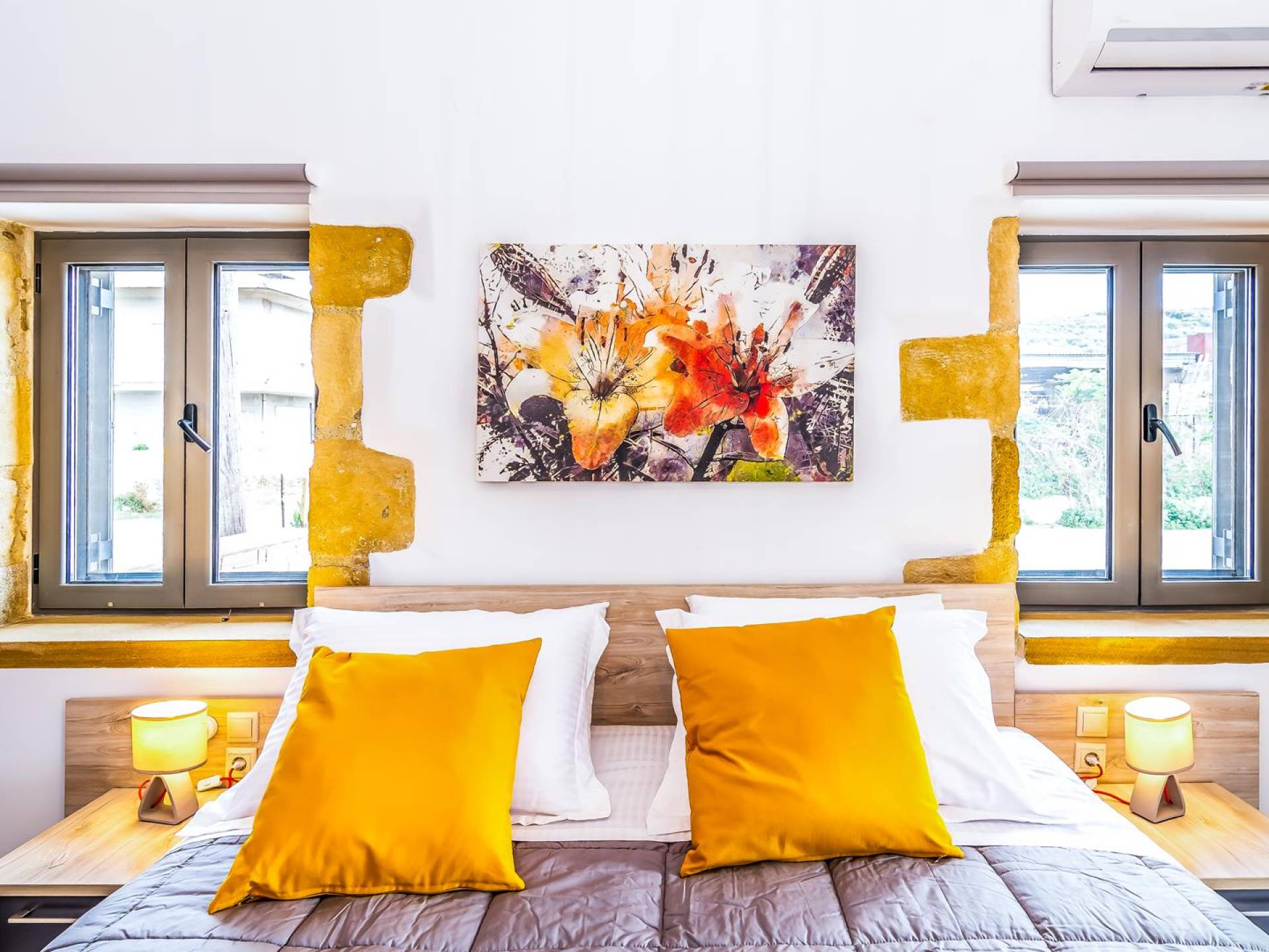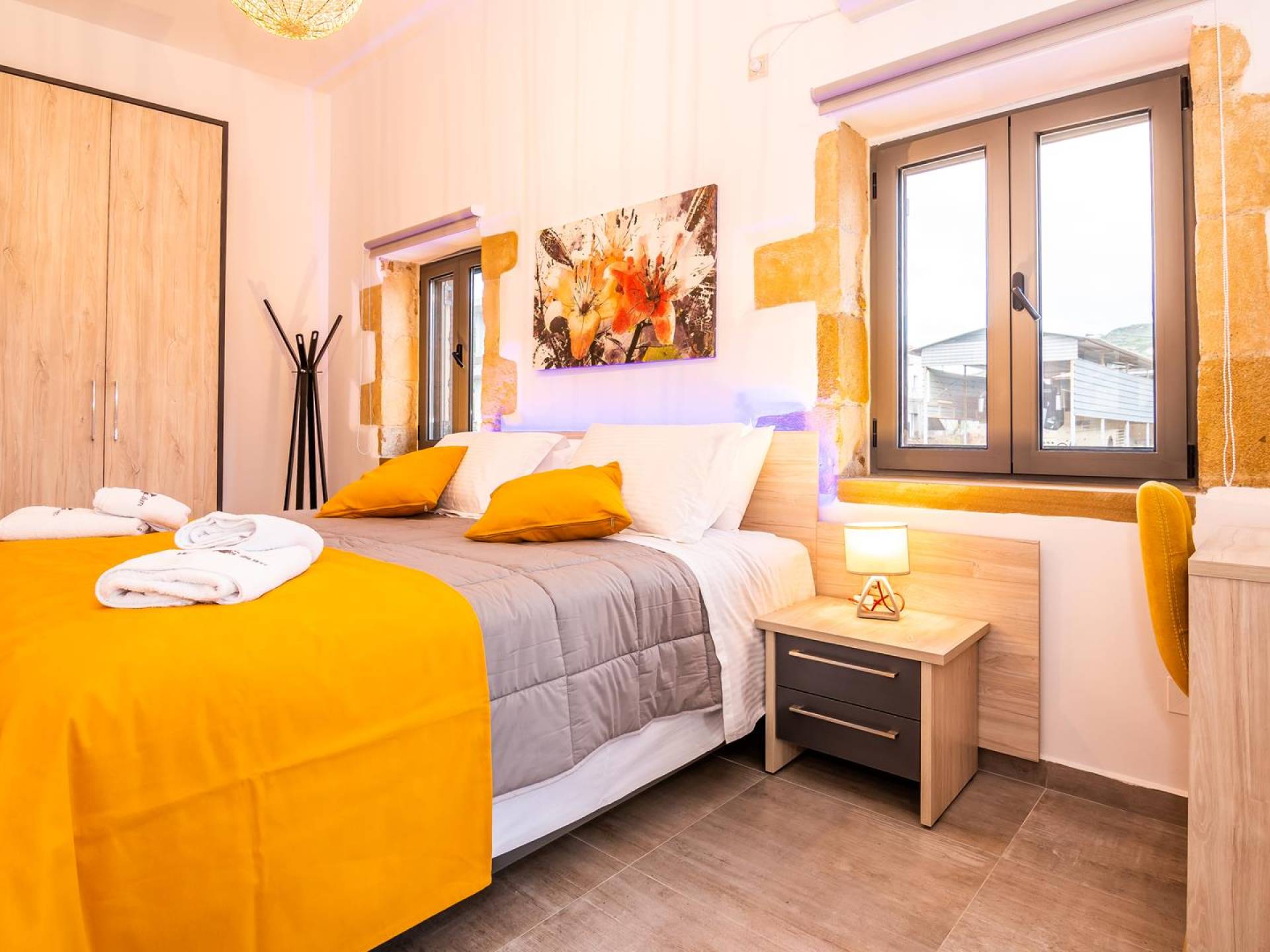 La estructura principal está construida en piedra, como una combinación de arquitectura moderna y tradicional. Tiene dos dormitorios con baño privado, sala de estar y cocina. Ambas habitaciones están equipadas con unidades de aire acondicionado independientes, televisores inteligentes planos de 42 pulgadas con conexión a Internet y 3 opciones de satélite (Hotbird, Astra). También hay cajas de seguridad, armarios, espejos y pequeñas mesas de oficina con acceso a Ethernet. Ambos dan acceso a un balcón común orientado a la calle. Uno de los dormitorios tiene una cama de matrimonio (160cm x 205cm) y el otro tiene dos camas individuales (90cm x 205cm) que también se pueden convertir en doble, todas con mesitas de noche.