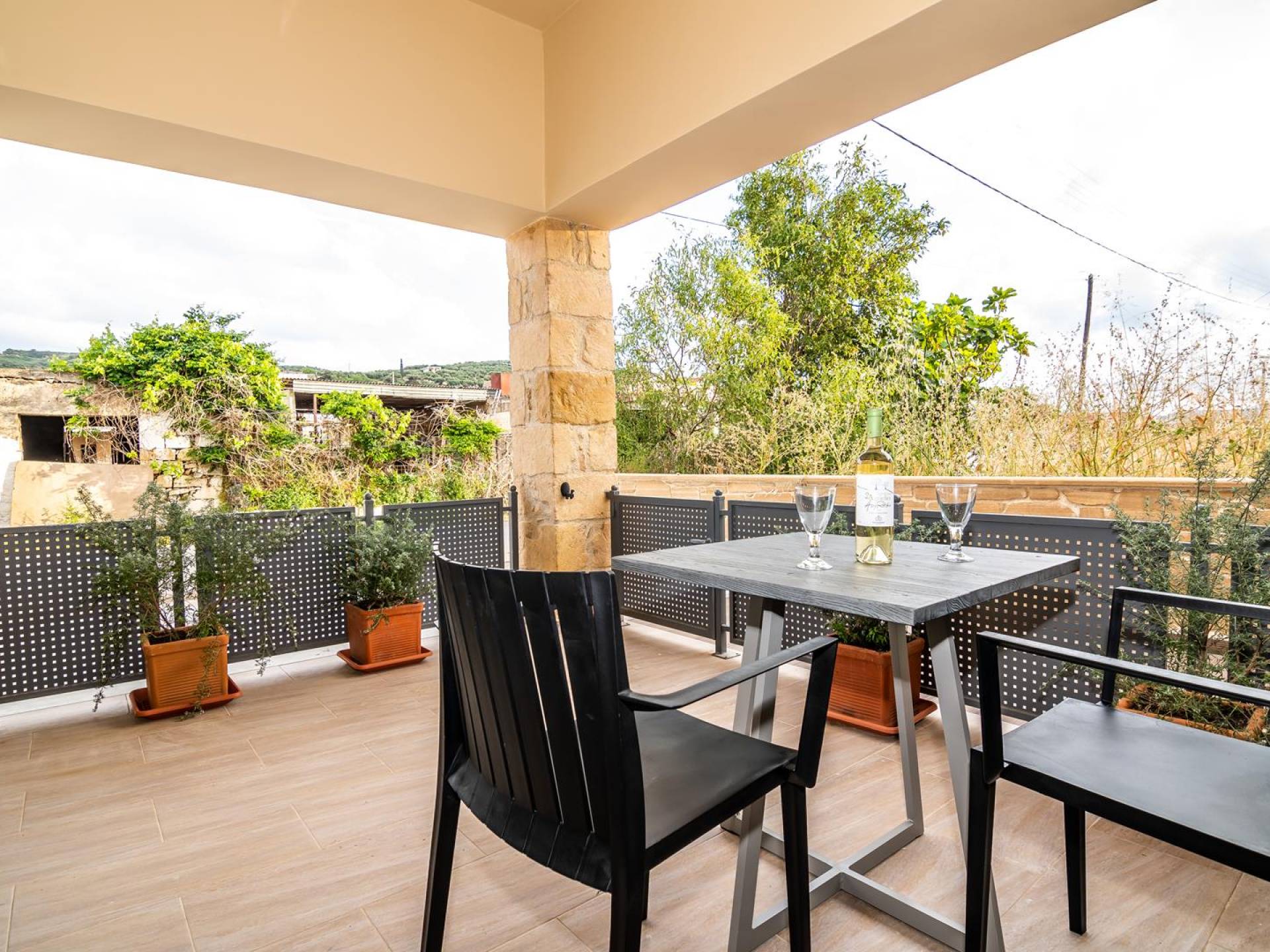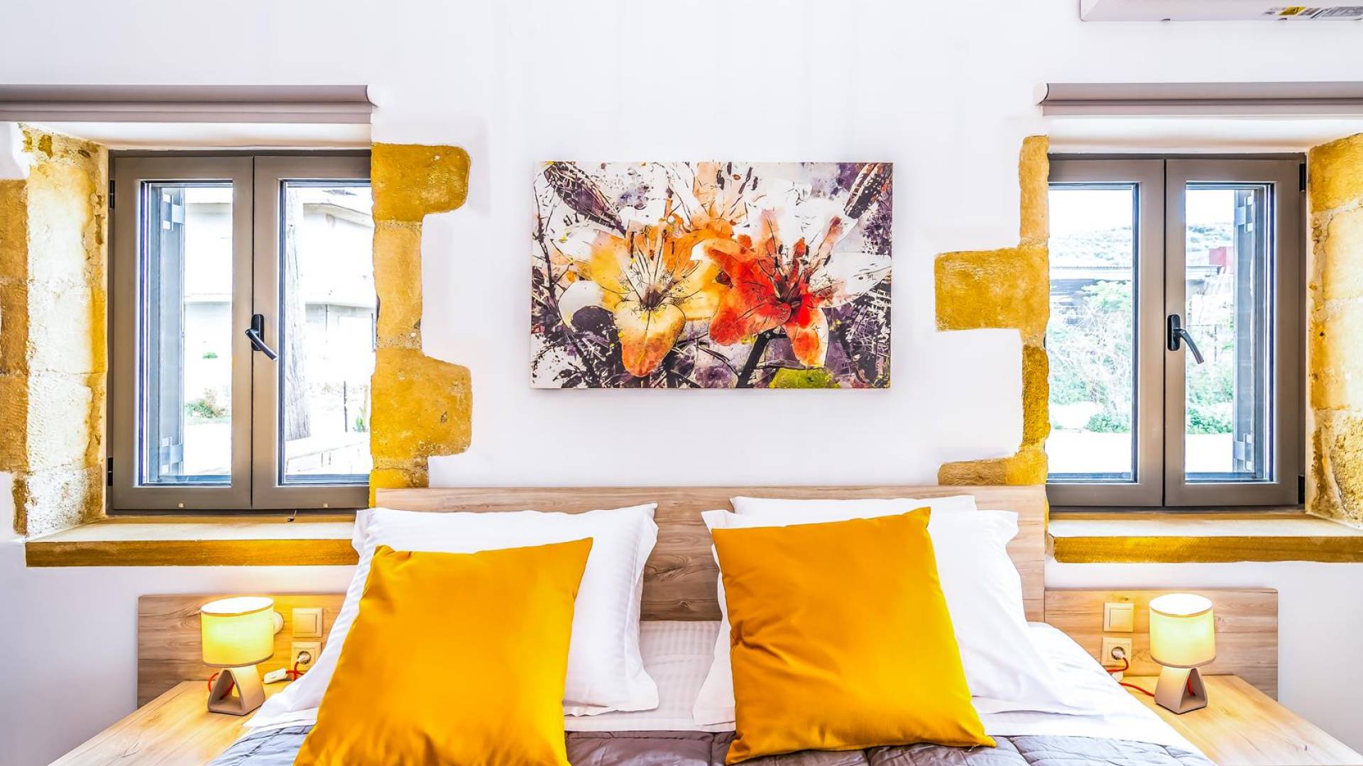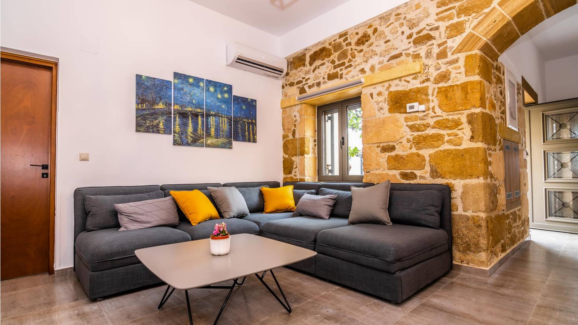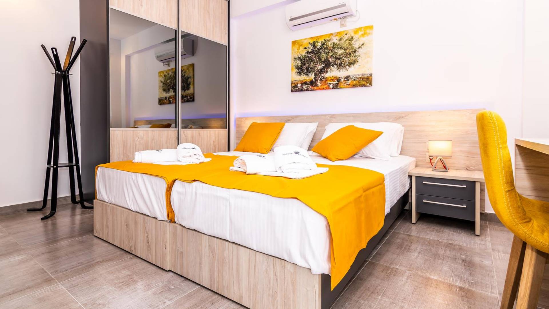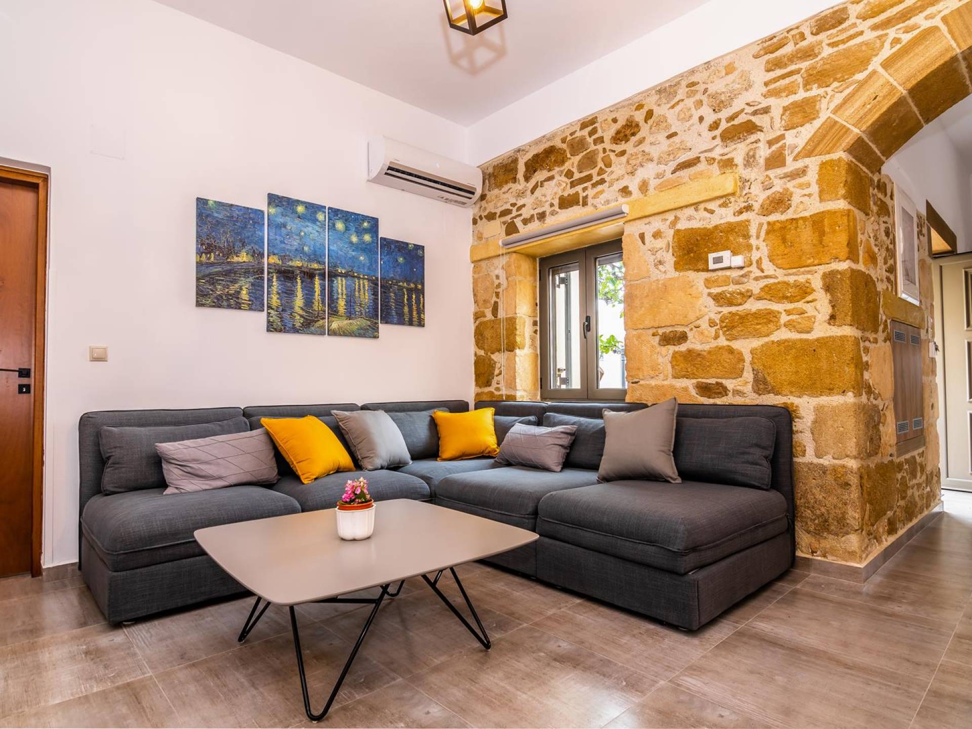 La estructura principal está construida en piedra, como una combinación de arquitectura moderna y tradicional. Tiene dos dormitorios con baño privado, sala de estar y cocina. Ambas habitaciones están equipadas con unidades de aire acondicionado independientes, televisores inteligentes planos de 42 pulgadas con conexión a Internet y 3 opciones de satélite (Hotbird, Astra). También hay cajas de seguridad, armarios, espejos y pequeñas mesas de oficina con acceso a Ethernet. Ambos dan acceso a un balcón común orientado a la calle. Uno de los dormitorios tiene una cama de matrimonio (160cm x 205cm) y el otro tiene dos camas individuales (90cm x 205cm) que también se pueden convertir en doble, todas con mesitas de noche.