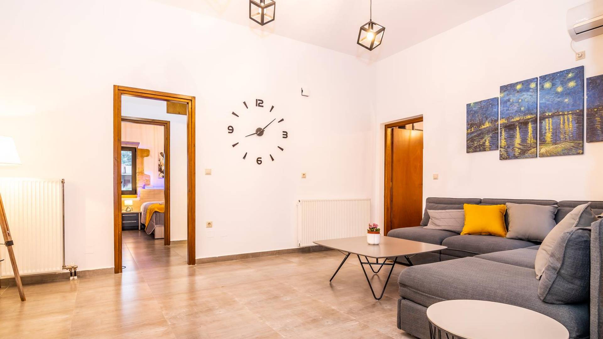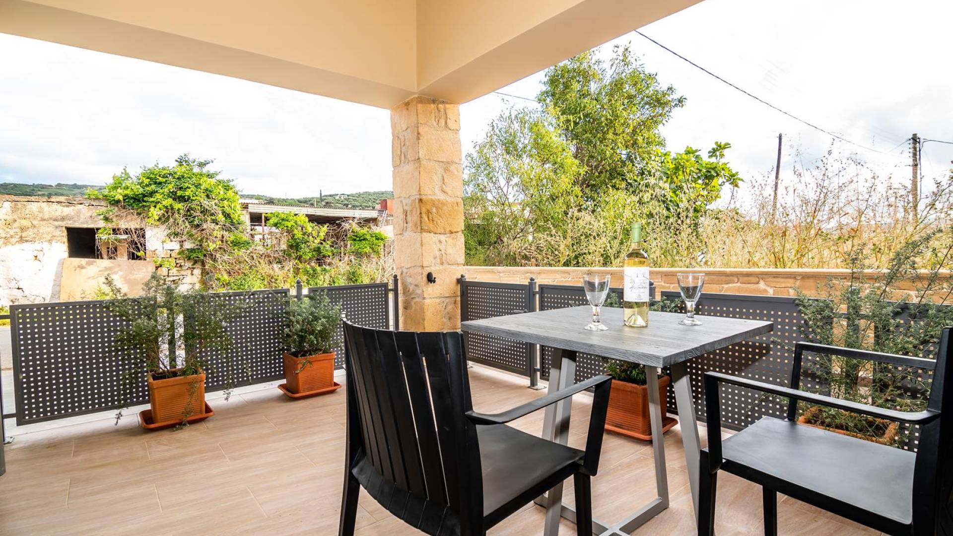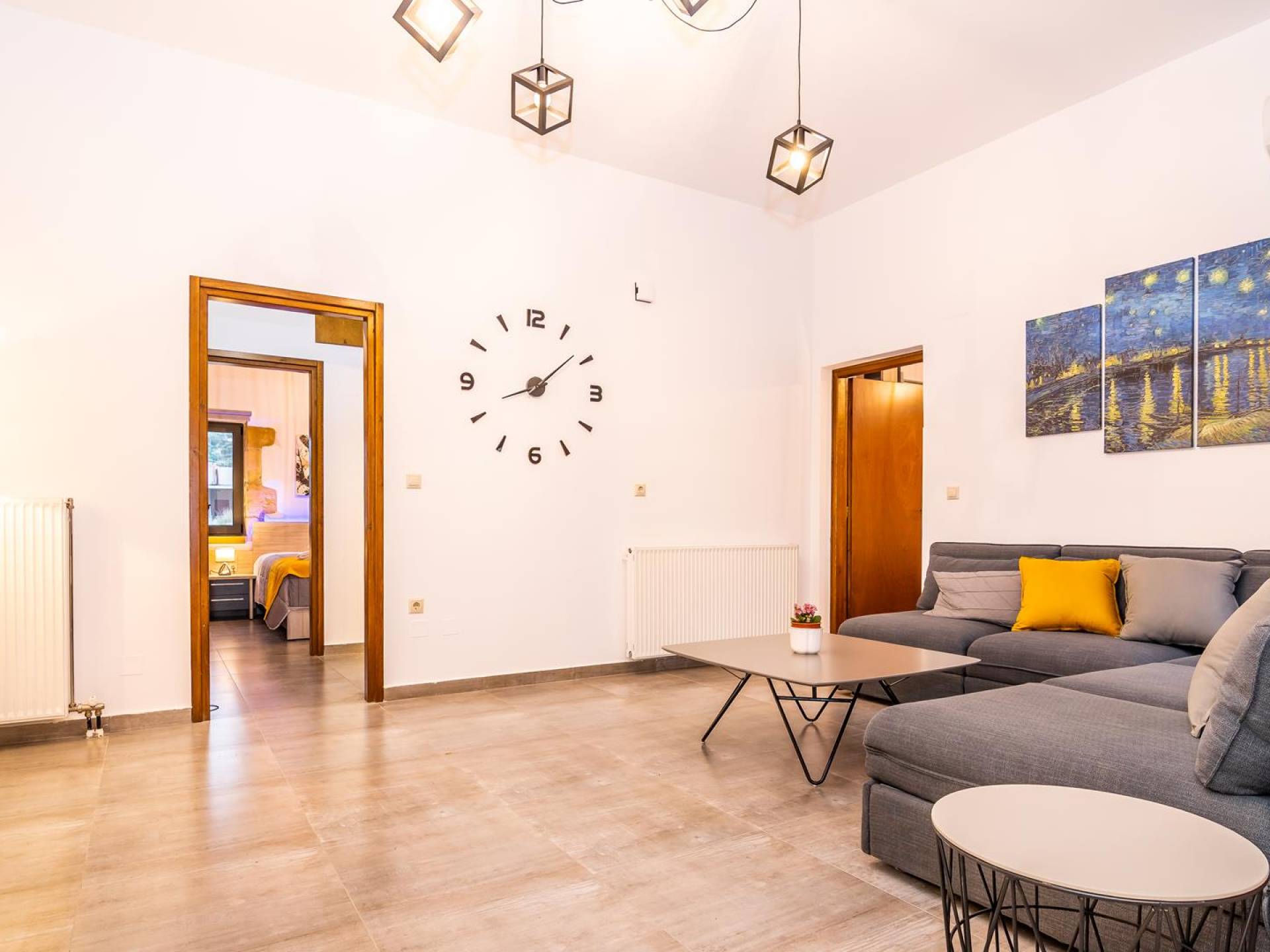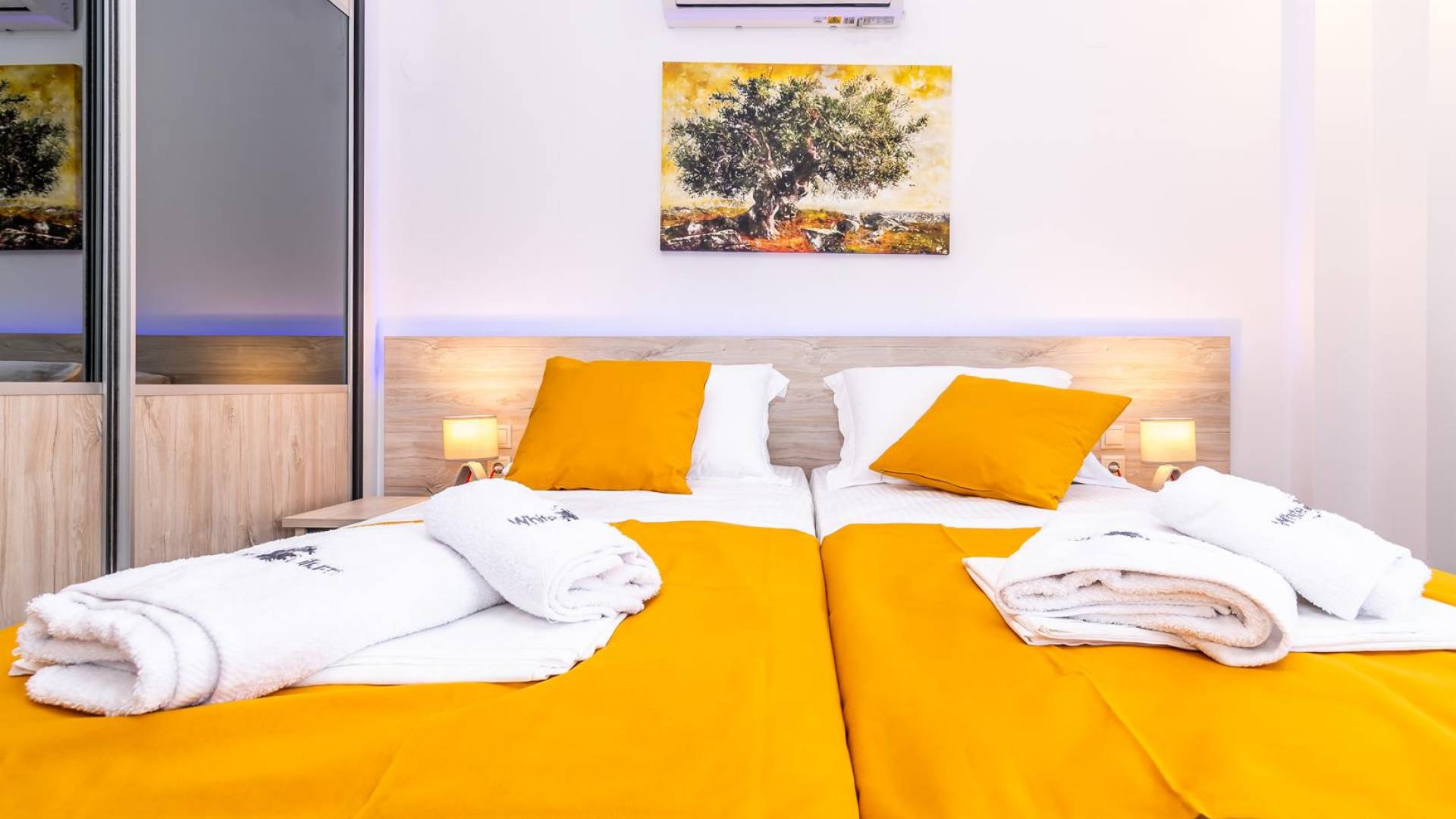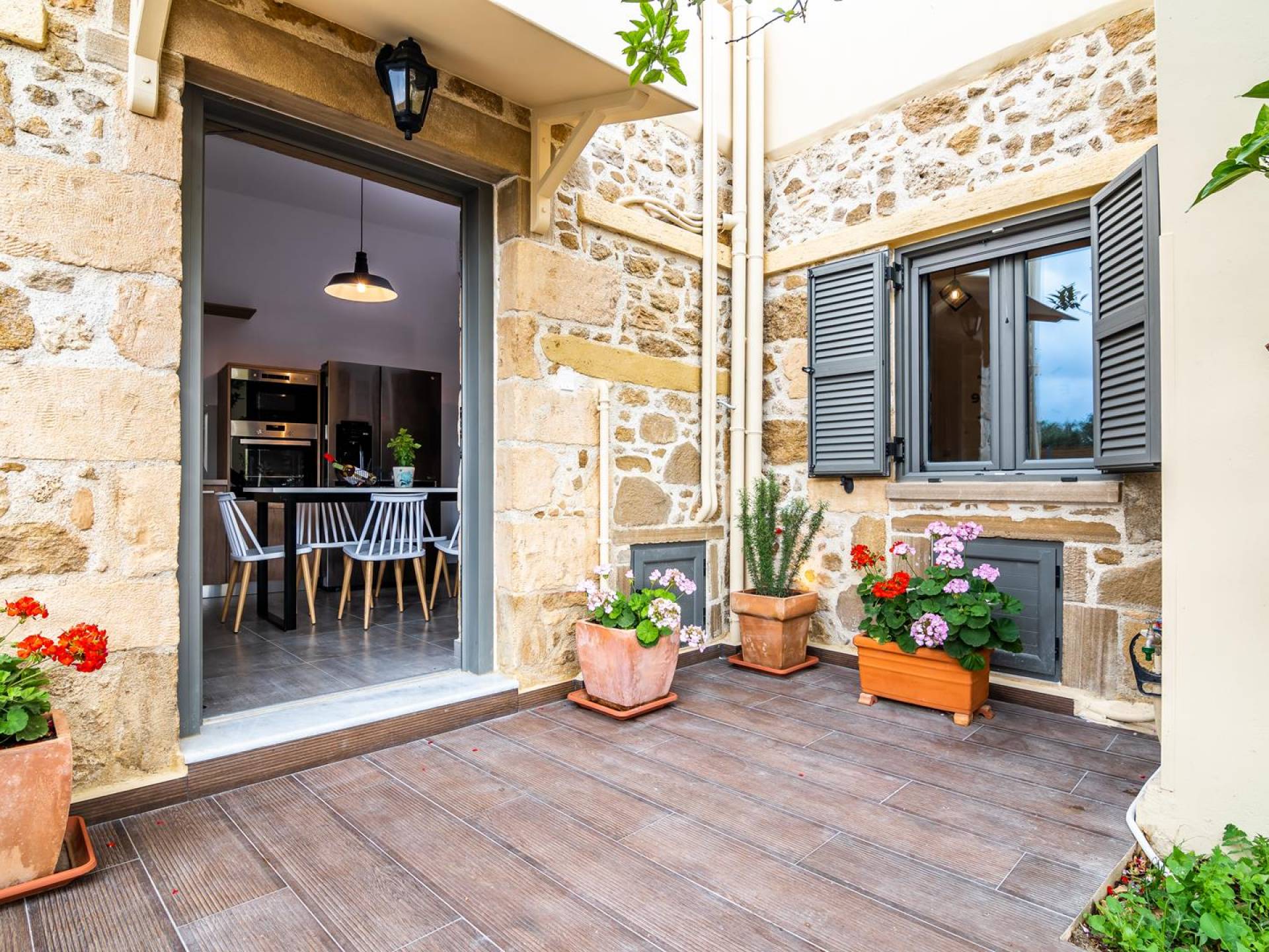 La estructura principal está construida en piedra, como una combinación de arquitectura moderna y tradicional. Tiene dos dormitorios con baño privado, sala de estar y cocina. Ambas habitaciones están equipadas con unidades de aire acondicionado independientes, televisores inteligentes planos de 42 pulgadas con conexión a Internet y 3 opciones de satélite (Hotbird, Astra). También hay cajas de seguridad, armarios, espejos y pequeñas mesas de oficina con acceso a Ethernet. Ambos dan acceso a un balcón común orientado a la calle. Uno de los dormitorios tiene una cama de matrimonio (160cm x 205cm) y el otro tiene dos camas individuales (90cm x 205cm) que también se pueden convertir en doble, todas con mesitas de noche.