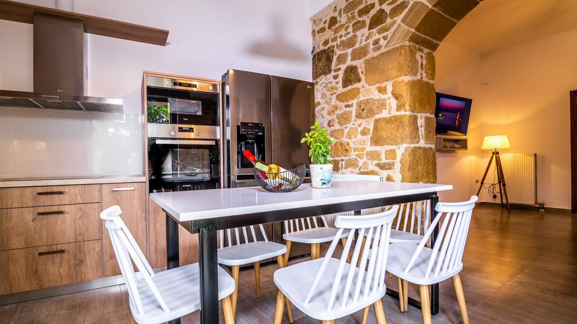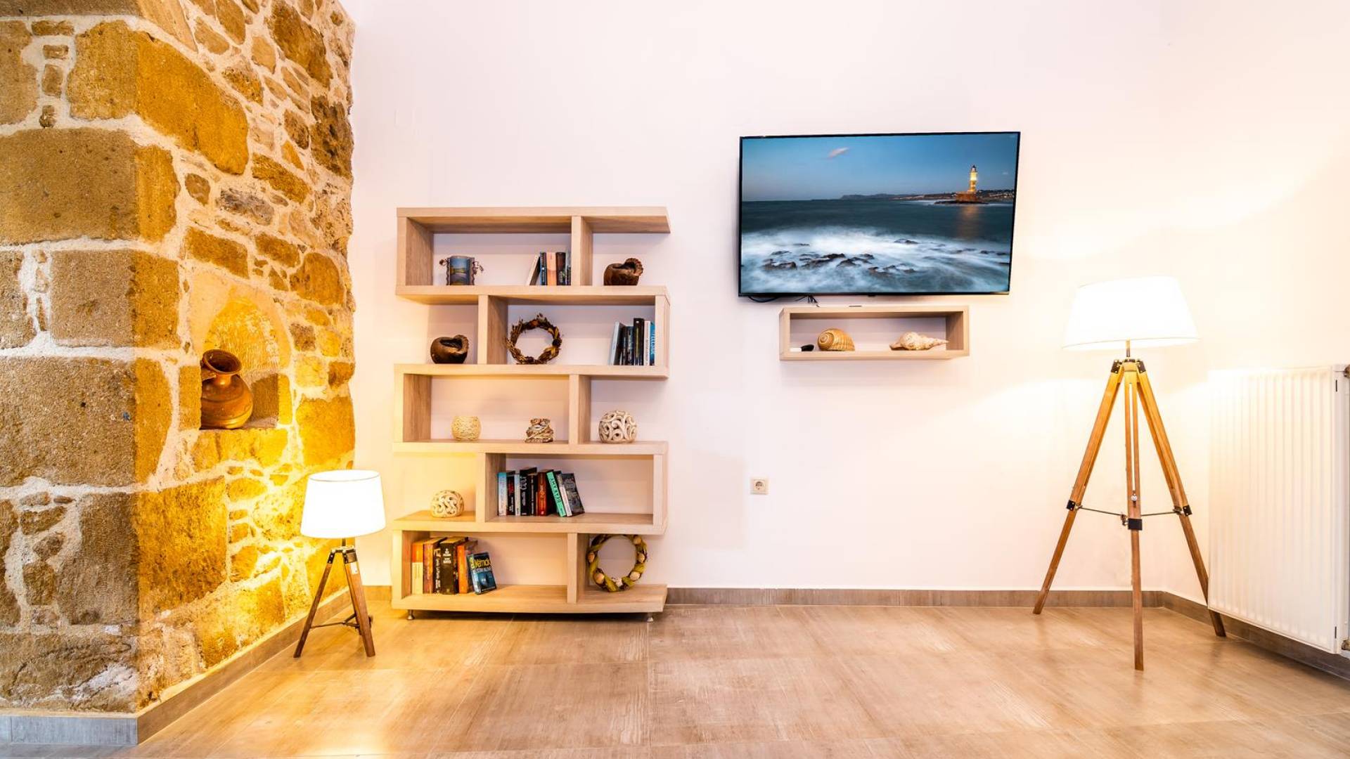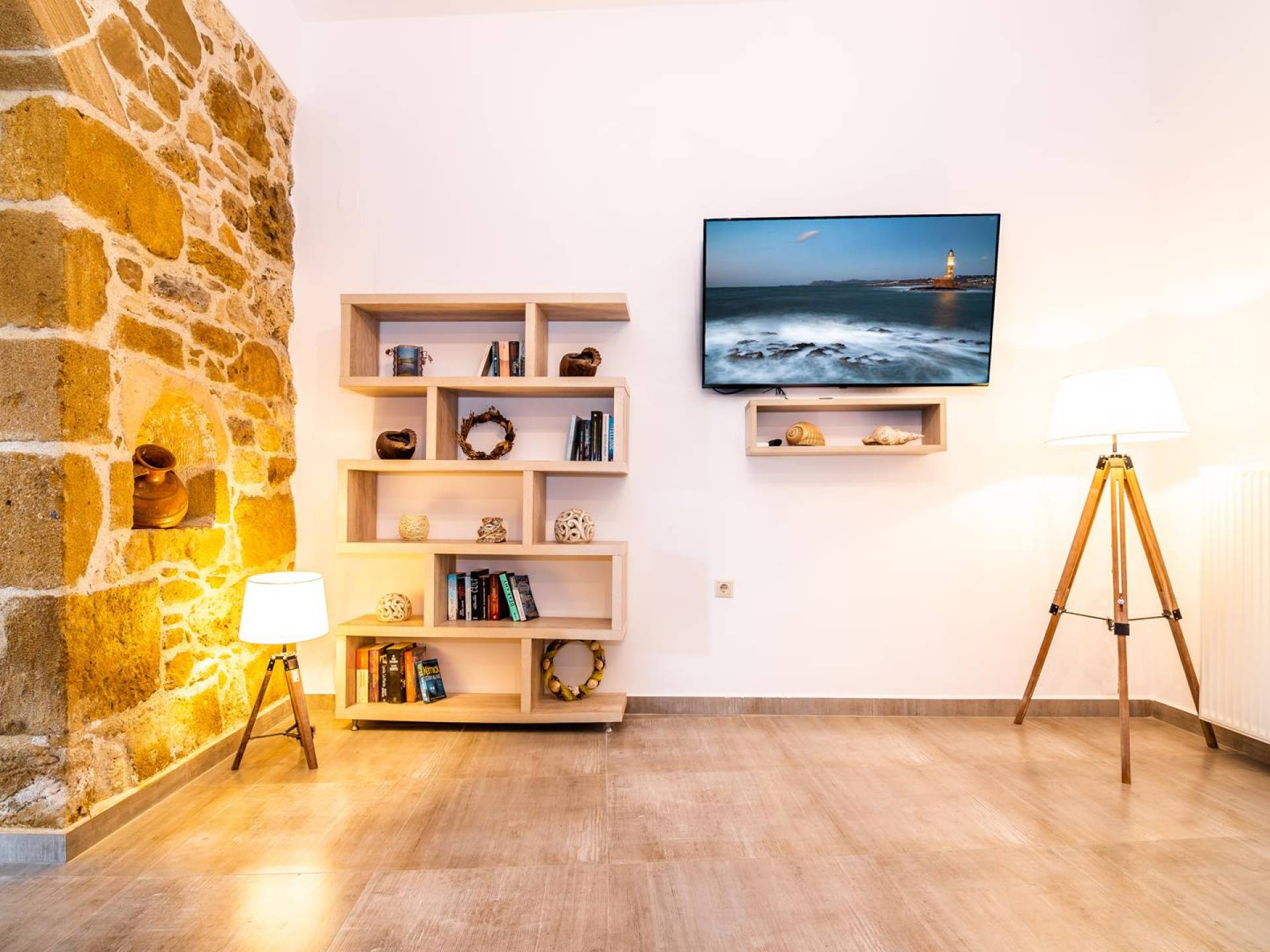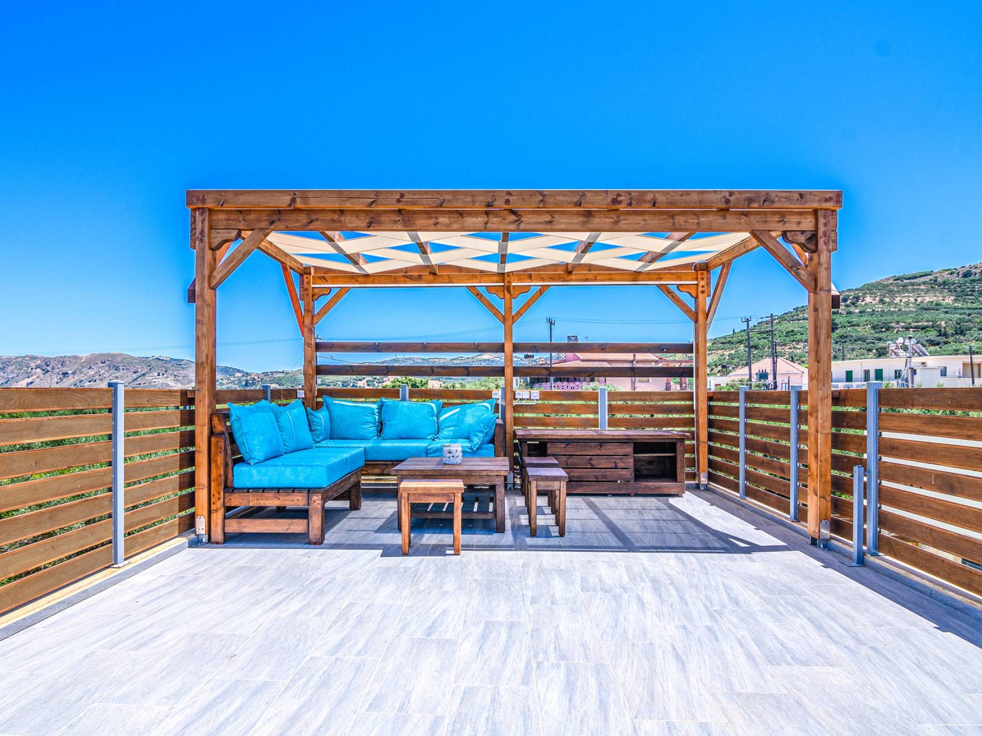 La estructura principal está construida en piedra, como una combinación de arquitectura moderna y tradicional. Tiene dos dormitorios con baño privado, sala de estar y cocina. Ambas habitaciones están equipadas con unidades de aire acondicionado independientes, televisores inteligentes planos de 42 pulgadas con conexión a Internet y 3 opciones de satélite (Hotbird, Astra). También hay cajas de seguridad, armarios, espejos y pequeñas mesas de oficina con acceso a Ethernet. Ambos dan acceso a un balcón común orientado a la calle. Uno de los dormitorios tiene una cama de matrimonio (160cm x 205cm) y el otro tiene dos camas individuales (90cm x 205cm) que también se pueden convertir en doble, todas con mesitas de noche.