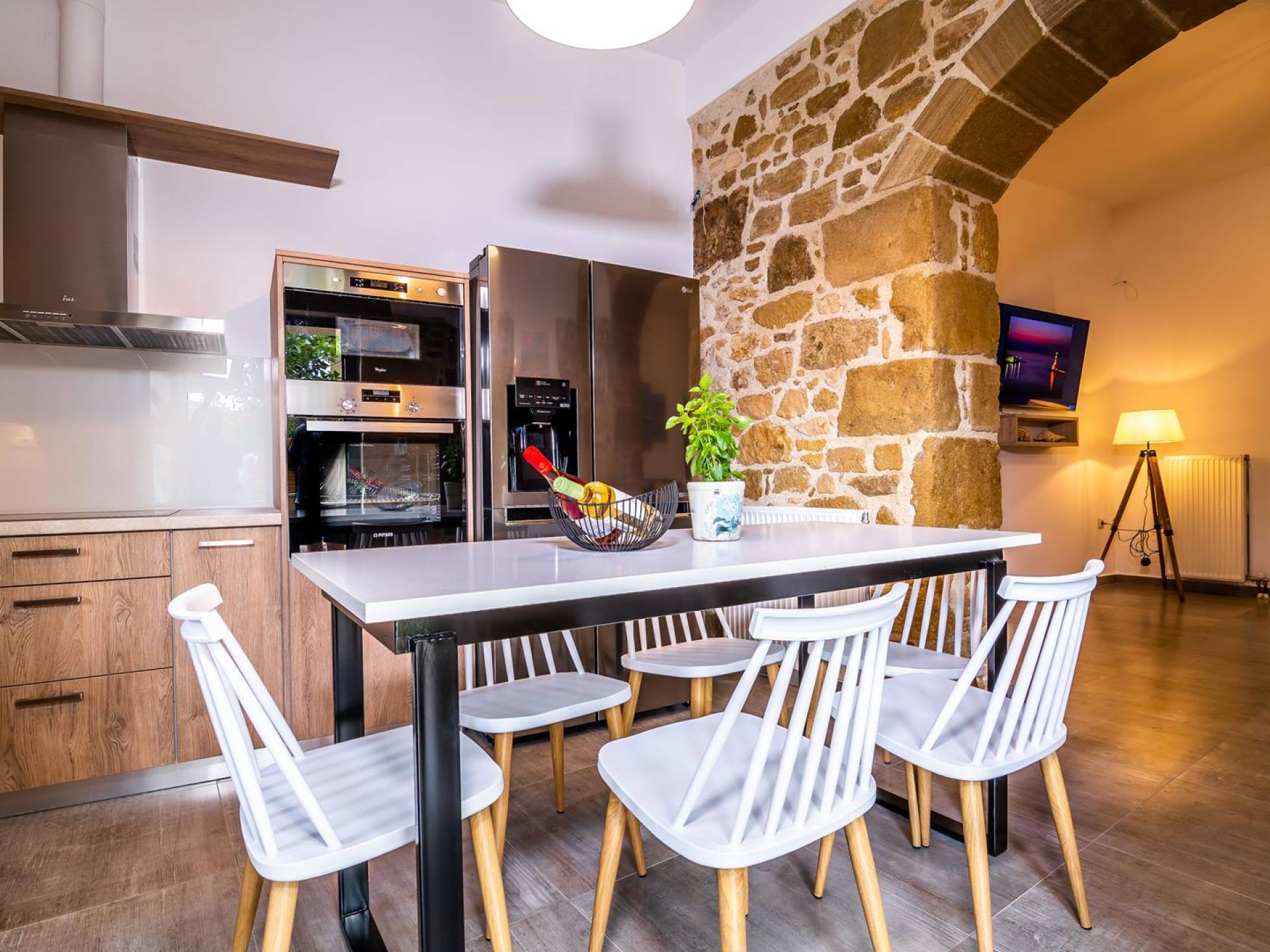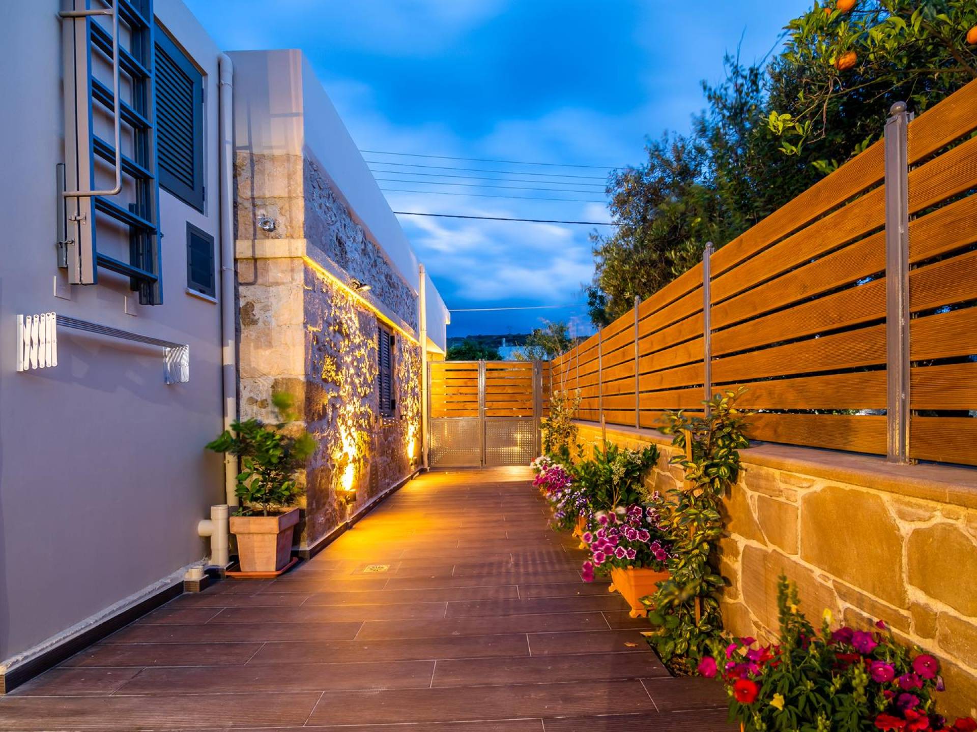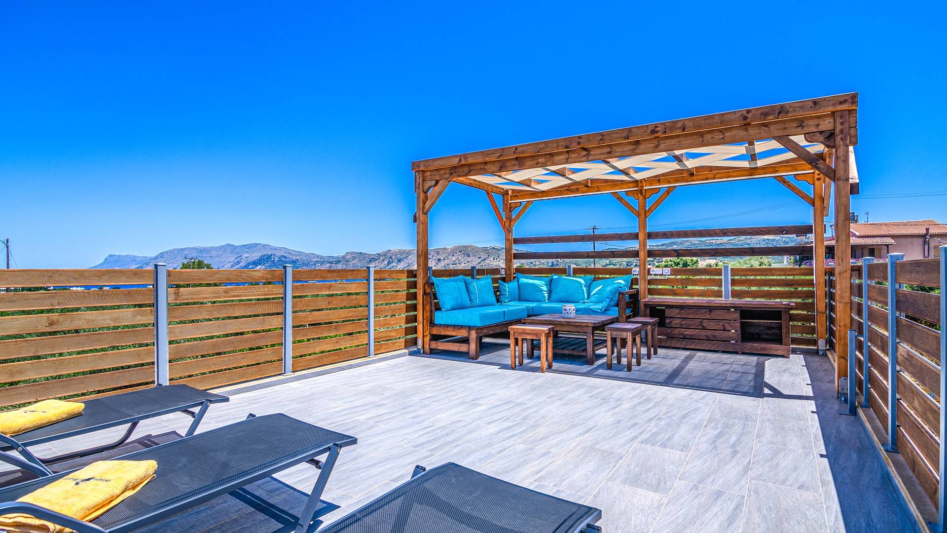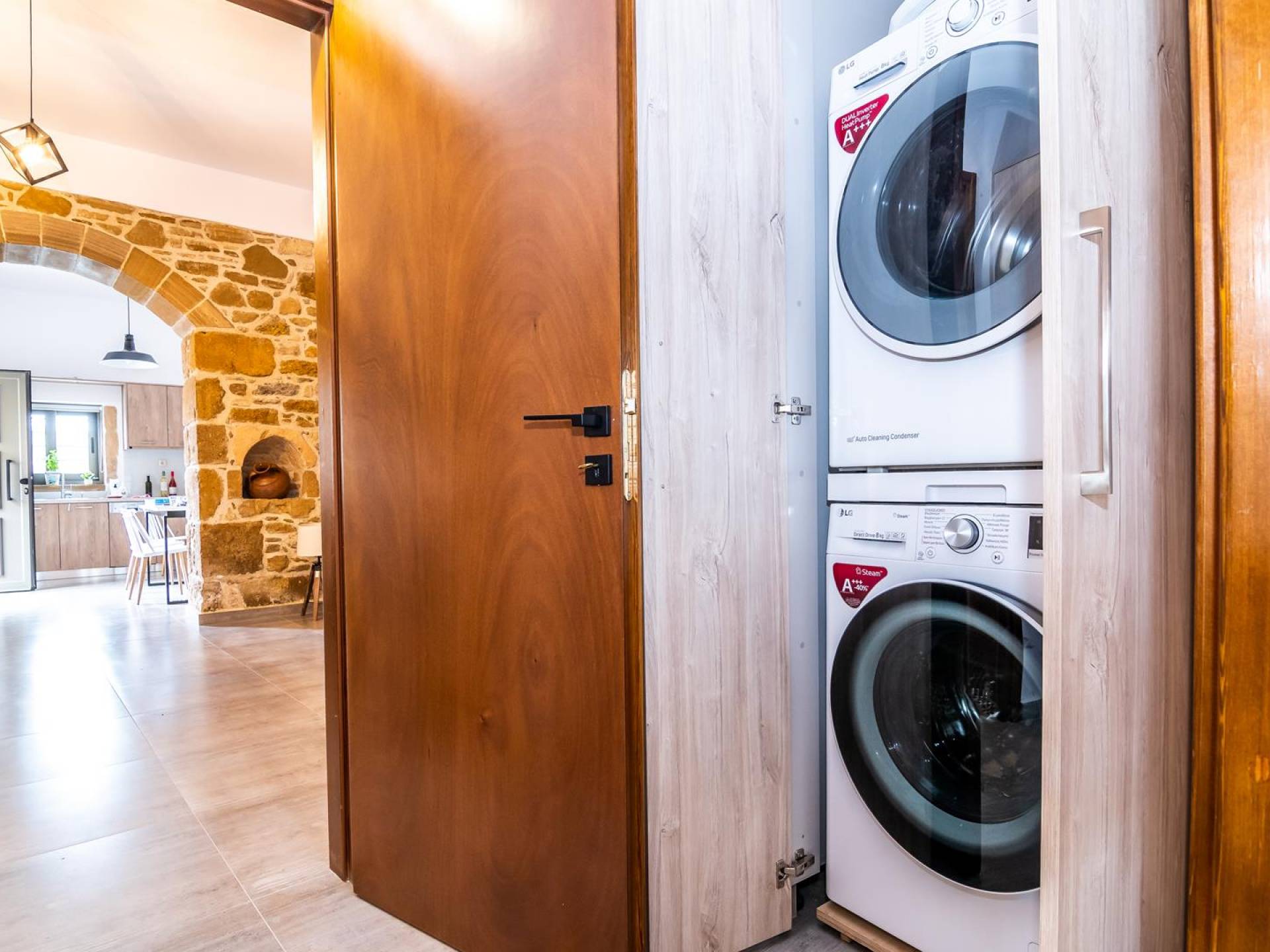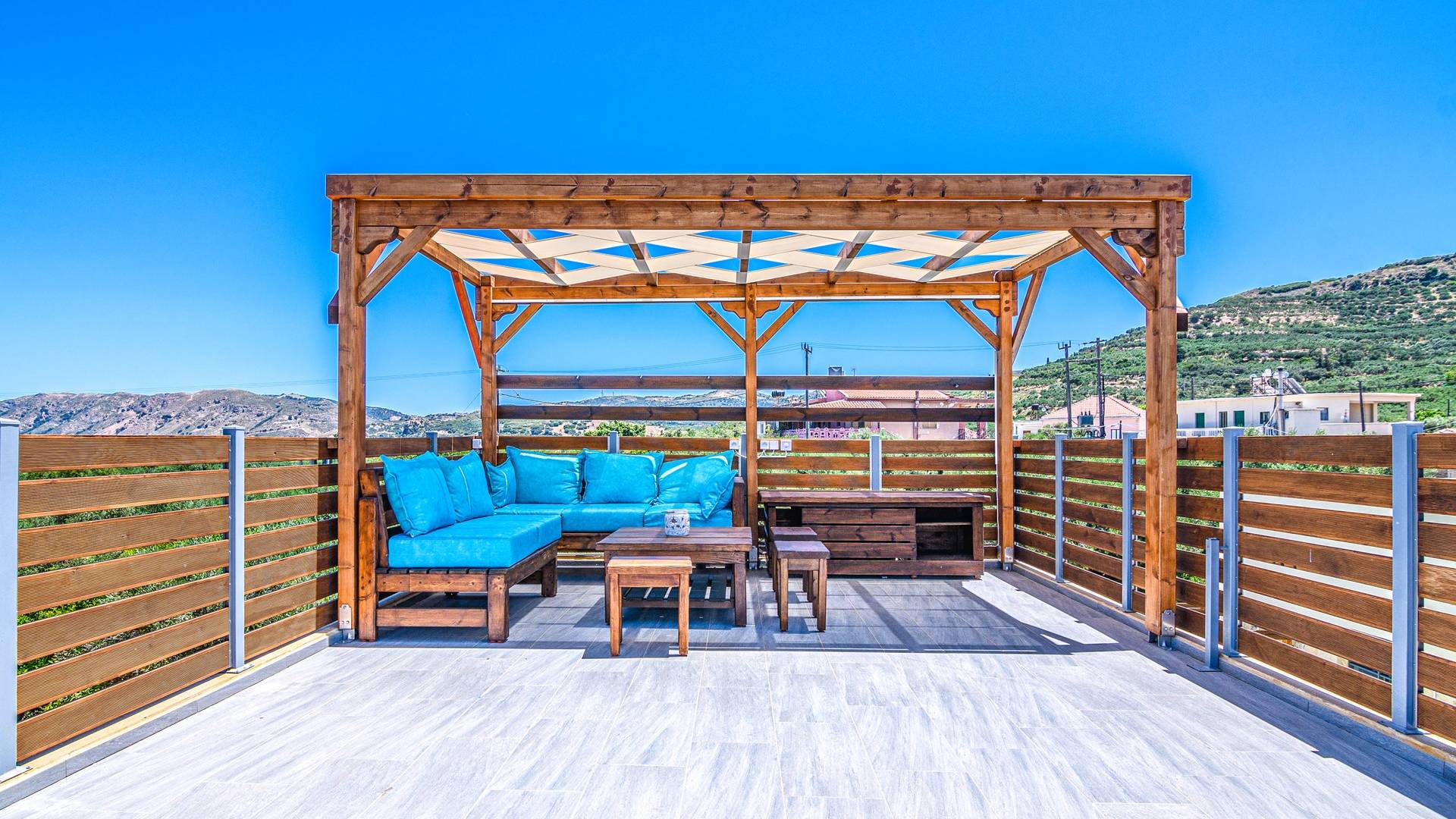 La estructura principal está construida en piedra, como una combinación de arquitectura moderna y tradicional. Tiene dos dormitorios con baño privado, sala de estar y cocina. Ambas habitaciones están equipadas con unidades de aire acondicionado independientes, televisores inteligentes planos de 42 pulgadas con conexión a Internet y 3 opciones de satélite (Hotbird, Astra). También hay cajas de seguridad, armarios, espejos y pequeñas mesas de oficina con acceso a Ethernet. Ambos dan acceso a un balcón común orientado a la calle. Uno de los dormitorios tiene una cama de matrimonio (160cm x 205cm) y el otro tiene dos camas individuales (90cm x 205cm) que también se pueden convertir en doble, todas con mesitas de noche.