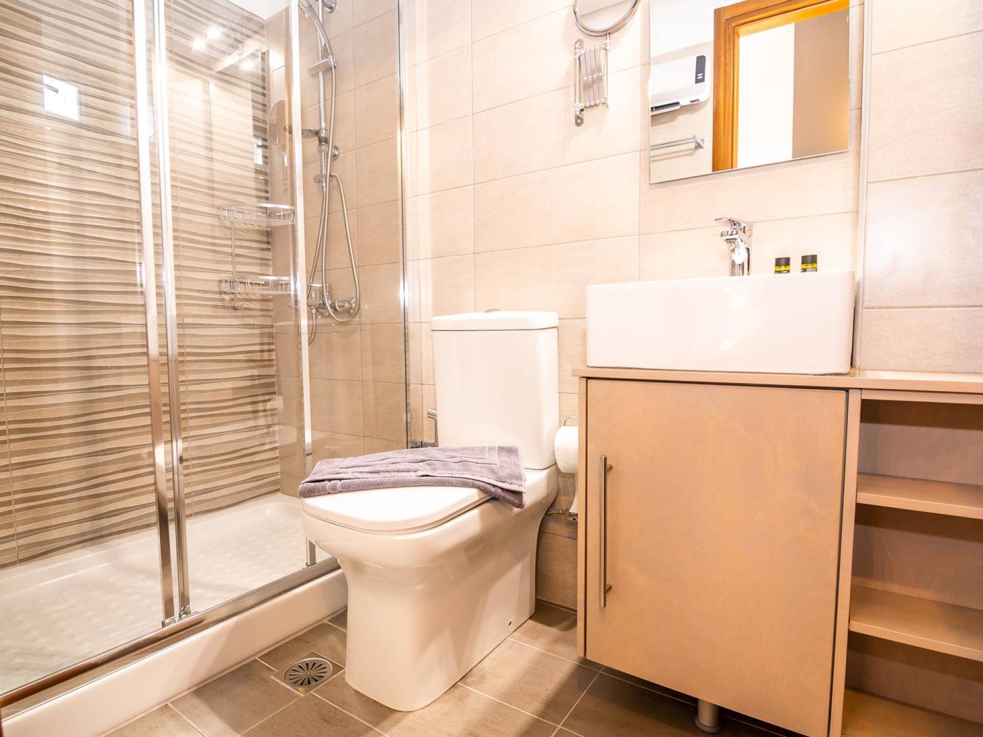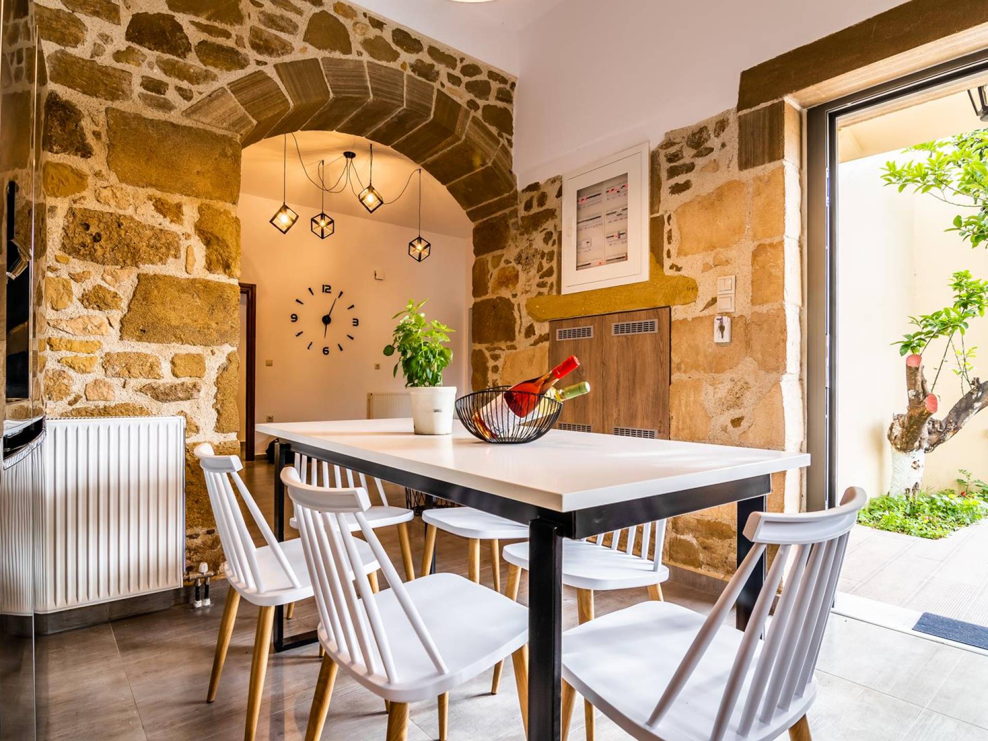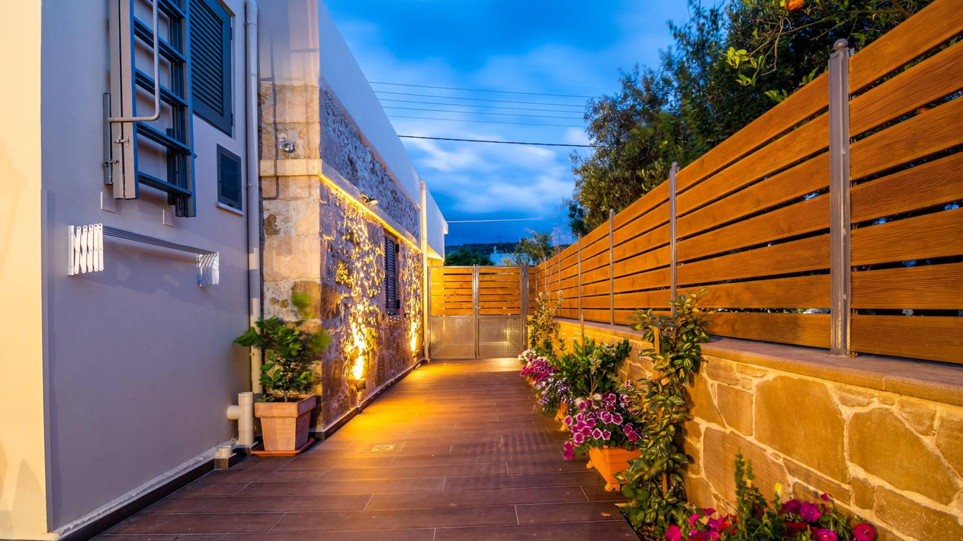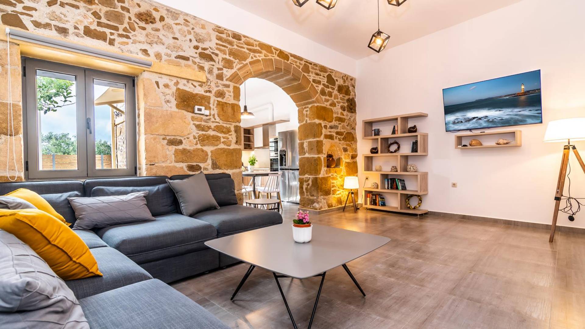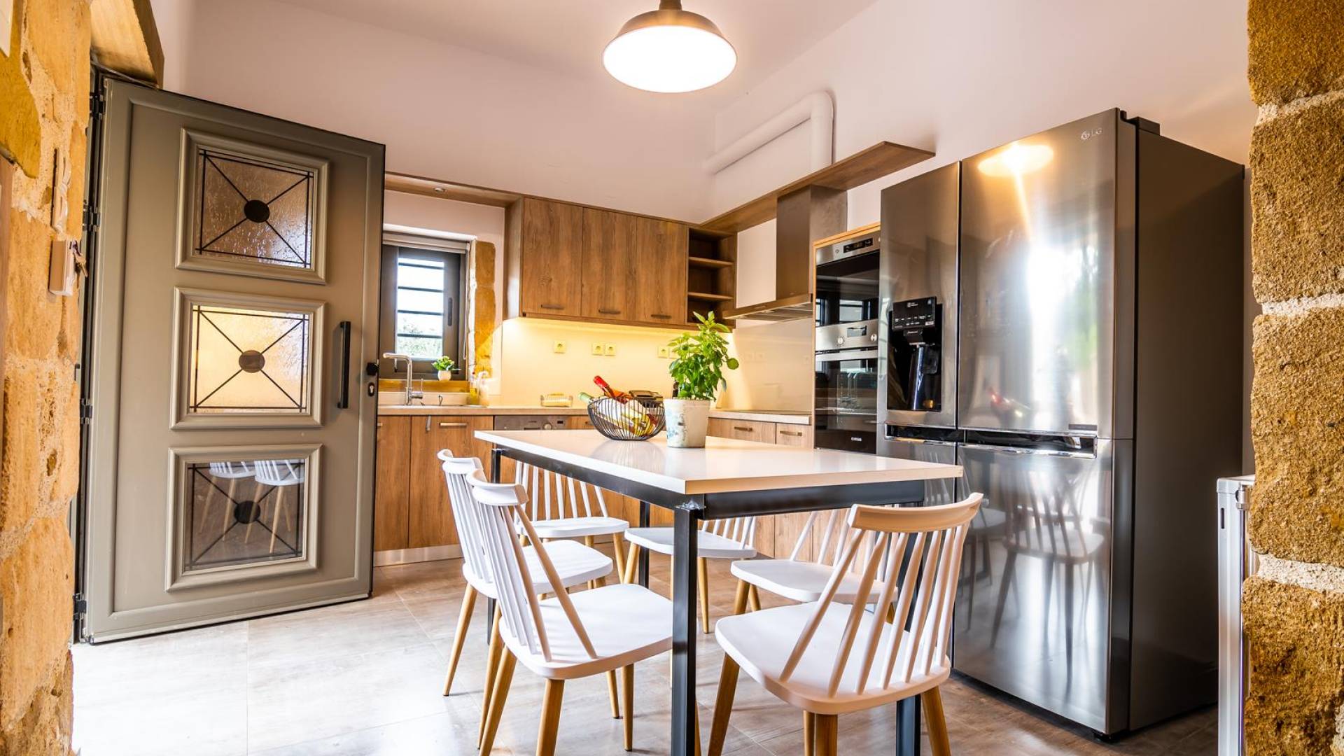La estructura principal está construida en piedra, como una combinación de arquitectura moderna y tradicional. Tiene dos dormitorios con baño privado, sala de estar y cocina. Ambas habitaciones están equipadas con unidades de aire acondicionado independientes, televisores inteligentes planos de 42 pulgadas con conexión a Internet y 3 opciones de satélite (Hotbird, Astra). También hay cajas de seguridad, armarios, espejos y pequeñas mesas de oficina con acceso a Ethernet. Ambos dan acceso a un balcón común orientado a la calle. Uno de los dormitorios tiene una cama de matrimonio (160cm x 205cm) y el otro tiene dos camas individuales (90cm x 205cm) que también se pueden convertir en doble, todas con mesitas de noche.