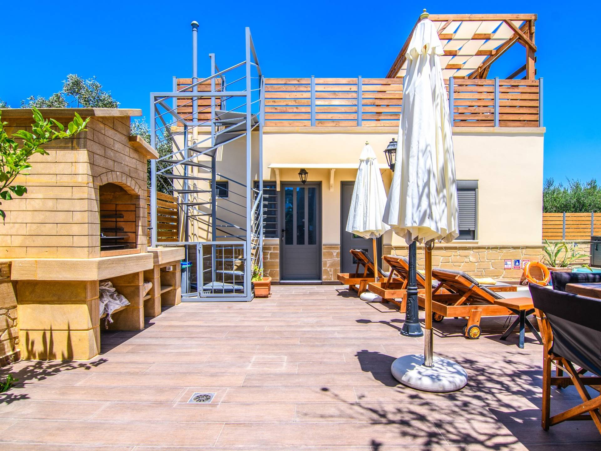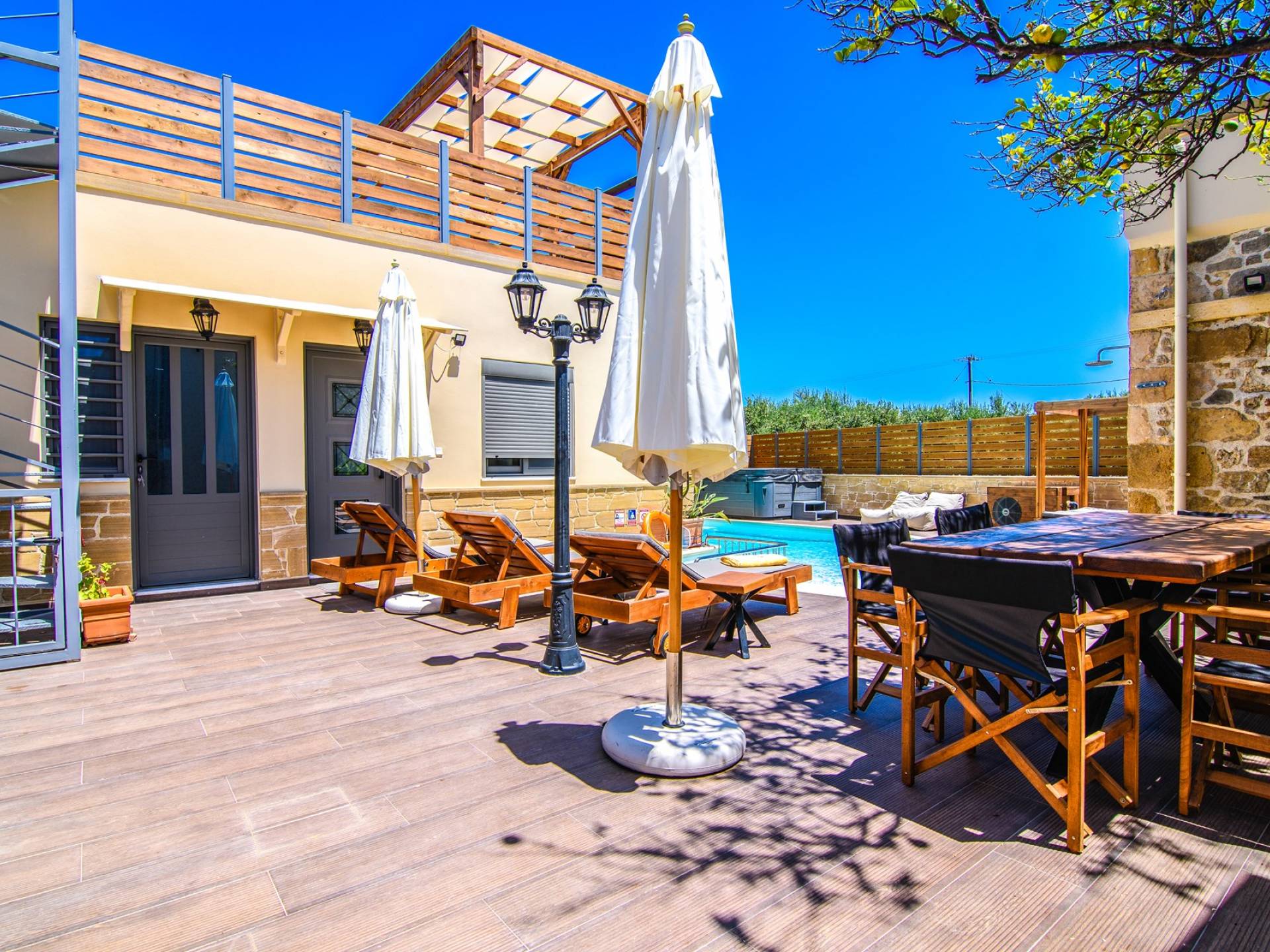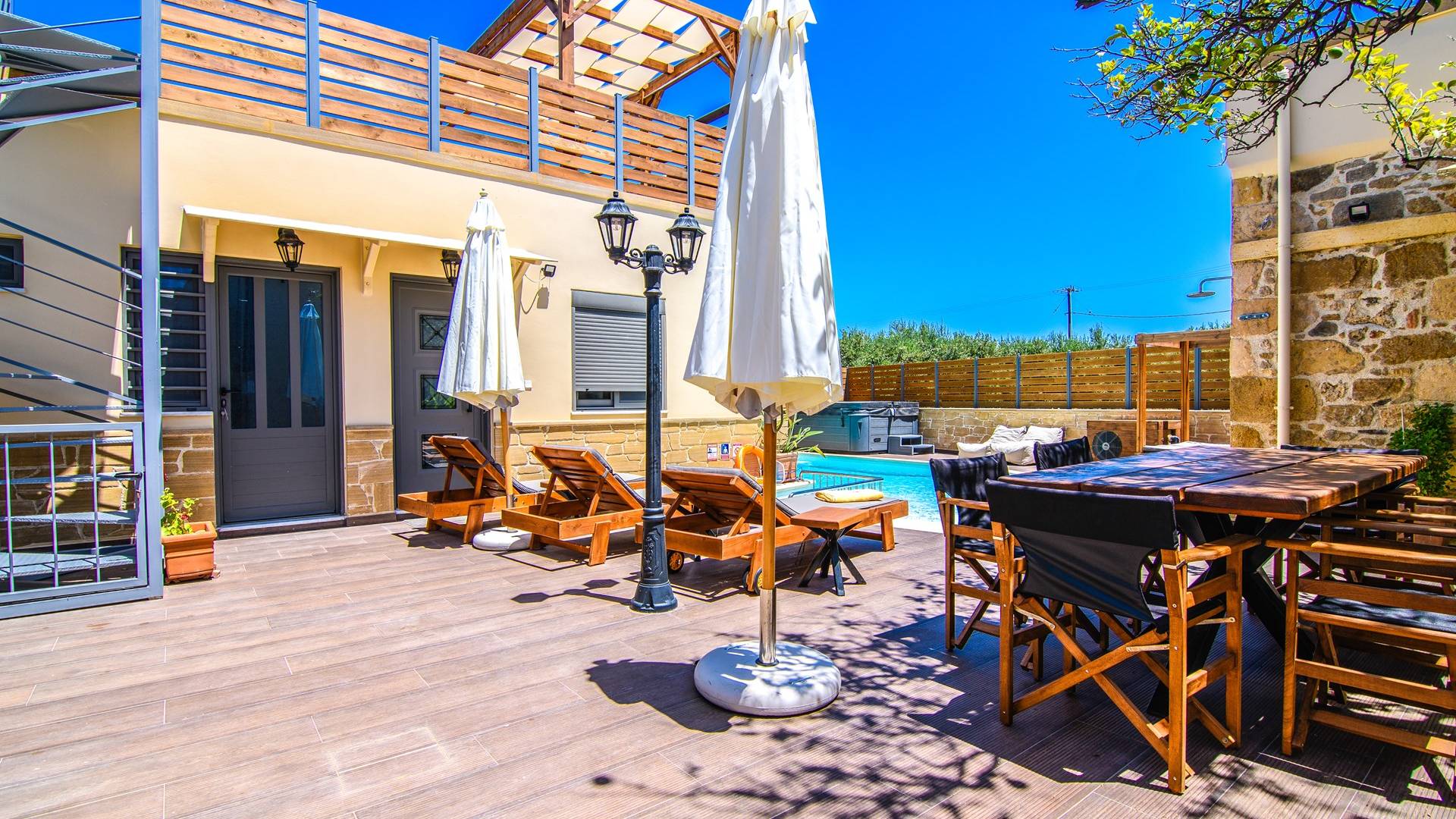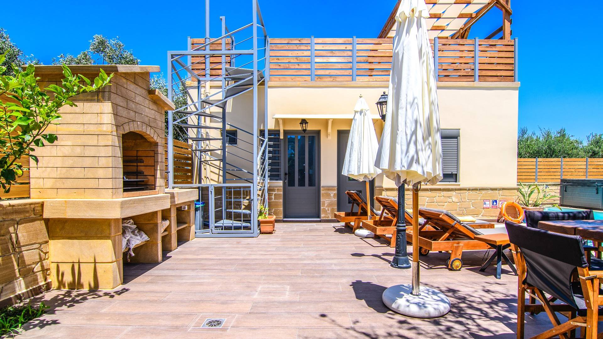 En el exterior, en el espacio entre las dos estructuras, hay una zona de barbacoa con suministro de agua y fregadero, una gran mesa de madera con 8 asientos, una piscina climatizada de 30 m2 (el uso de la función climatizada tiene un cargo adicional), un jacuzzi, sombrillas y tumbonas. En la entrada también hay 2 plazas de aparcamiento.