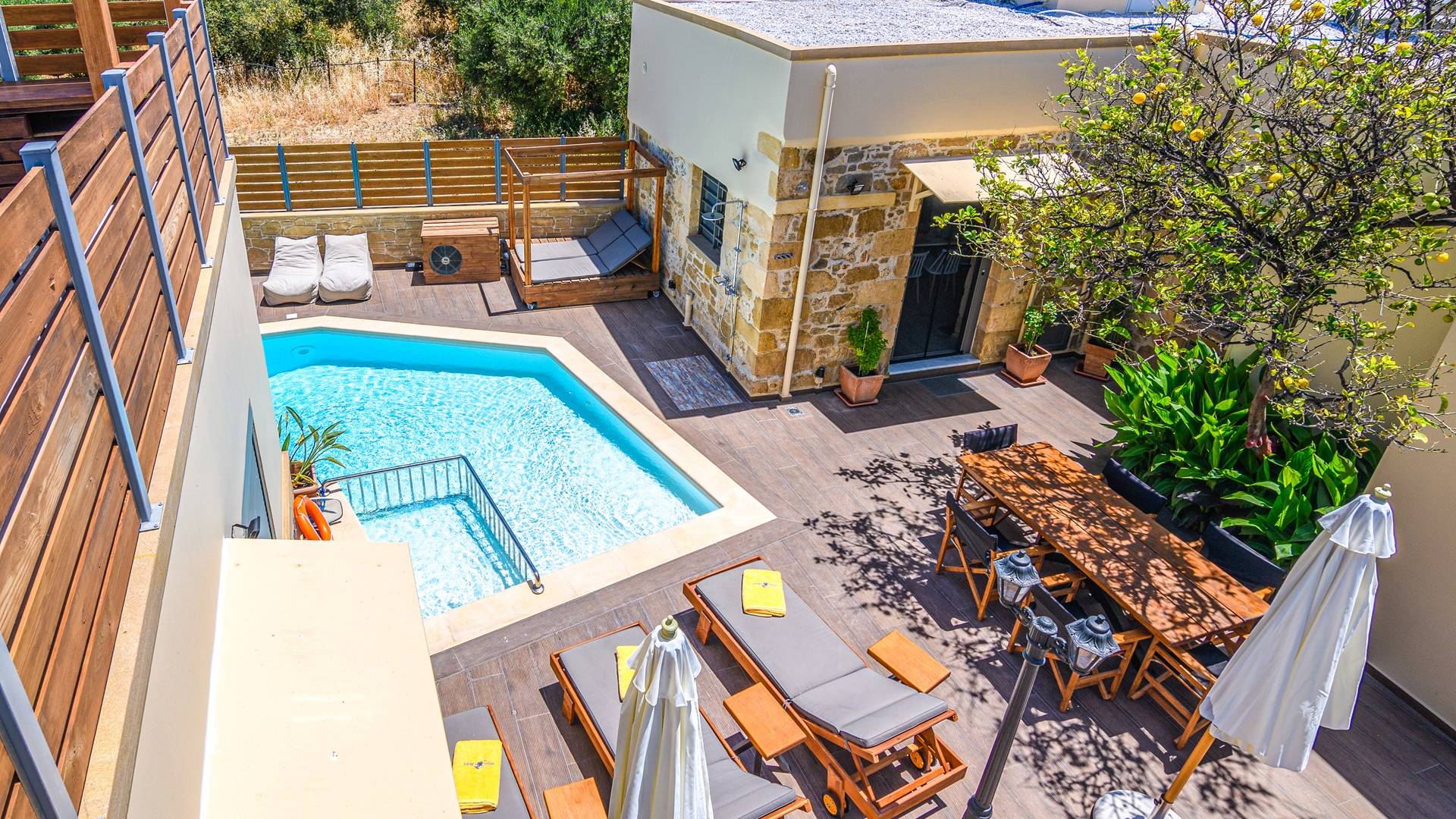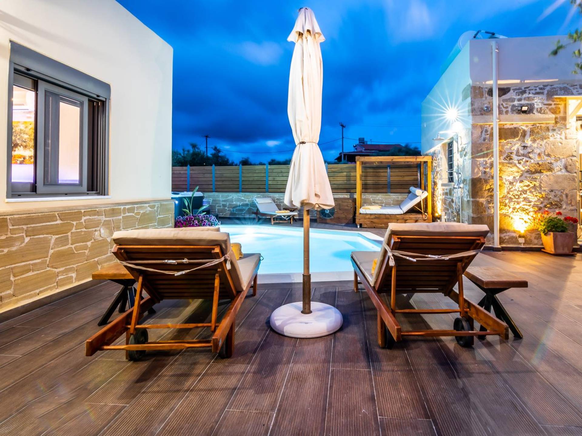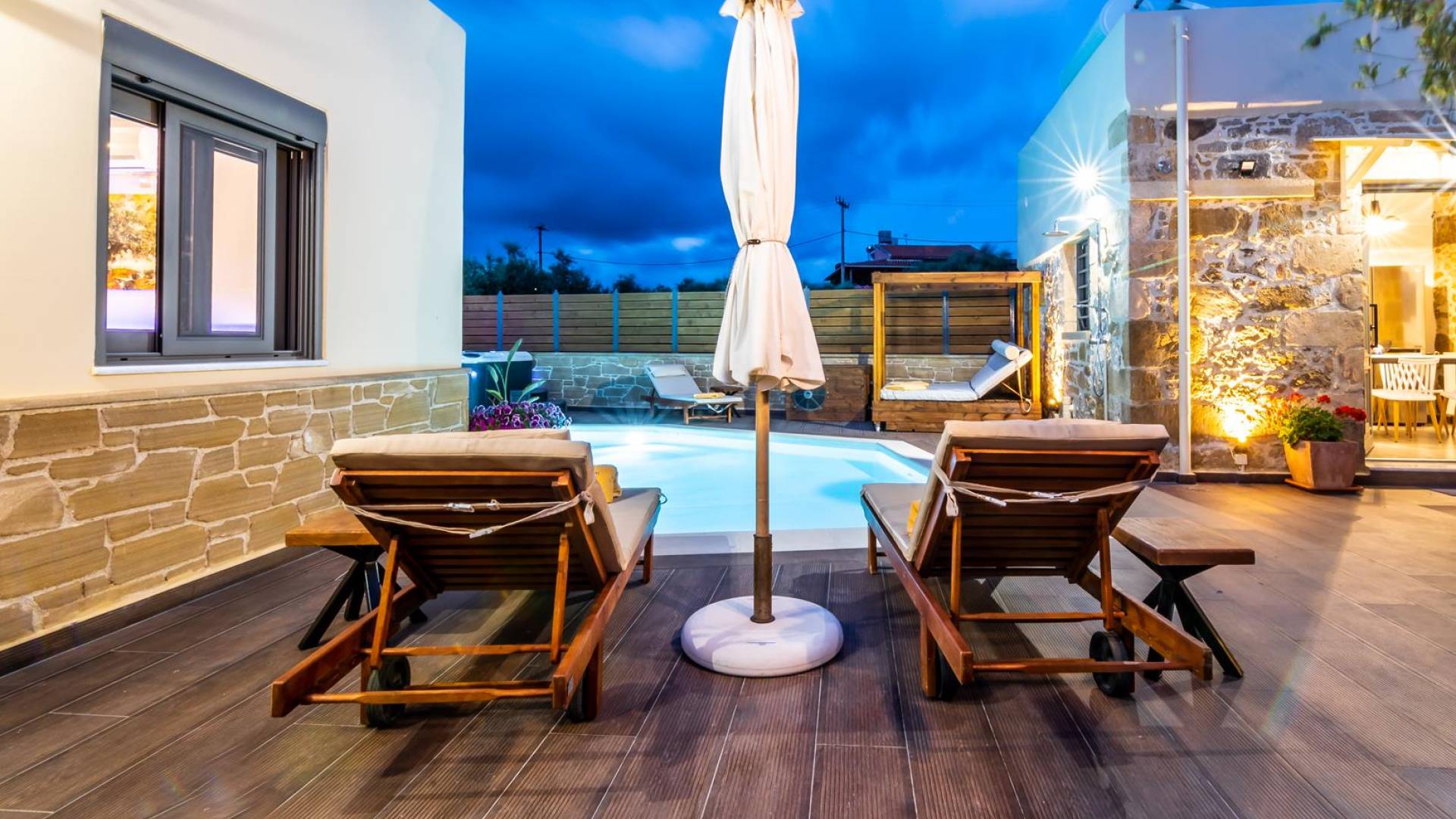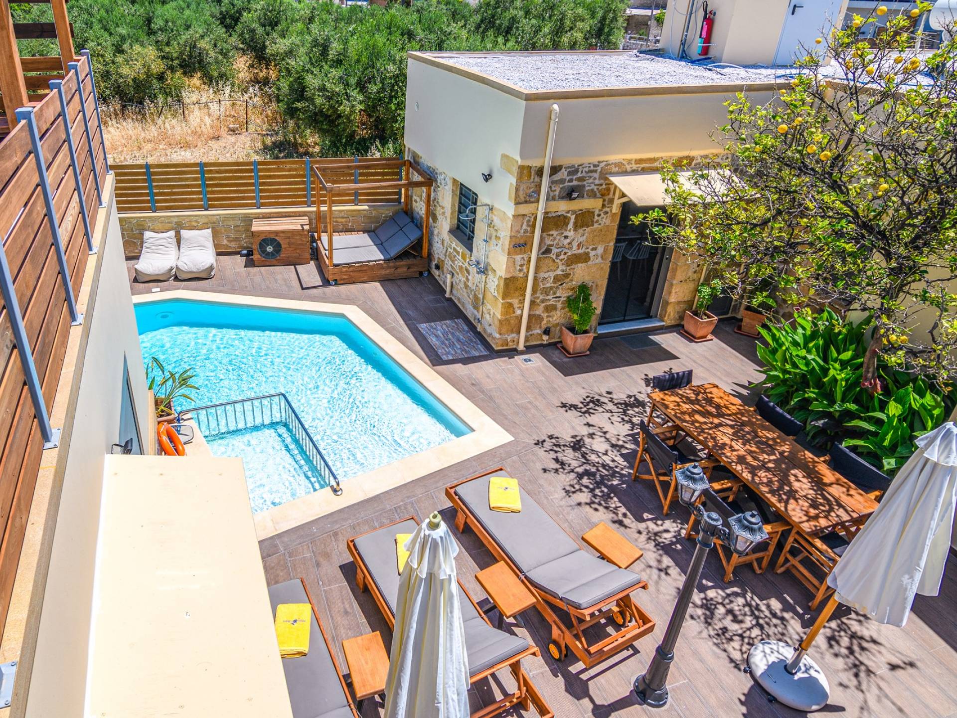 En el exterior, en el espacio entre las dos estructuras, hay una zona de barbacoa con suministro de agua y fregadero, una gran mesa de madera con 8 asientos, una piscina climatizada de 30 m2 (el uso de la función climatizada tiene un cargo adicional), un jacuzzi, sombrillas y tumbonas. En la entrada también hay 2 plazas de aparcamiento.