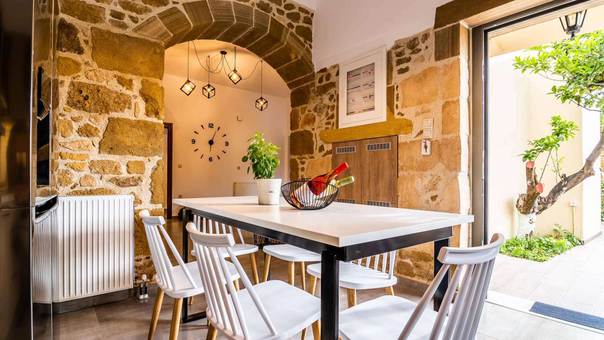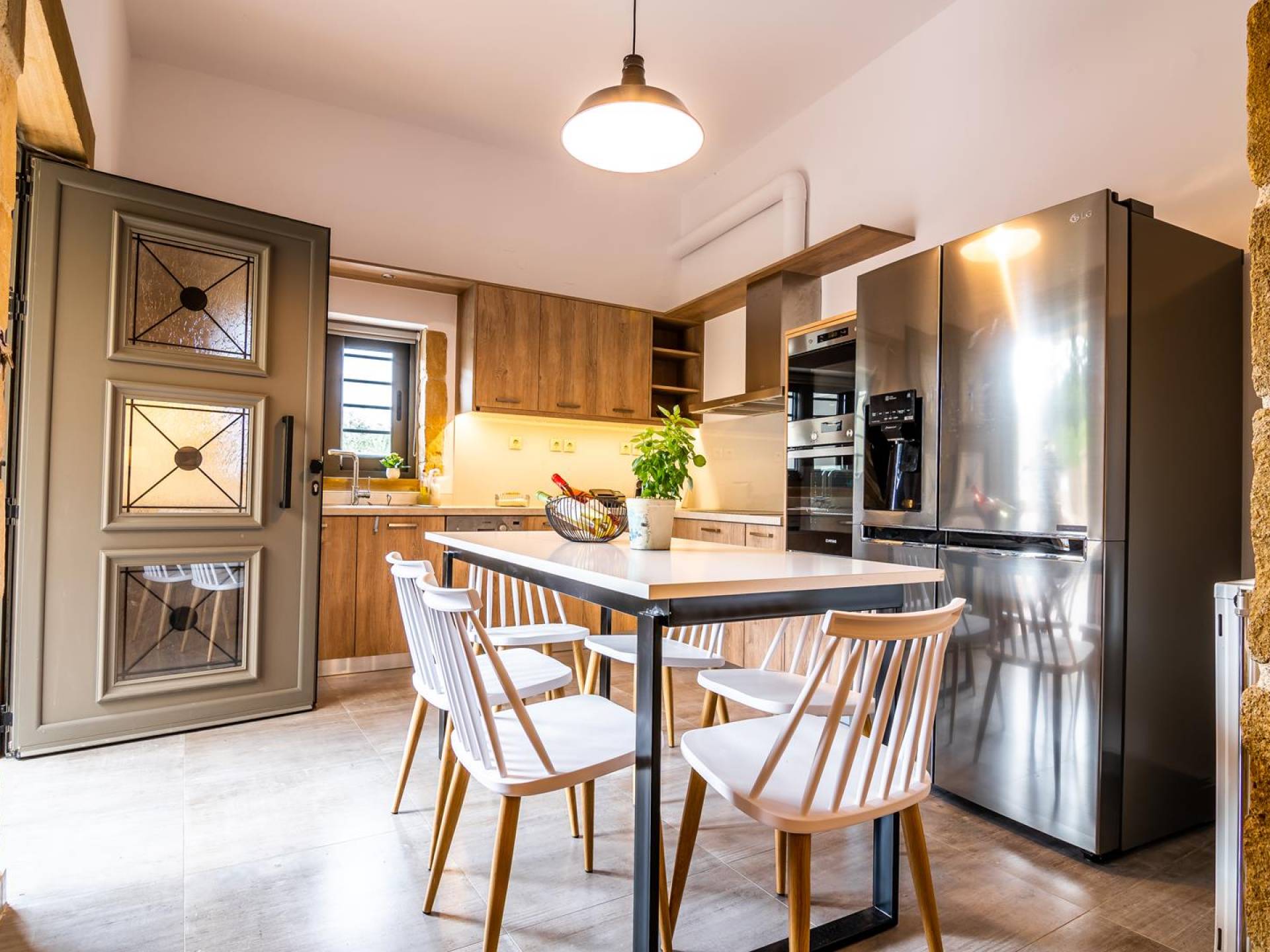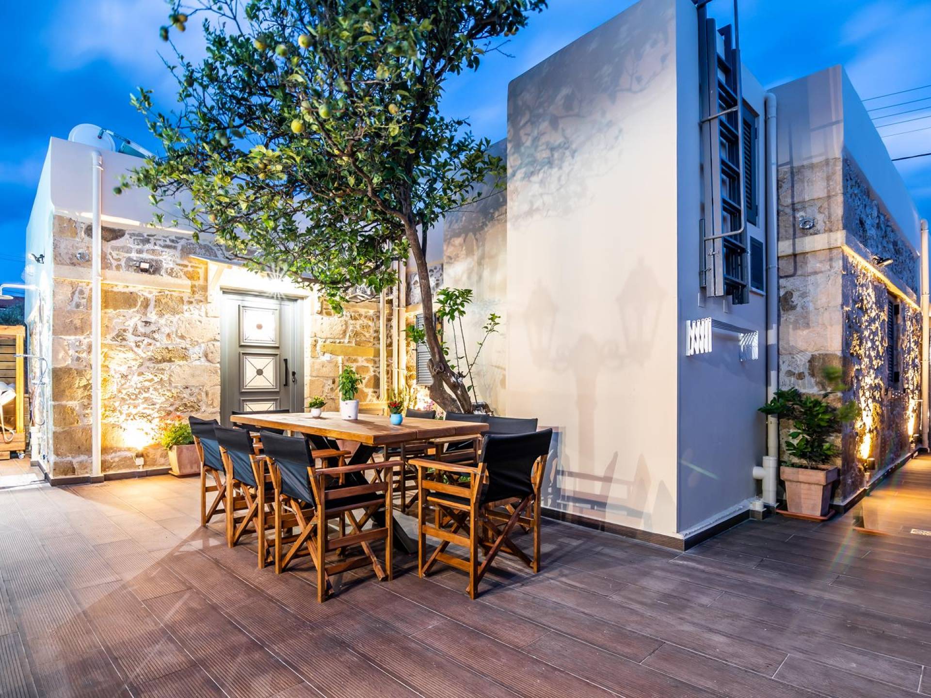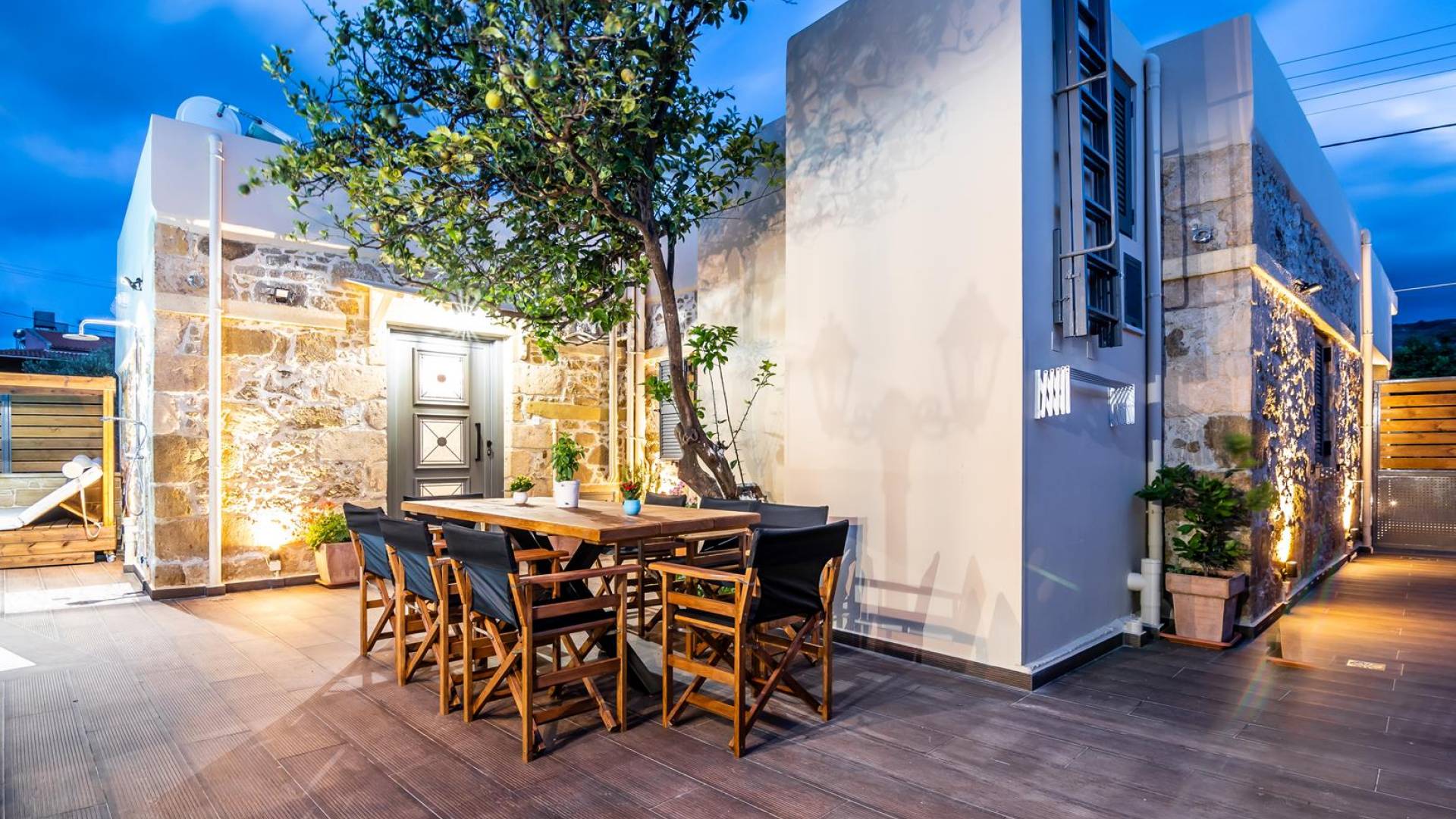 En el exterior, en el espacio entre las dos estructuras, hay una zona de barbacoa con suministro de agua y fregadero, una gran mesa de madera con 8 asientos, una piscina climatizada de 30 m2 (el uso de la función climatizada tiene un cargo adicional), un jacuzzi, sombrillas y tumbonas. En la entrada también hay 2 plazas de aparcamiento.
