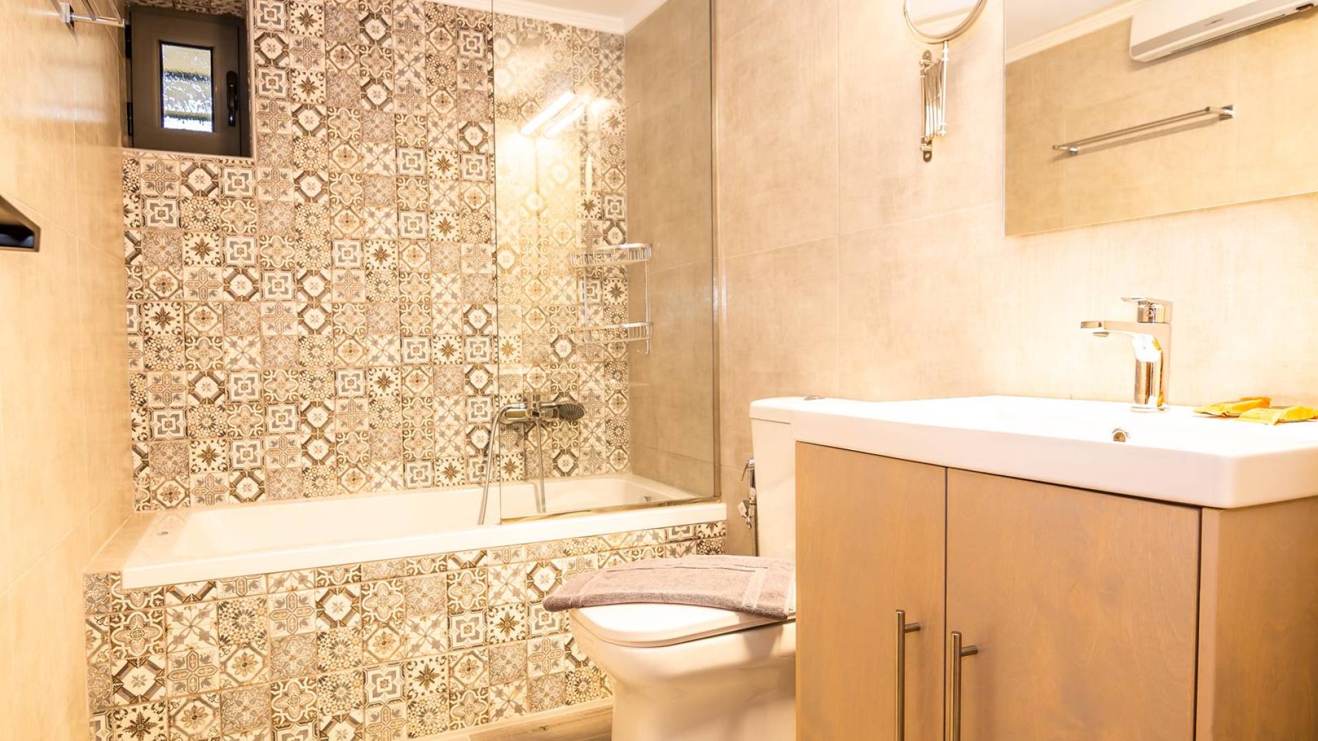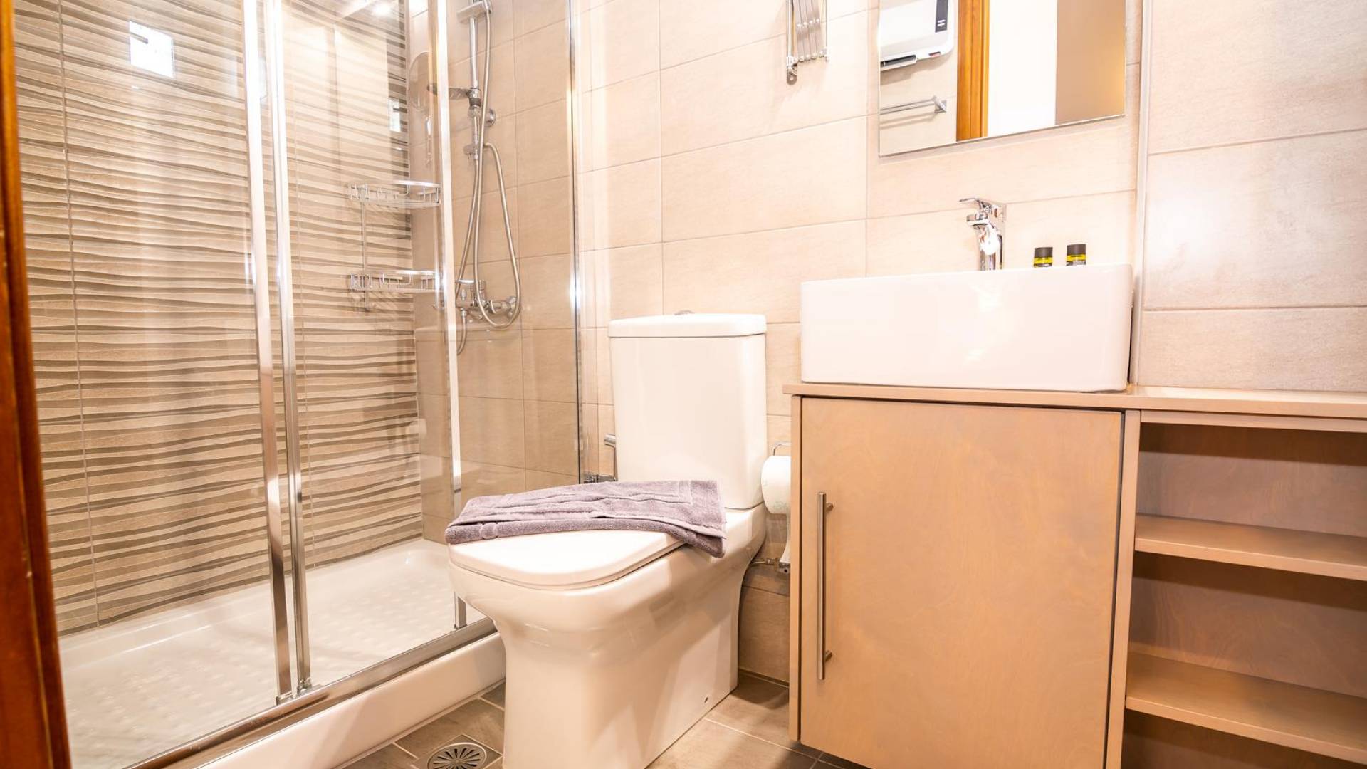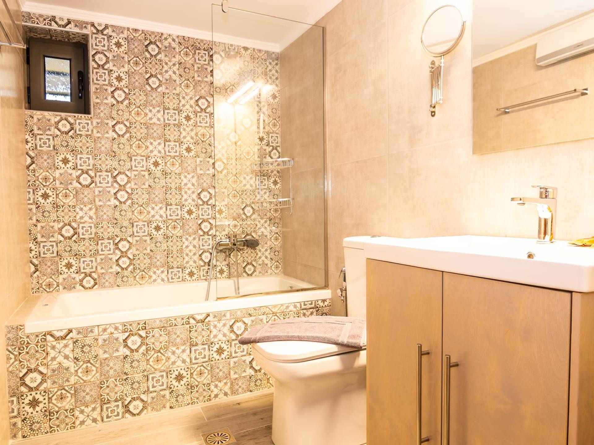 Uno de los baños tiene ducha y el otro bañera. Ambos, además de lo imprescindible, también cuentan con calefactores de baño, duchas con bidé, espejos de aumento y secador de pelo. El salón es espacioso con un cómodo sofá grande en forma de L que se puede convertir en dos camas individuales, un televisor inteligente plano de 55 pulgadas con acceso a Internet y tres opciones de satélite y una unidad de aire acondicionado independiente. La cocina está amueblada con una mesa para seis personas y bien equipada con fregadero doble, horno, cuatro hornallas, microondas, lavavajillas, nevera de dos puertas con opción de agua y cubitos de hielo, así como muchos otros electrodomésticos. Además, la estructura principal ofrece un pequeño espacio auxiliar con lavadora (8 kg) y secadora (8 kg).