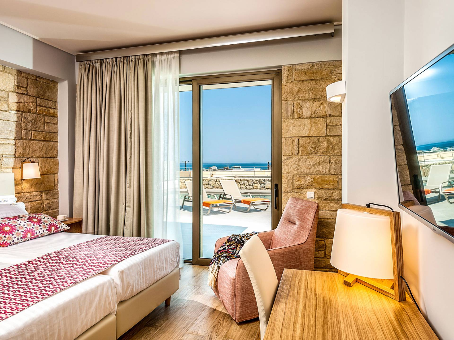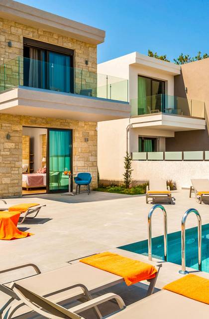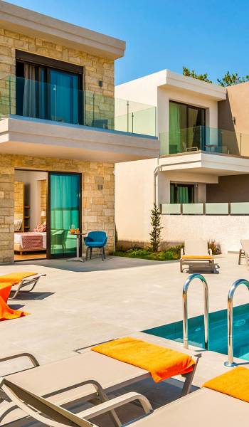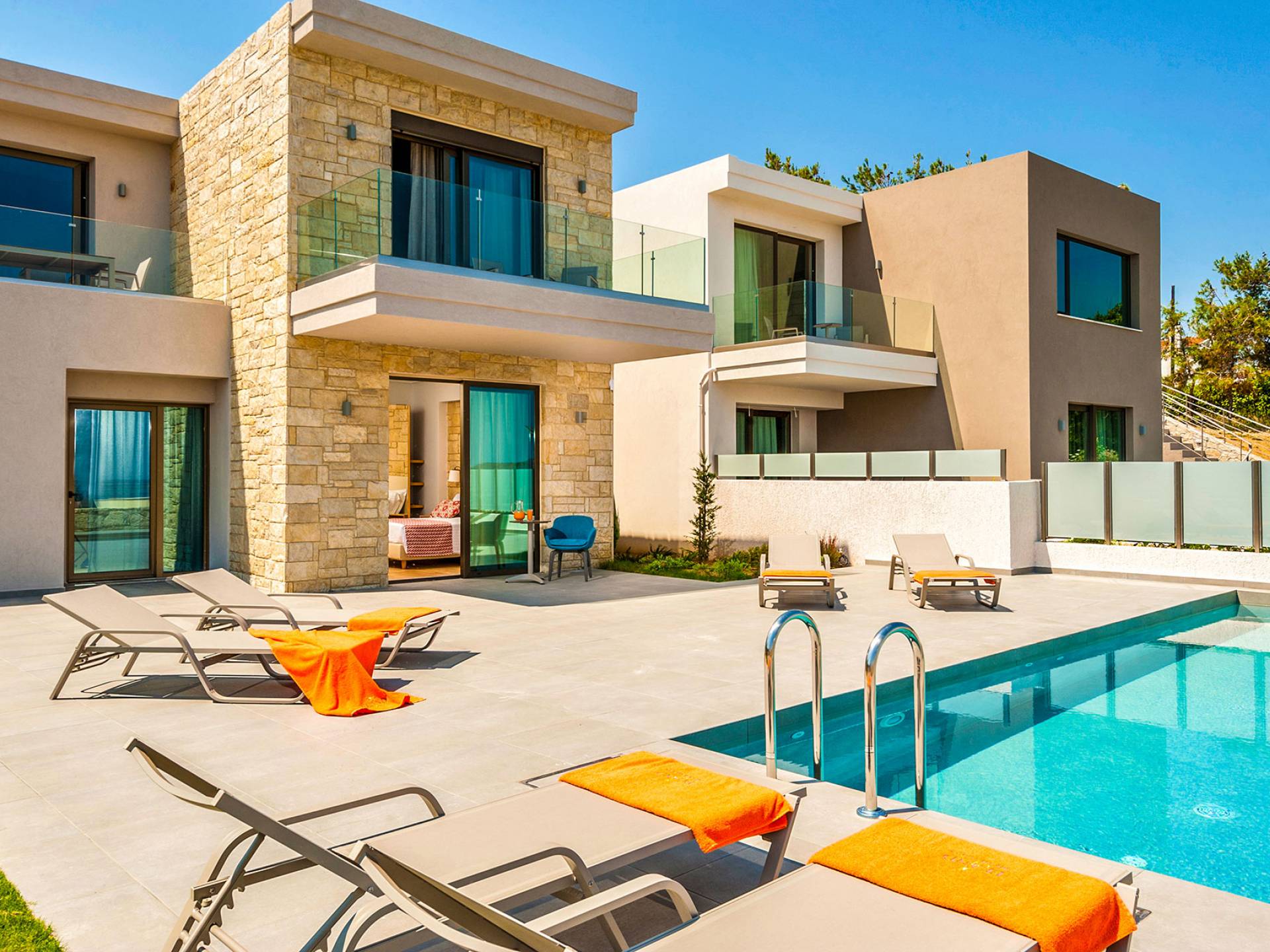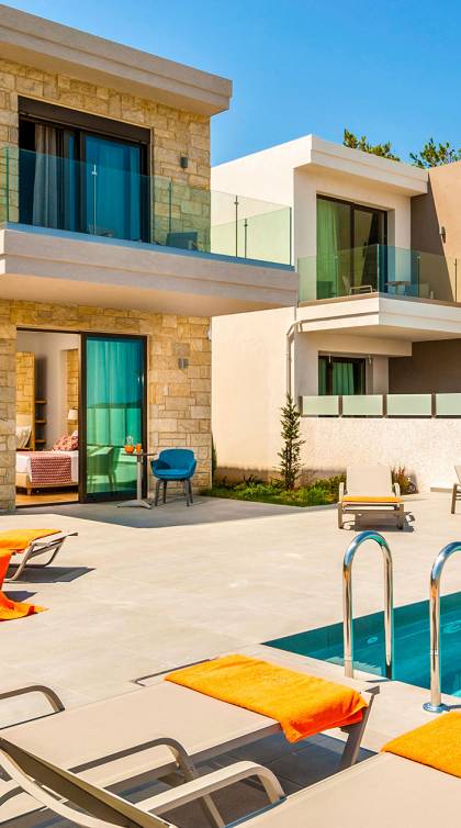 Alojarse en una villa en Kalamaki significa despertar con el suave sonido del mar y disfrutar el café de la mañana con vistas panorámicas al mar Egeo. Con piscinas privadas, terrazas soleadas y la libertad de ir a tu propio ritmo, tu villa se convierte en una parte esencial de la experiencia, no solo un lugar donde dormir.