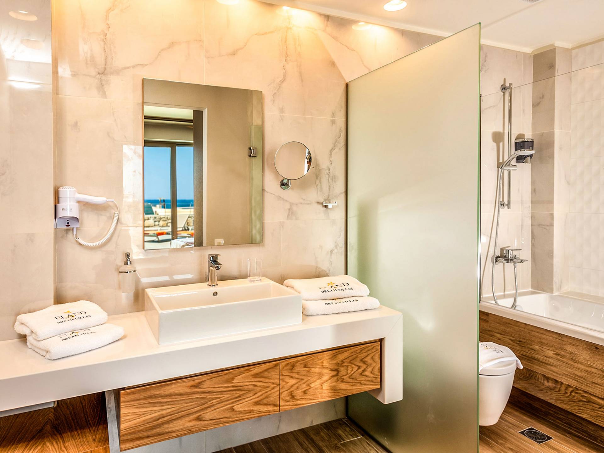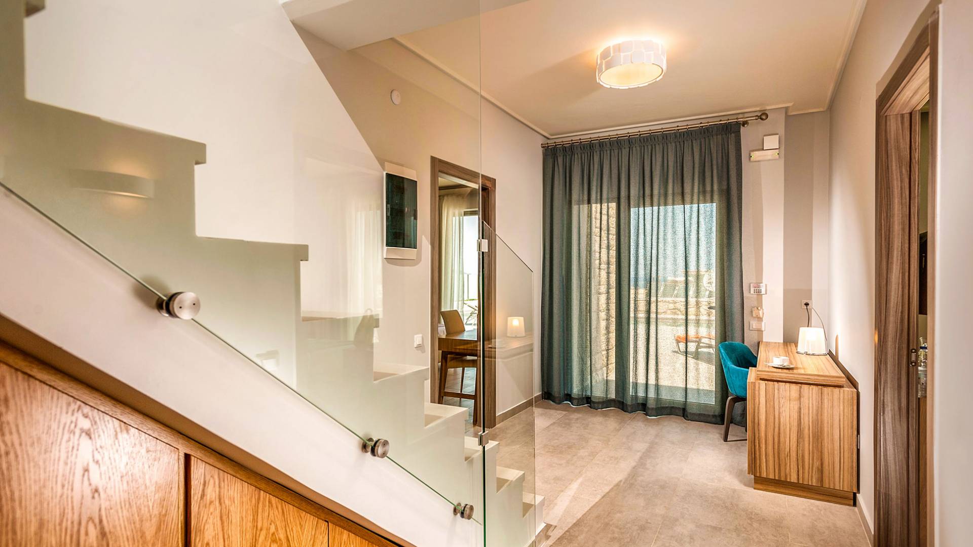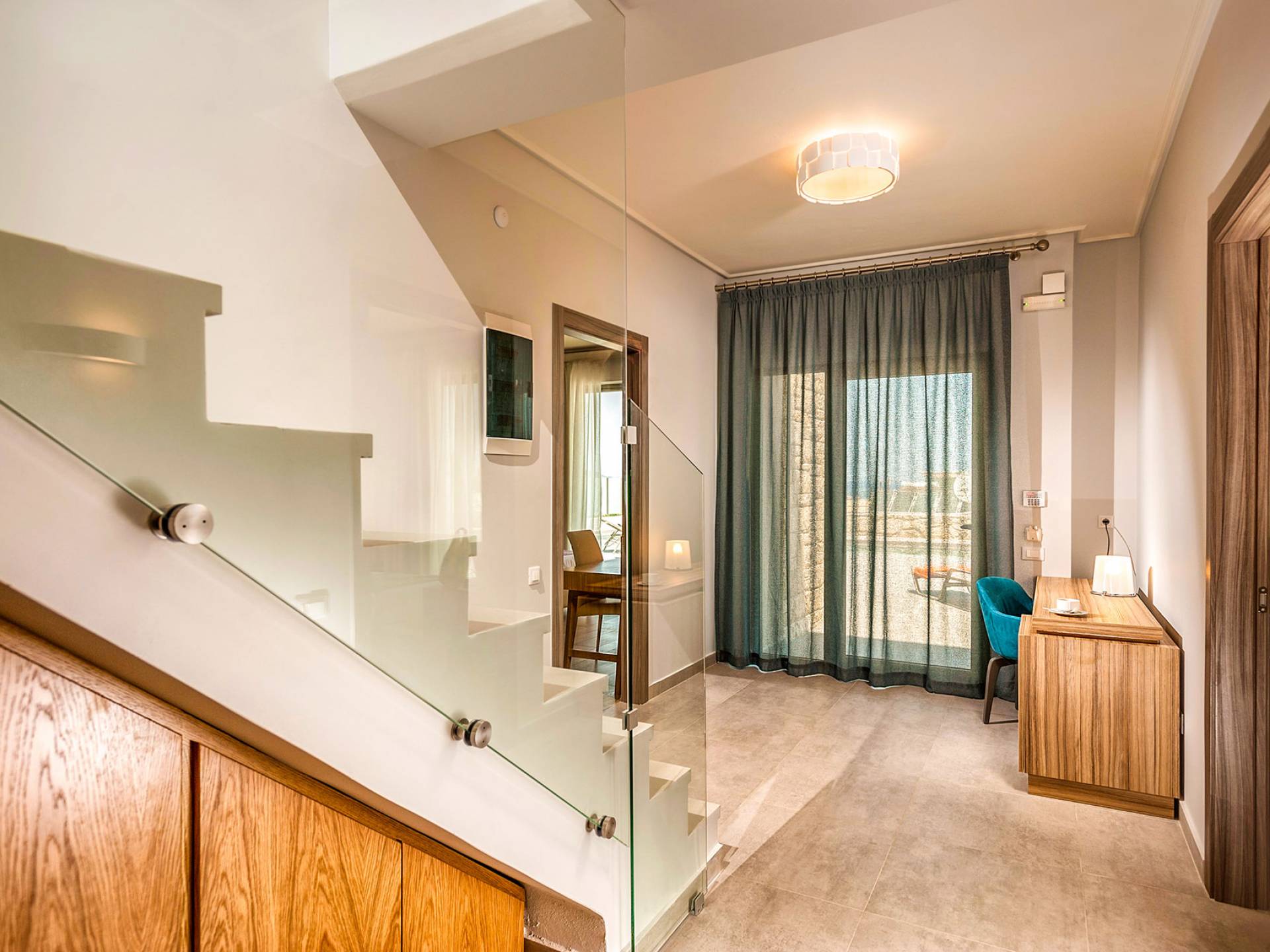 En el primer piso, hay una cocina espaciosa y totalmente equipada que está bañada por la luz natural del balcón. La gran terraza que conduce desde la cocina ofrece infinitas vistas del mar y la zona de la piscina. En la misma planta, hay un dormitorio bellamente amueblado con paredes de piedra y un baño en suite. Se pueden ver maravillosas vistas panorámicas desde este dormitorio mientras la luz del sol entra por las ventanas. Una escalera conduce a la planta baja donde se encuentran 2 dormitorios más con vistas al mar y a la piscina que harán que los huéspedes se sientan como en casa. Los 2 dormitorios tienen baños en suite. Eland Villa Aiolos Chania también tiene un minibar, encontrará refrescos, cervezas, vino griego y el espíritu local de Creta Raki. Junto al minibar, hay un sofá para relajarse y ver la televisión.