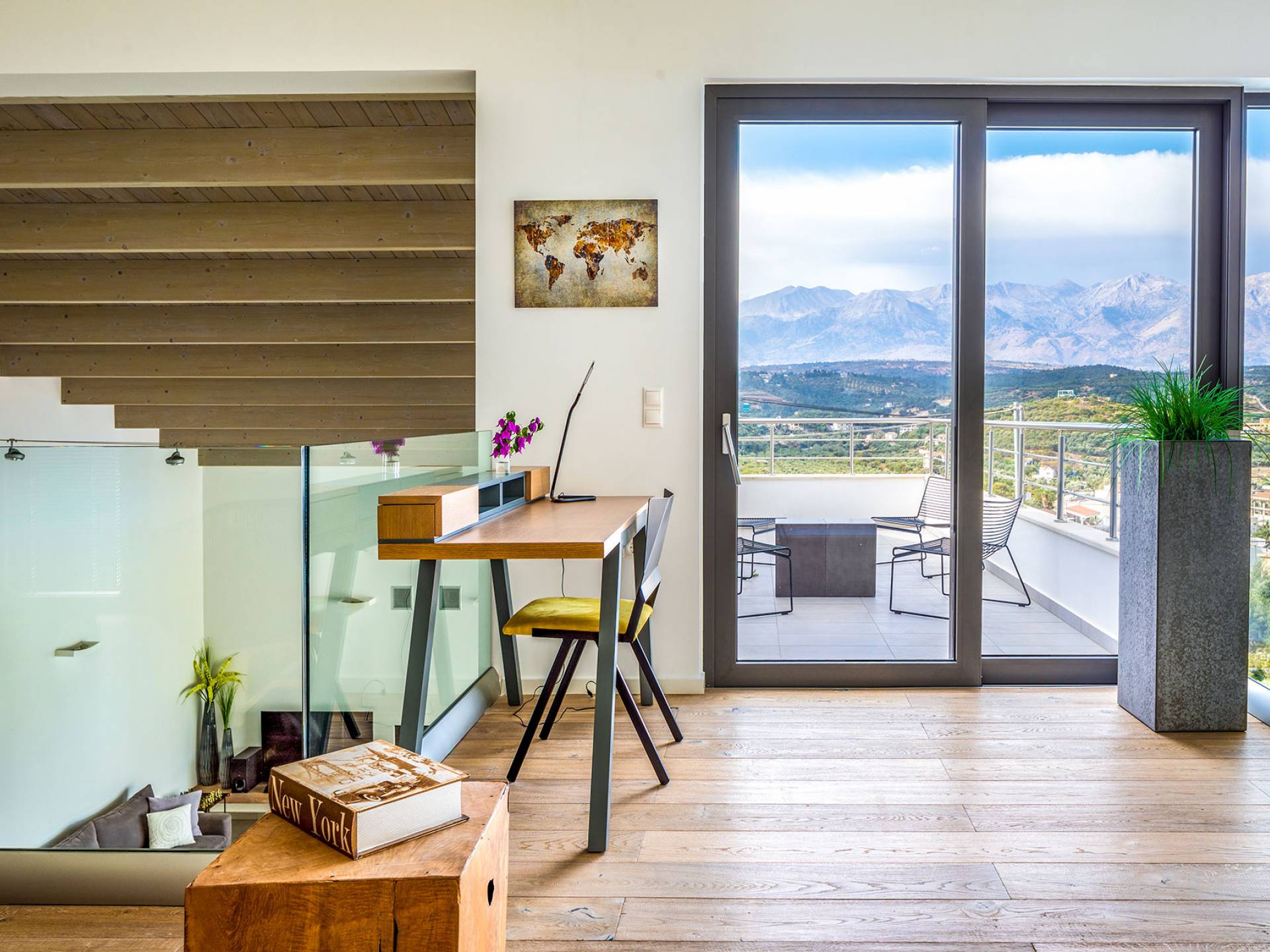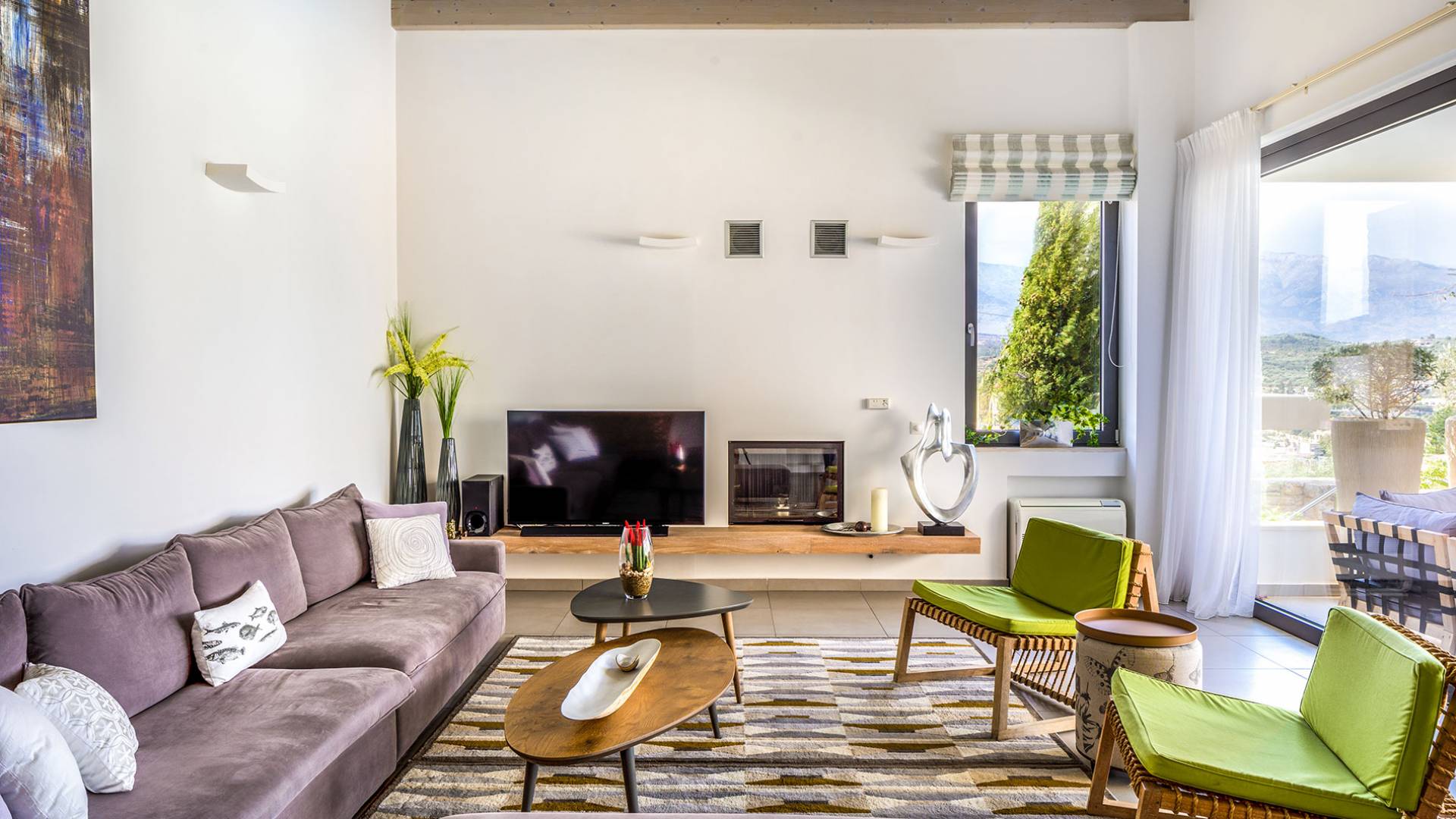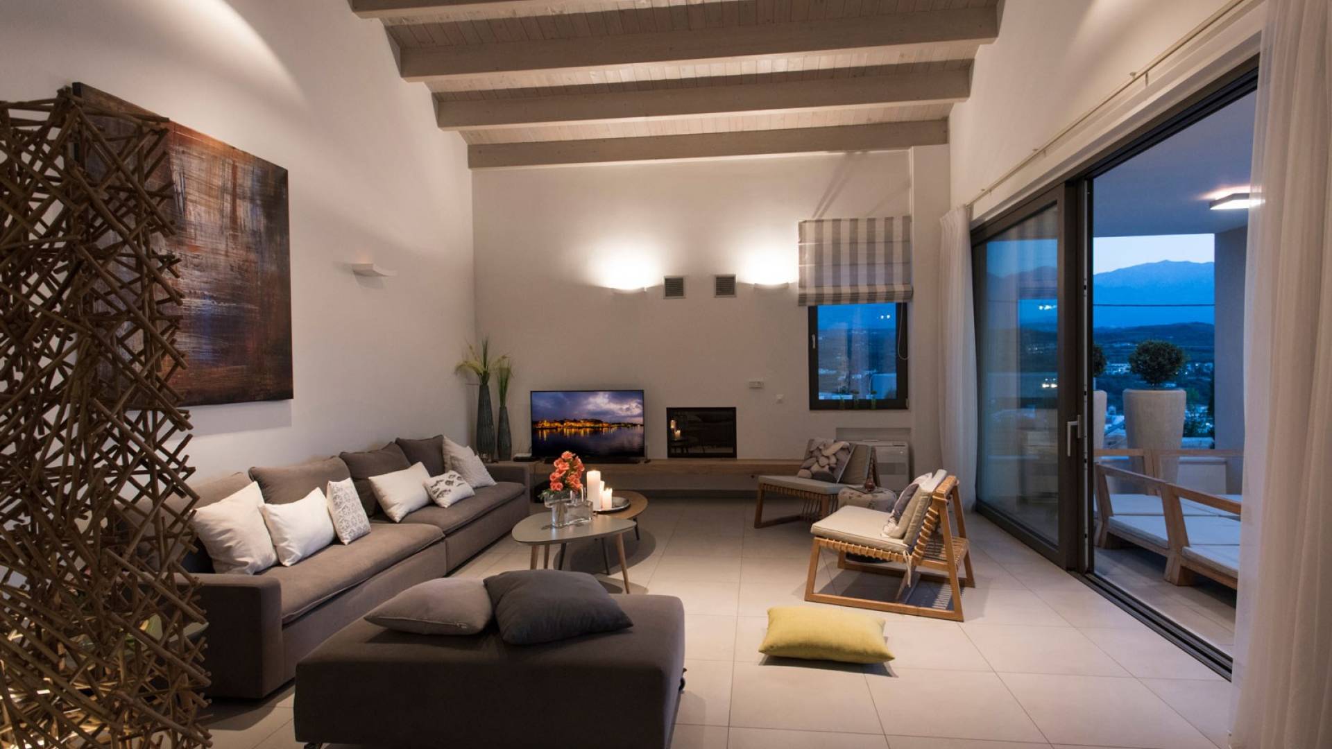 Al ingresar a Karga Villa Chania, experimentará la impresionante vista del área de la piscina, el pueblo, las Montañas Blancas y el mar azul. Las puertas corredizas lo conducen a una amplia terraza donde puede disfrutar de la hermosa puesta de sol por las noches. Hay dos dormitorios en el primer piso y dos dormitorios en la planta baja. Todas las habitaciones tienen su propio baño privado con bañera y una terraza o terraza amueblada. Armarios amplios, caja de seguridad, tocador y TV vía satélite en todos los dormitorios.