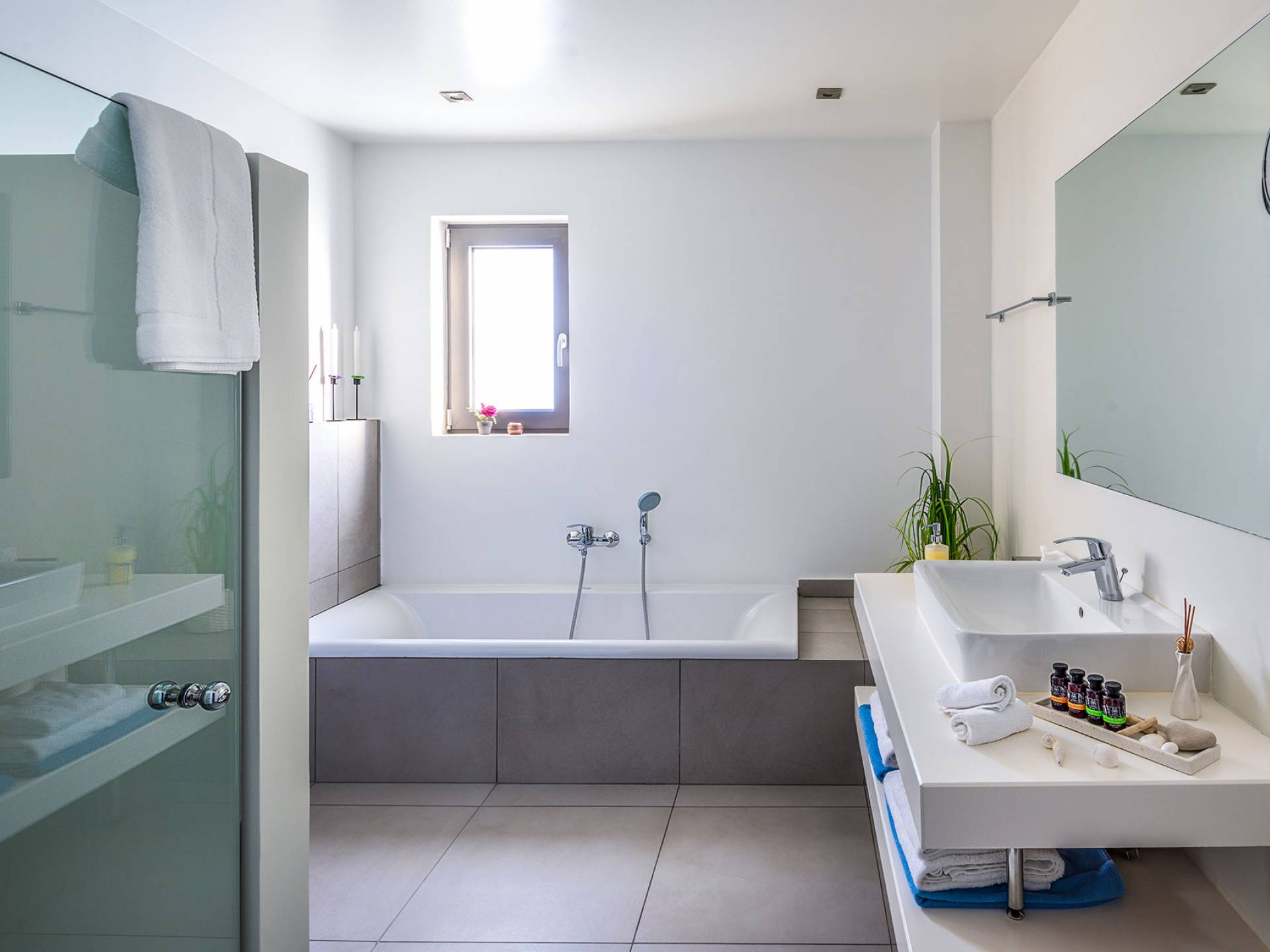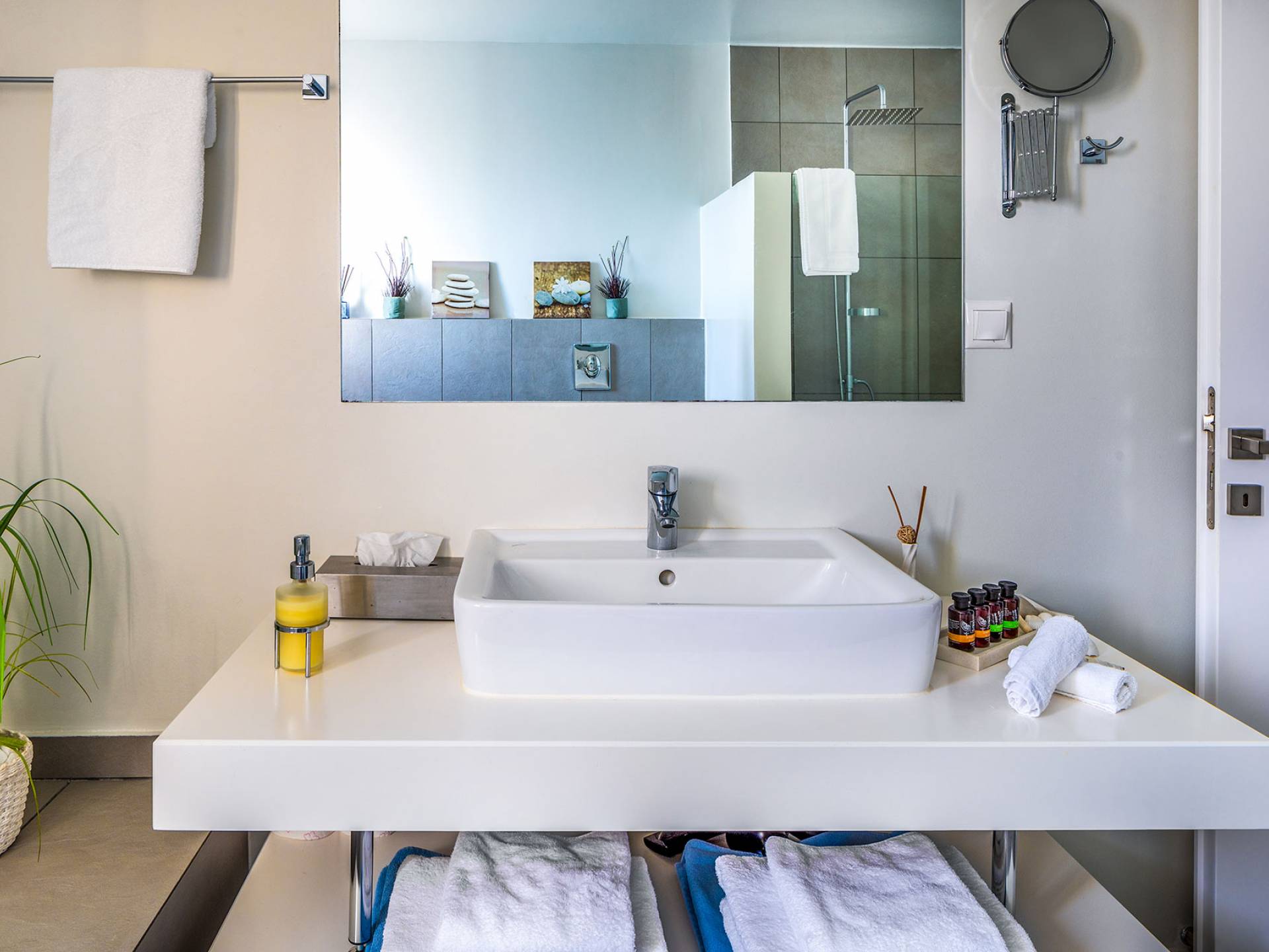 El área de la piscina con azulejos con hamacas, sombrillas y áreas de descanso donde puede disfrutar de la vista y nadar en su piscina privada (45 m2), está perfectamente incorporada a la casa. En el sótano, encontrará un gimnasio bien equipado y otro gran baño con hammam (baño de vapor). Un pequeño "centro de bienestar" privado ... ¡perfecto para la recreación!