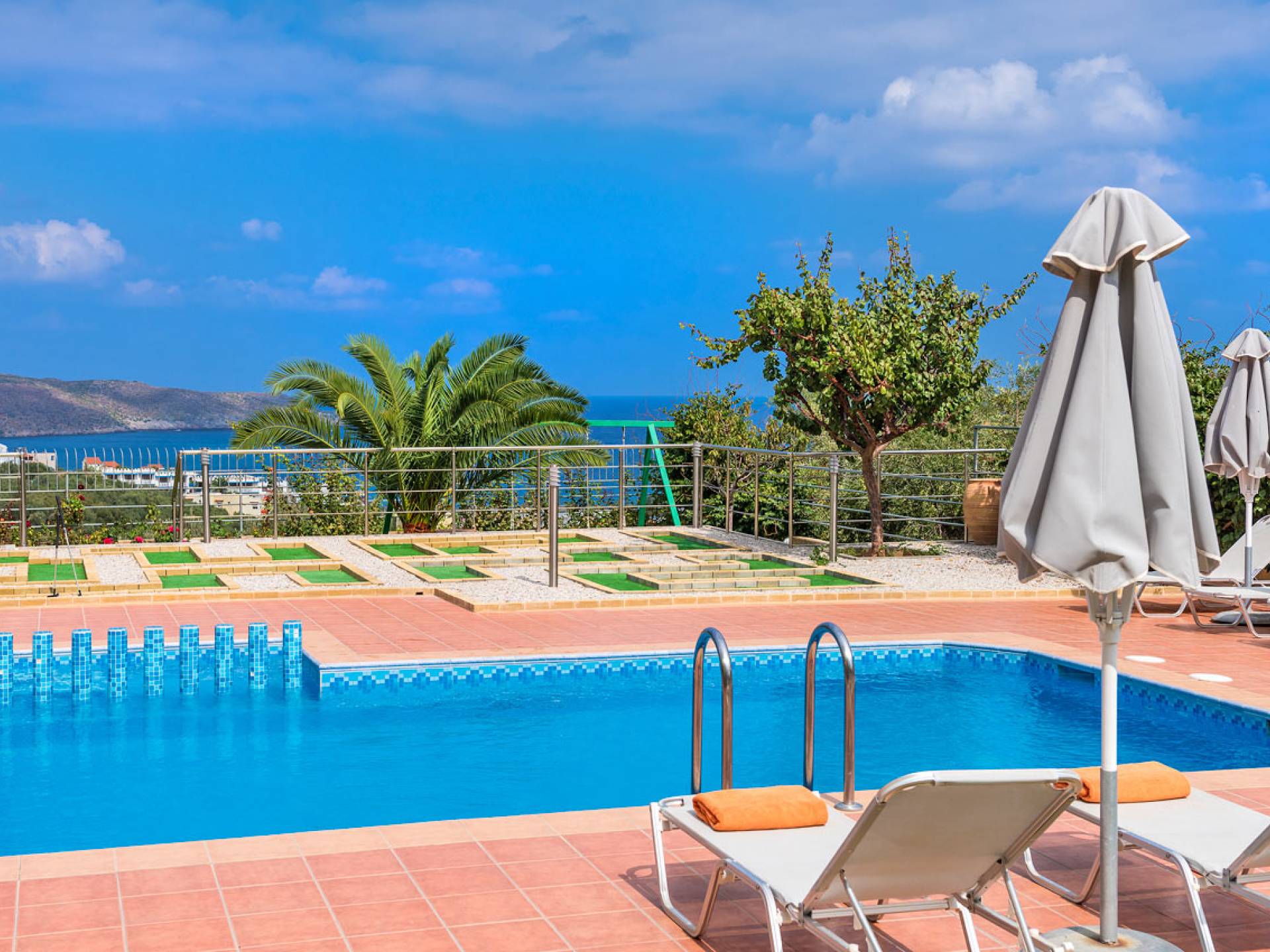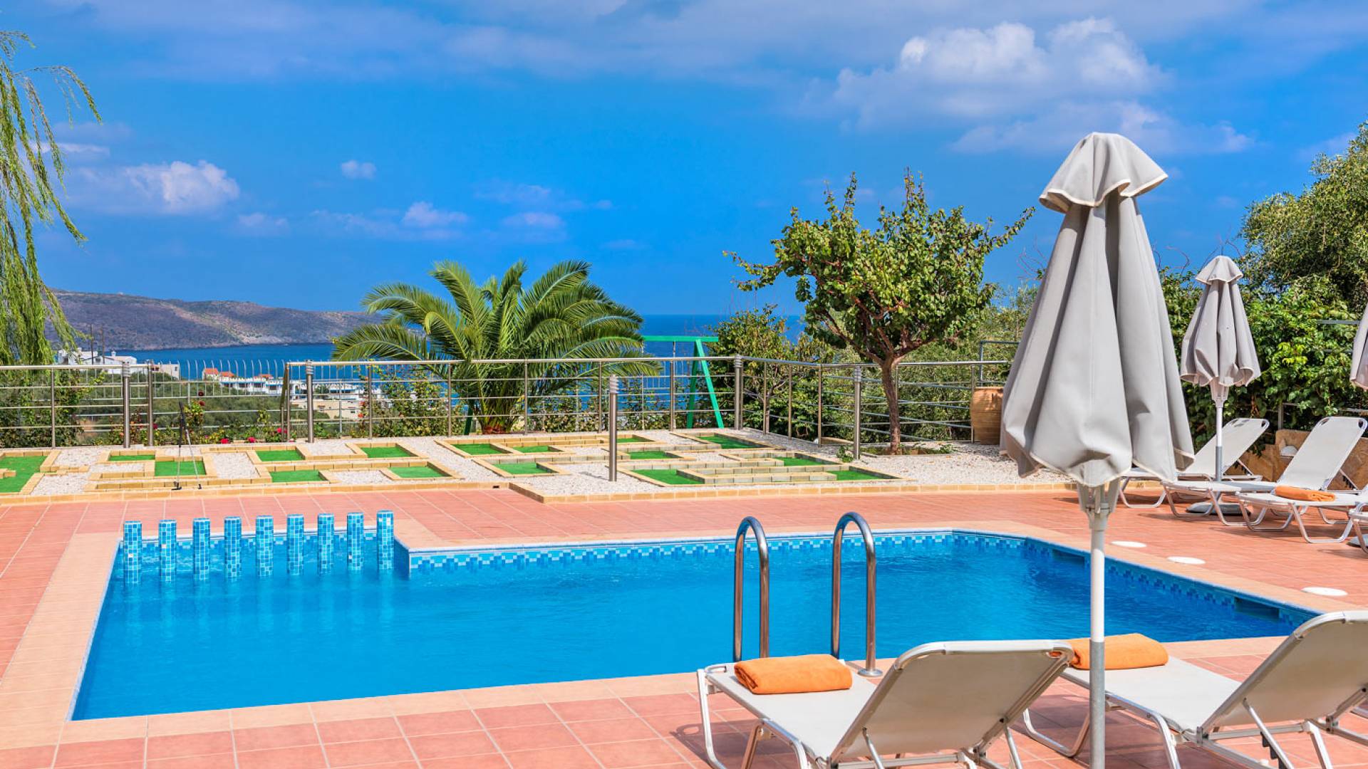 En el exterior, hay una piscina privada de 40 m2 y un minigolf. Los alrededores están cubiertos de olivares. El jardín privado de la villa se divide en una zona de aparcamiento, una zona de césped y una zona cubierta con pérgola de madera, donde se encuentra la barbacoa y un juego de comedor de jardín. La piscina está rodeada de tumbonas y sombrillas para momentos de relax y admirar la vista panorámica. La zona con césped es un lugar perfecto para que jueguen los niños, ya que hay columpios. También disfrutarás del minigolf privado.