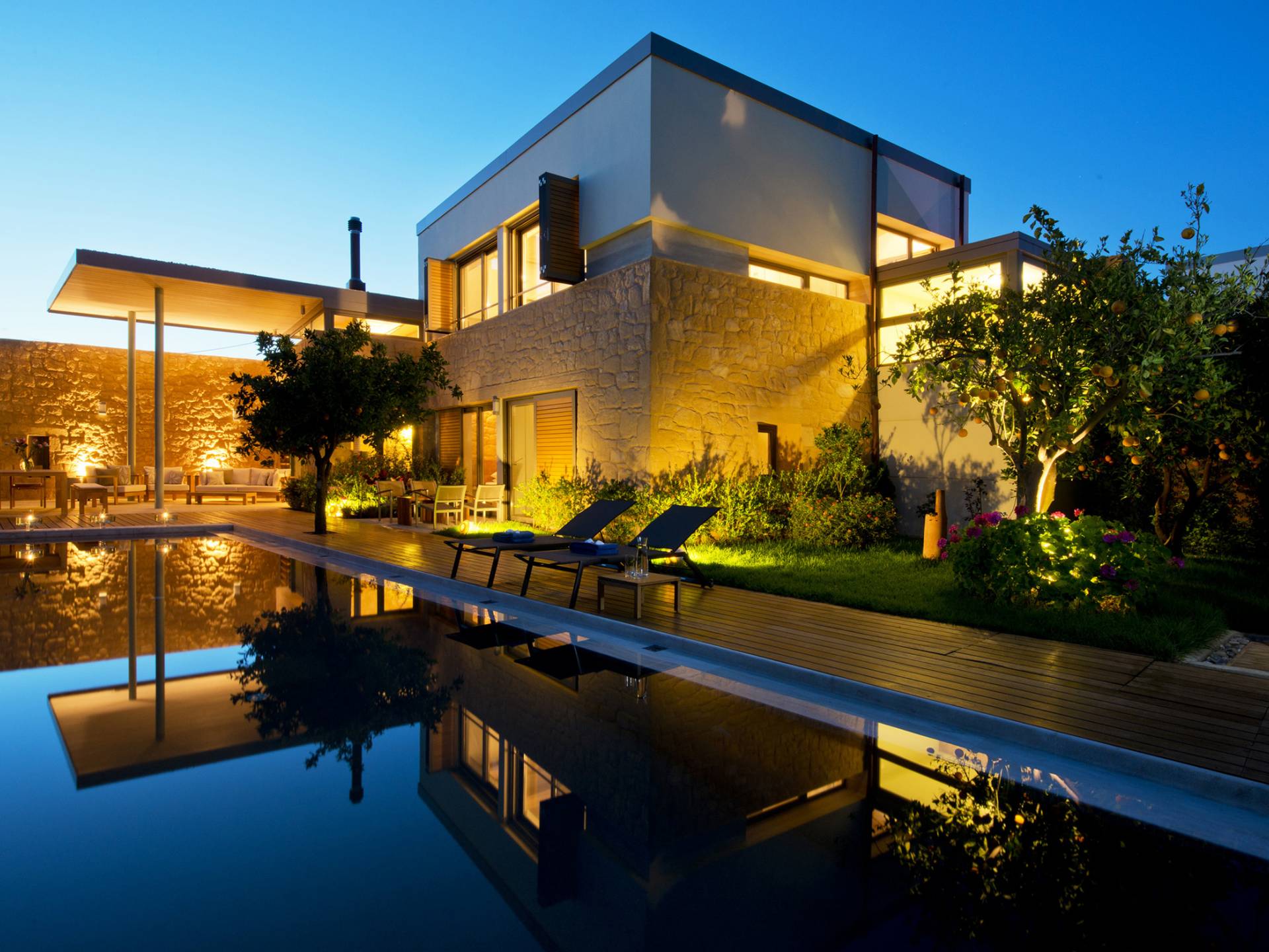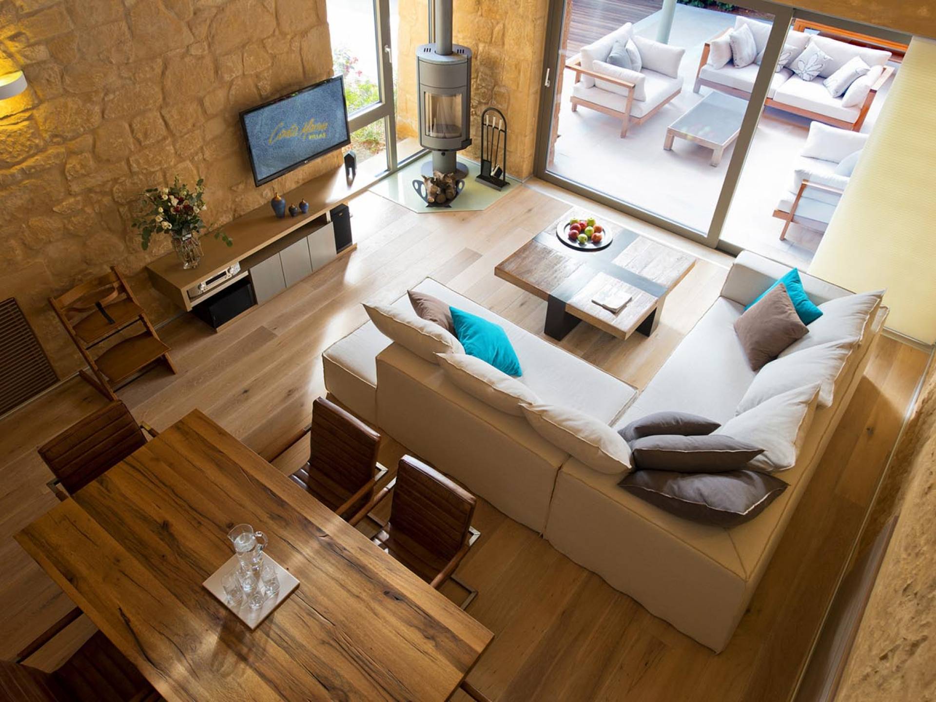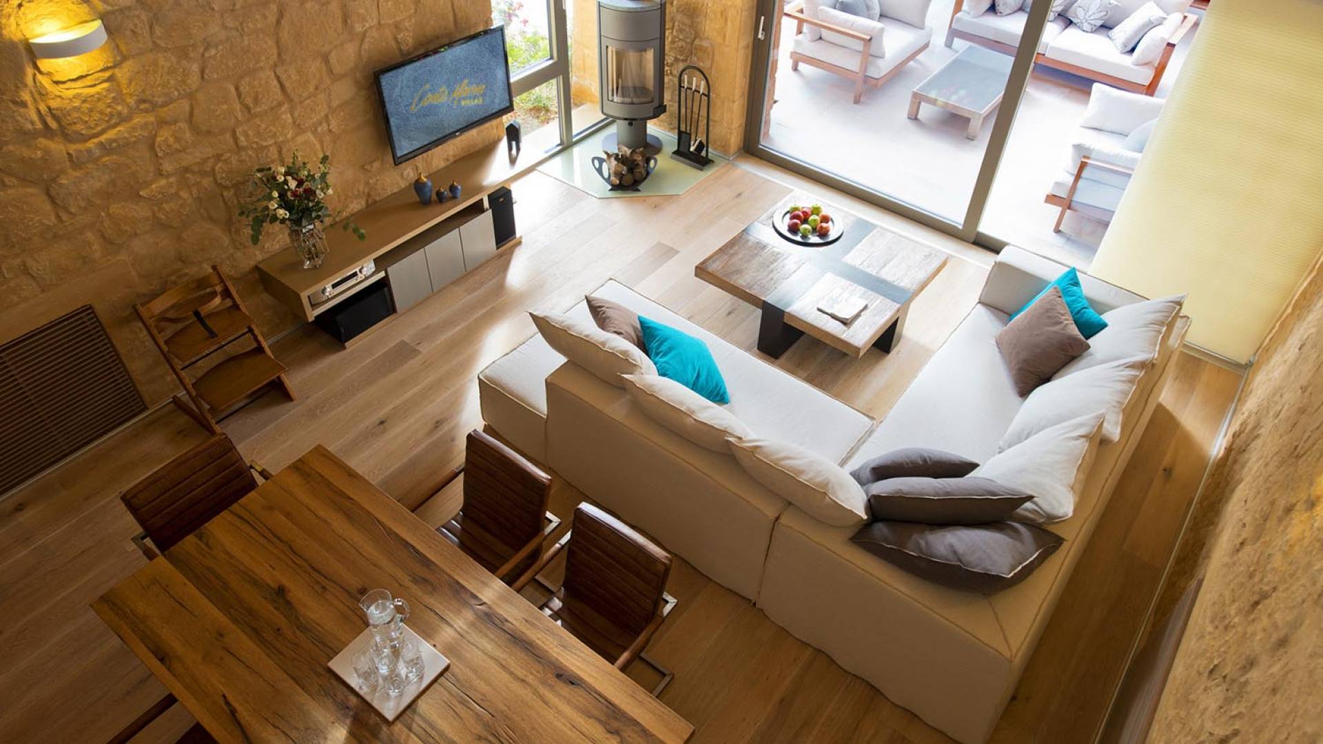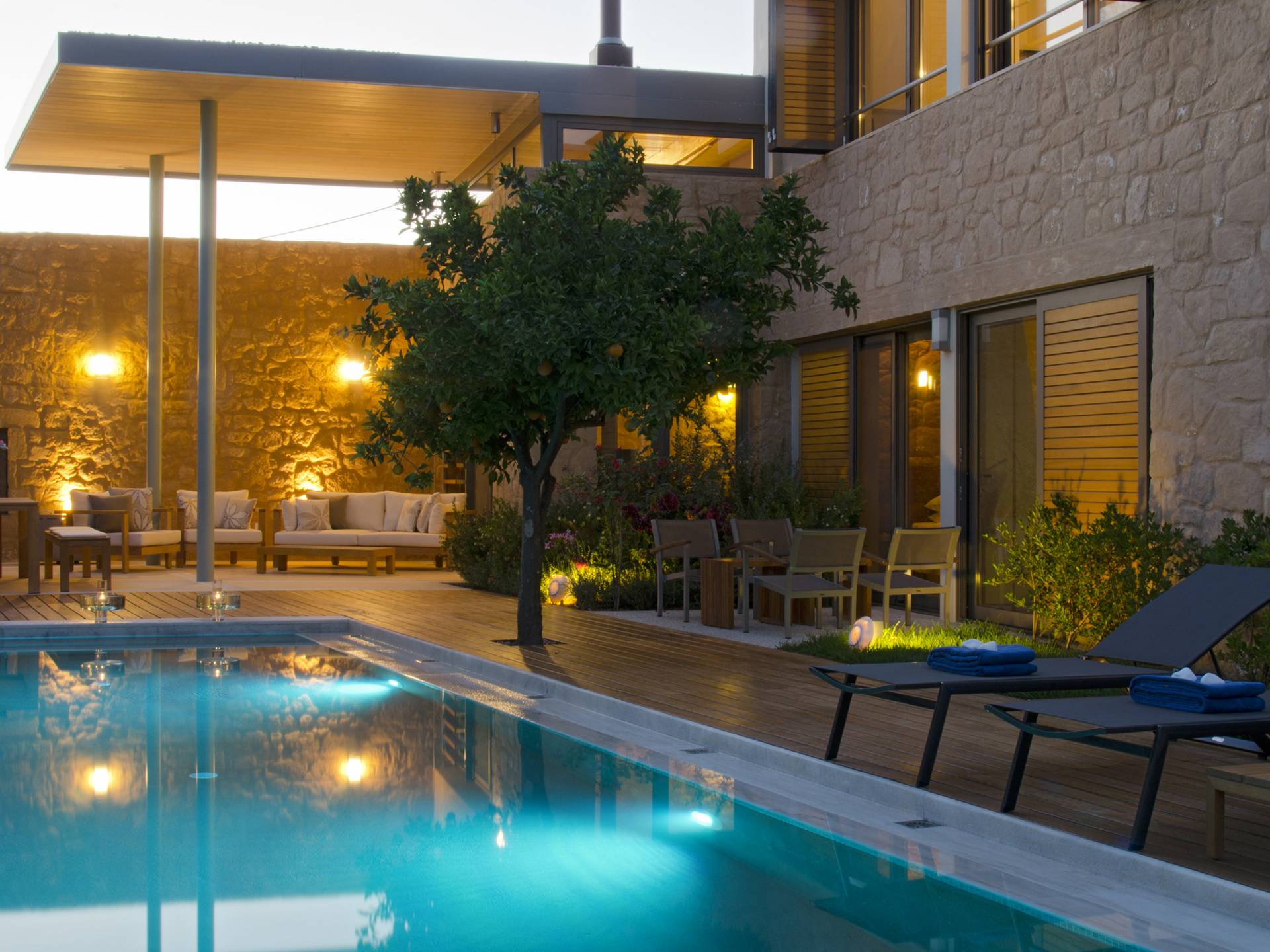 Combinando piedra, mármol, madera, vidrio, tierra y metal al detalle, hemos invitado a la naturaleza a entrar, para que el interior y el exterior coexistan en armonía y paz. Este logro en el diseño, combinado con muebles seleccionados a mano y diseñados exclusivamente por decoradores de interiores, ropa de cama de lujo y electrodomésticos modernos en todas partes, hace que Mandarina Villa Chania sea el mejor destino para una escapada en Creta. Rodeada de forma privada por patios con paredes de piedra, la Villa ofrece una vista completa de las panorámicas colinas de Creta, los vastos olivares y naranjos y las blancas montañas de Creta. Como reflejo de esta vista, la Villa está construida de forma transparente con piedra rica e inundada de luz natural creando un ambiente tranquilo en su interior.