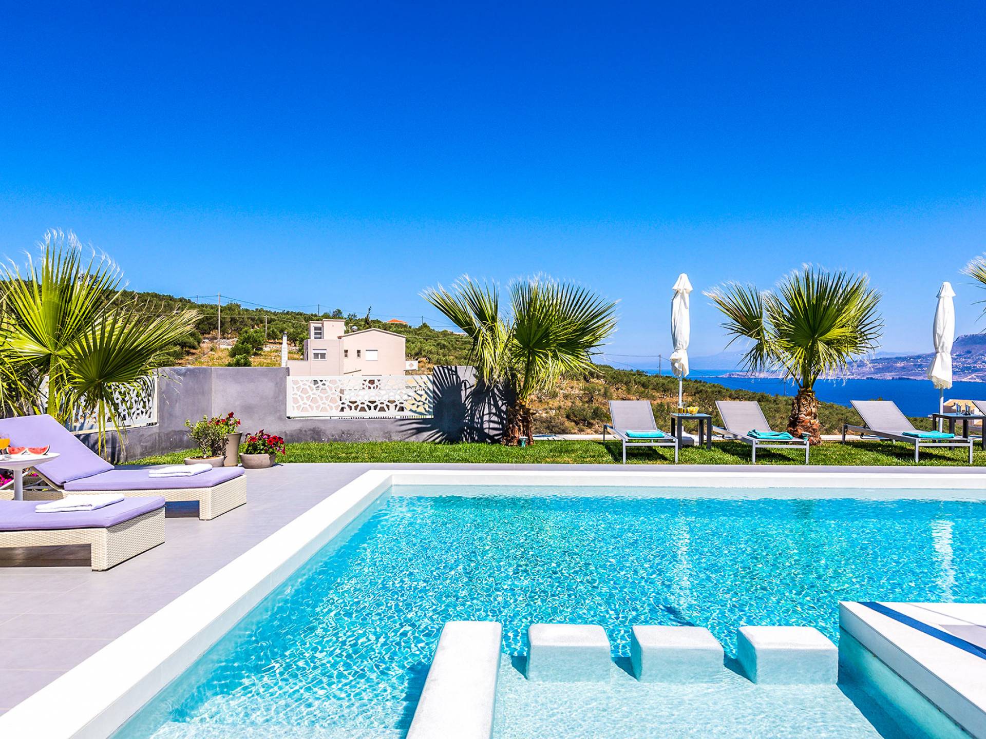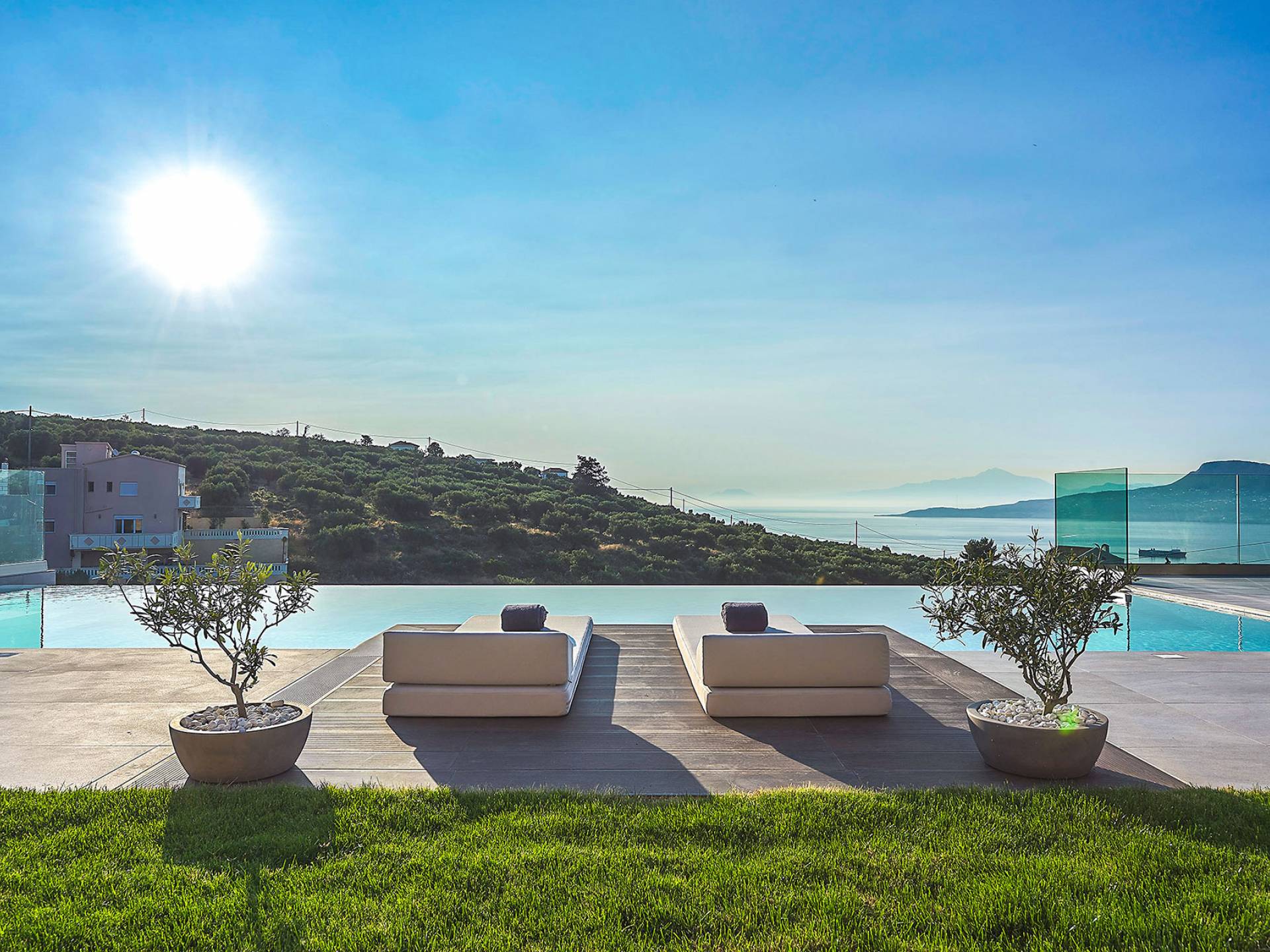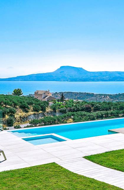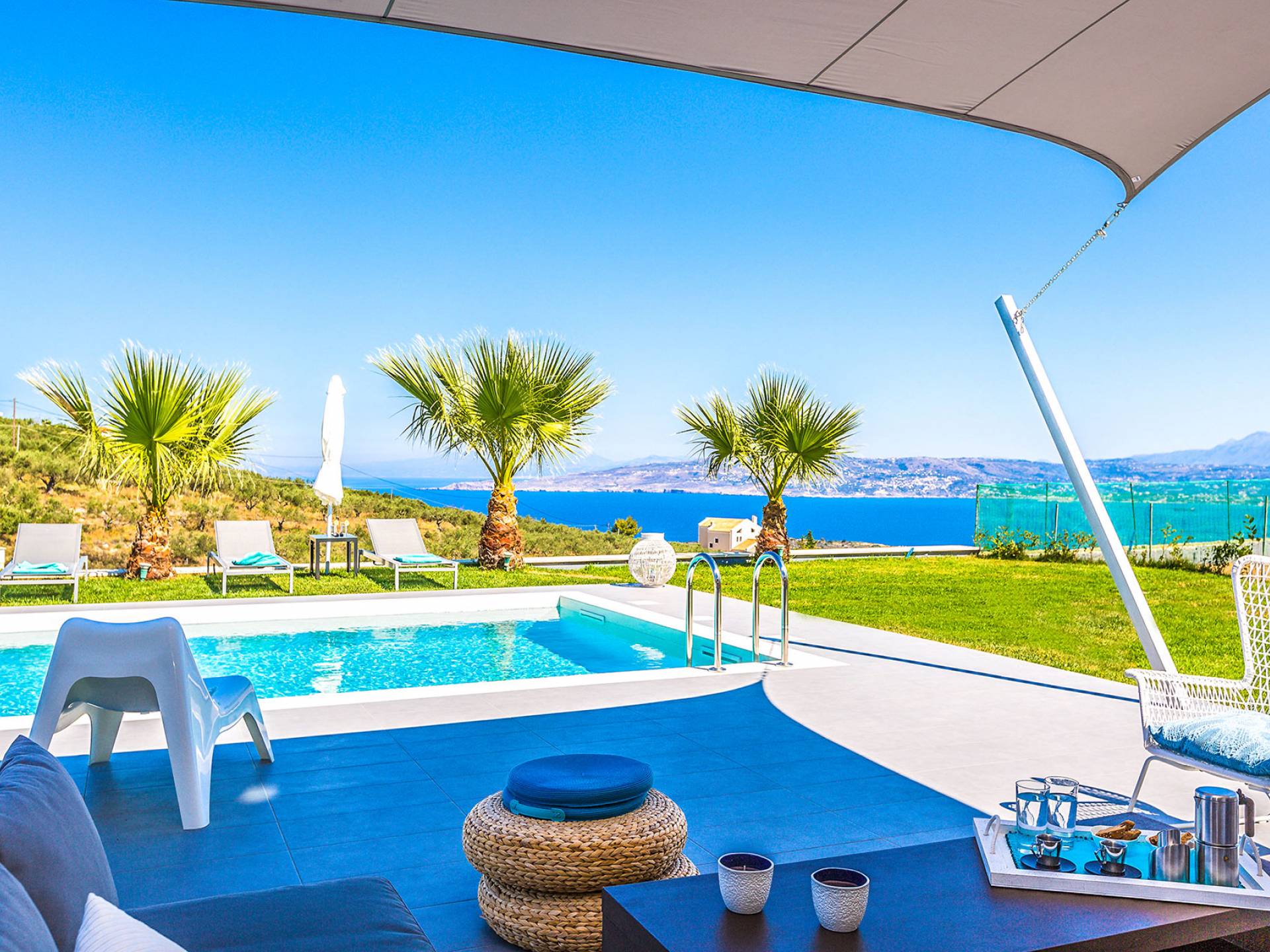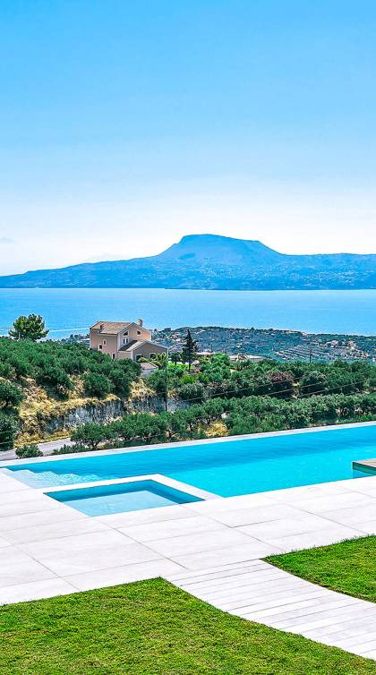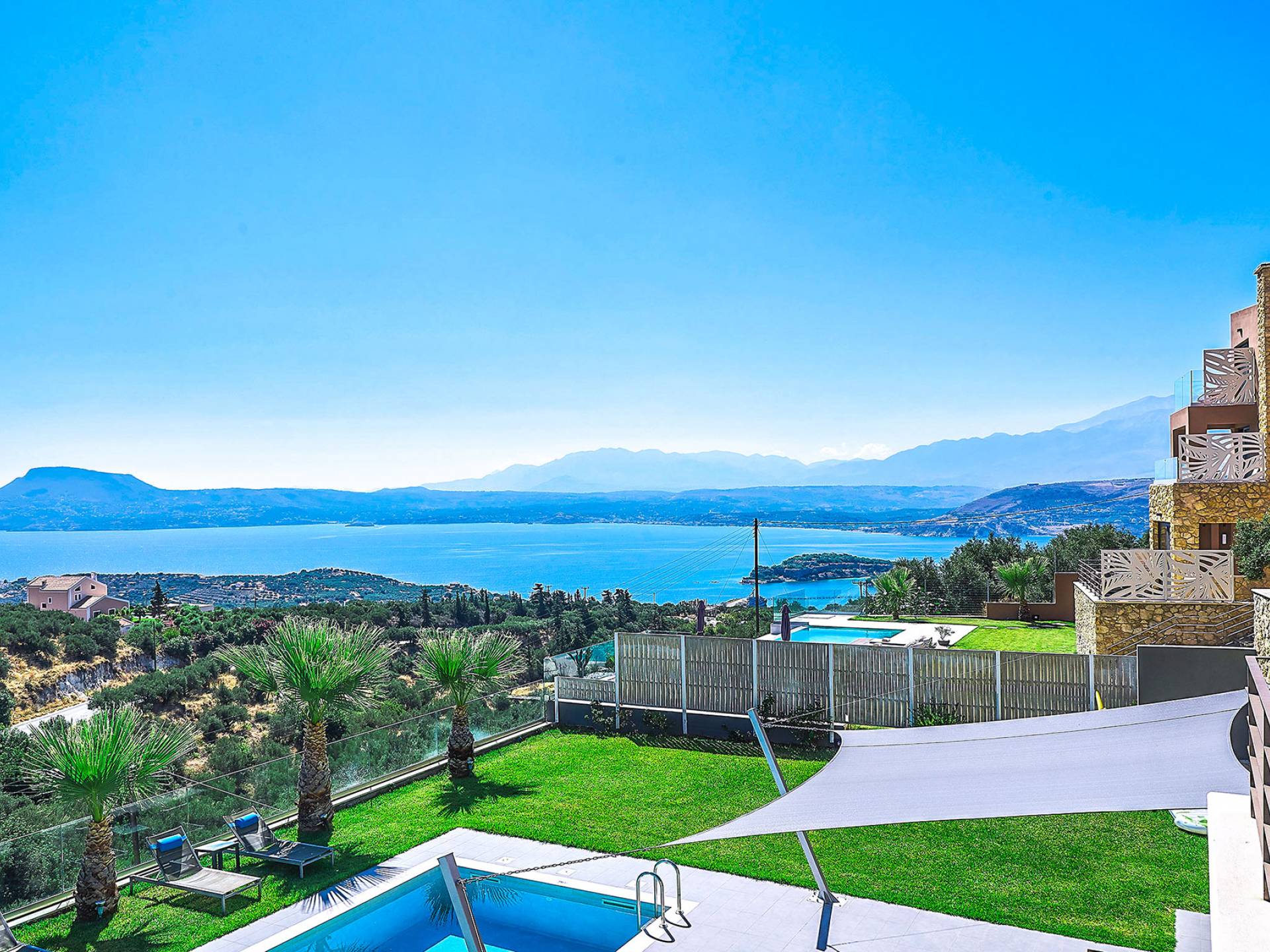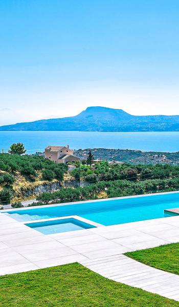 Niolos Villas Crete están construidas en una ladera y nada puede interrumpir la vista panorámica del mar y las montañas de Creta. Contemplar la bahía de Souda y la montaña Lefka Ori te ofrece serenidad y paz. Desde cada sección de las villas de Niolos, la vista es impresionante.