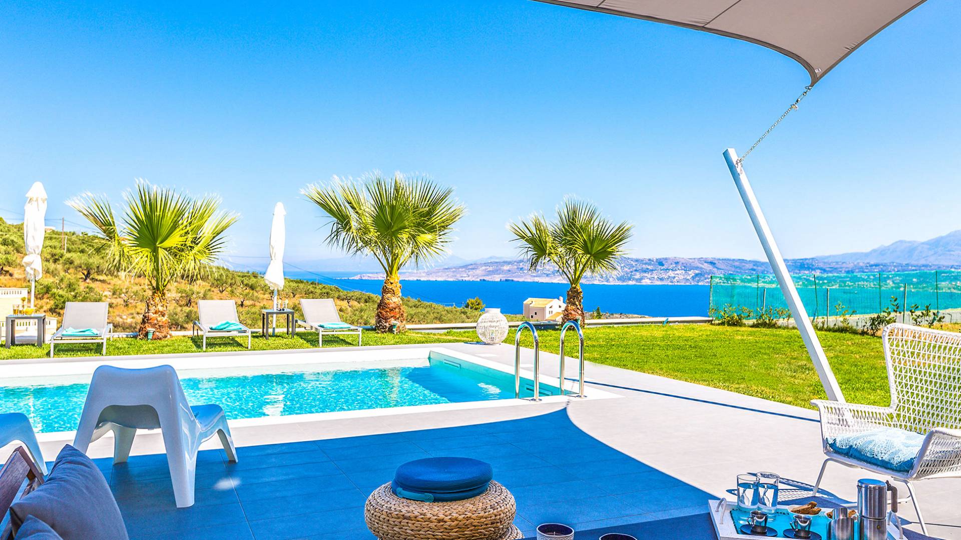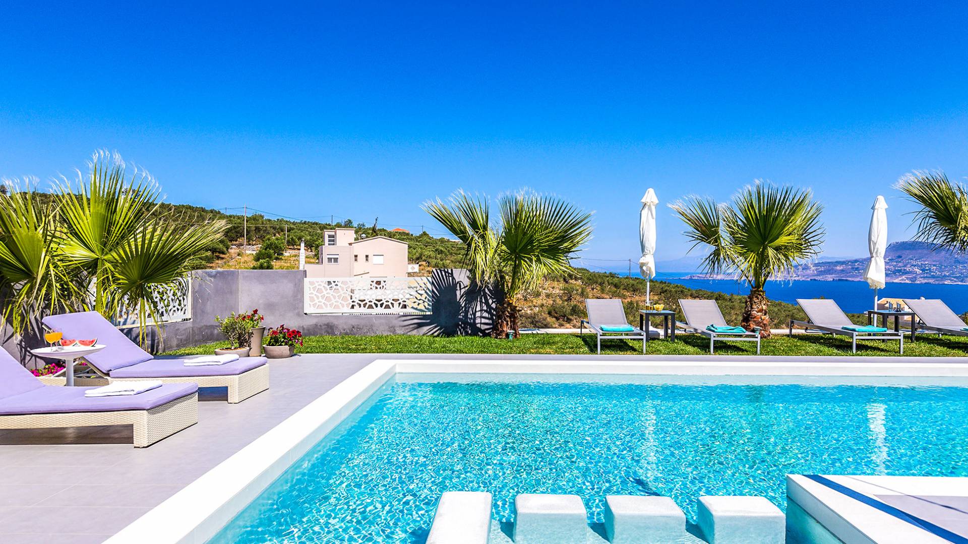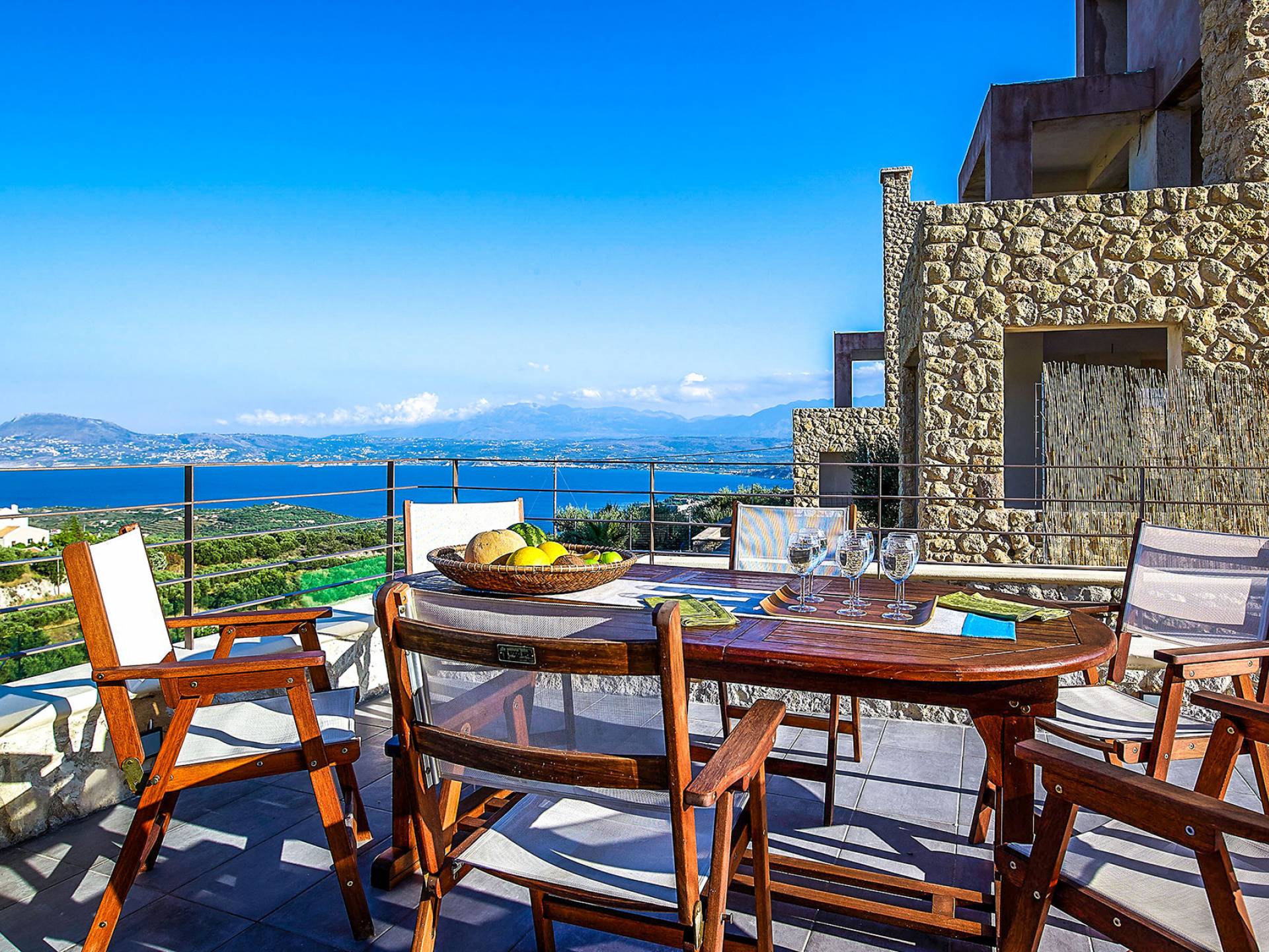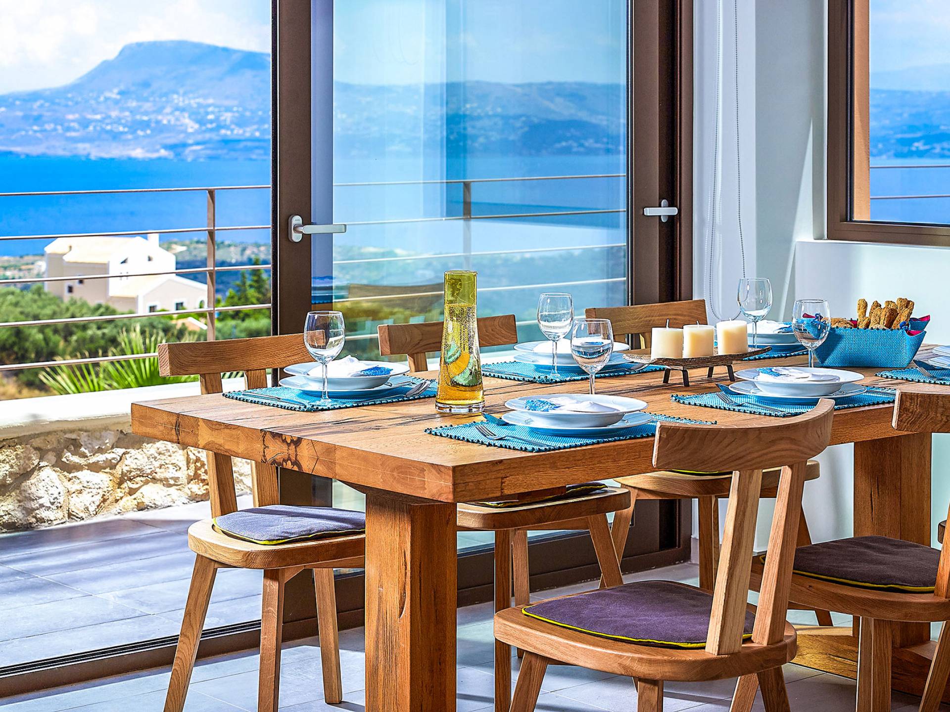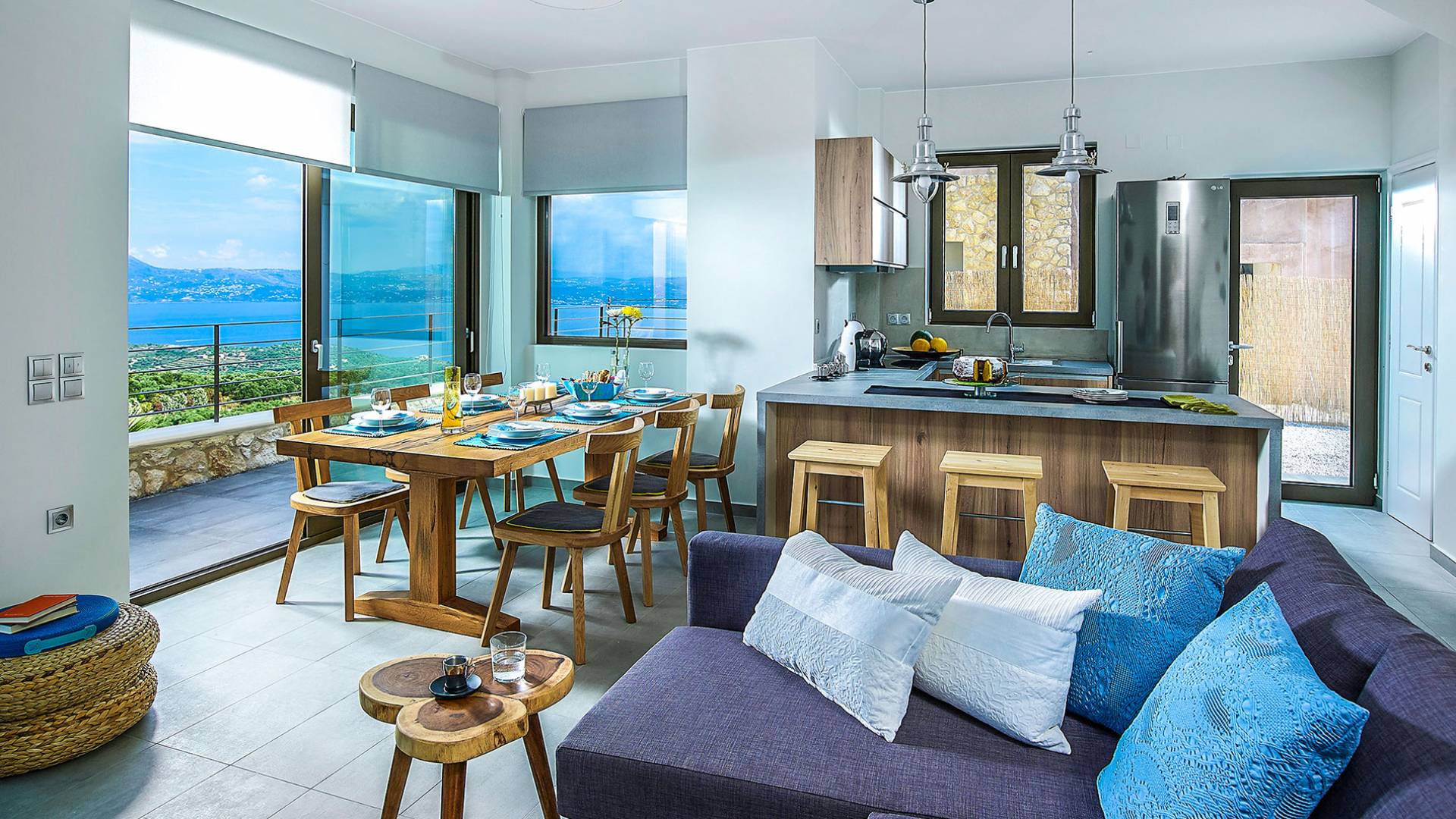 Niolos Villas Crete están construidas en una ladera y nada puede interrumpir la vista panorámica del mar y las montañas de Creta. Contemplar la bahía de Souda y la montaña Lefka Ori te ofrece serenidad y paz. Desde cada sección de las villas de Niolos, la vista es impresionante.