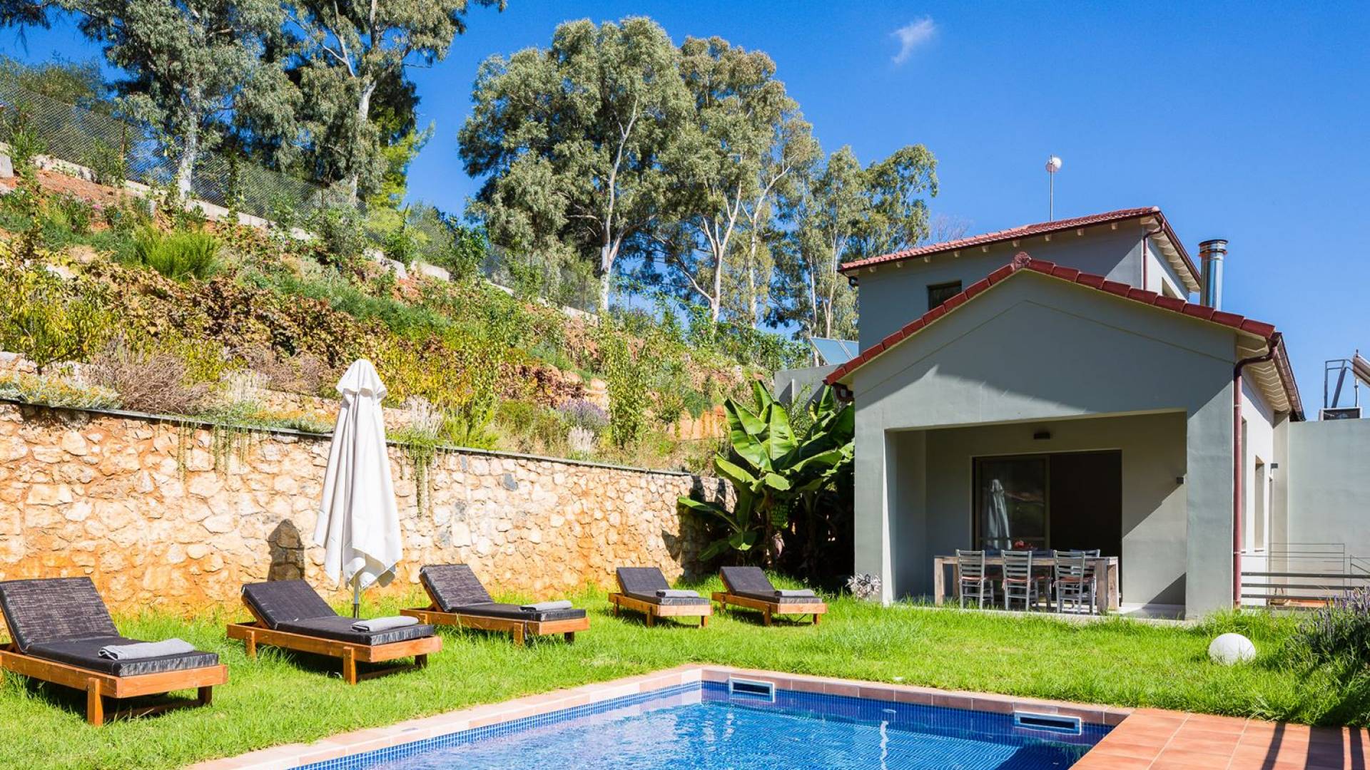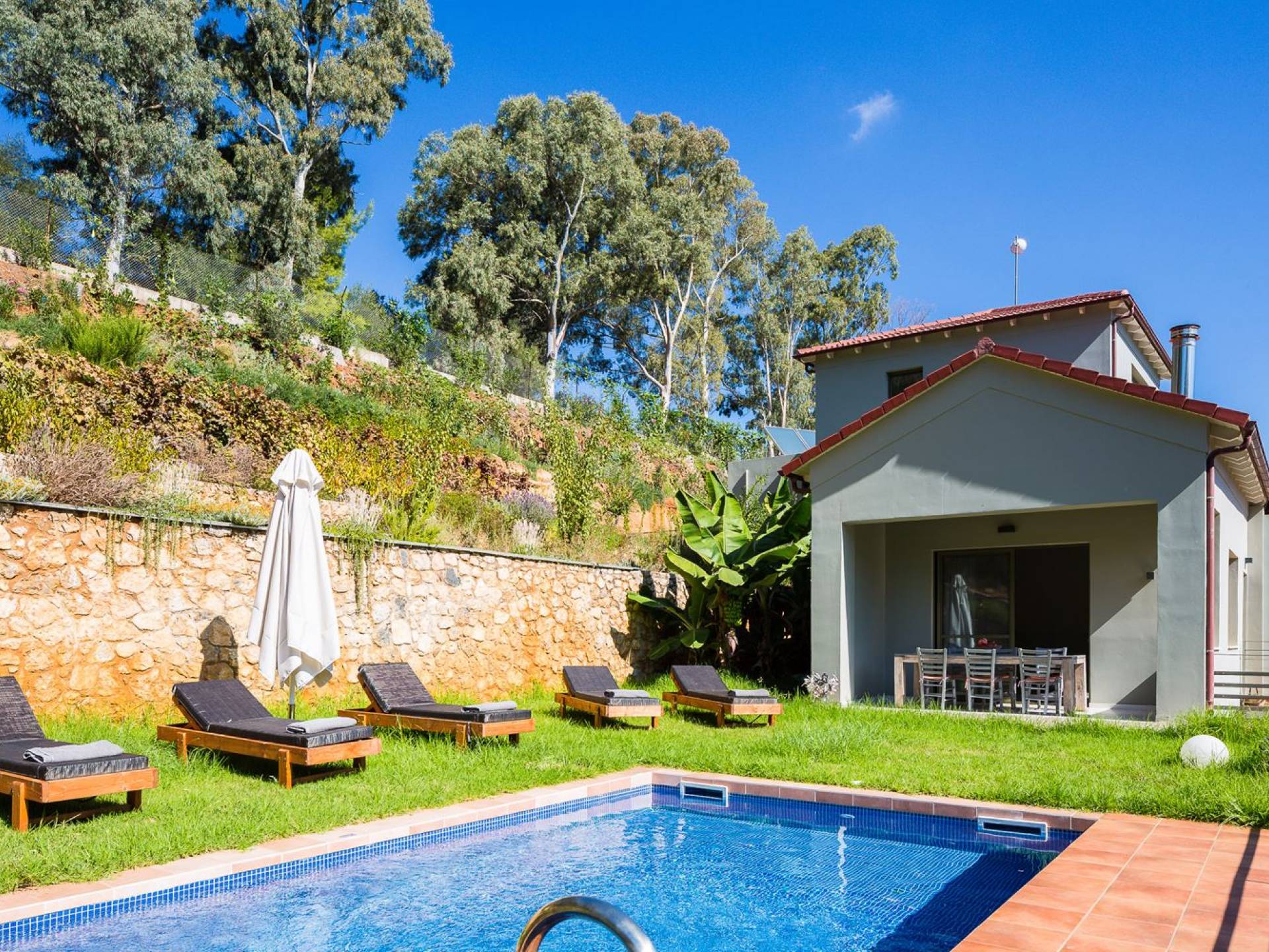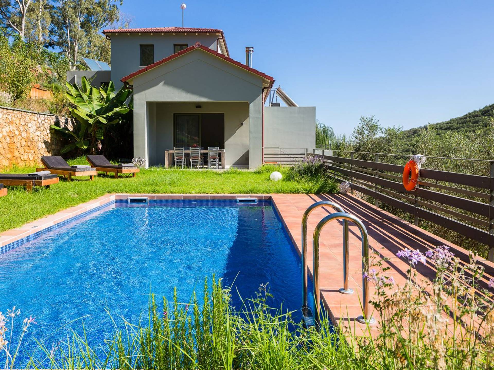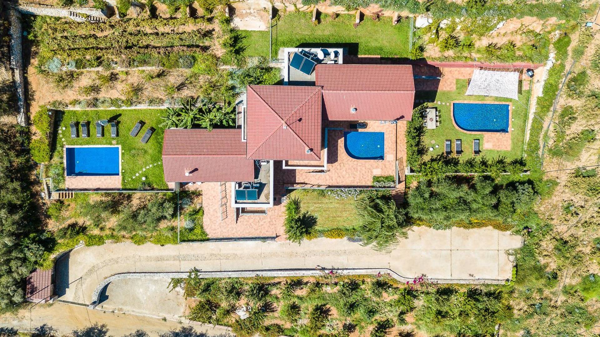 La naturaleza intrigante y diversa de la propiedad cuenta con 4 habitaciones dobles en la casa principal más 6 baños, una piscina privada, terrazas de salón, una cocina totalmente equipada y una barbacoa al aire libre. Todo lo que necesita para que su imaginación cree unas vacaciones ideales. Los maravillosos jardines en terrazas de las laderas, que abrazan exuberantemente la casa principal, son típicos de la zona. ¡Relájese y disfrute de este alojamiento de lujo superior!