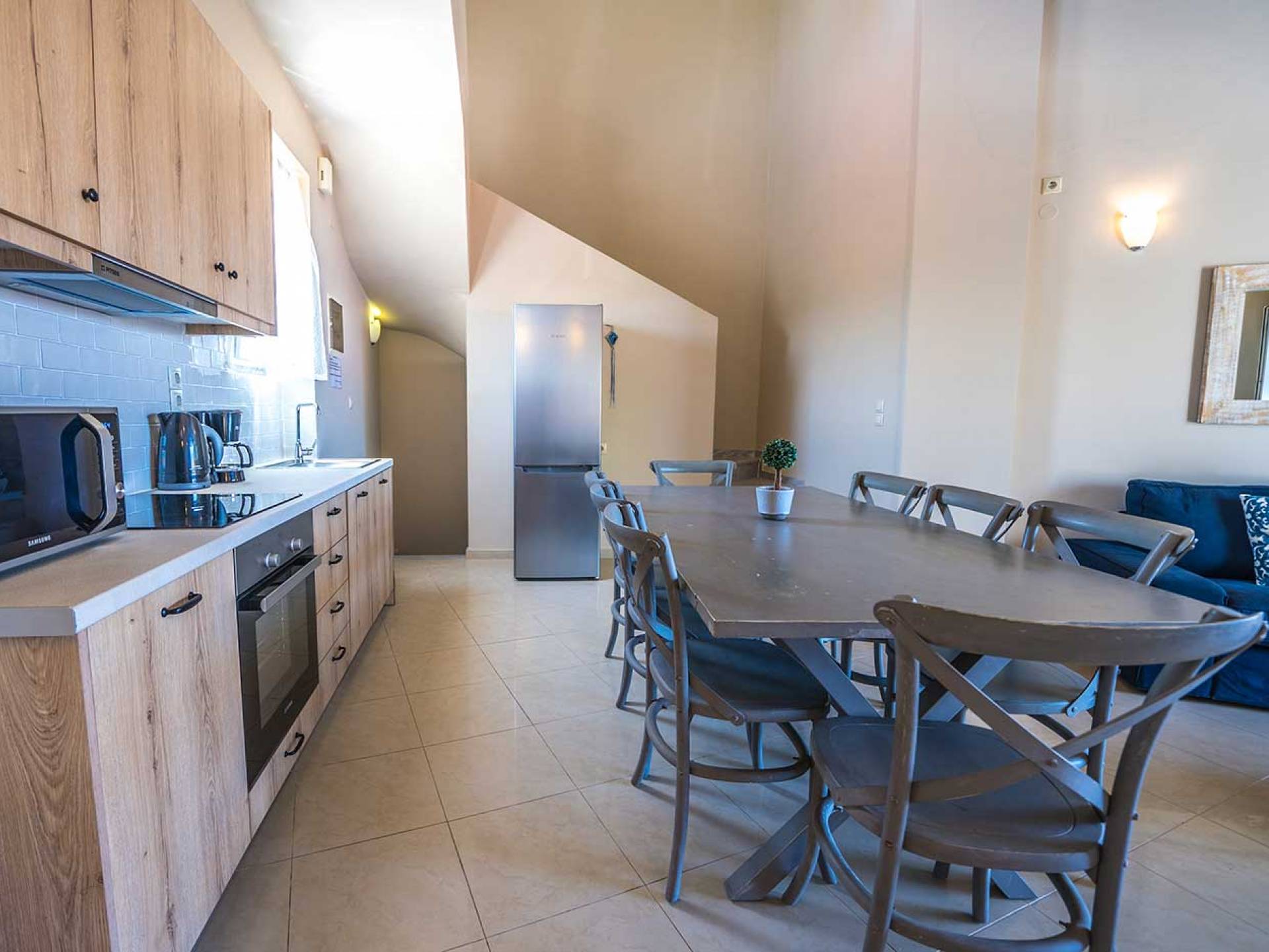 En cada villa en la planta baja, hay una gran sala de estar de planta abierta con cómodos asientos suaves, un comedor para 6 personas y una cocina totalmente equipada con electrodomésticos modernos que incluyen nevera/congelador, horno/cocina, microondas. , cafetera de filtro, etc. También hay un dormitorio con cama de matrimonio (o 2 camas individuales) y baño privado con ducha. En el Primer Piso, hay un dormitorio con una cama doble grande (o 2 camas individuales) y un baño en suite con cabina de ducha. También hay un balcón privado con impresionantes vistas.