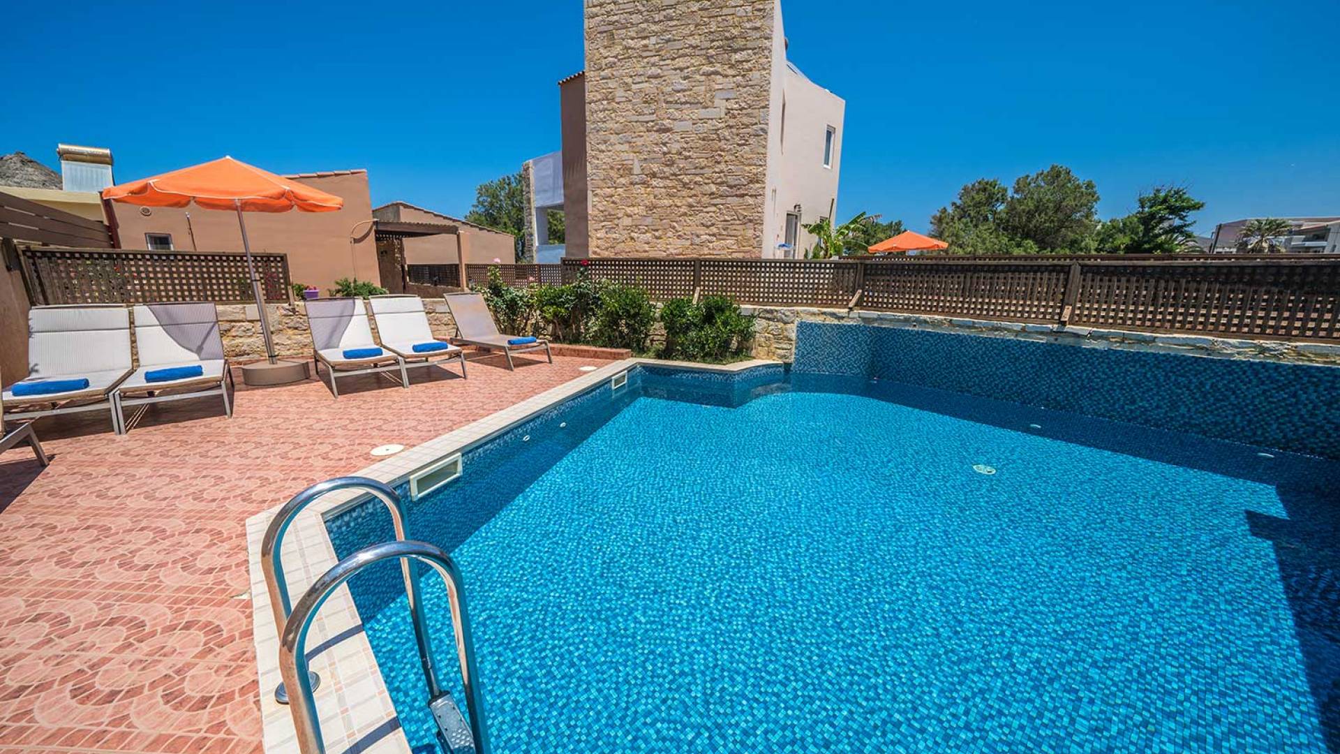 En el sótano, hay un dormitorio más con una gran cama doble y baño privado. Villa 3 puede acomodar hasta 8 personas con una cama doble y 1 cama individual en este nivel. La villa exterior tiene una piscina privada y una zona de piscina privada con tumbonas y sombrillas, para que puedas relajarte en un espacio privado al aire libre. Beach villas Chania son la mejor opción para su familia o sus amigos, para unas vacaciones inolvidables en la isla de Creta.