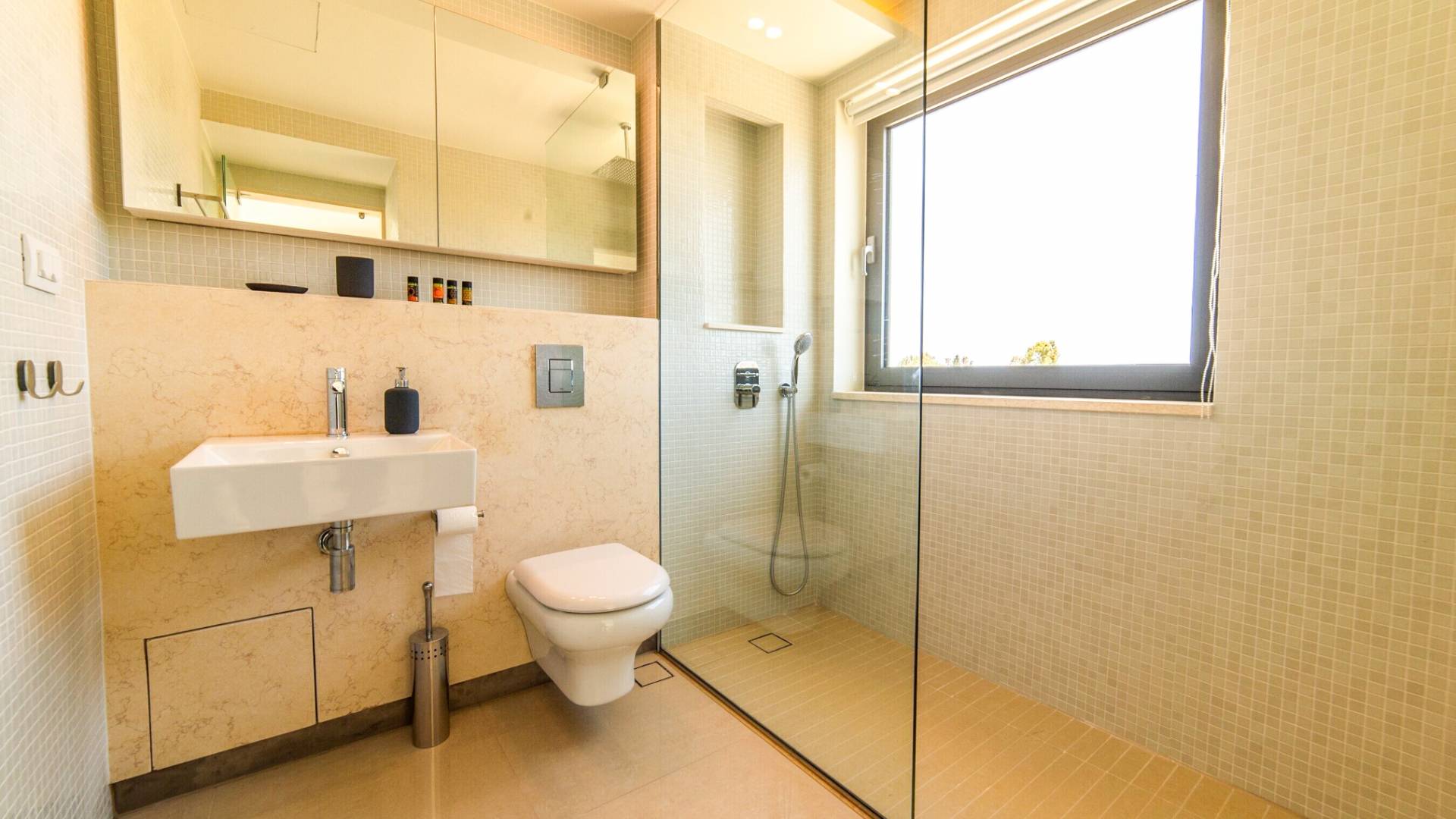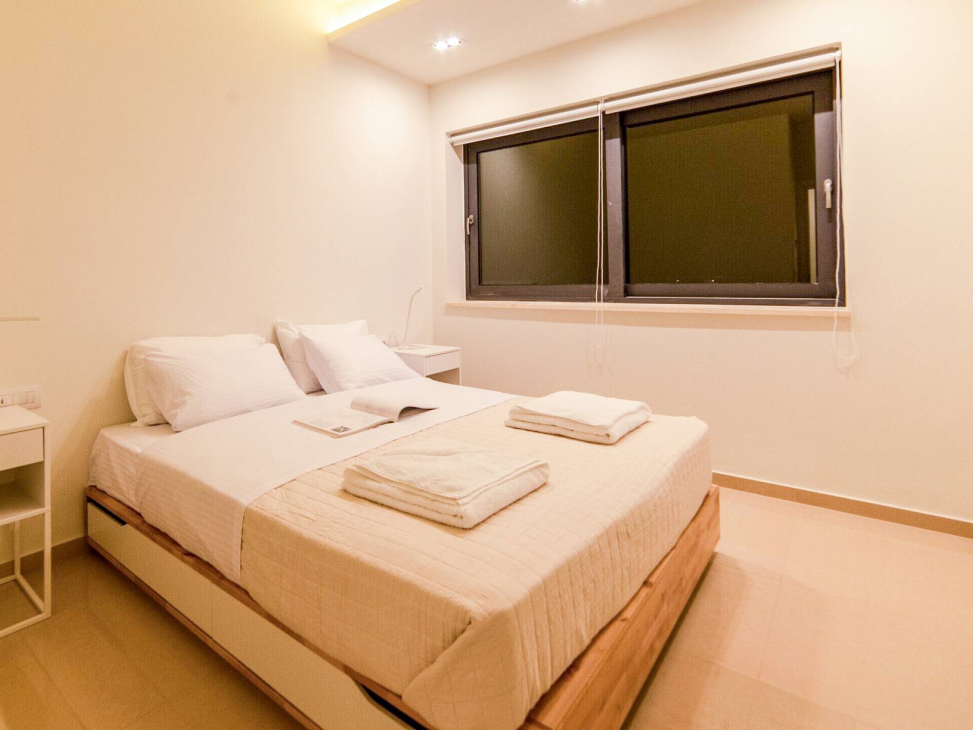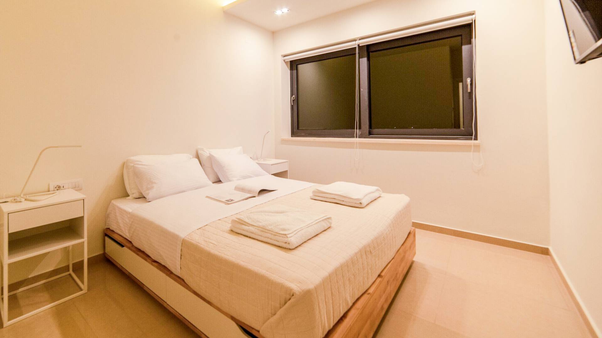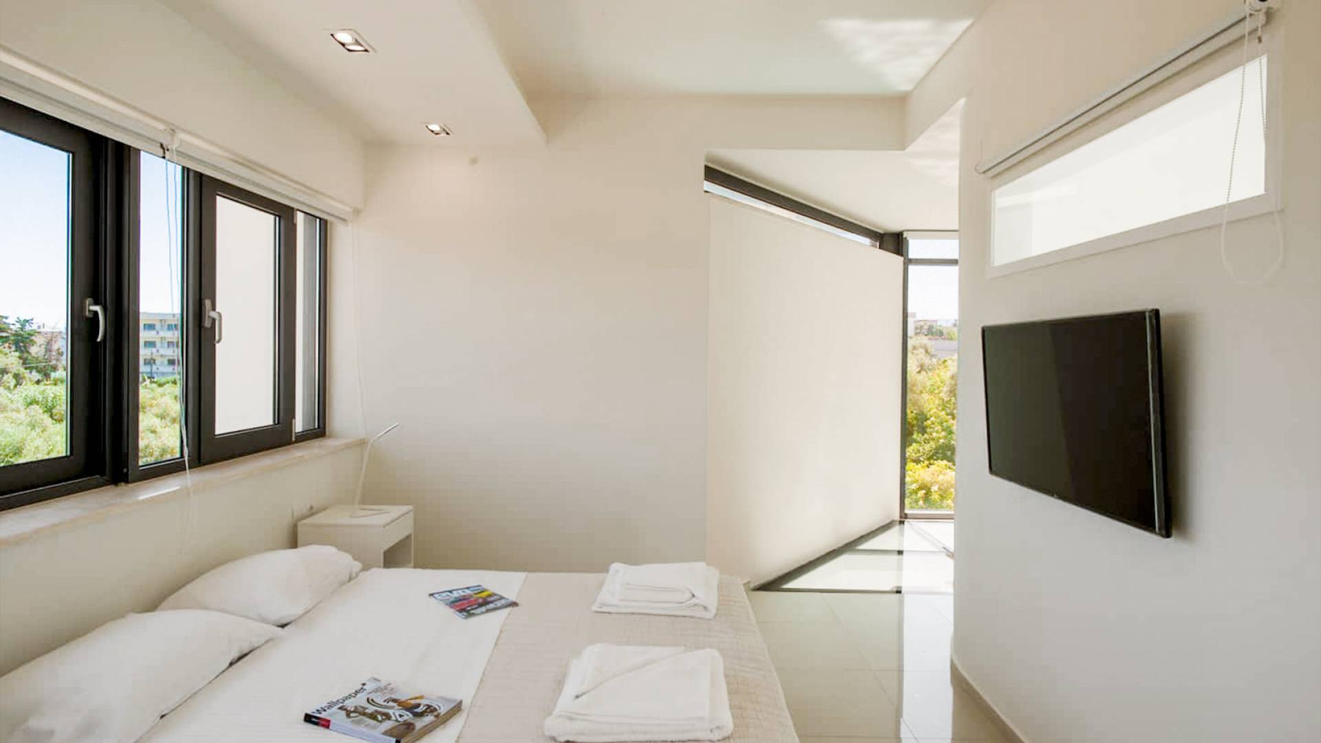 El edificio tiene 4 habitaciones y 3 baños con duchas. En la planta baja, el visitante se encontrará con un dormitorio de fácil acceso con dos camas individuales y un baño común. En la primera planta, el visitante encontrará el dormitorio principal con cama de matrimonio y baño en suite con ducha. La habitación se extiende a una pequeña sala de estar con piso de vidrio justo encima de la piscina. Junto al dormitorio principal hay dos dormitorios más con camas dobles y un baño común con ducha. El último dormitorio tiene un balcón privado con vistas al parque Agioi Apostoloi.