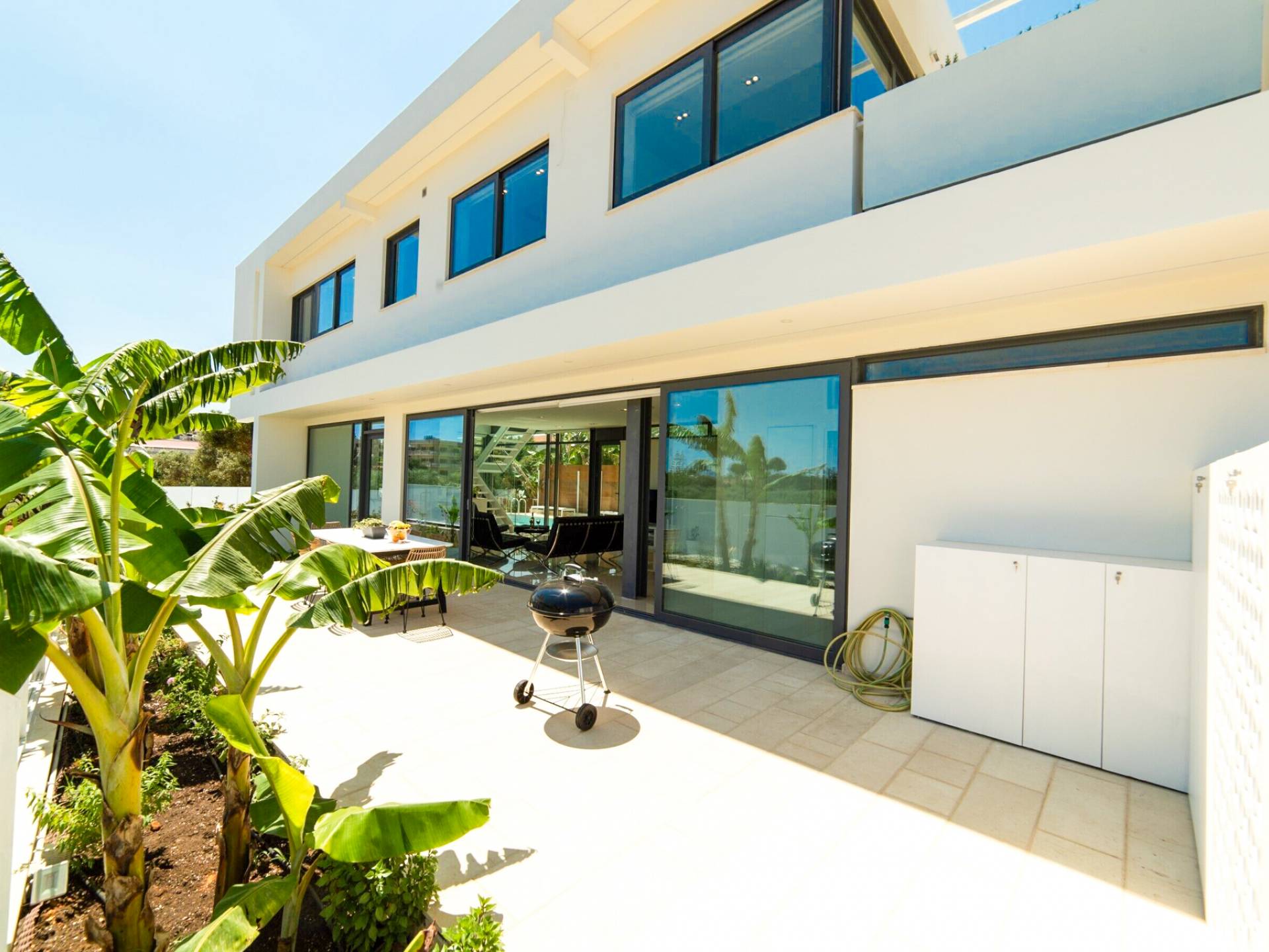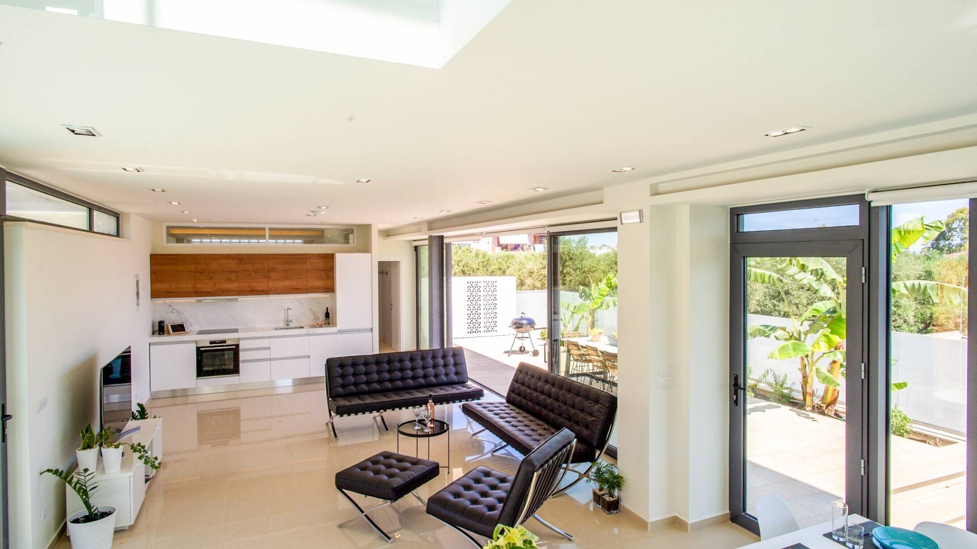 Al abrir las grandes ventanas corredizas, la sala de estar se extiende espacialmente hacia el exterior, donde hay un comedor al aire libre y un jardín. La materialidad del edificio está determinada por una composición de tonos blancos, mármoles egipcios y griegos y pisos de granito. El resultado es una textura de lujo duradera y el usuario puede explorar visualmente todos los aspectos de la integridad arquitectónica de la villa.