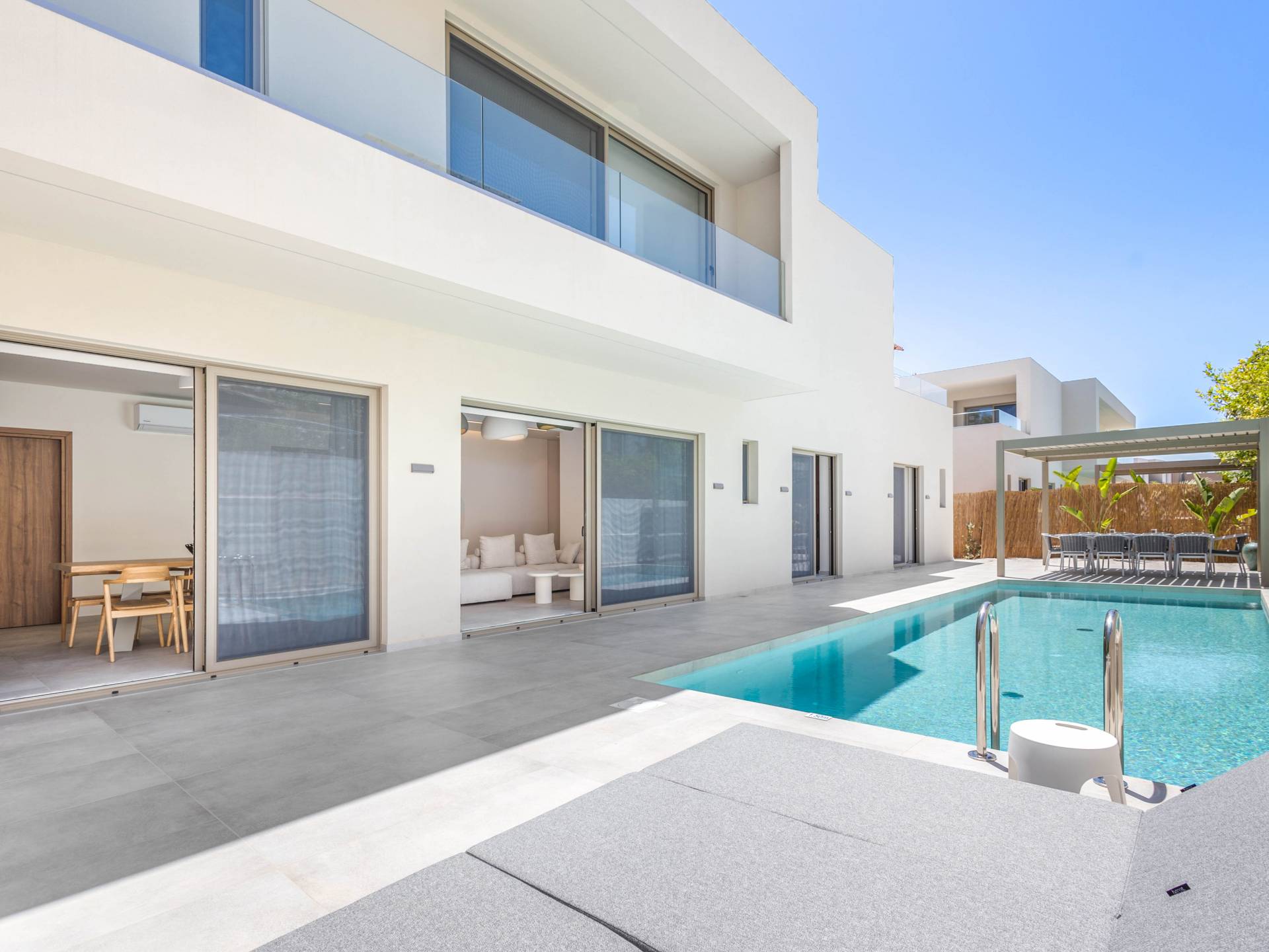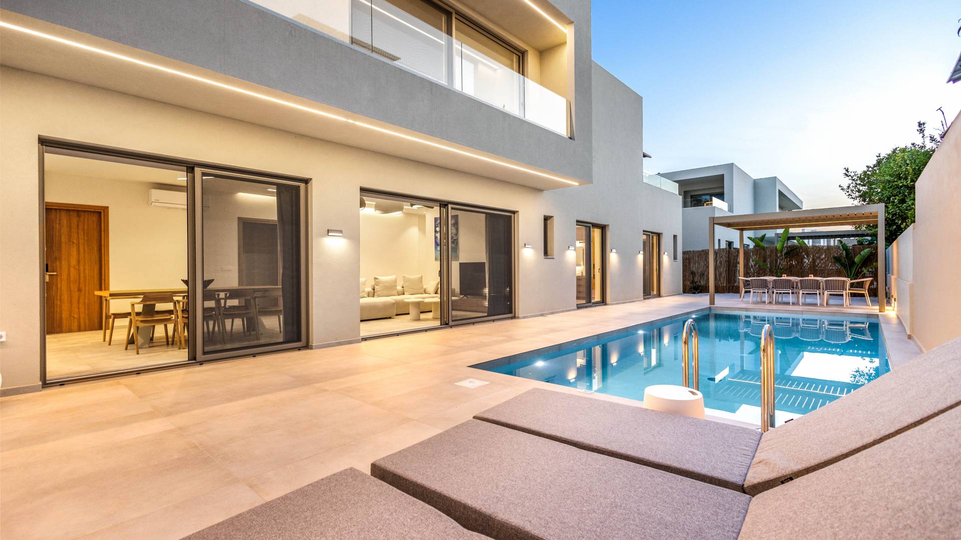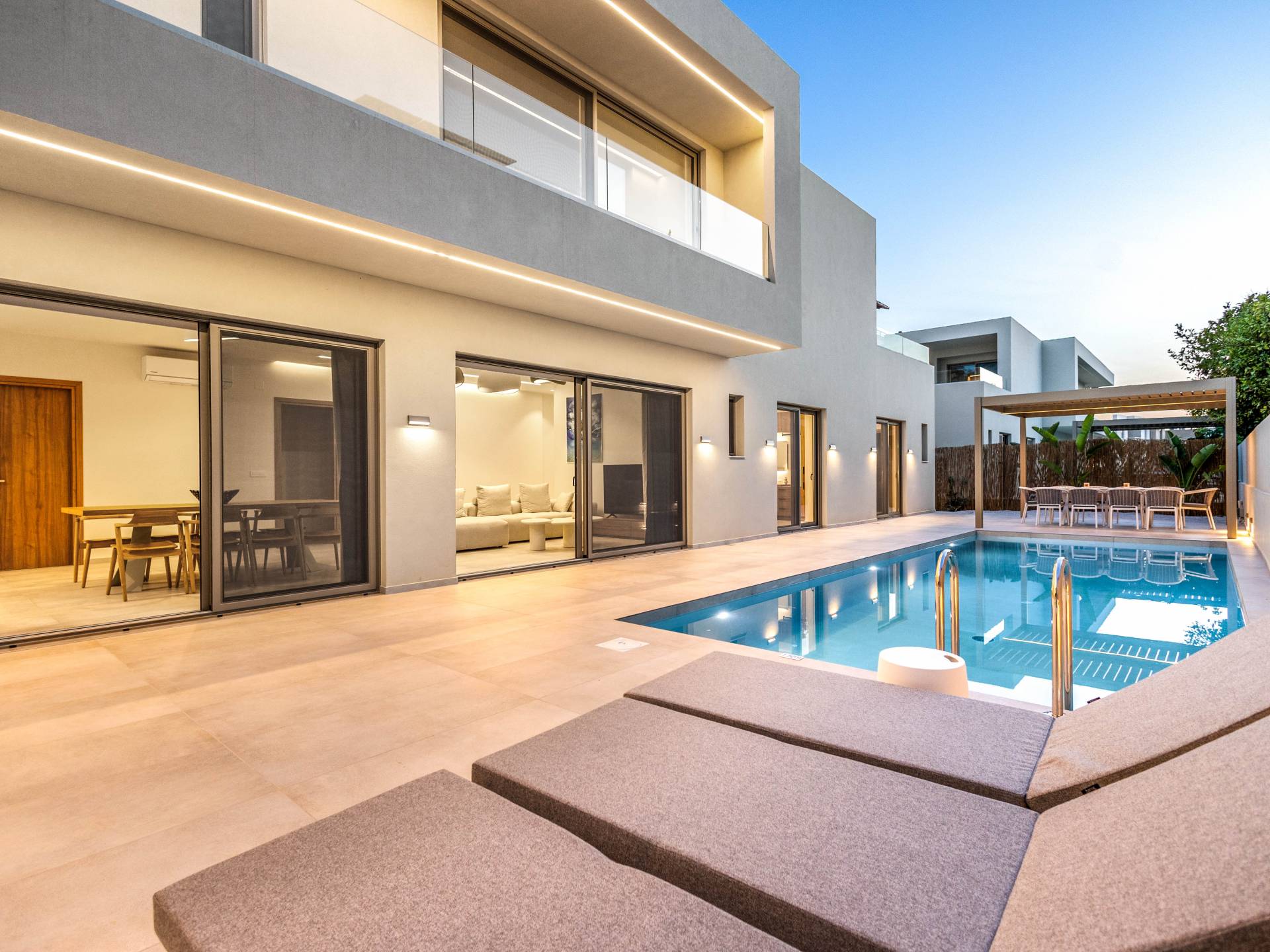 Una piscina privada rodeada de elegantes tumbonas y áreas de salón al aire libre