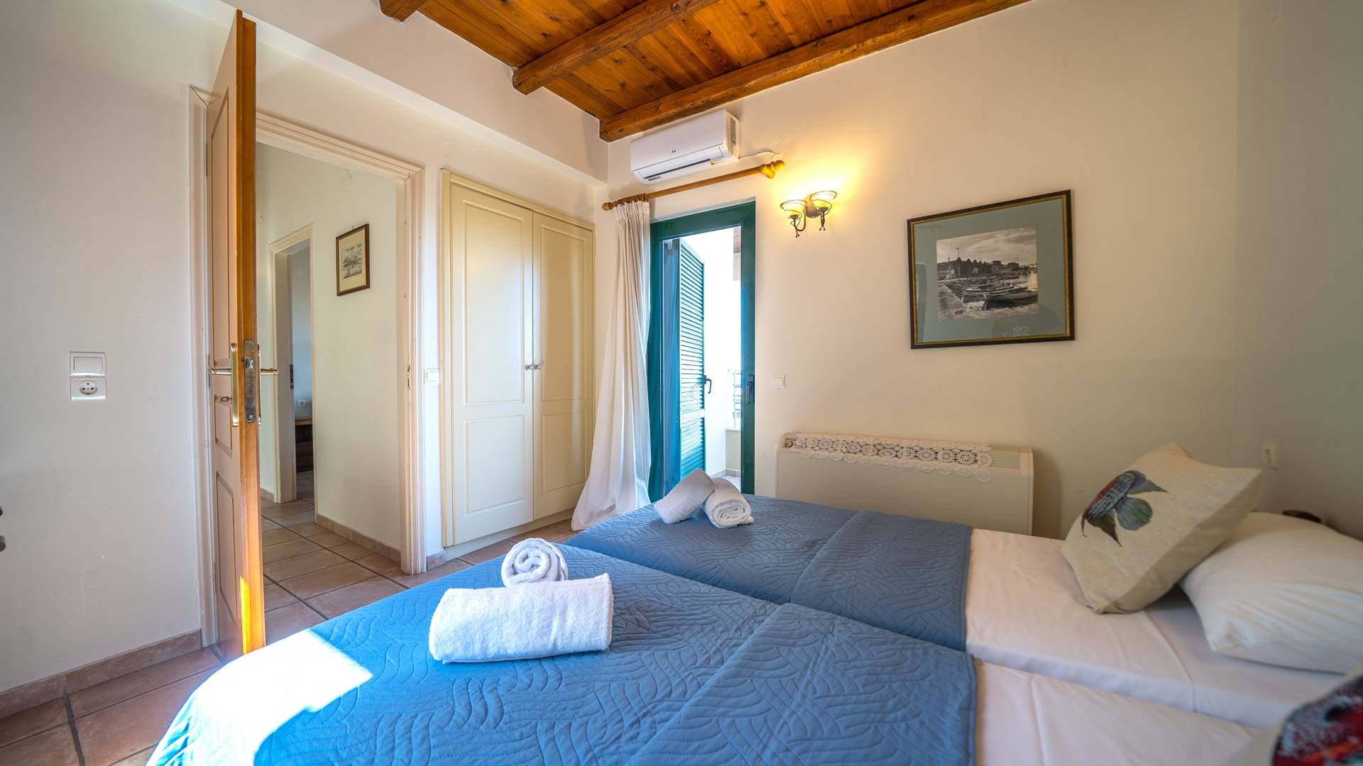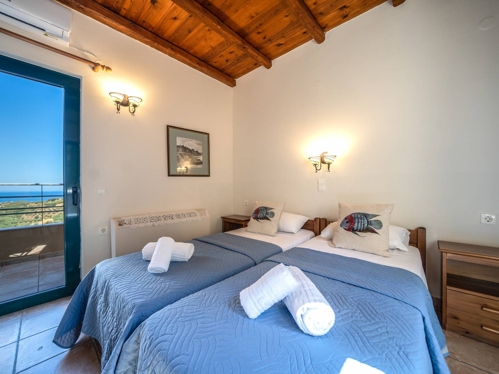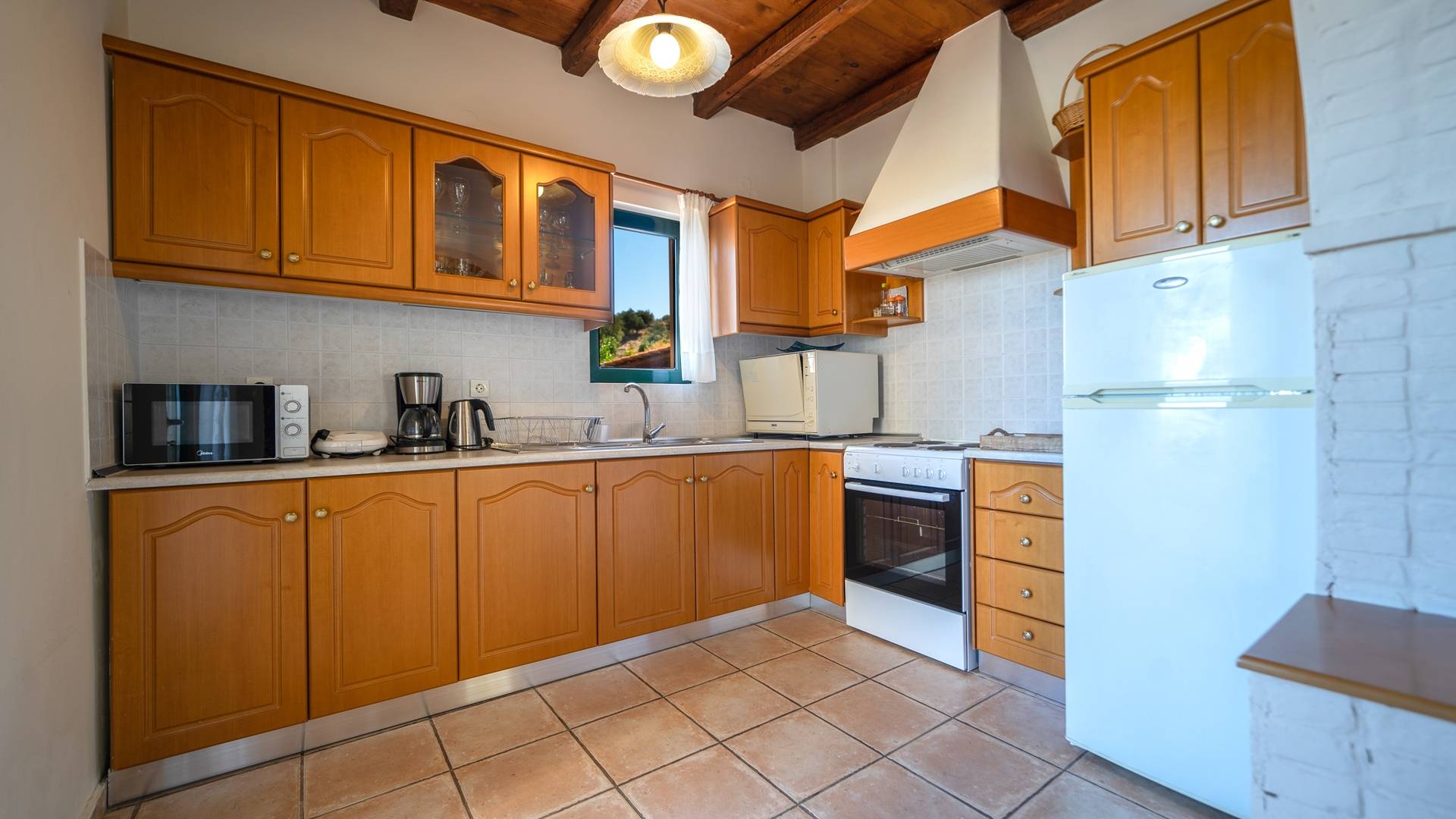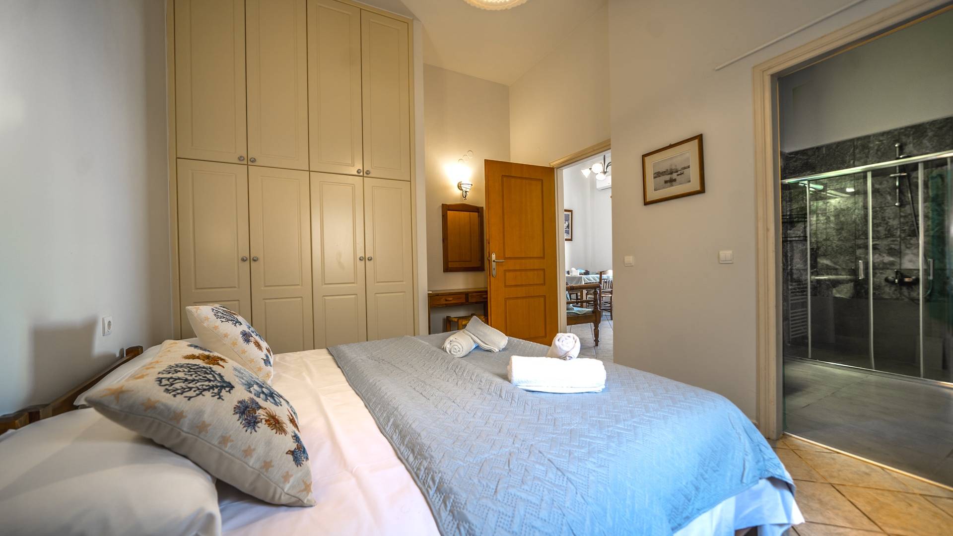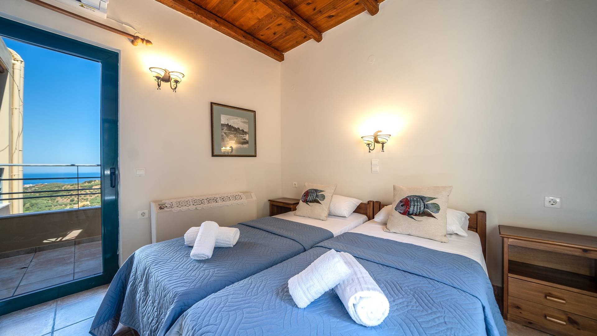 Thomas Villa consta del segundo y tercer piso. La entrada principal conduce al segundo piso y a una acogedora sala de estar/comedor iluminada por el sol. Esta zona con la chimenea está amueblada de forma tradicional. La cocina totalmente equipada y un aseo están en la misma planta. Las escaleras conducen al segundo piso, donde puede ver tres dormitorios, uno doble y dos individuales, y dos baños. Uno de los baños está en suite con el dormitorio doble. Todas las habitaciones tienen balcones con vistas panorámicas.