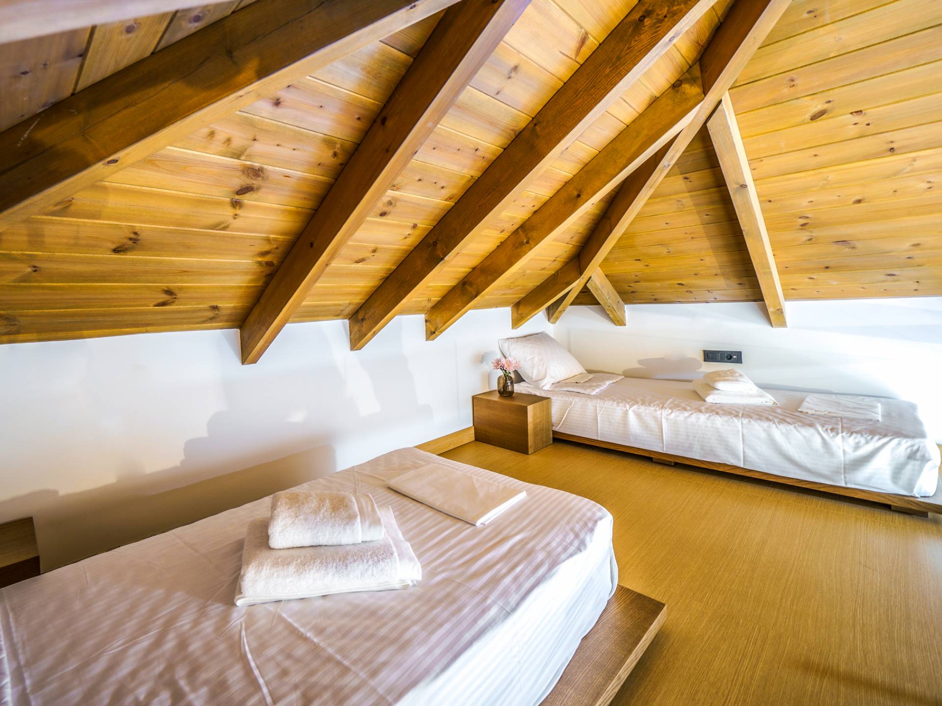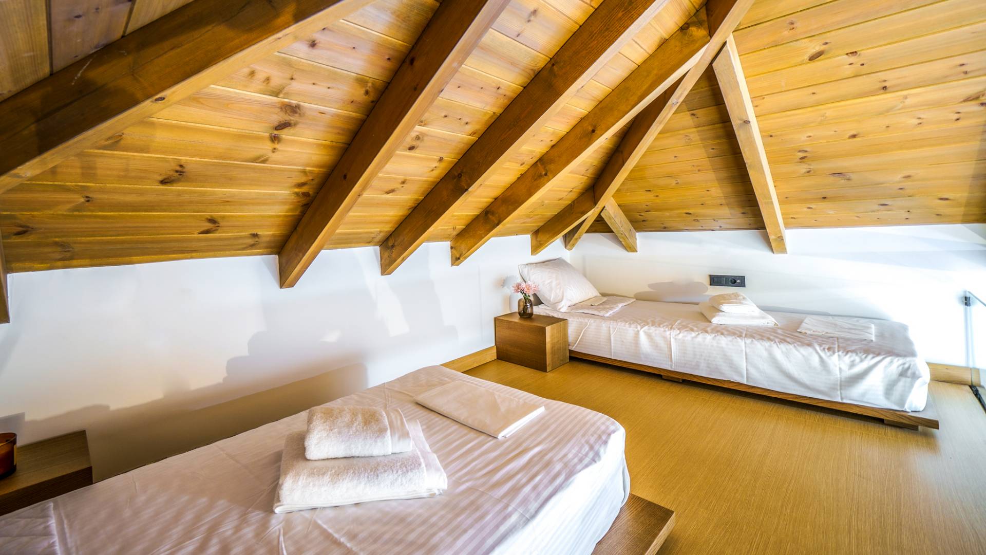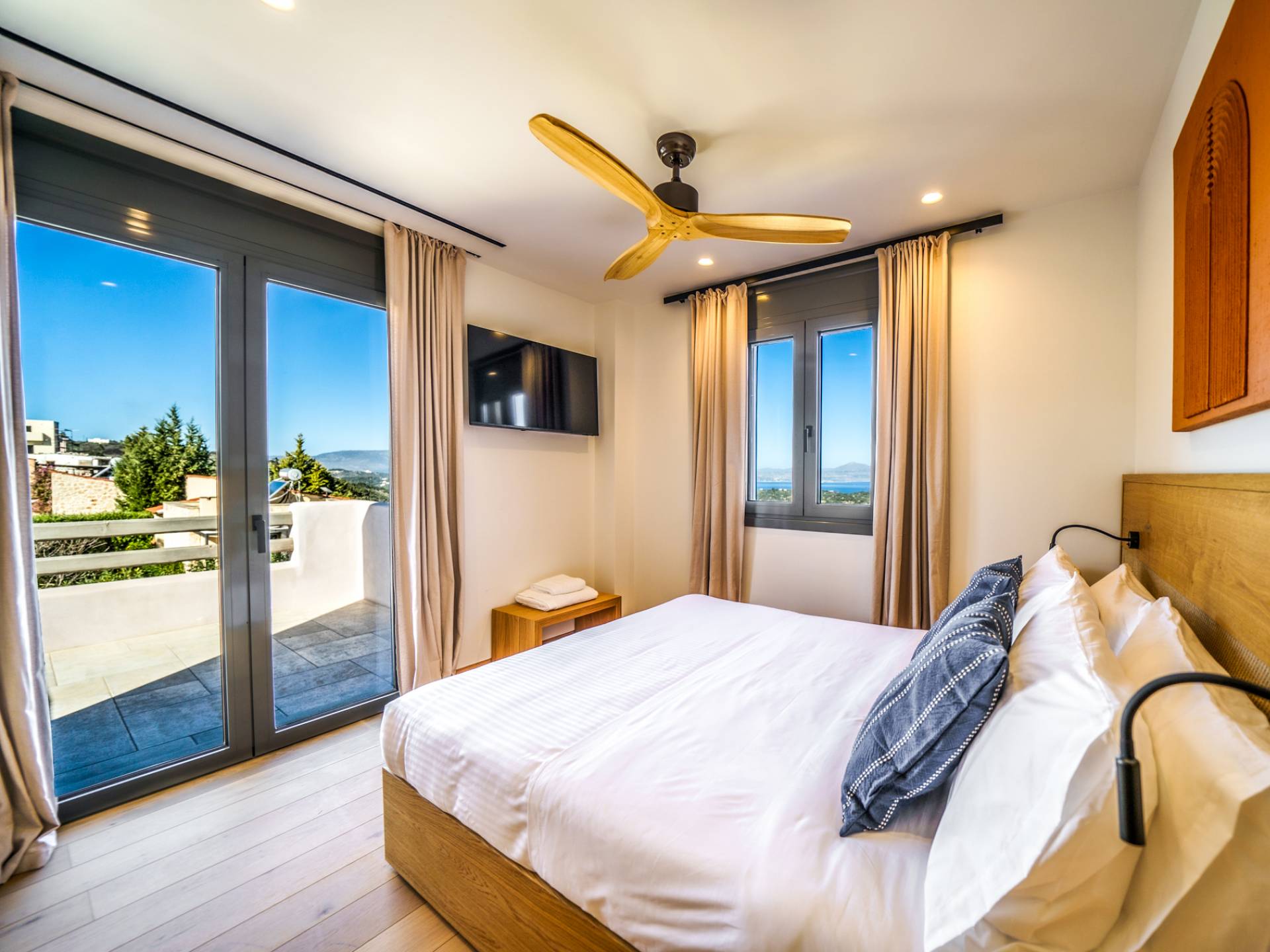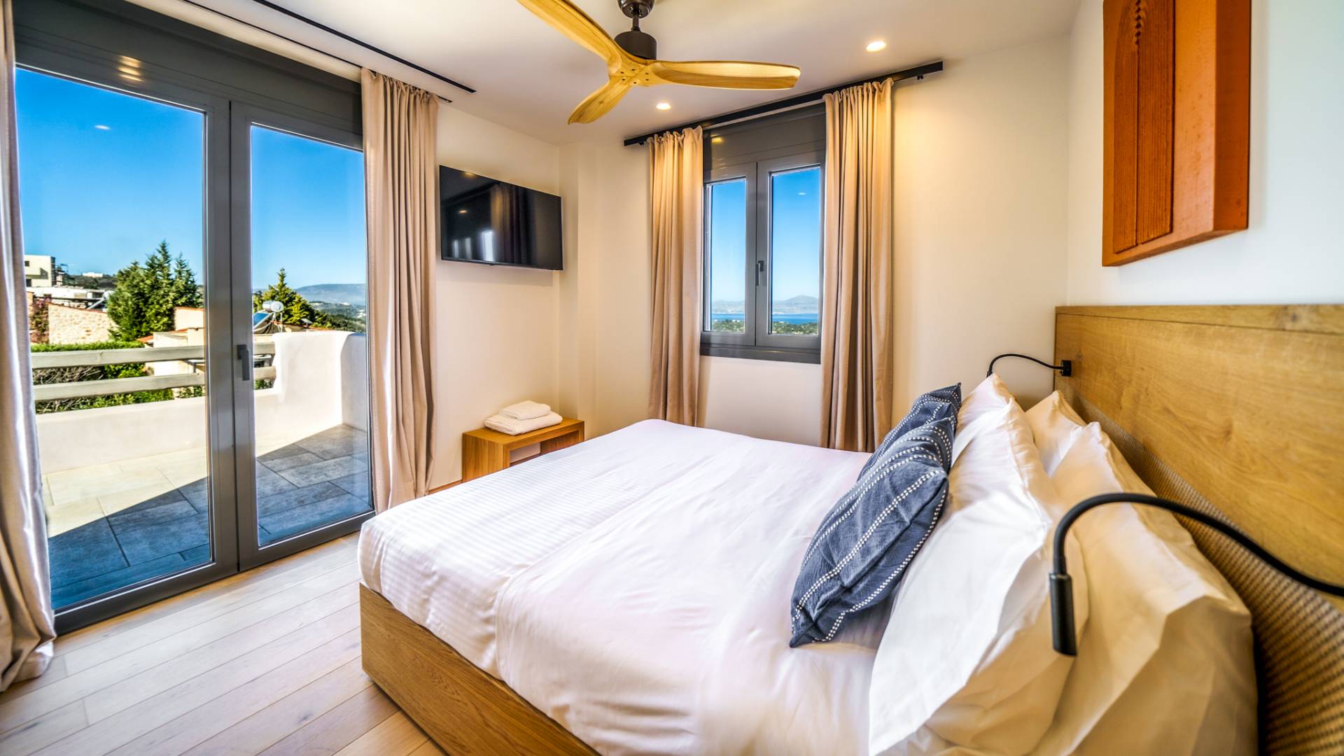 - Master Bedroom 3 with queen bed, 2 single beds (attic level) ensuite bathroom and private balcony with sea view