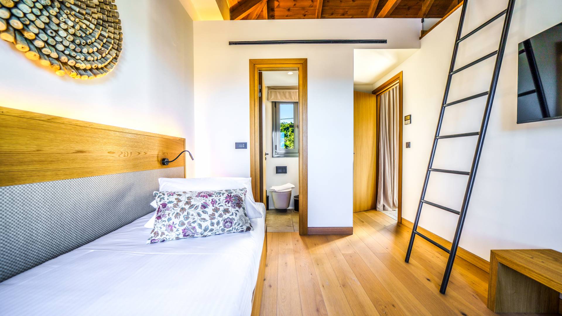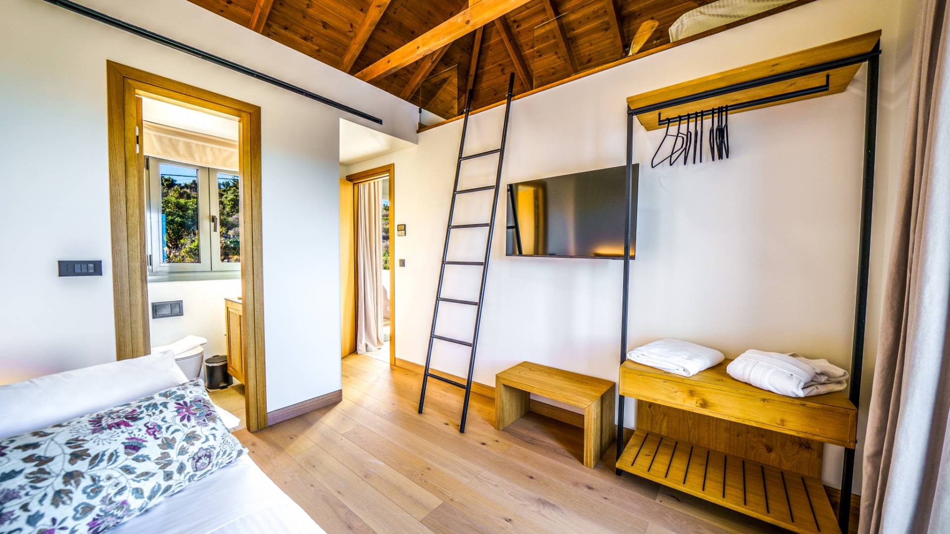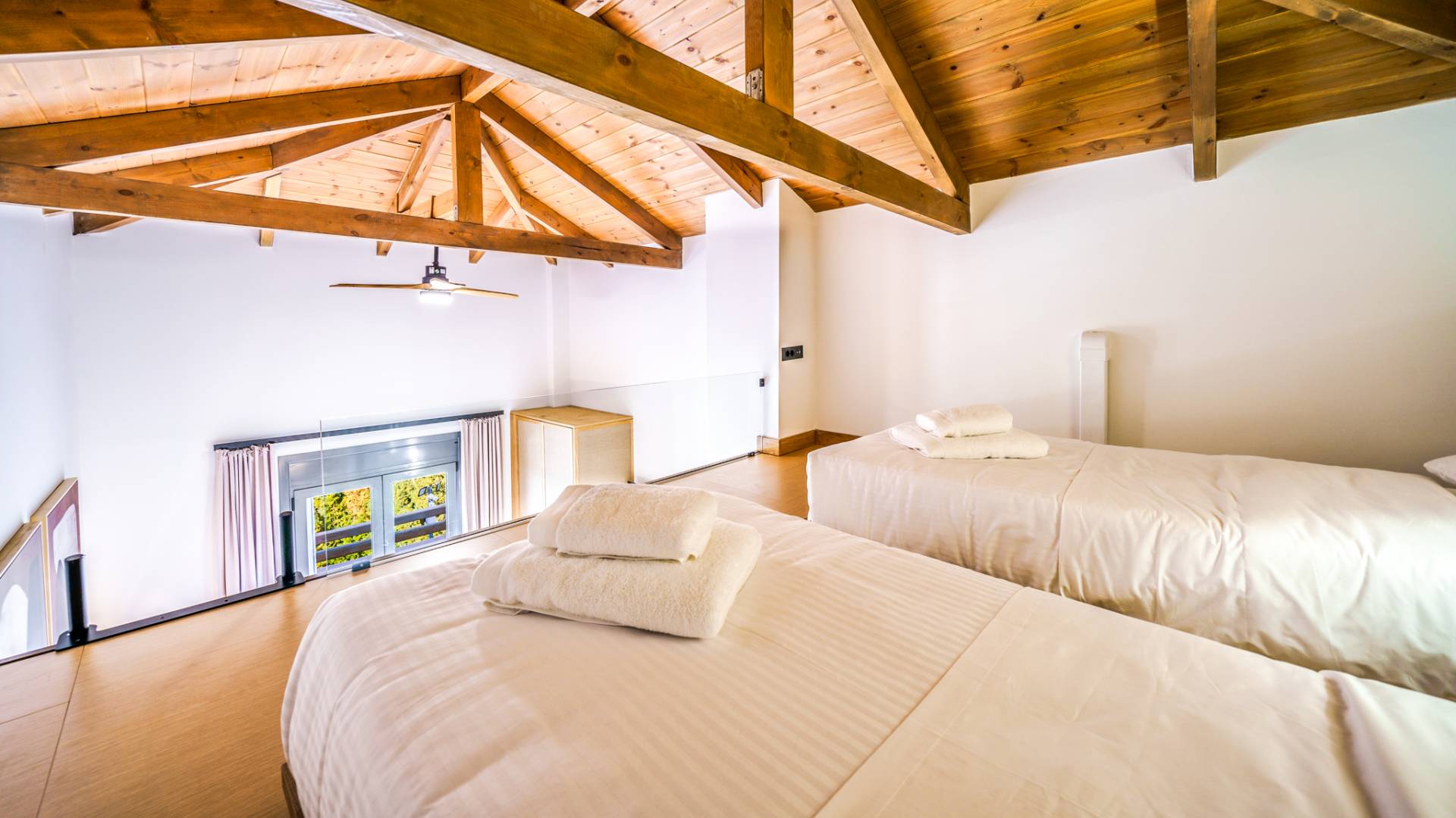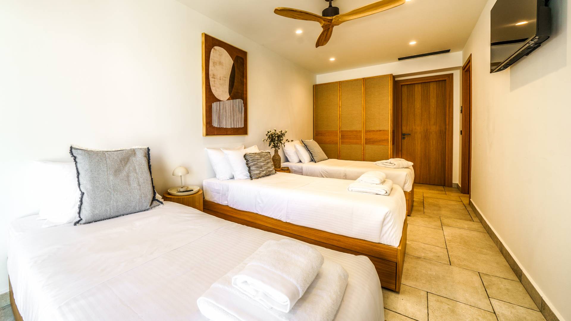 - Master Bedroom 3 with queen bed, 2 single beds (attic level) ensuite bathroom and private balcony with sea view