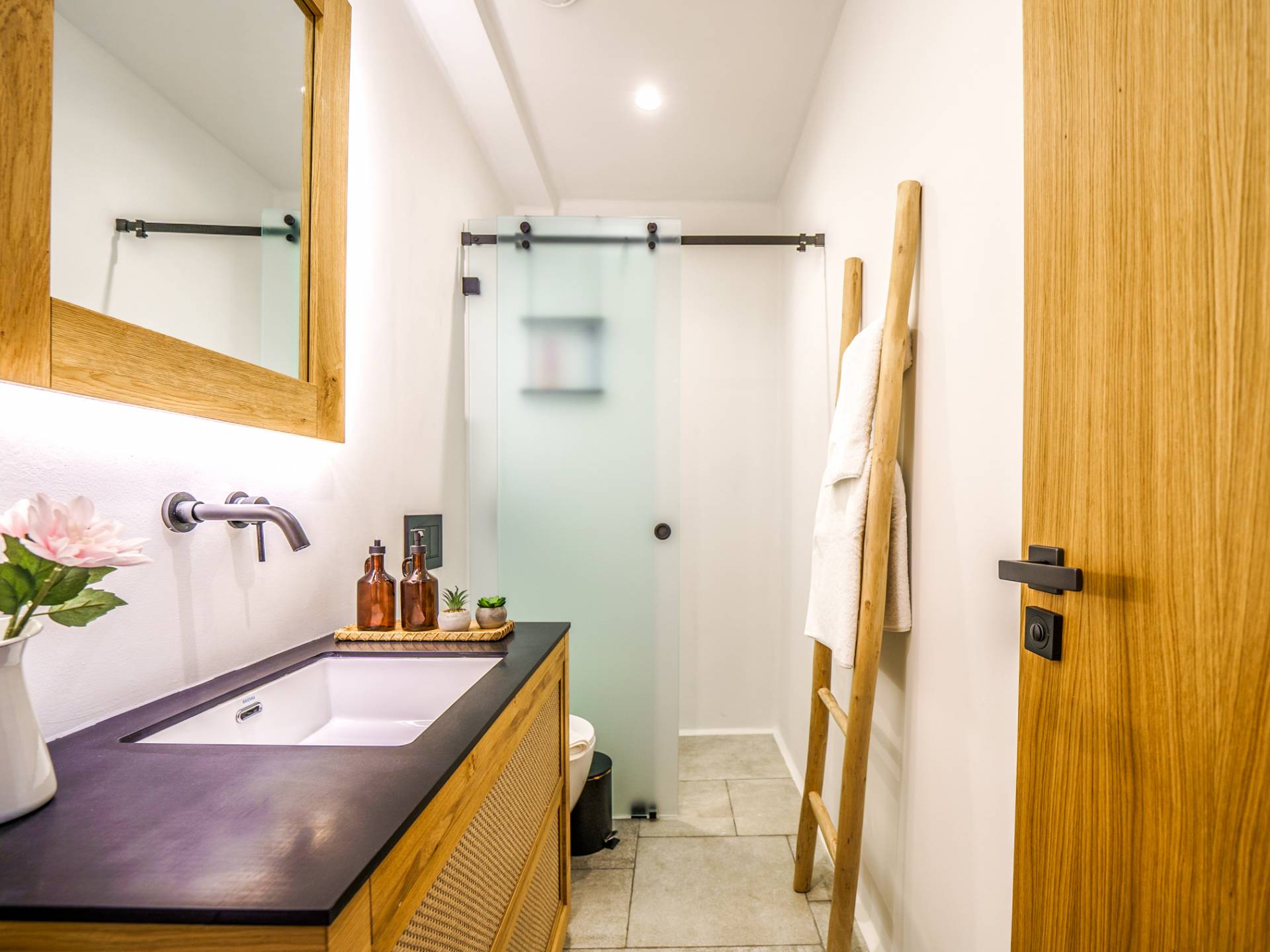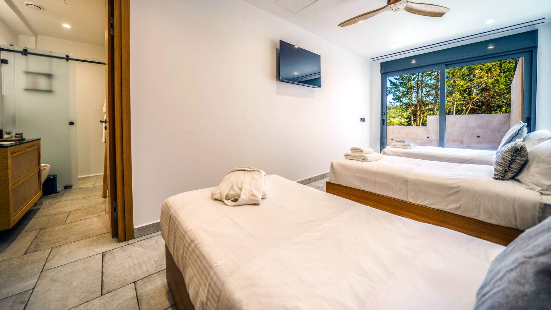 - Bedroom 2 with two single beds, ensuite bathroom and direct access to the terrace