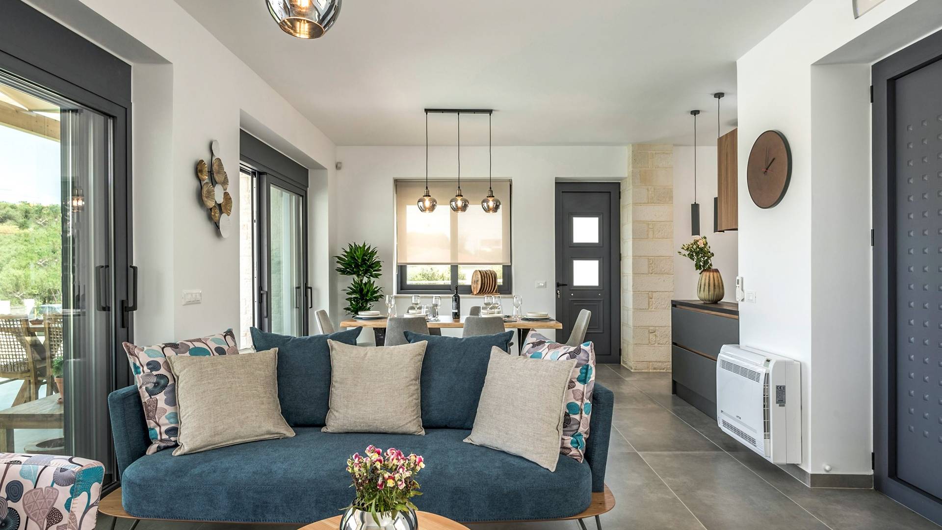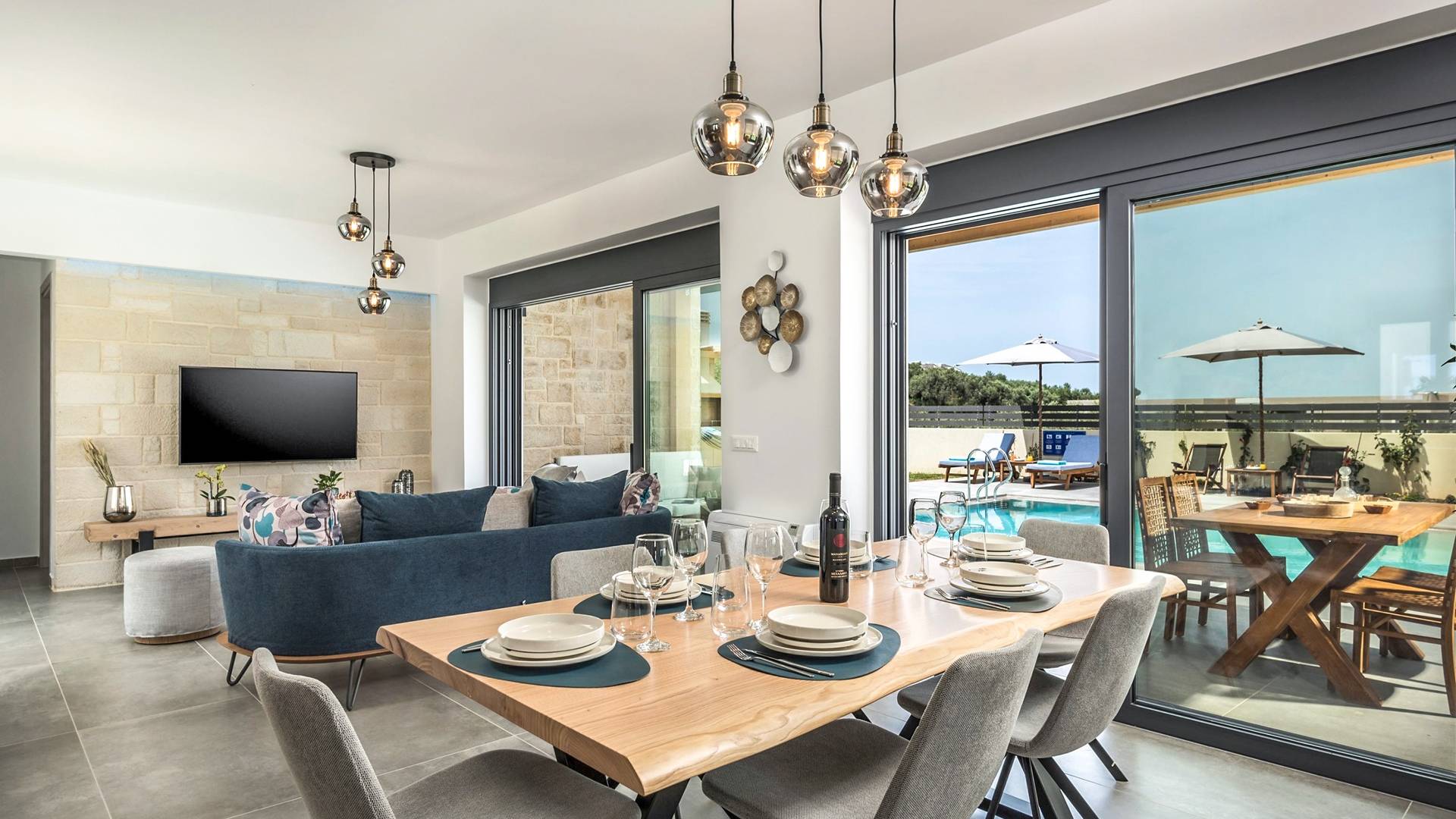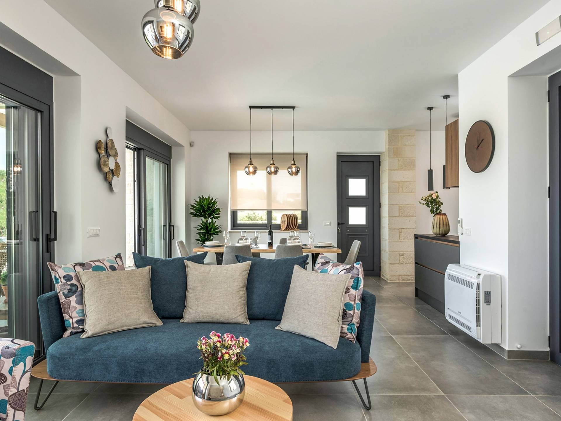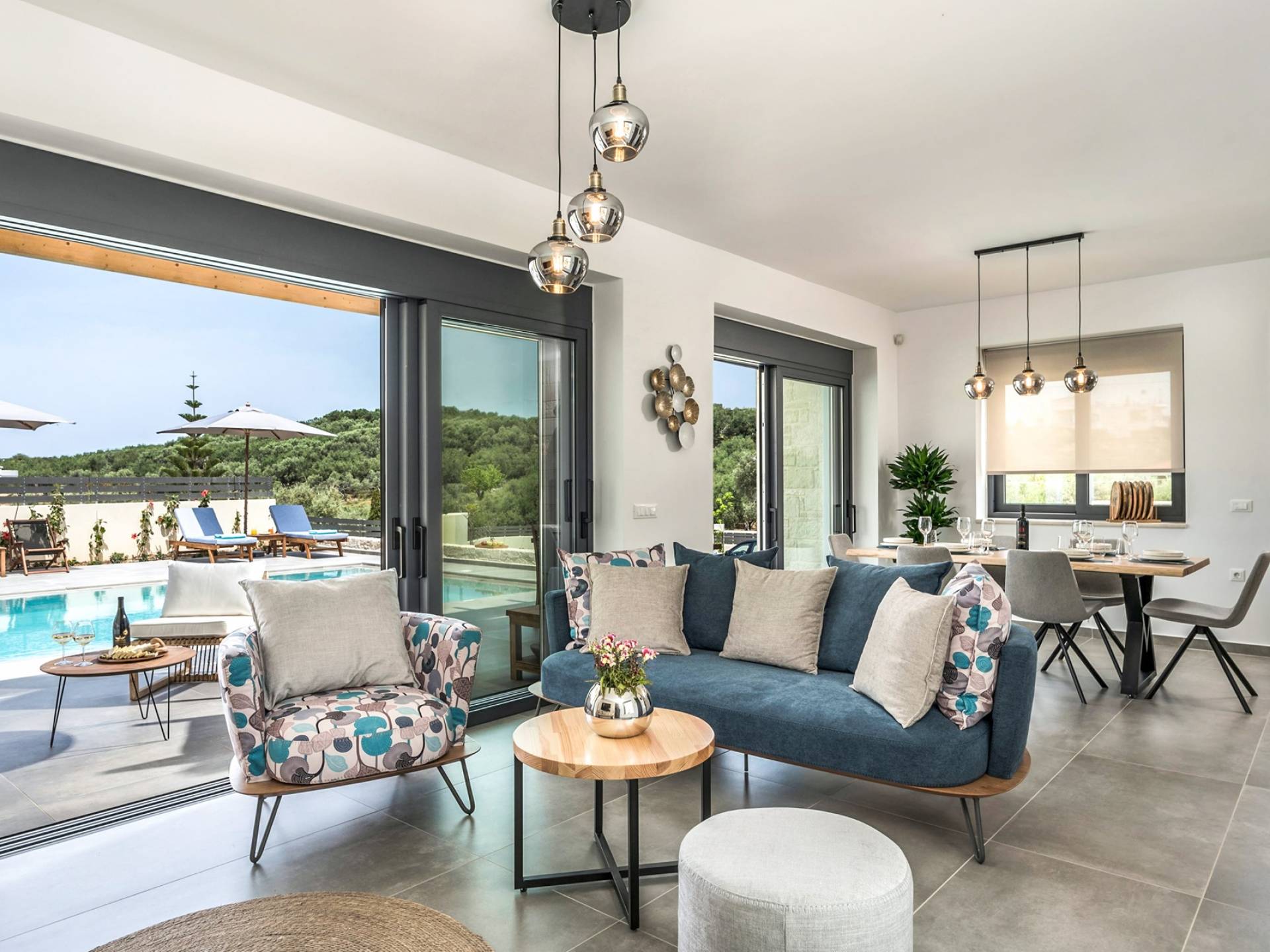 Villa Annias 1 Chania enjoys an open-plan ground floor area featuring the living room, kitchen, and indoor dining table. The simple, modern design has a fresh modern palette incorporating natural stone and bold sea tones in the quality furnishings and fixtures. The living room features a 4-seater sofa, single armchair, pouf and coffee table, a 55’’ Smart TV with Netflix and Satellite, and air conditioning. Large patio doors connect the living area with the outdoor space, where you can while away, enjoying the twittering chatter of birds.