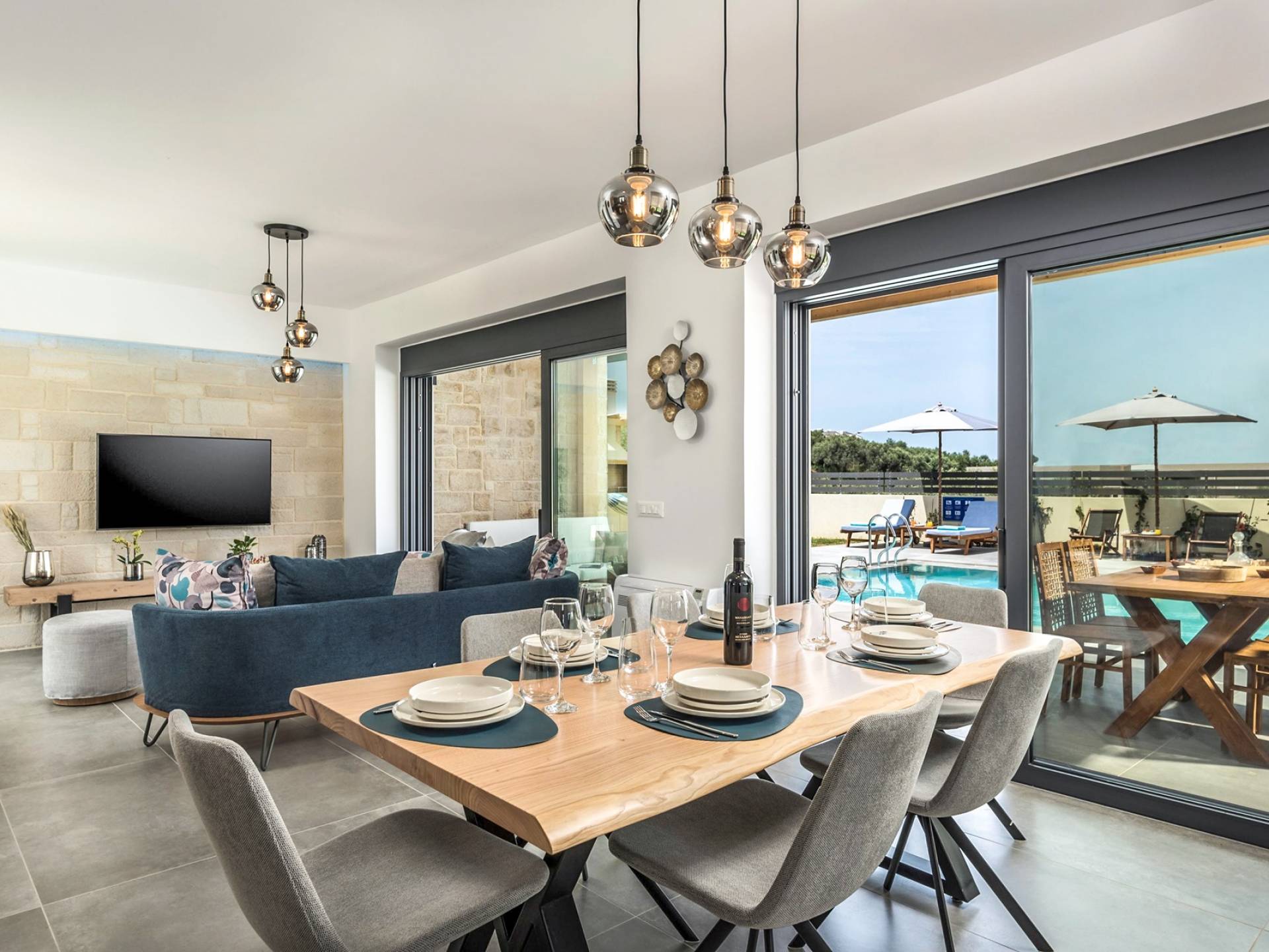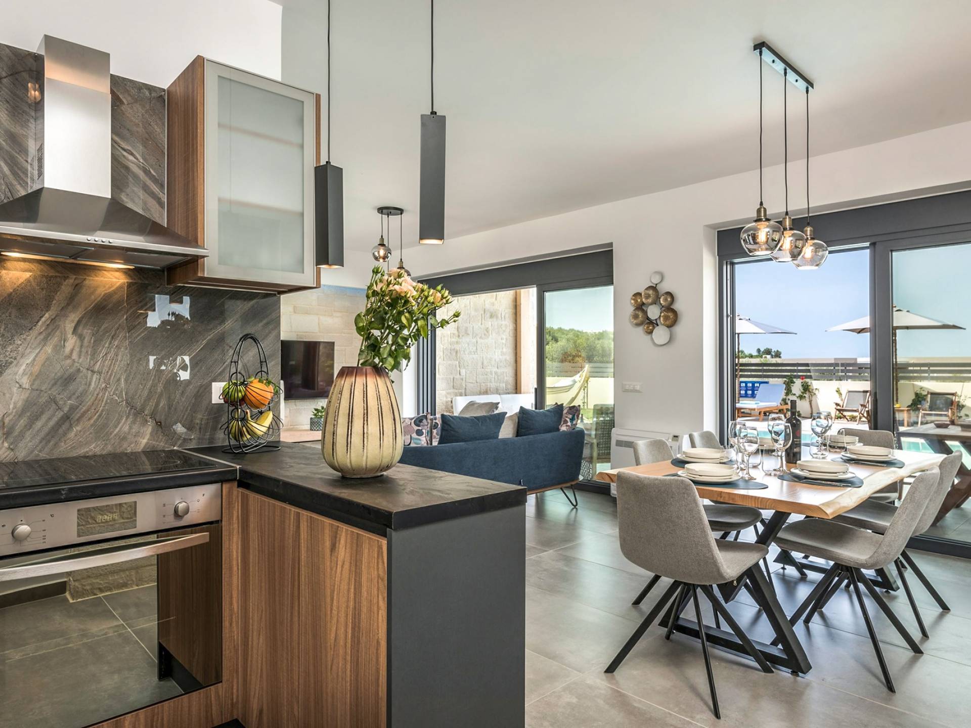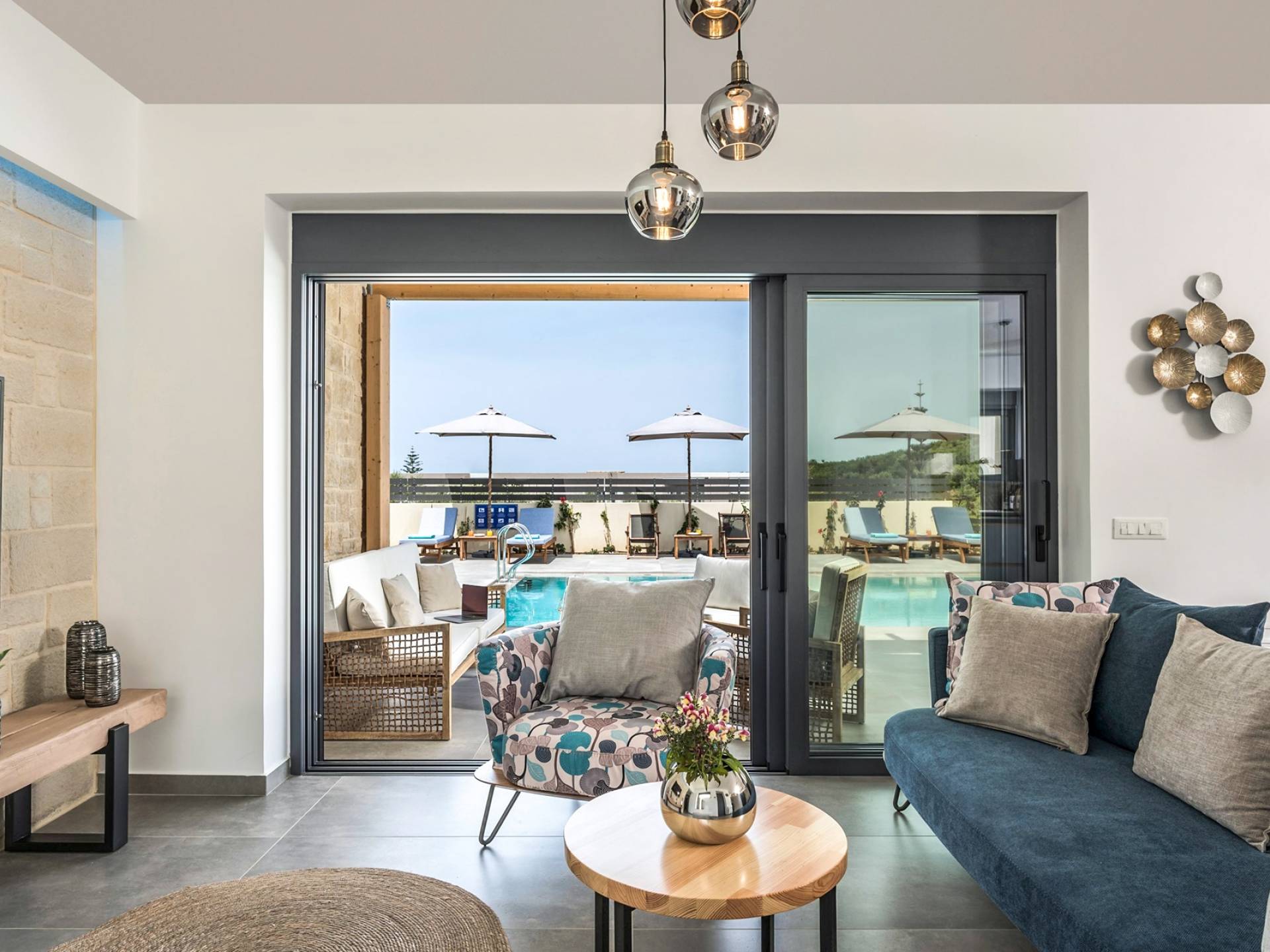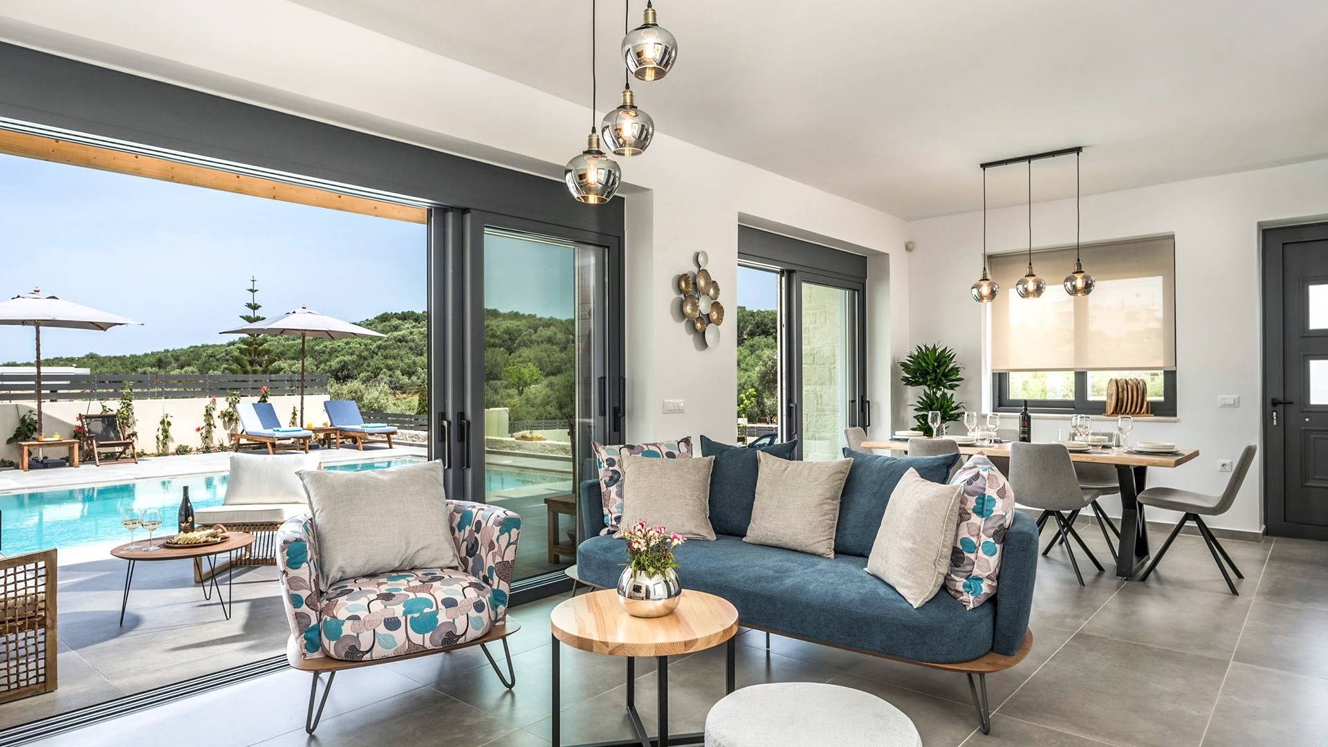 Villa Annias 1 Chania enjoys an open-plan ground floor area featuring the living room, kitchen, and indoor dining table. The simple, modern design has a fresh modern palette incorporating natural stone and bold sea tones in the quality furnishings and fixtures. The living room features a 4-seater sofa, single armchair, pouf and coffee table, a 55’’ Smart TV with Netflix and Satellite, and air conditioning. Large patio doors connect the living area with the outdoor space, where you can while away, enjoying the twittering chatter of birds.