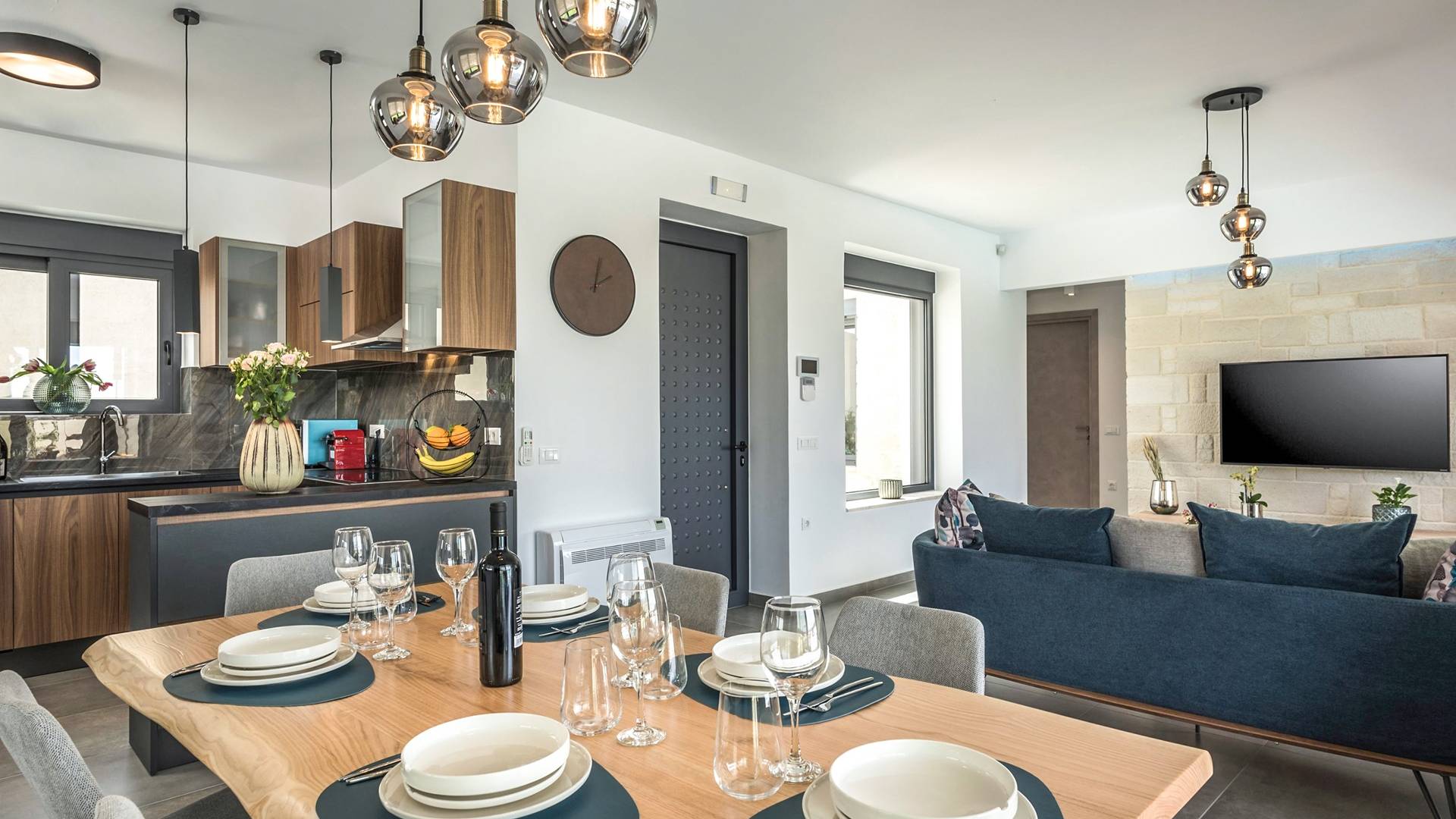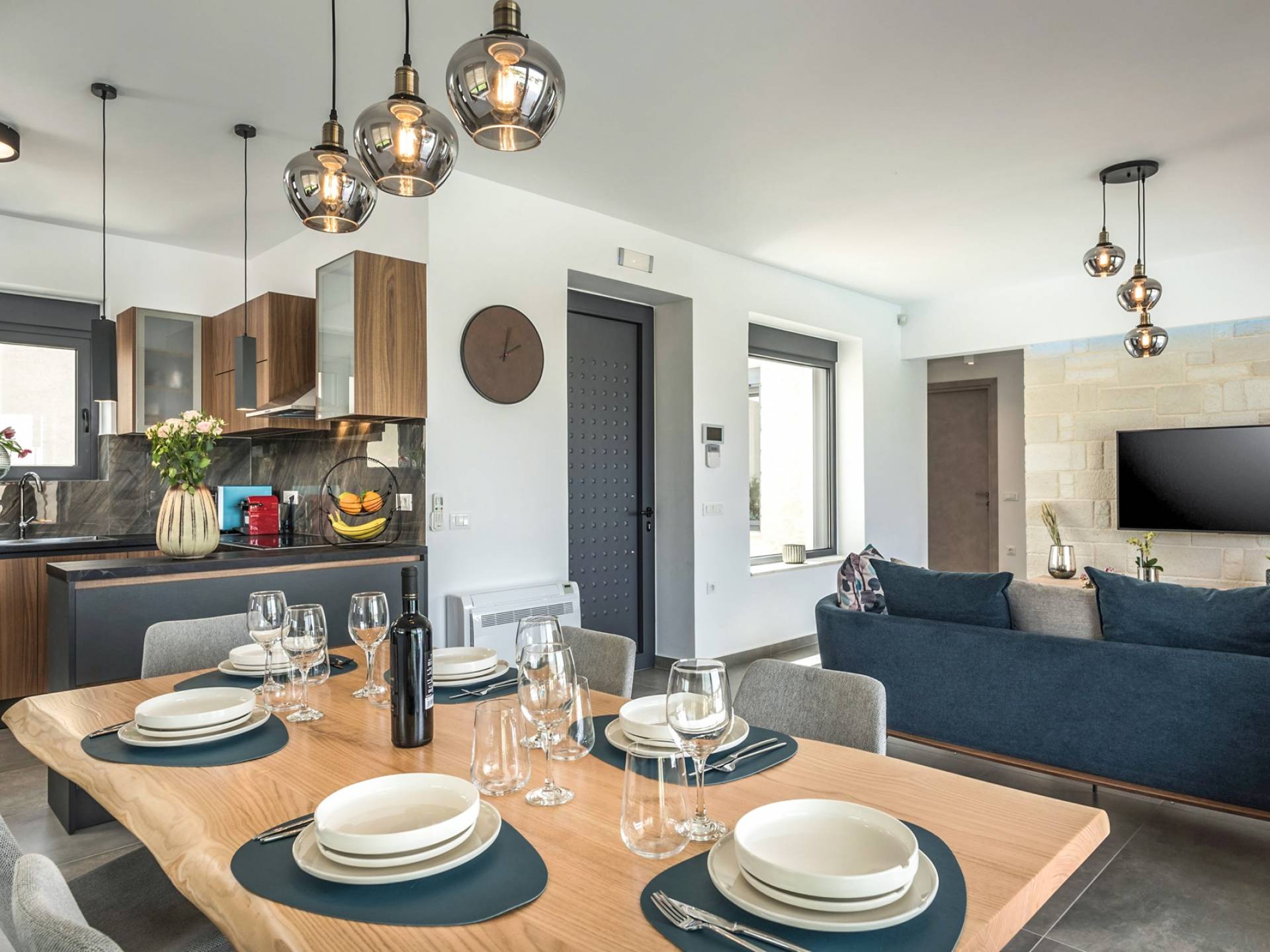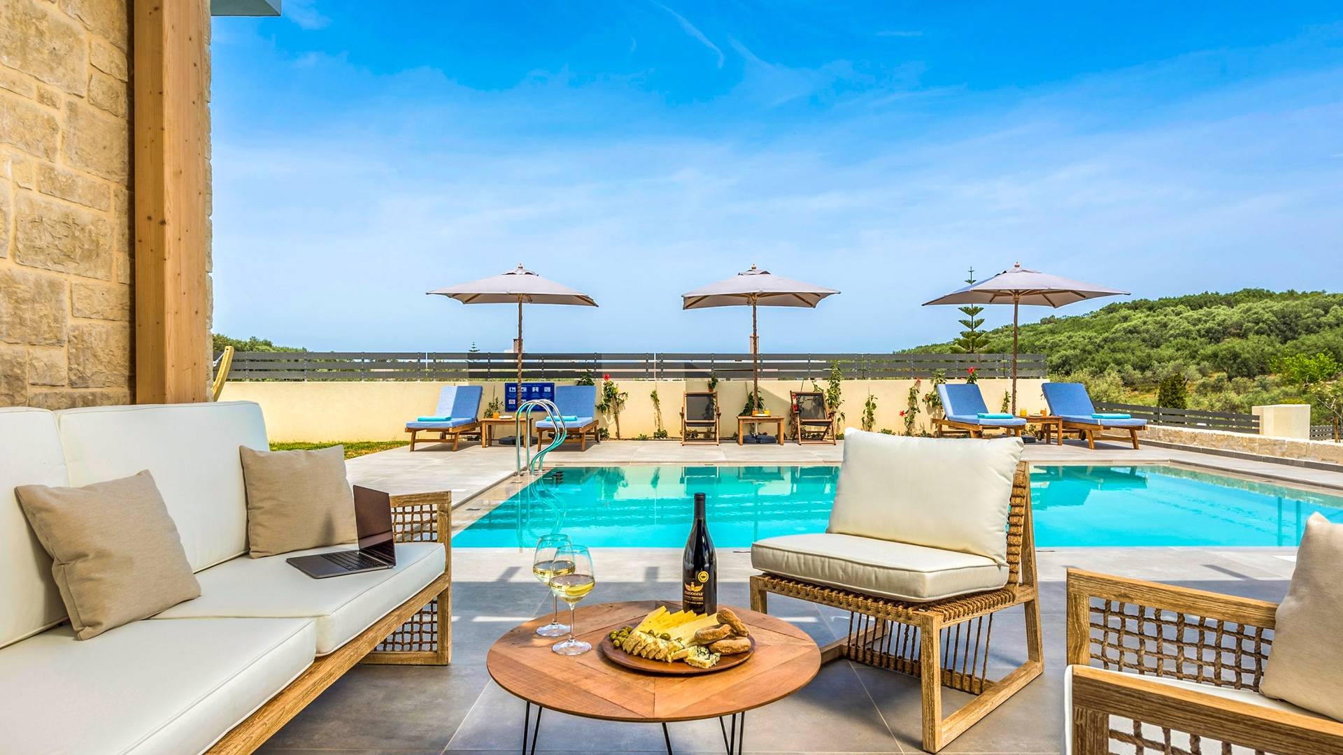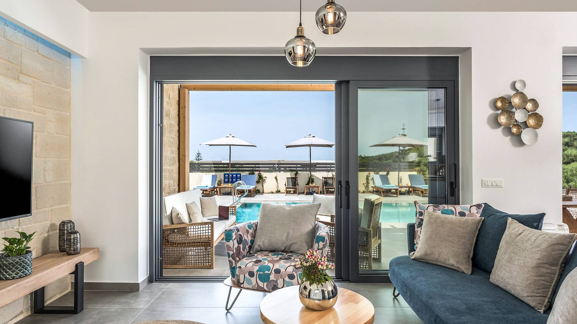 Villa Annias 1 Chania enjoys an open-plan ground floor area featuring the living room, kitchen, and indoor dining table. The simple, modern design has a fresh modern palette incorporating natural stone and bold sea tones in the quality furnishings and fixtures. The living room features a 4-seater sofa, single armchair, pouf and coffee table, a 55’’ Smart TV with Netflix and Satellite, and air conditioning. Large patio doors connect the living area with the outdoor space, where you can while away, enjoying the twittering chatter of birds.