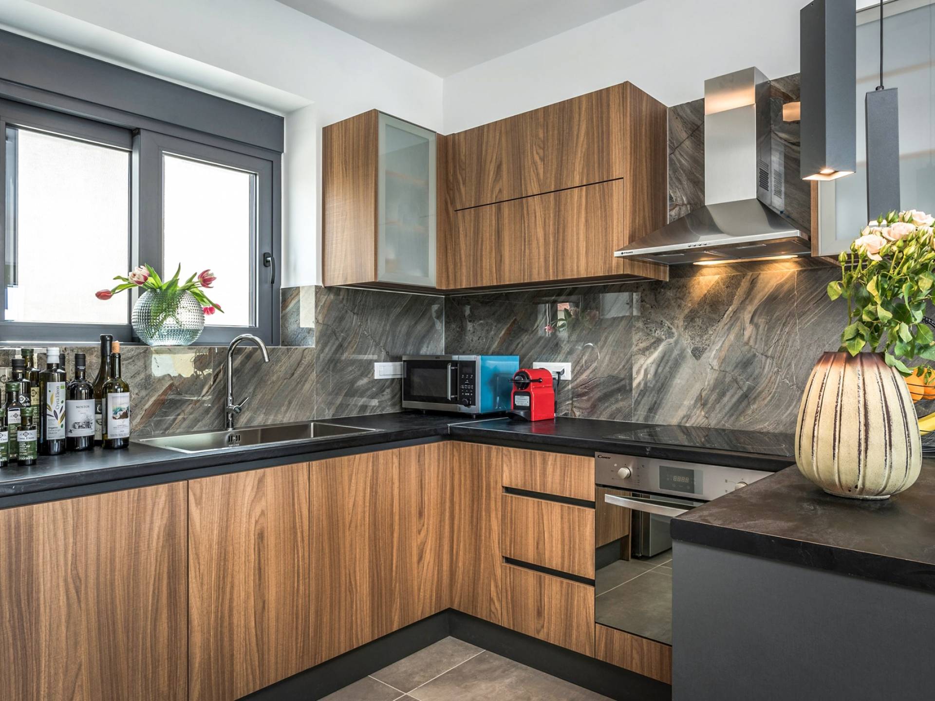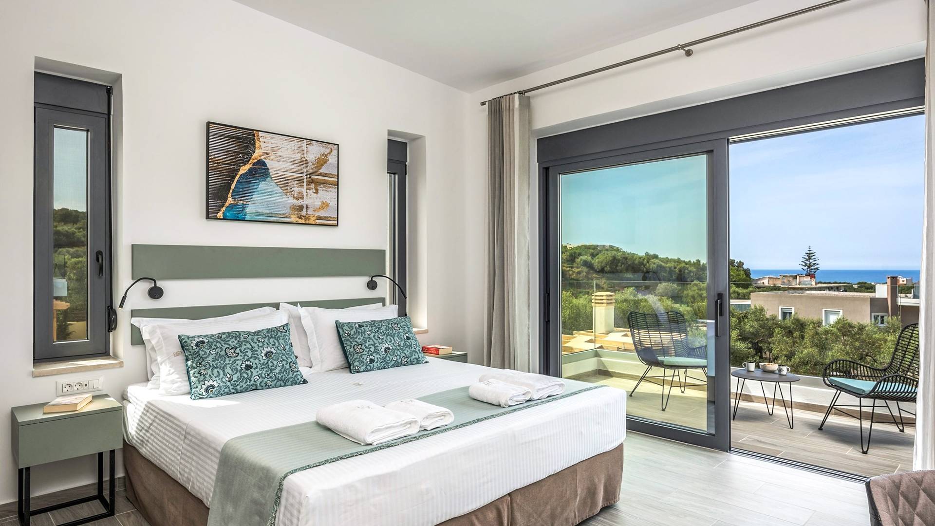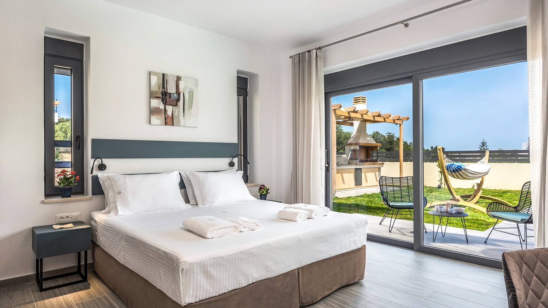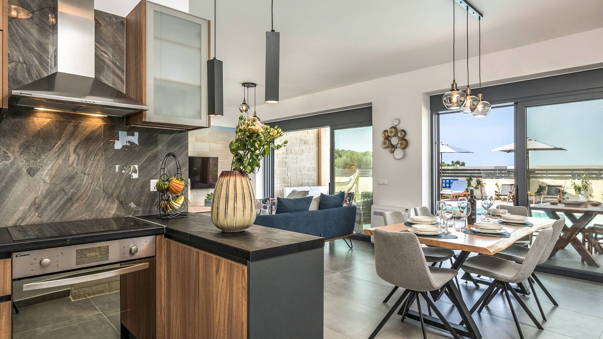 Villa Annias 1 Chania enjoys an open-plan ground floor area featuring the living room, kitchen, and indoor dining table. The simple, modern design has a fresh modern palette incorporating natural stone and bold sea tones in the quality furnishings and fixtures. The living room features a 4-seater sofa, single armchair, pouf and coffee table, a 55’’ Smart TV with Netflix and Satellite, and air conditioning. Large patio doors connect the living area with the outdoor space, where you can while away, enjoying the twittering chatter of birds.