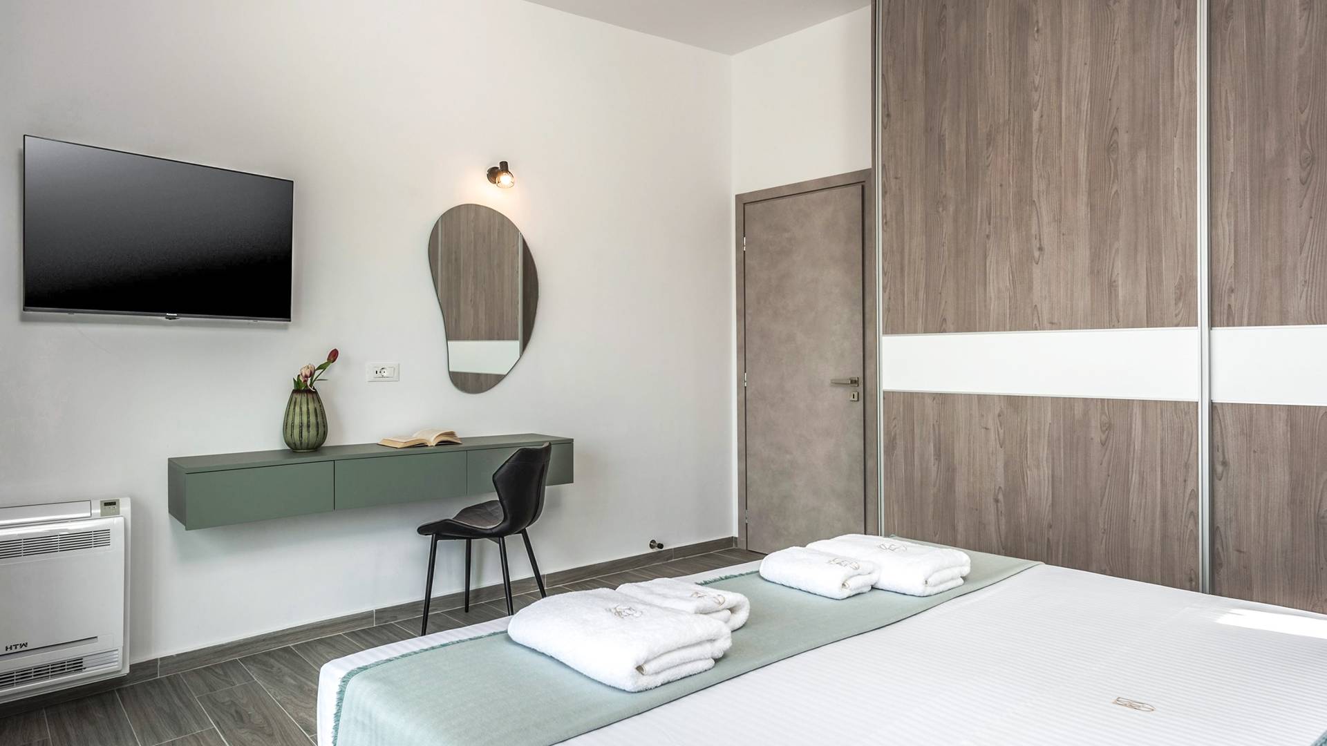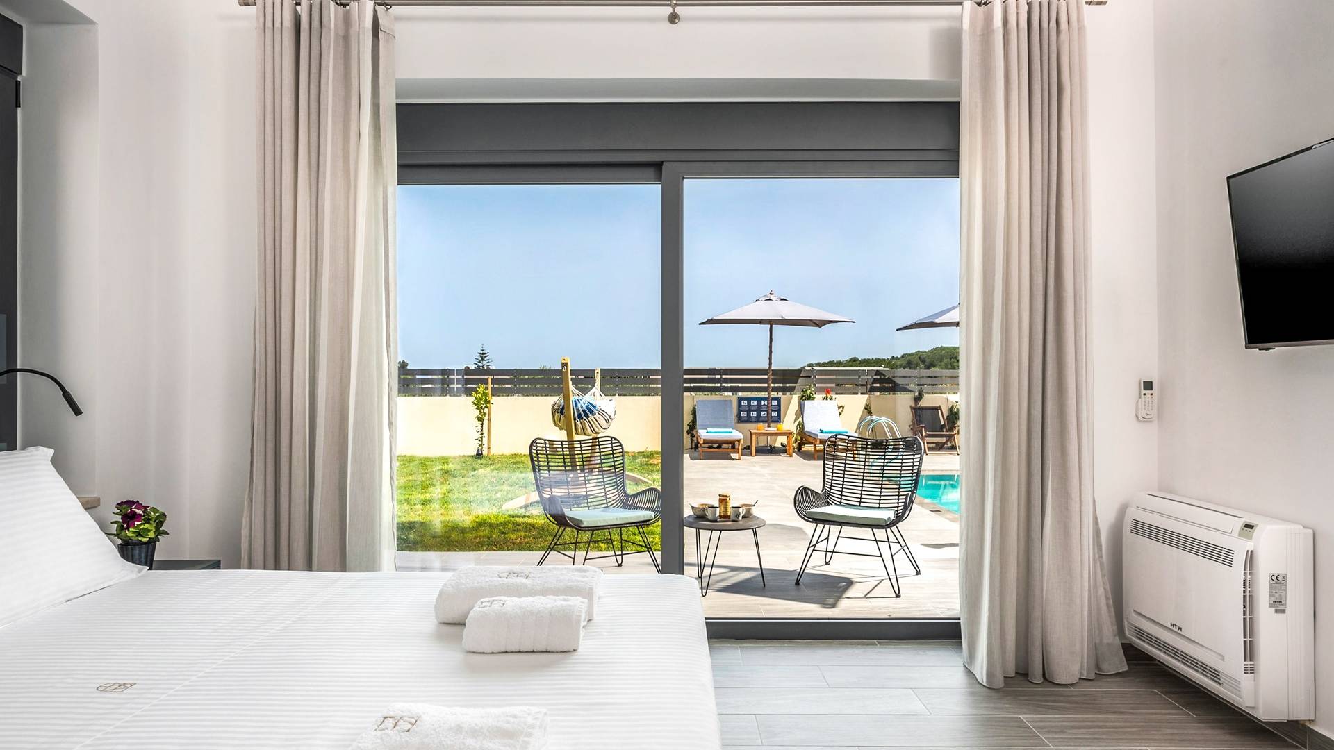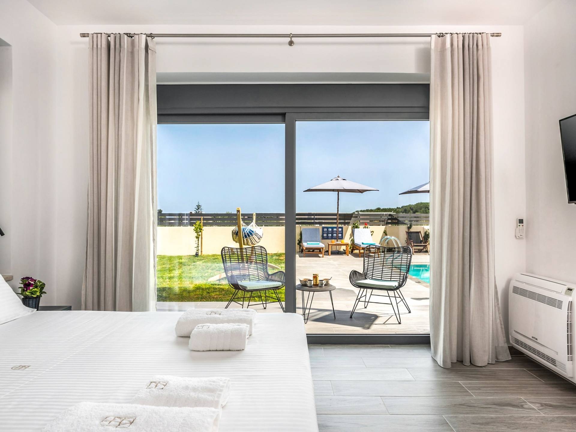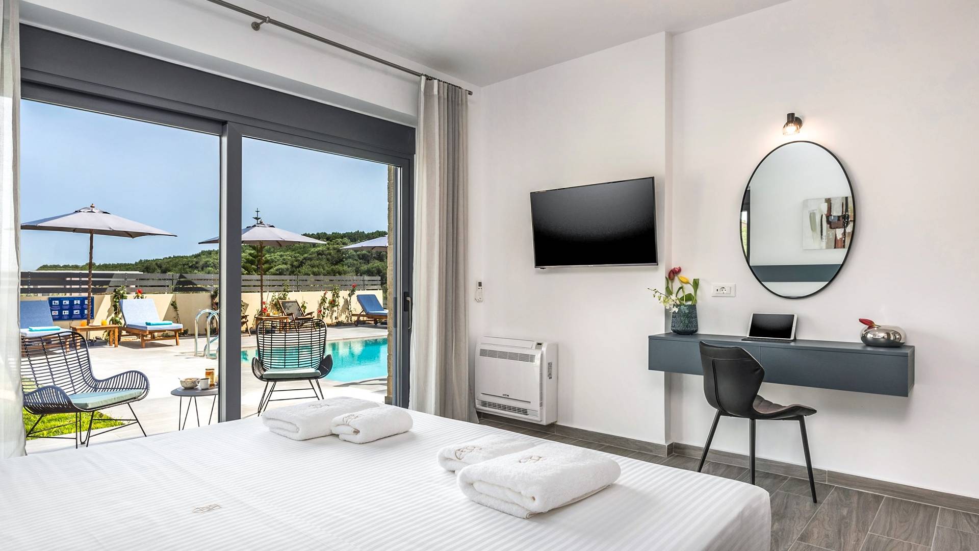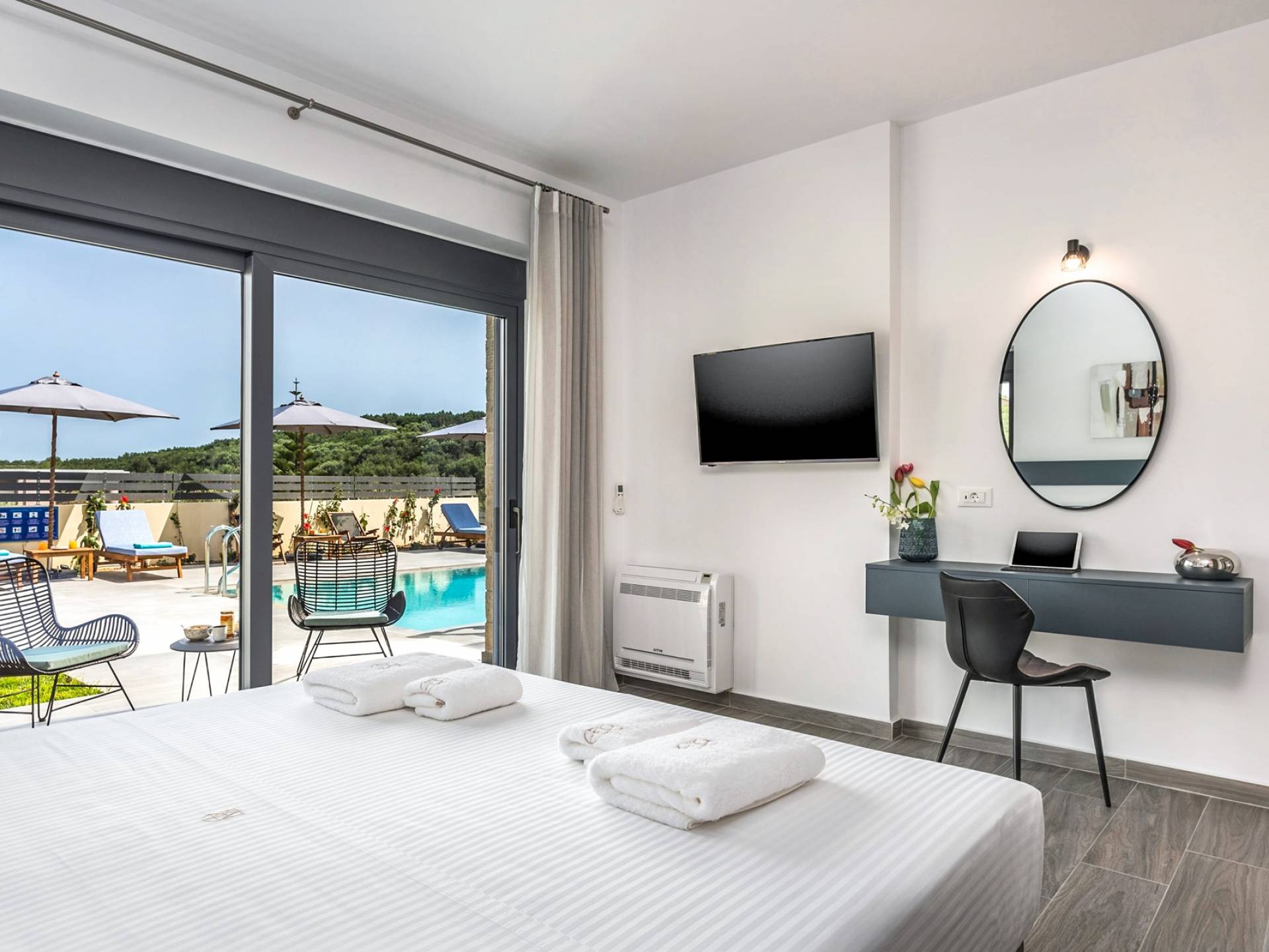 The ground floor bedroom features 2 twin beds (0,90 x 2,00) that can be converted into a Queen size bed (1,80 x 2,00) with a comfy mattress topper, A/C, and, a 43” TV with Netflix. The bedroom leads directly to the outdoor area and pool and offers an additional sitting area with a small table and chairs. A bathroom with a rain shower, vessel sink, and toilet are located next to the bedroom.