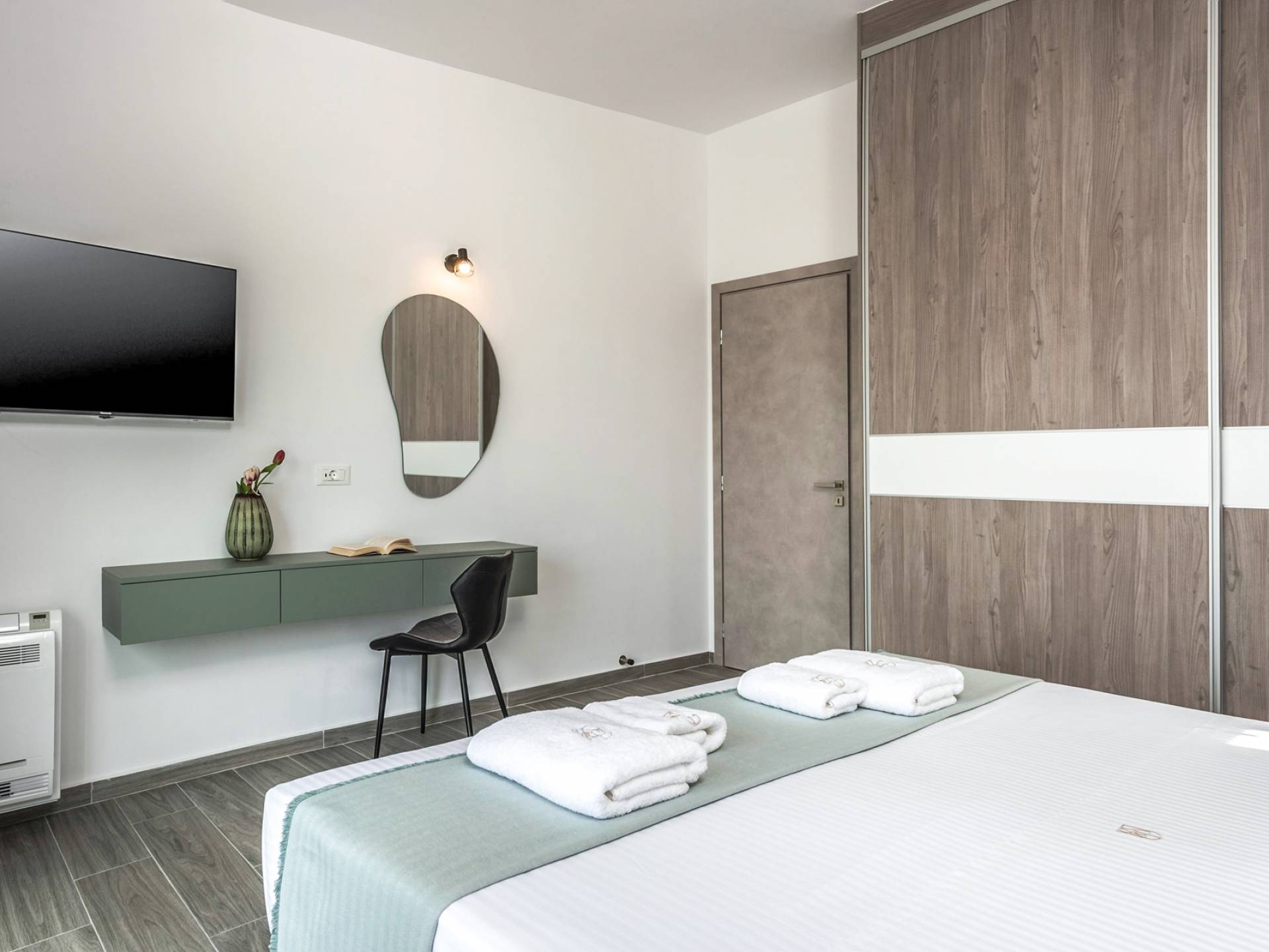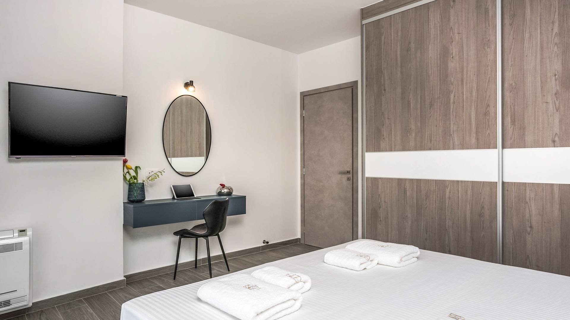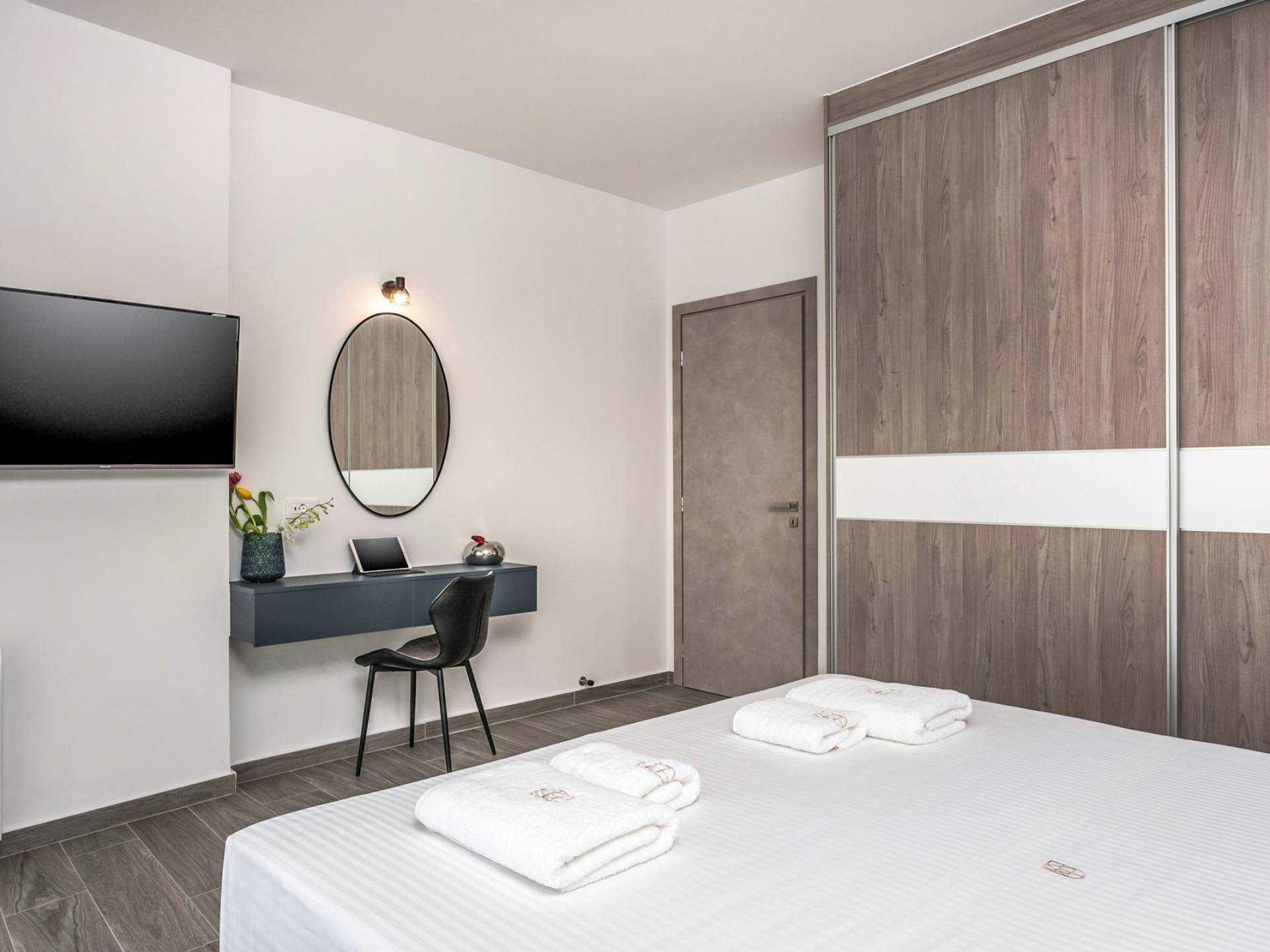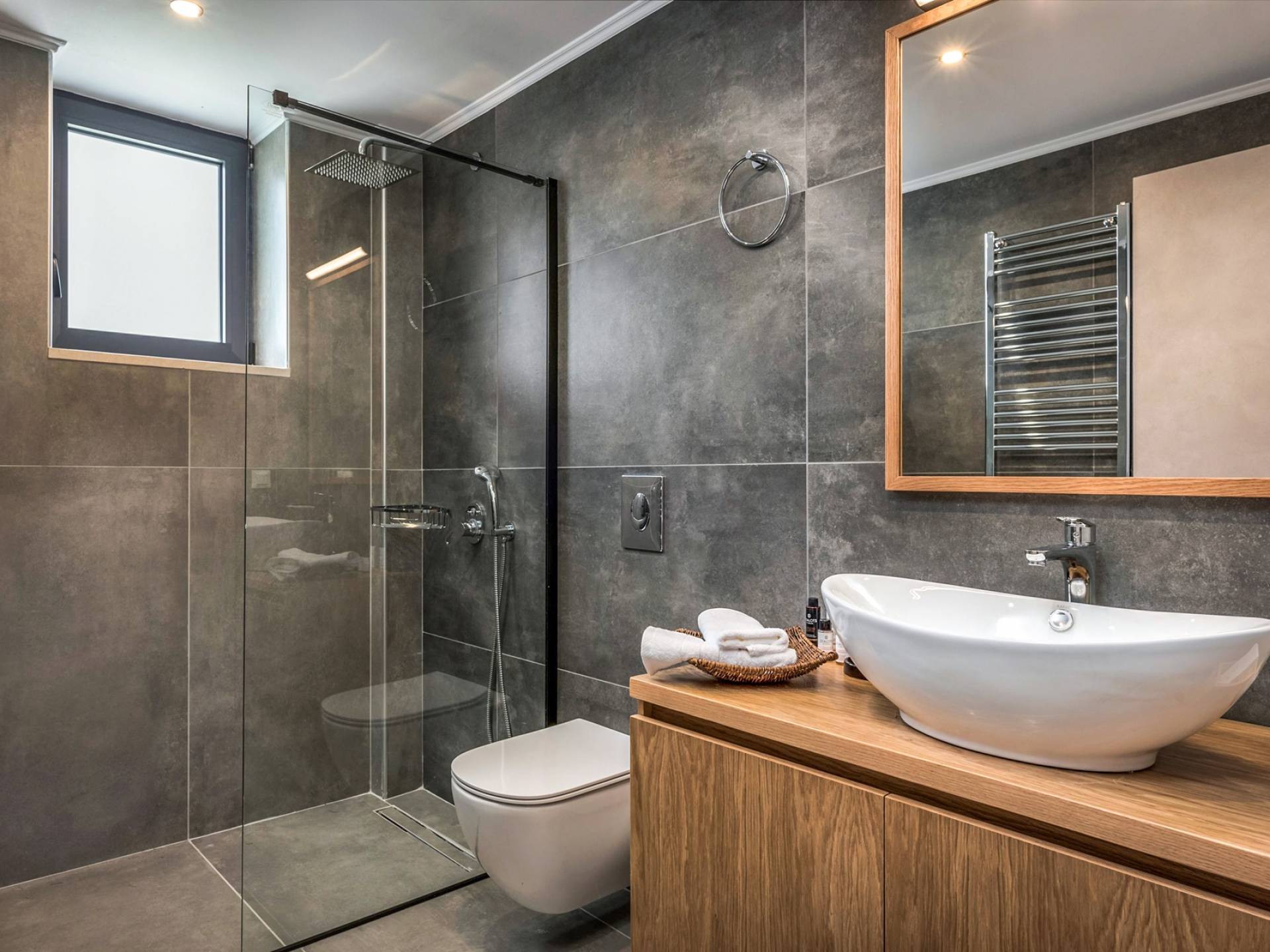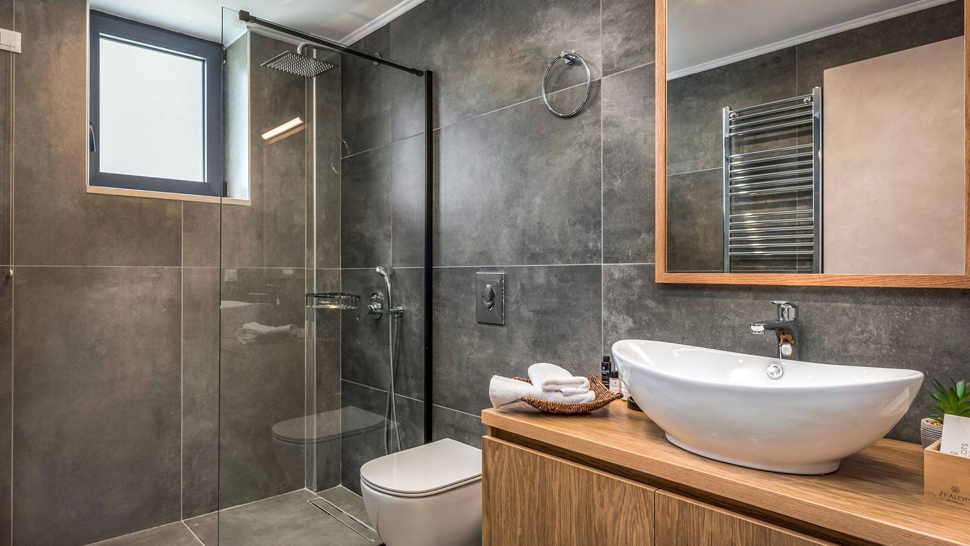 The ground floor bedroom features 2 twin beds (0,90 x 2,00) that can be converted into a Queen size bed (1,80 x 2,00) with a comfy mattress topper, A/C, and, a 43” TV with Netflix. The bedroom leads directly to the outdoor area and pool and offers an additional sitting area with a small table and chairs. A bathroom with a rain shower, vessel sink, and toilet are located next to the bedroom.