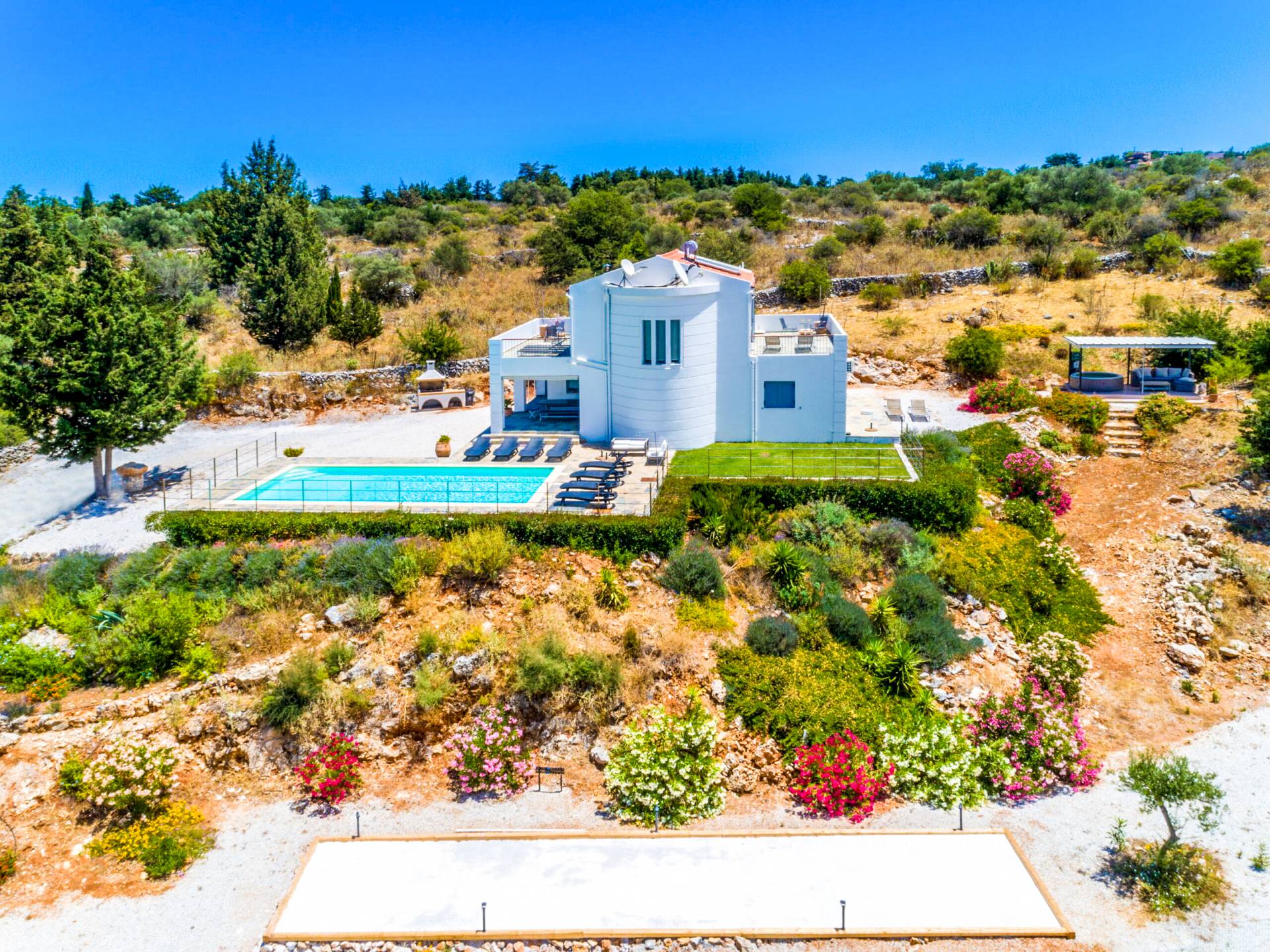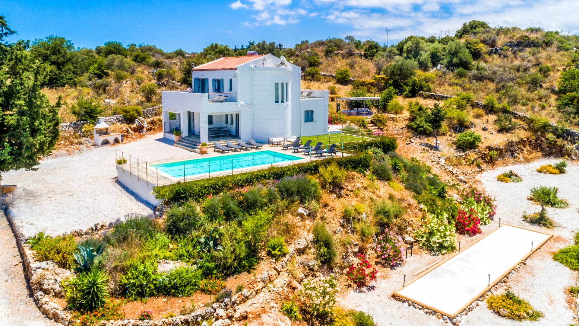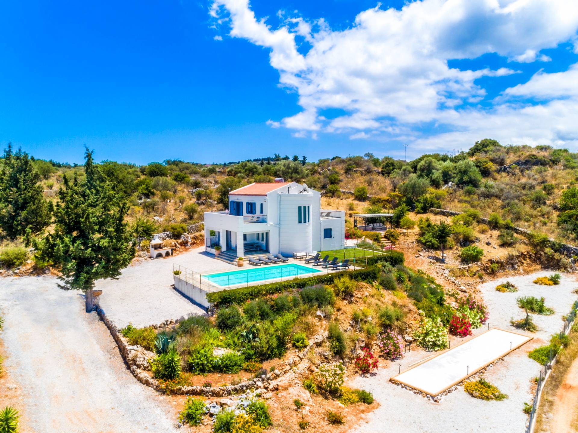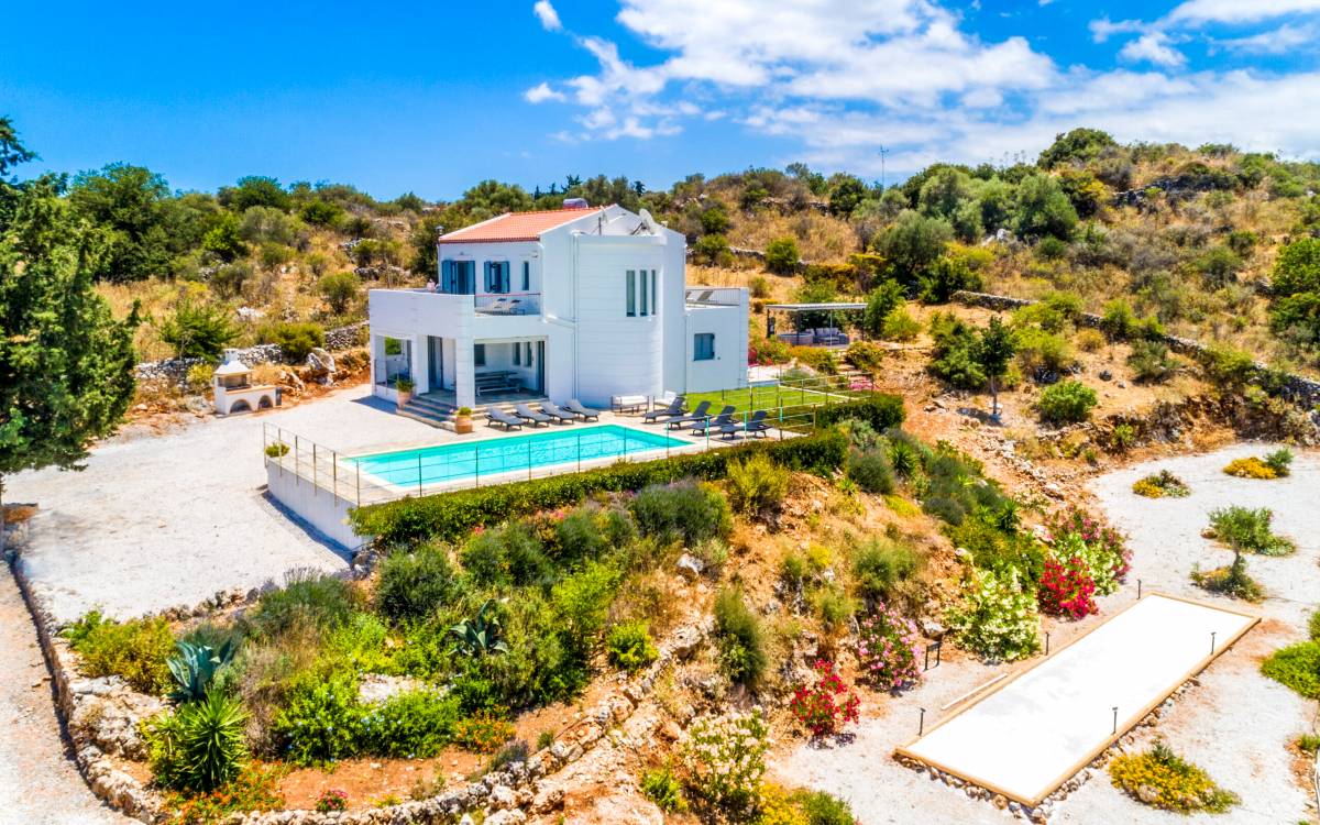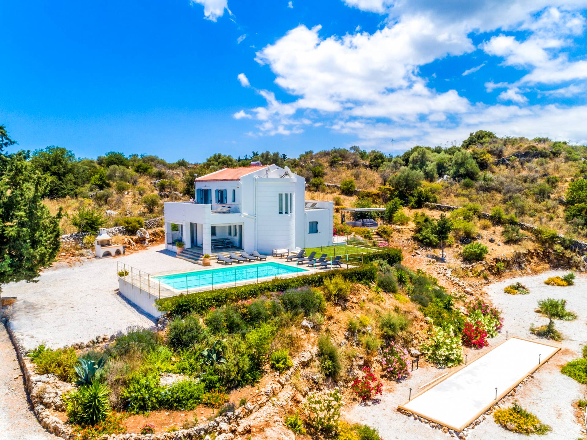 Downstairs there are two Superior bedrooms with fitted wardrobes, air-conditioning, ceiling fan, and exit directly on a private panoramic area fitted with umbrella and sunbeds. Outside there is a new Petanque or Bowling field, a panoramic veranda with a jacuzzi, and a sofa for a relaxing time under the sun. Newly built villa in Vamos, to a very high specification, it’s a contemporary property offering a wealth of superb facilities, including a relaxing jacuzzi, stunning private pool, and spacious sun terrace from which to enjoy wonderful views. The villa is designed to make your vacations a real comfort to make you feel the warmth of genuine hospitality in Crete.