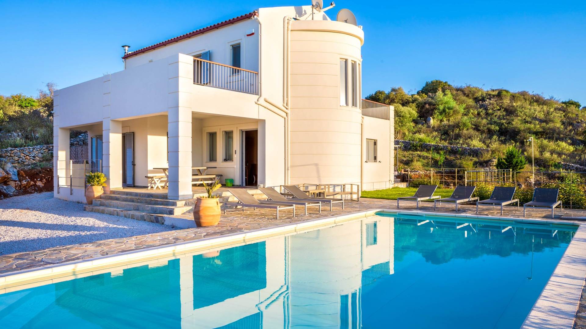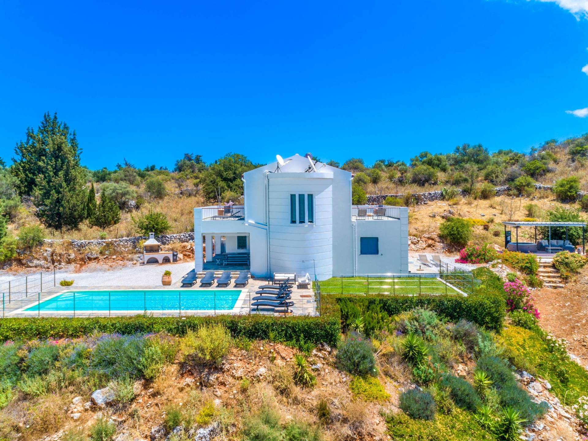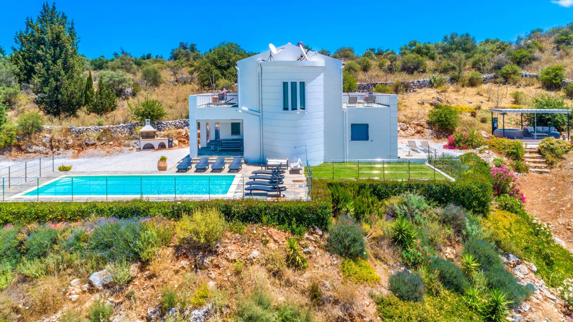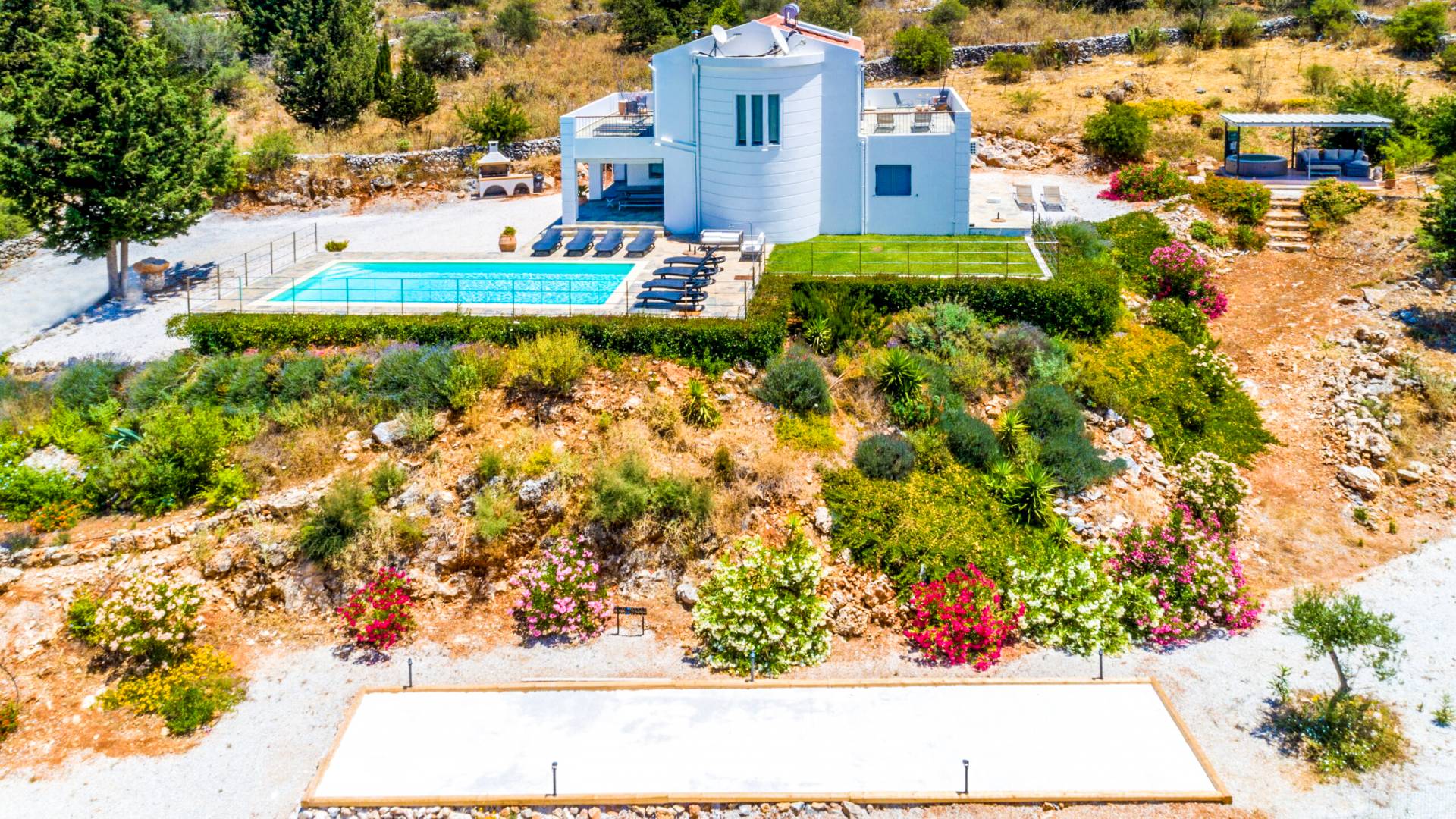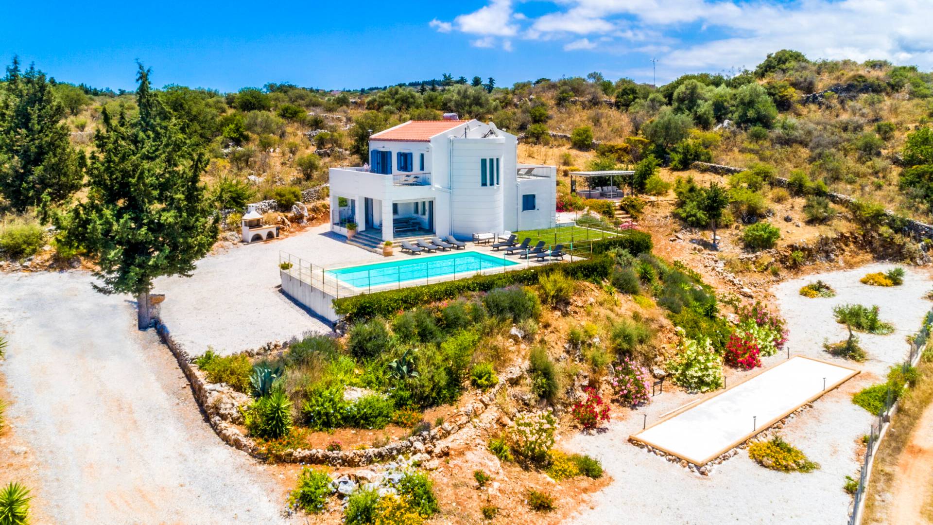Downstairs there are two Superior bedrooms with fitted wardrobes, air-conditioning, ceiling fan, and exit directly on a private panoramic area fitted with umbrella and sunbeds. Outside there is a new Petanque or Bowling field, a panoramic veranda with a jacuzzi, and a sofa for a relaxing time under the sun. Newly built villa in Vamos, to a very high specification, it’s a contemporary property offering a wealth of superb facilities, including a relaxing jacuzzi, stunning private pool, and spacious sun terrace from which to enjoy wonderful views. The villa is designed to make your vacations a real comfort to make you feel the warmth of genuine hospitality in Crete.