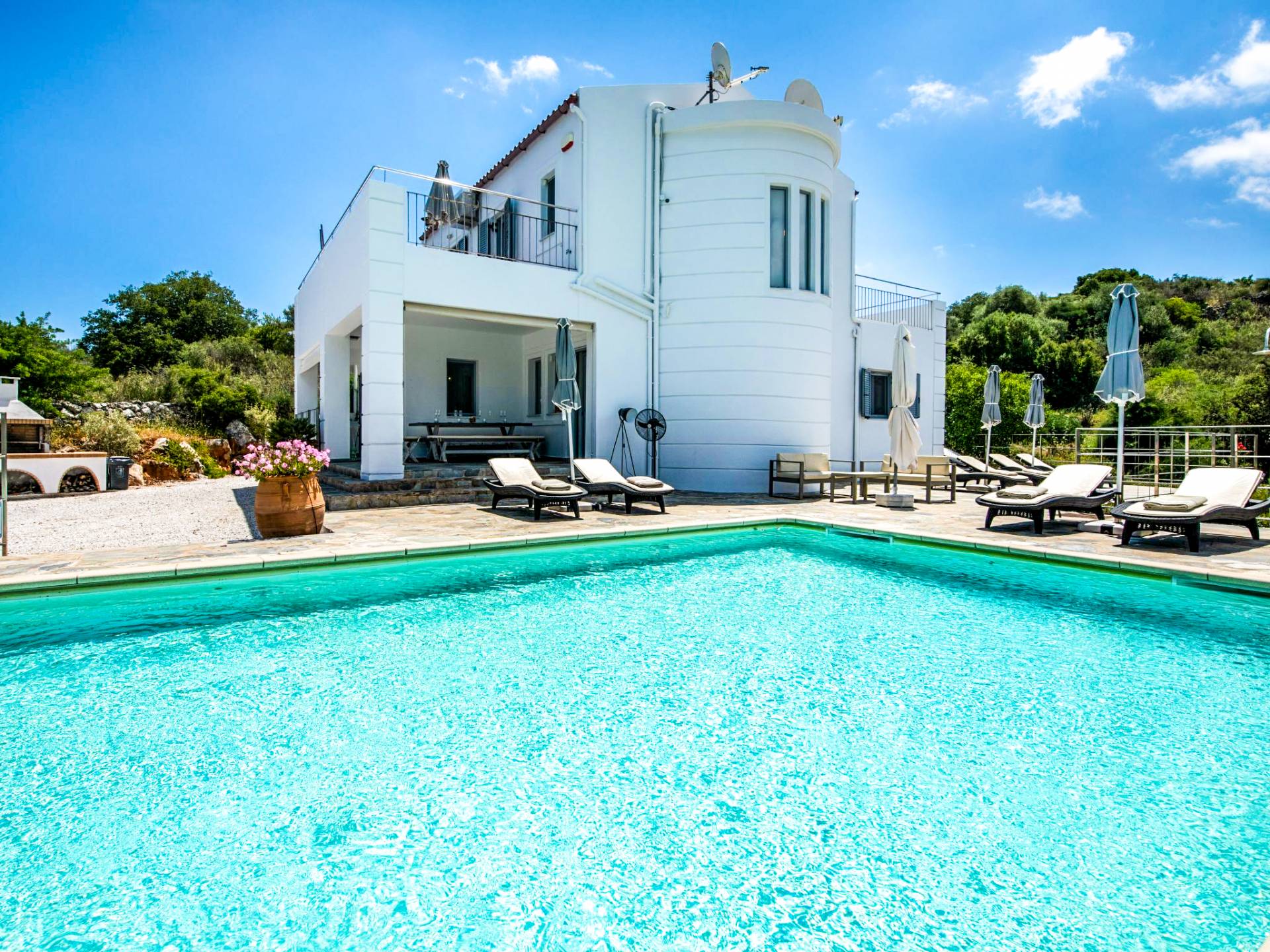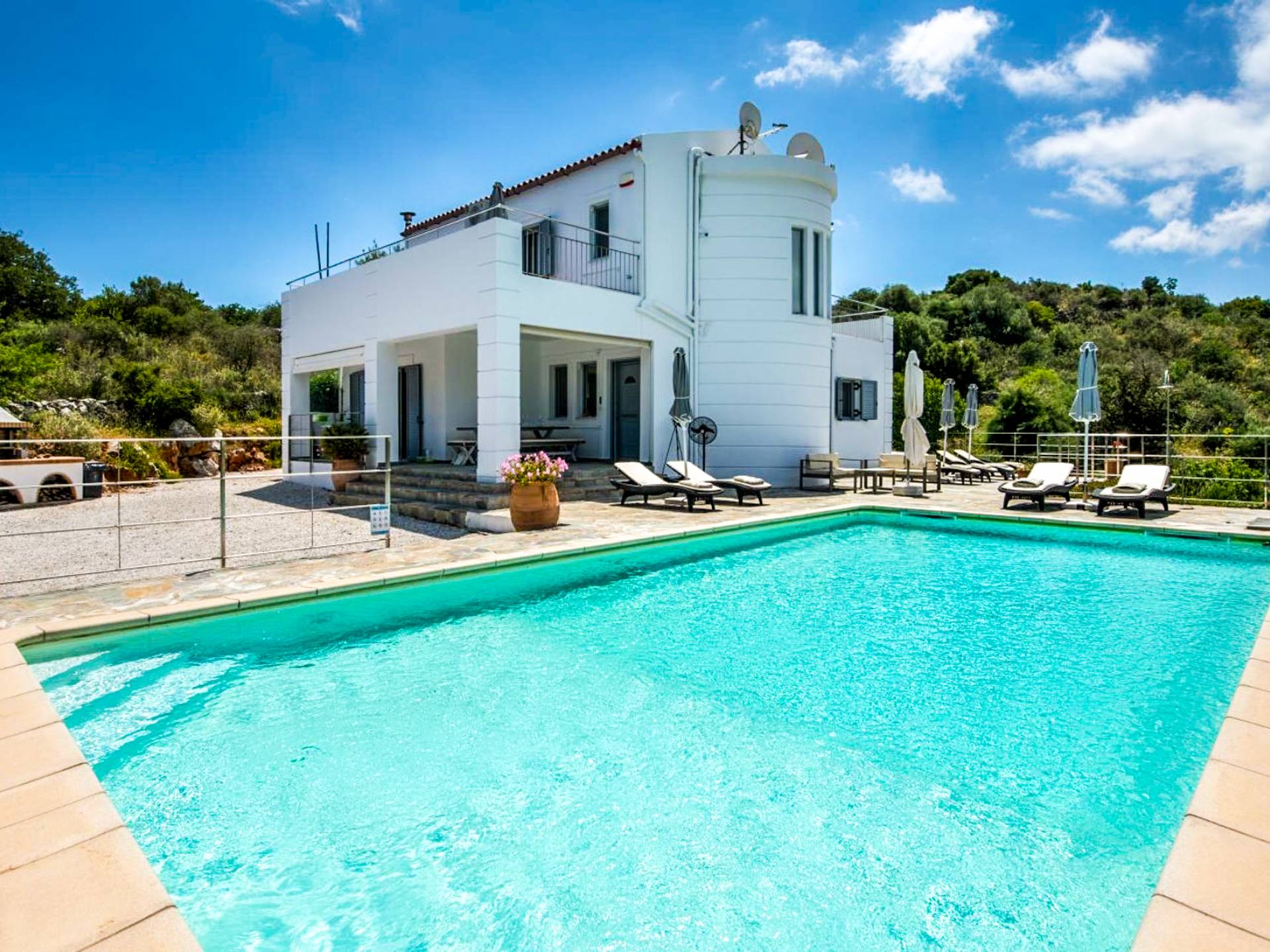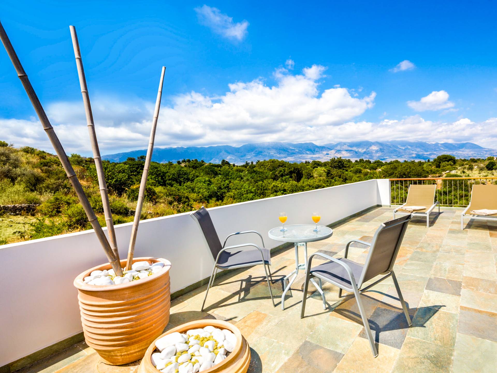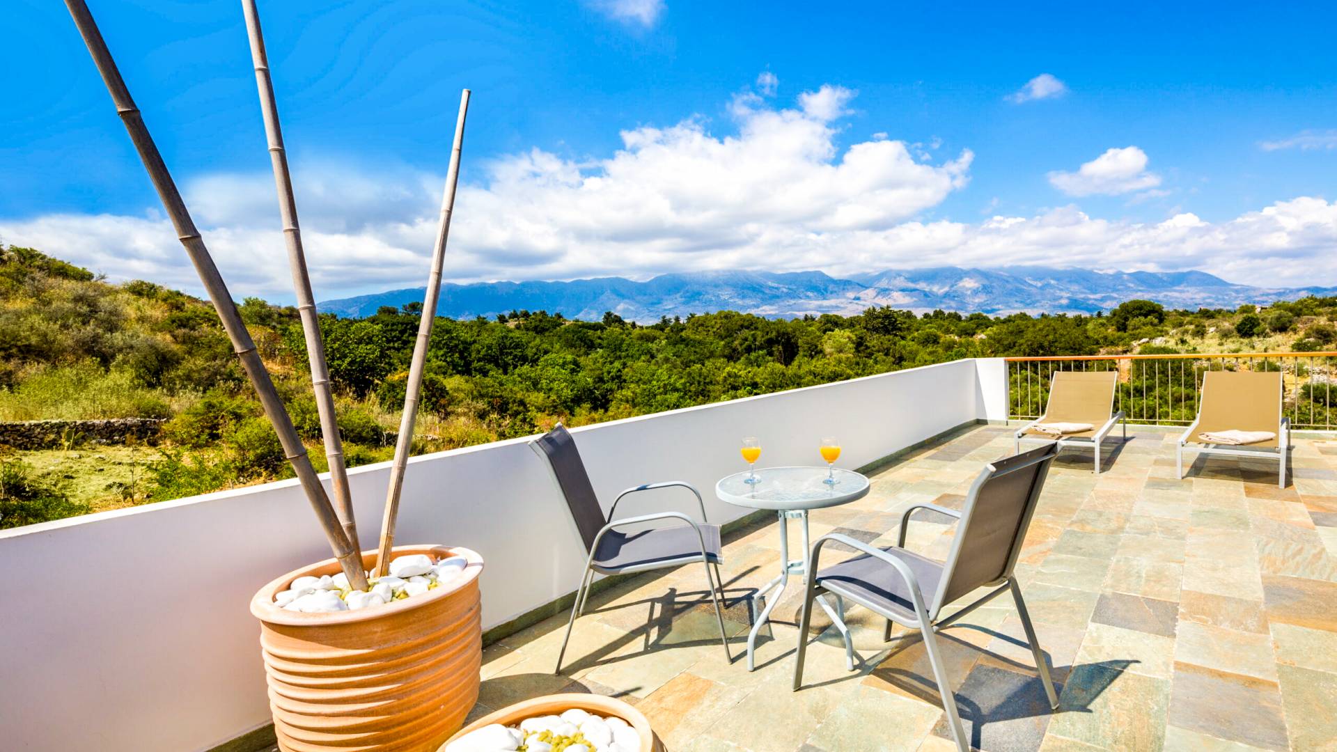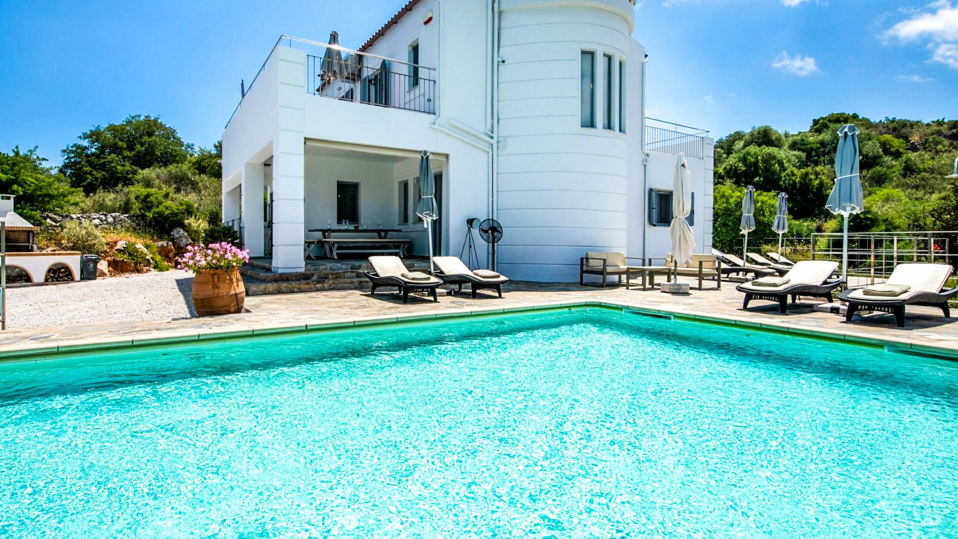 Downstairs there are two Superior bedrooms with fitted wardrobes, air-conditioning, ceiling fan, and exit directly on a private panoramic area fitted with umbrella and sunbeds. Outside there is a new Petanque or Bowling field, a panoramic veranda with a jacuzzi, and a sofa for a relaxing time under the sun. Newly built villa in Vamos, to a very high specification, it’s a contemporary property offering a wealth of superb facilities, including a relaxing jacuzzi, stunning private pool, and spacious sun terrace from which to enjoy wonderful views. The villa is designed to make your vacations a real comfort to make you feel the warmth of genuine hospitality in Crete.
