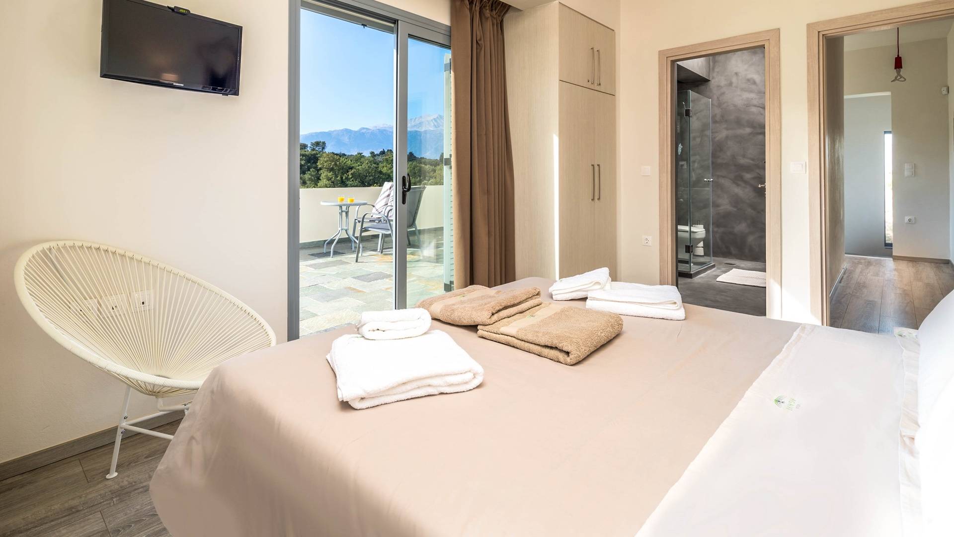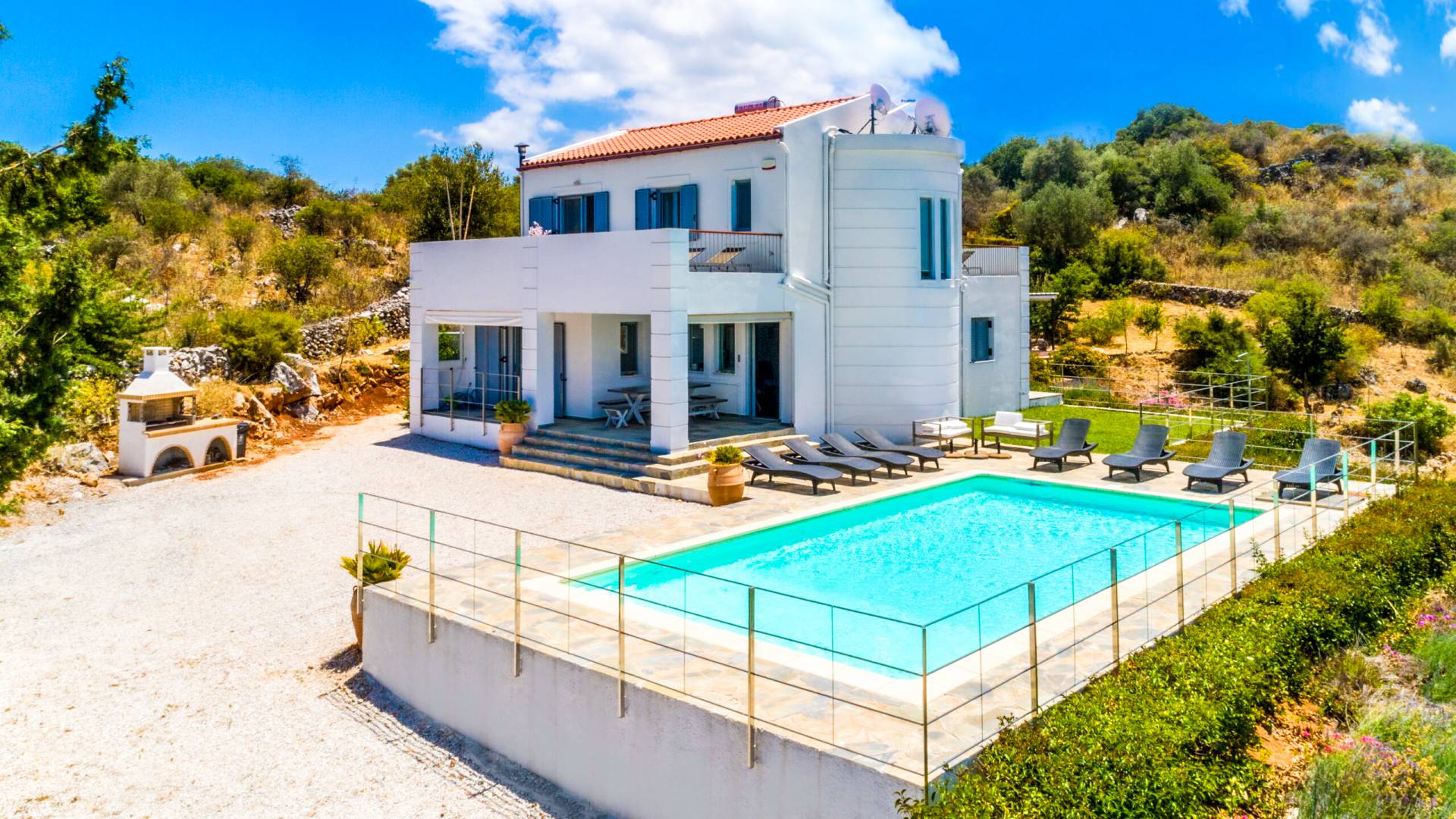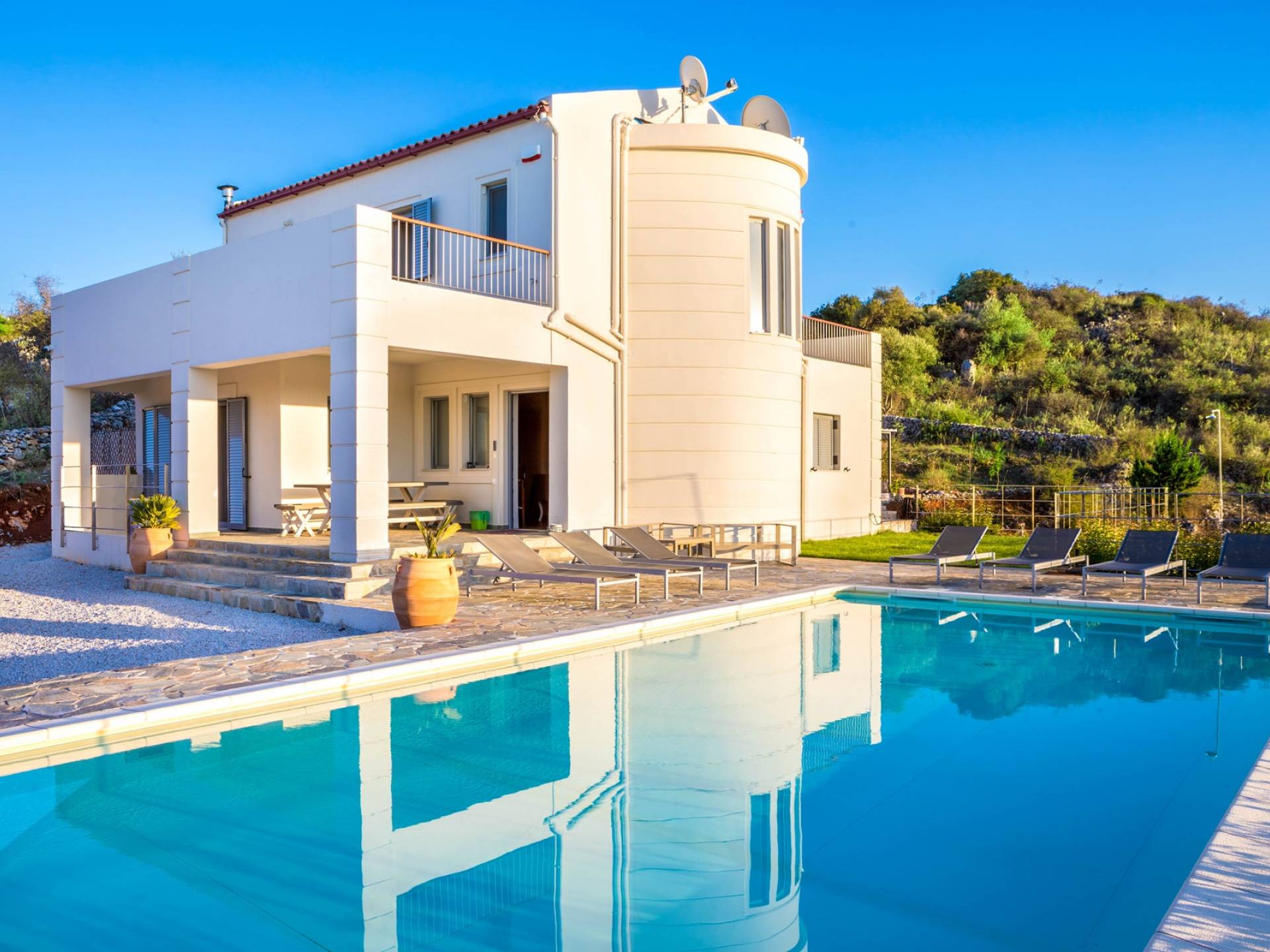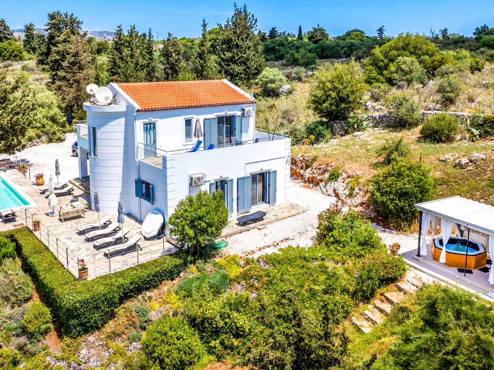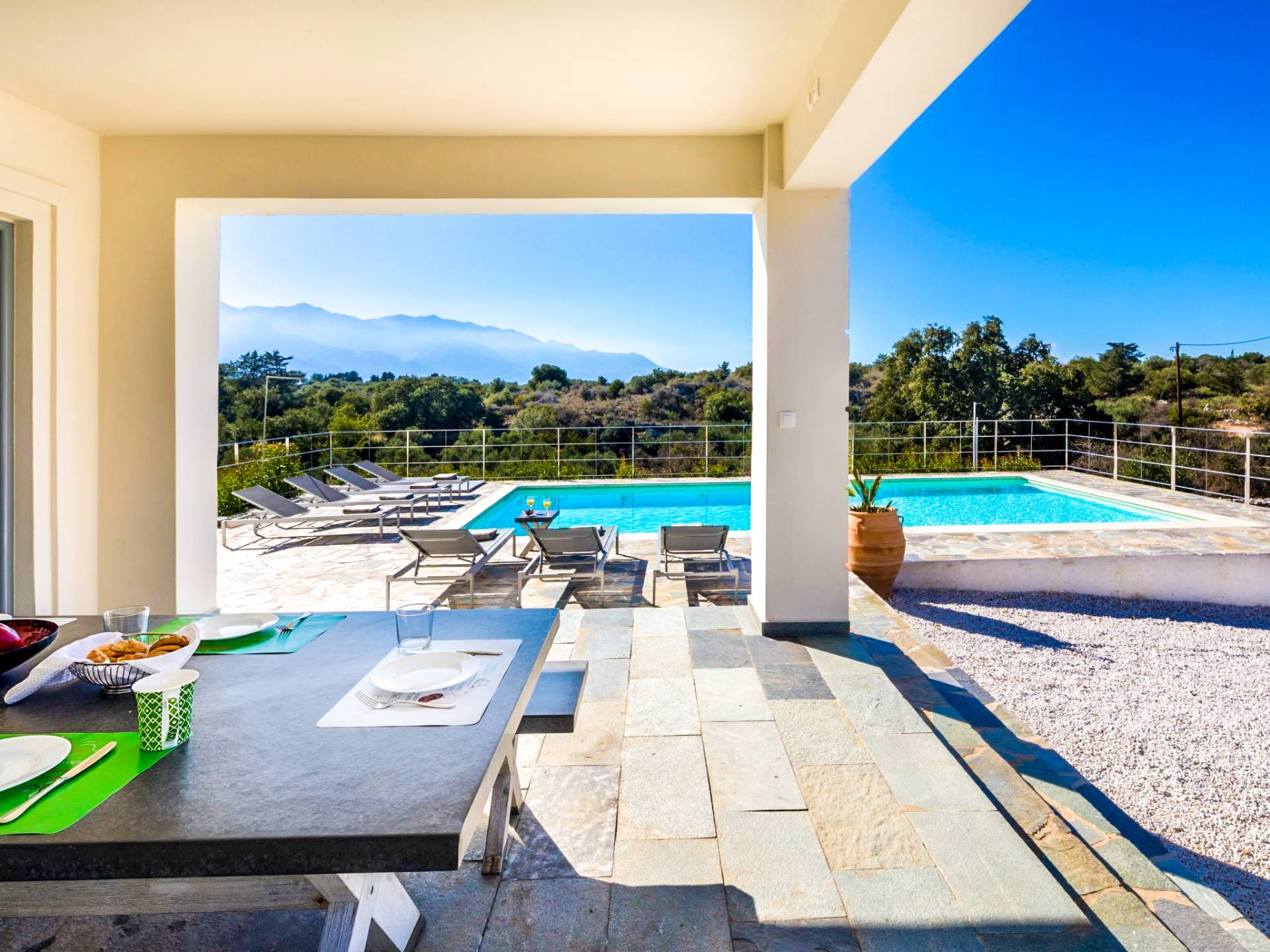 Downstairs there are two Superior bedrooms with fitted wardrobes, air-conditioning, ceiling fan, and exit directly on a private panoramic area fitted with umbrella and sunbeds. Outside there is a new Petanque or Bowling field, a panoramic veranda with a jacuzzi, and a sofa for a relaxing time under the sun. Newly built villa in Vamos, to a very high specification, it’s a contemporary property offering a wealth of superb facilities, including a relaxing jacuzzi, stunning private pool, and spacious sun terrace from which to enjoy wonderful views. The villa is designed to make your vacations a real comfort to make you feel the warmth of genuine hospitality in Crete.