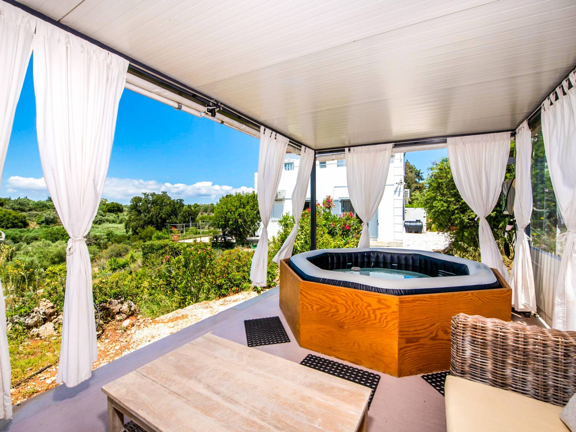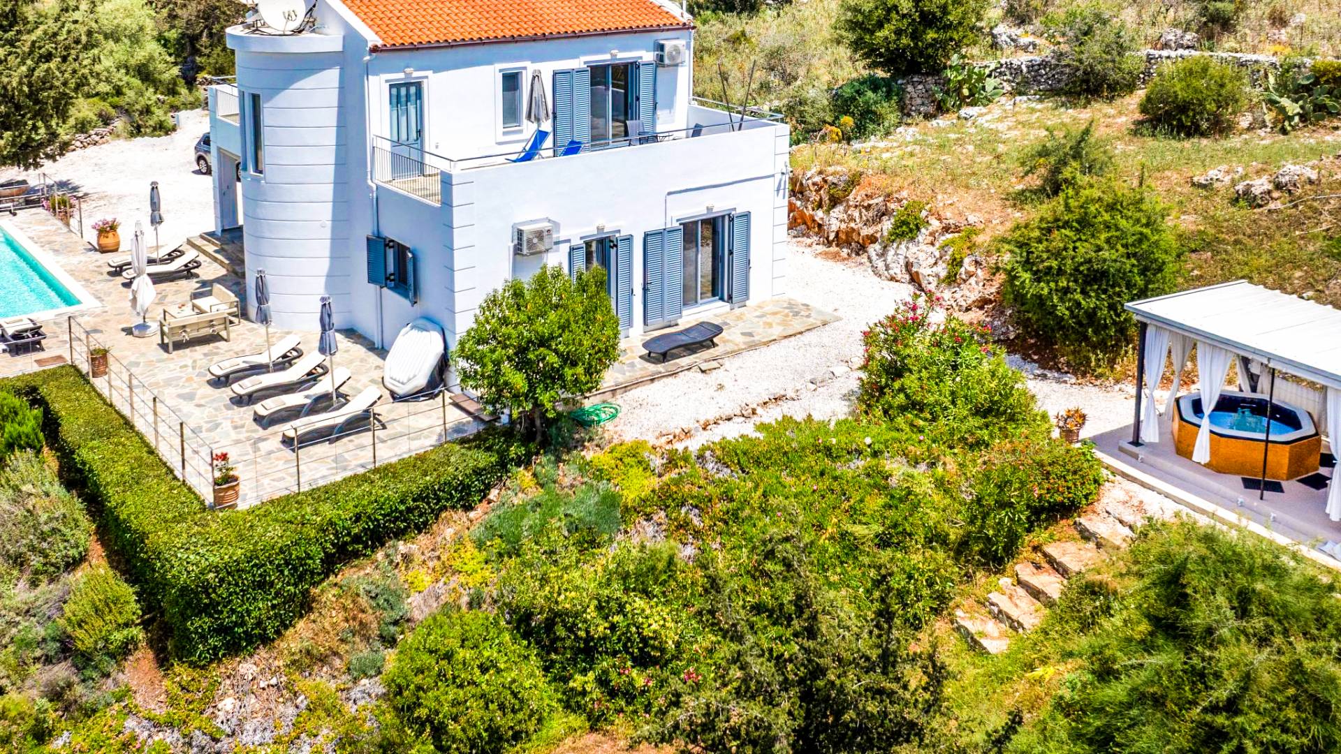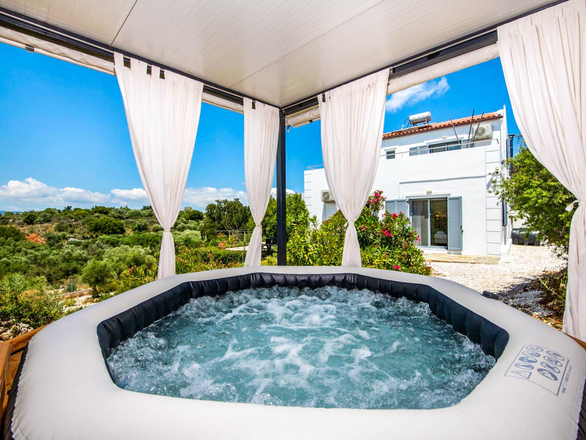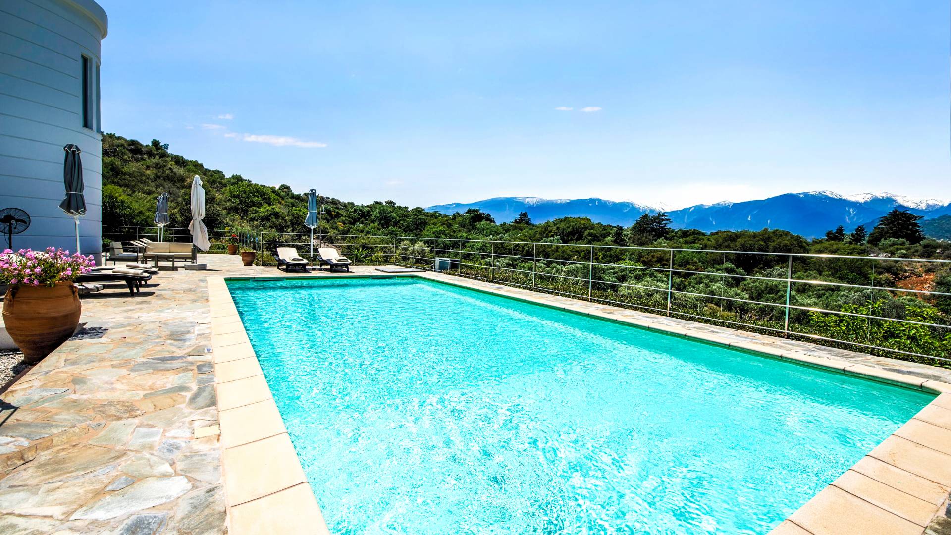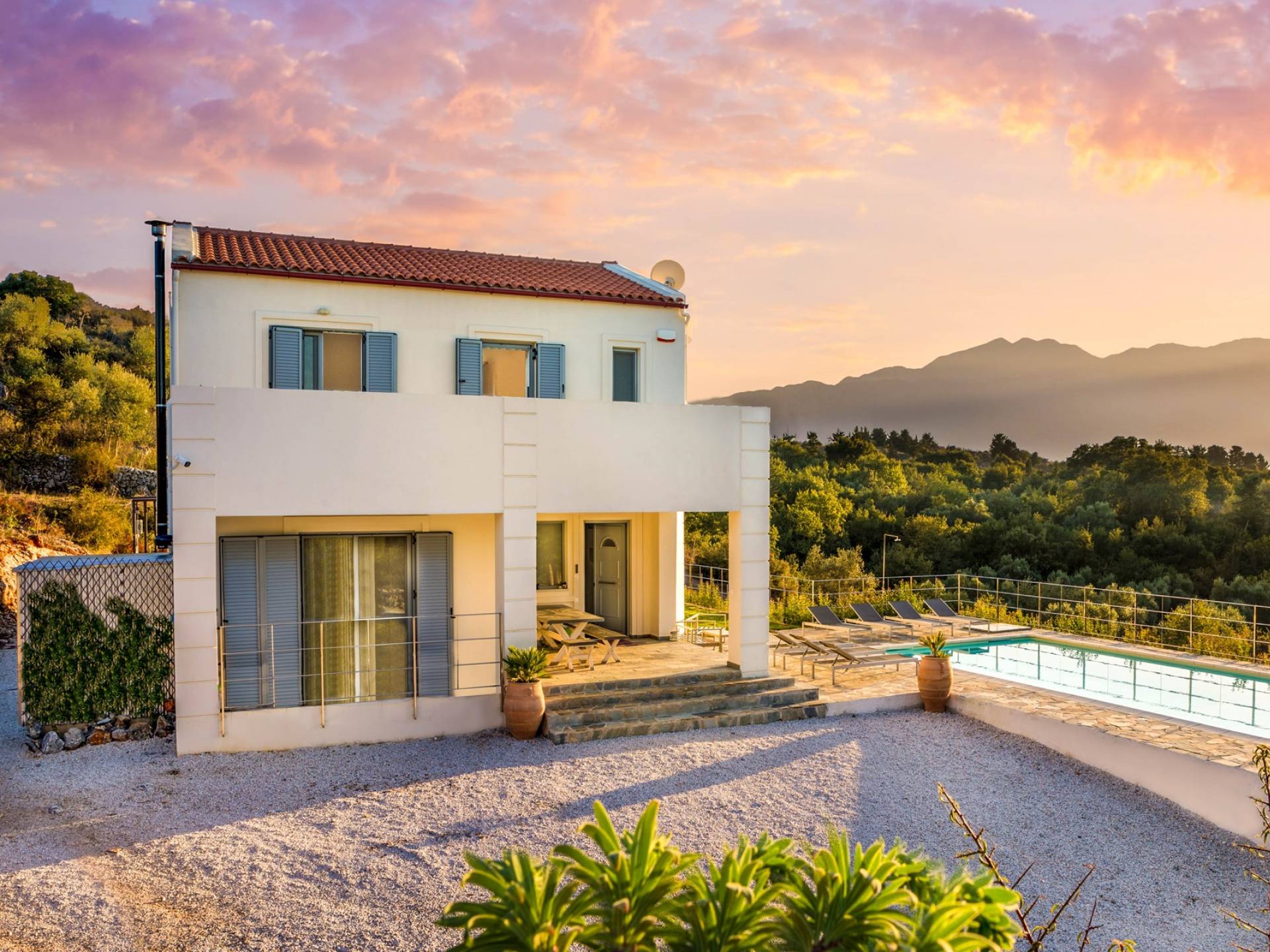 Downstairs there are two Superior bedrooms with fitted wardrobes, air-conditioning, ceiling fan, and exit directly on a private panoramic area fitted with umbrella and sunbeds. Outside there is a new Petanque or Bowling field, a panoramic veranda with a jacuzzi, and a sofa for a relaxing time under the sun. Newly built villa in Vamos, to a very high specification, it’s a contemporary property offering a wealth of superb facilities, including a relaxing jacuzzi, stunning private pool, and spacious sun terrace from which to enjoy wonderful views. The villa is designed to make your vacations a real comfort to make you feel the warmth of genuine hospitality in Crete.