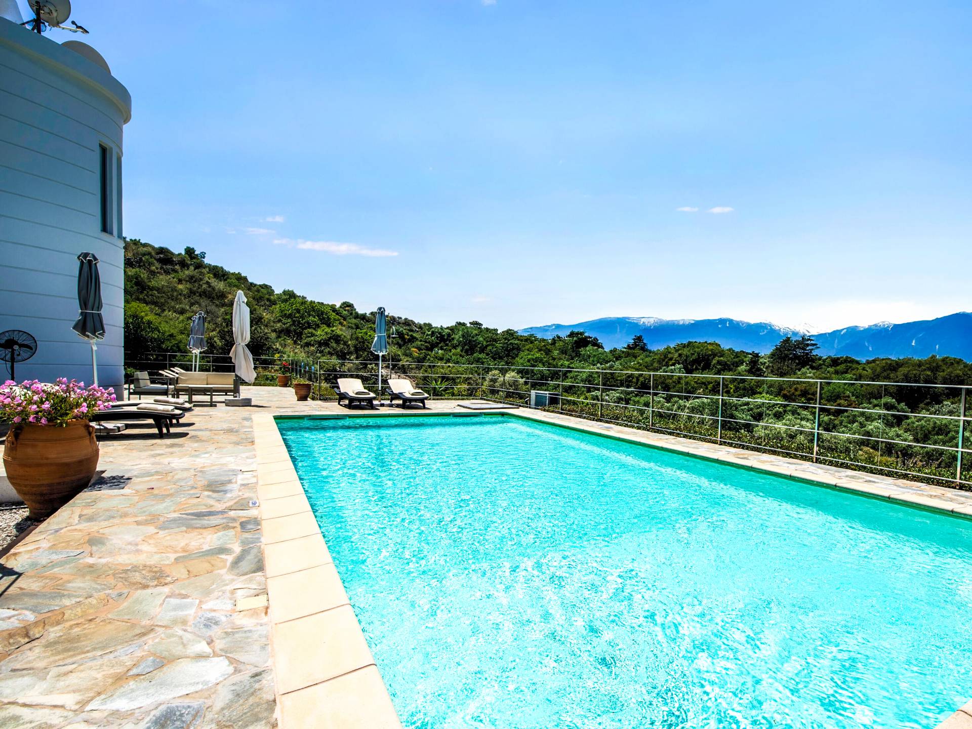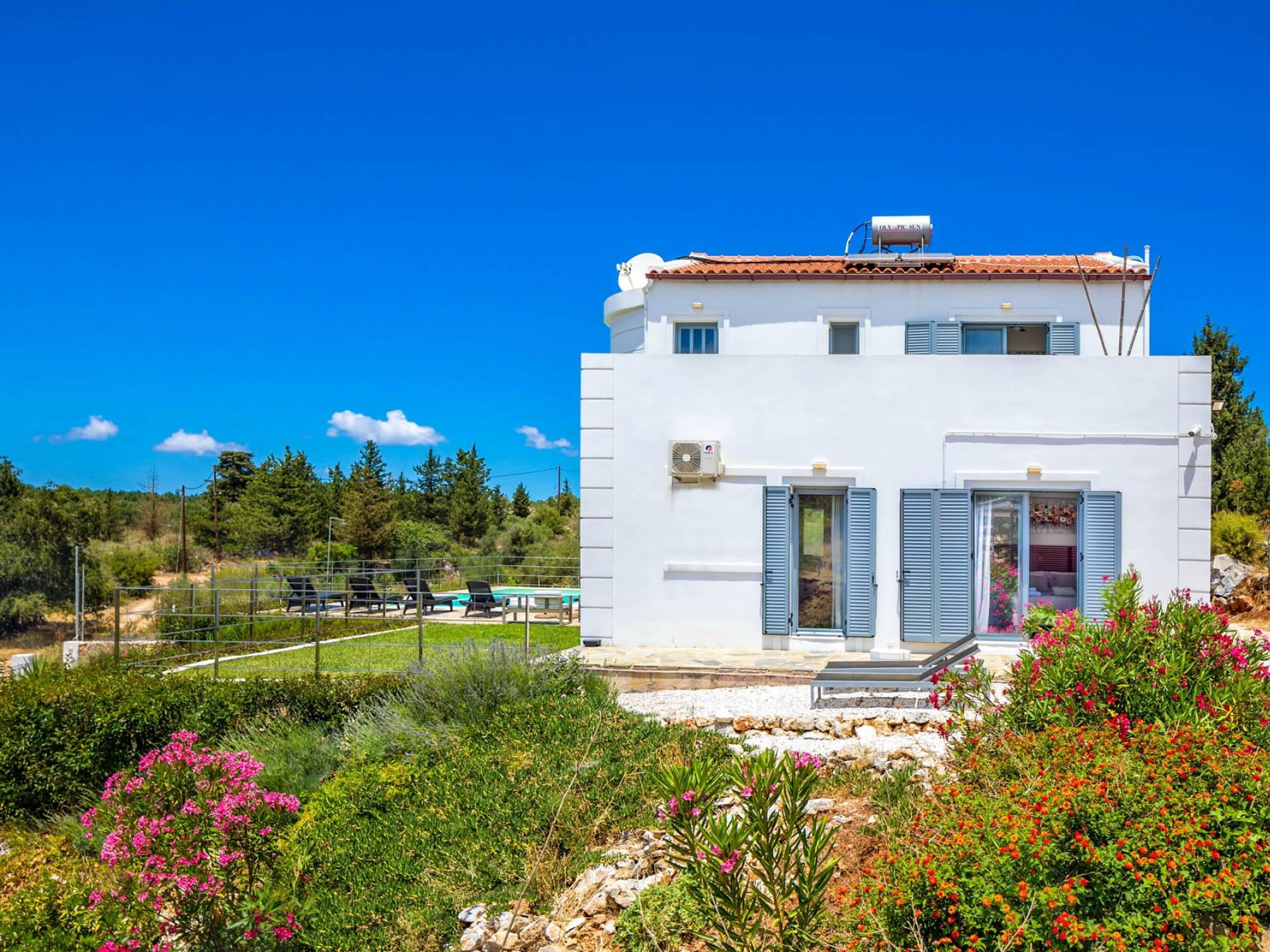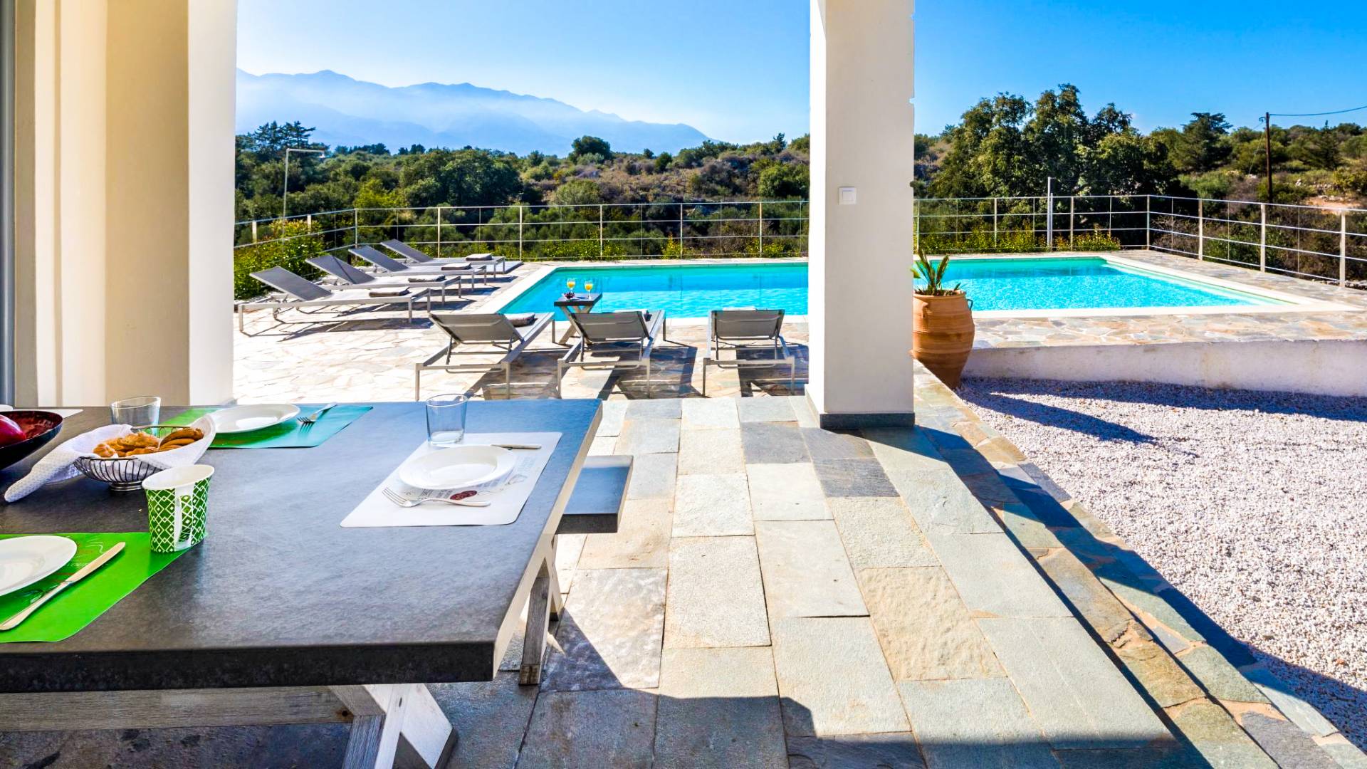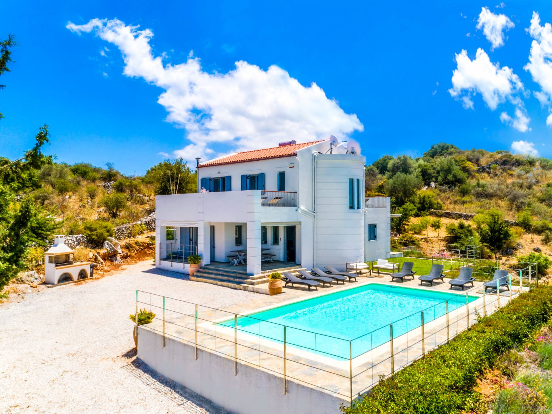 Downstairs there are two Superior bedrooms with fitted wardrobes, air-conditioning, ceiling fan, and exit directly on a private panoramic area fitted with umbrella and sunbeds. Outside there is a new Petanque or Bowling field, a panoramic veranda with a jacuzzi, and a sofa for a relaxing time under the sun. Newly built villa in Vamos, to a very high specification, it’s a contemporary property offering a wealth of superb facilities, including a relaxing jacuzzi, stunning private pool, and spacious sun terrace from which to enjoy wonderful views. The villa is designed to make your vacations a real comfort to make you feel the warmth of genuine hospitality in Crete.