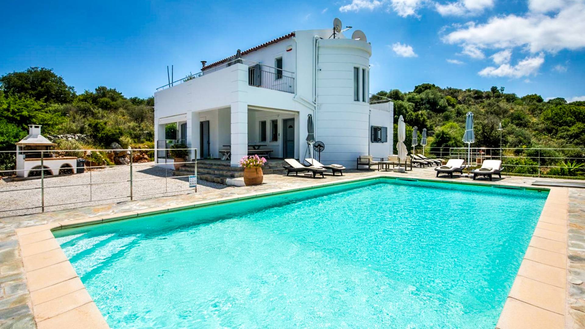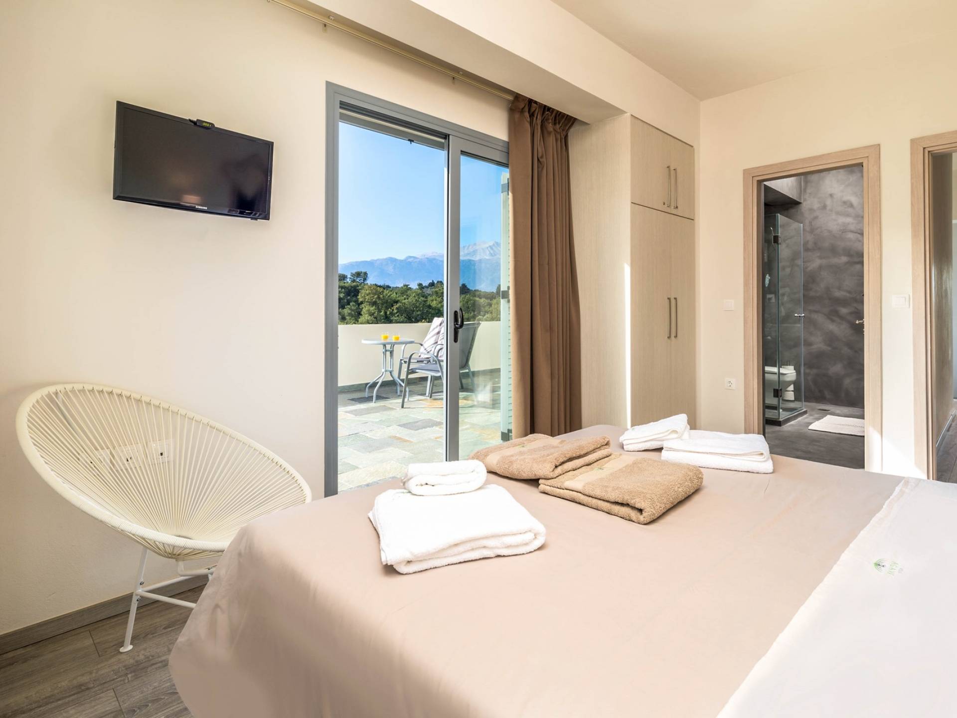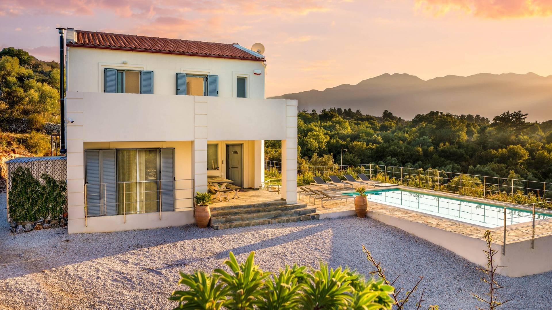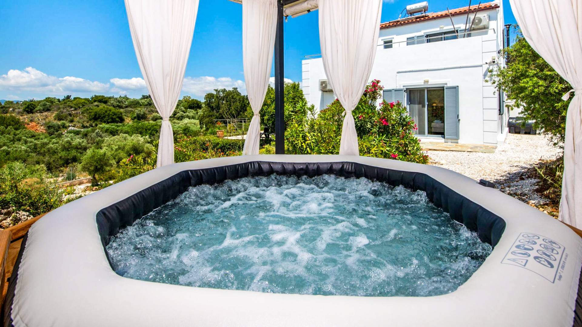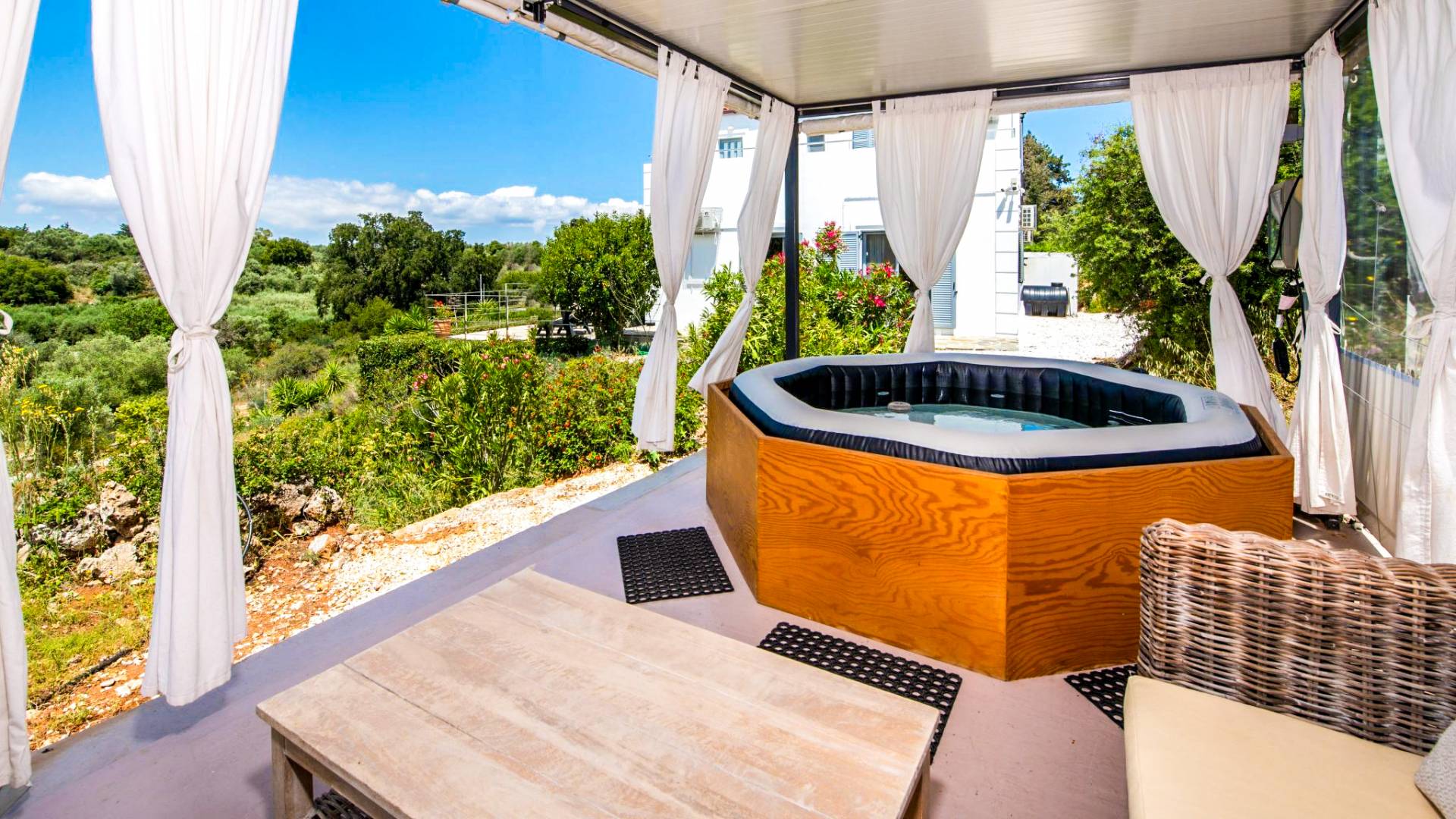 Downstairs there are two Superior bedrooms with fitted wardrobes, air-conditioning, ceiling fan, and exit directly on a private panoramic area fitted with umbrella and sunbeds. Outside there is a new Petanque or Bowling field, a panoramic veranda with a jacuzzi, and a sofa for a relaxing time under the sun. Newly built villa in Vamos, to a very high specification, it’s a contemporary property offering a wealth of superb facilities, including a relaxing jacuzzi, stunning private pool, and spacious sun terrace from which to enjoy wonderful views. The villa is designed to make your vacations a real comfort to make you feel the warmth of genuine hospitality in Crete.