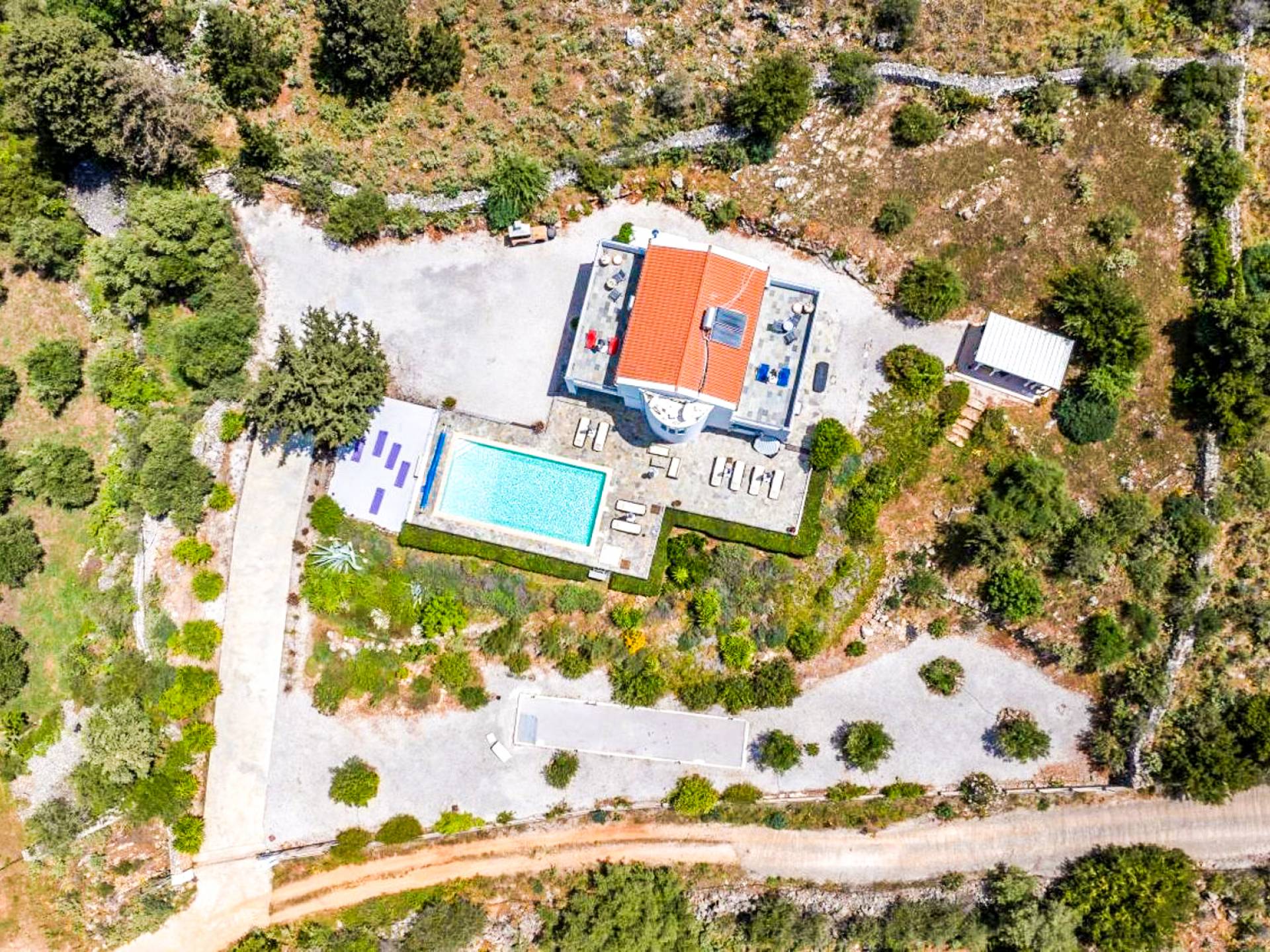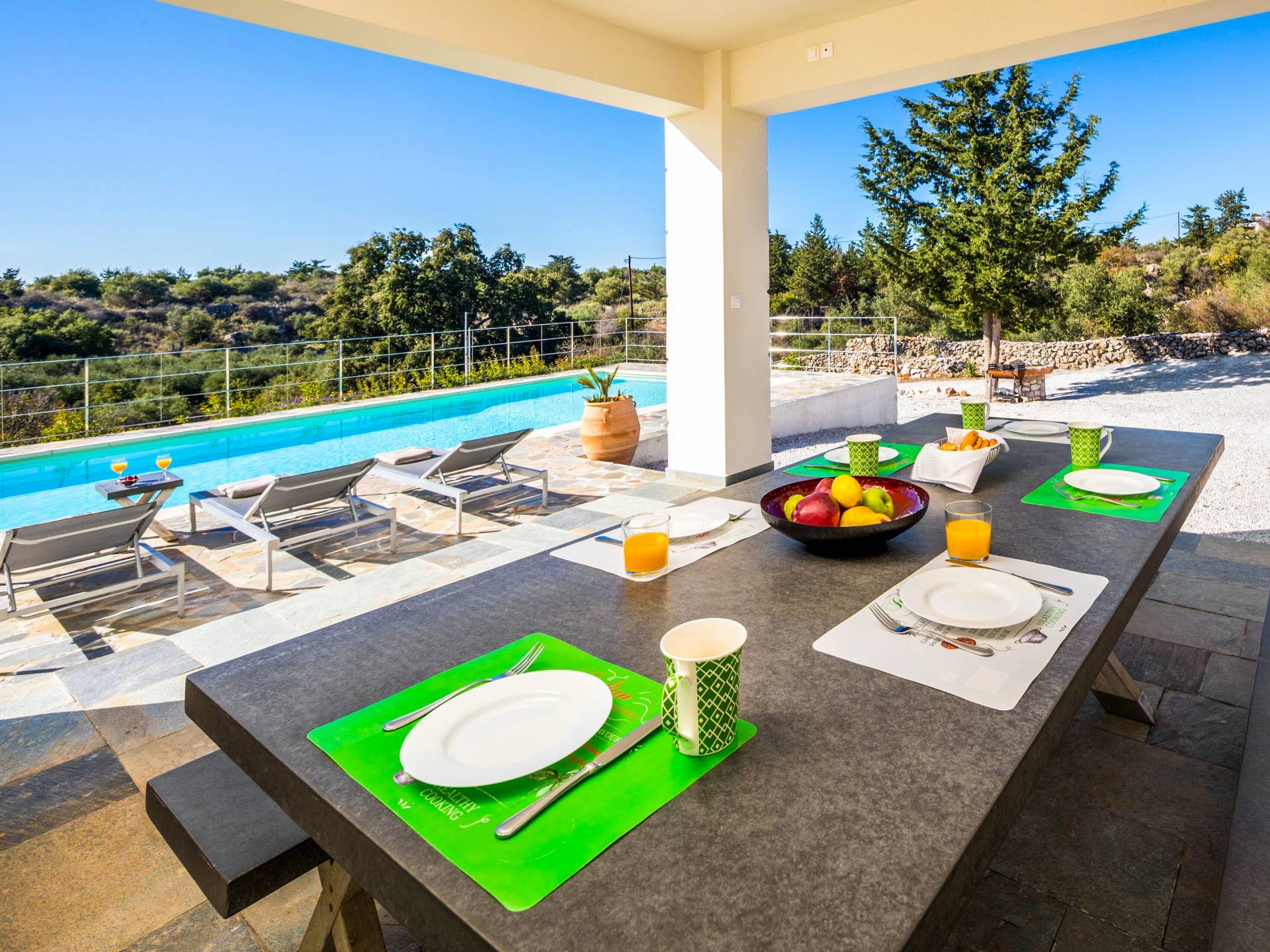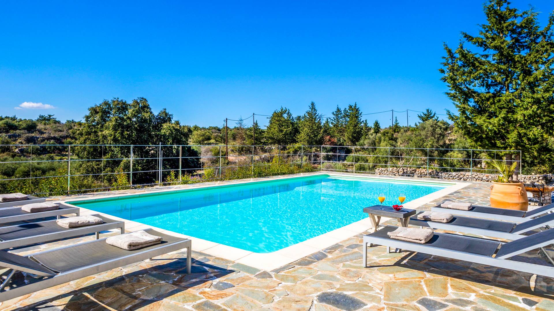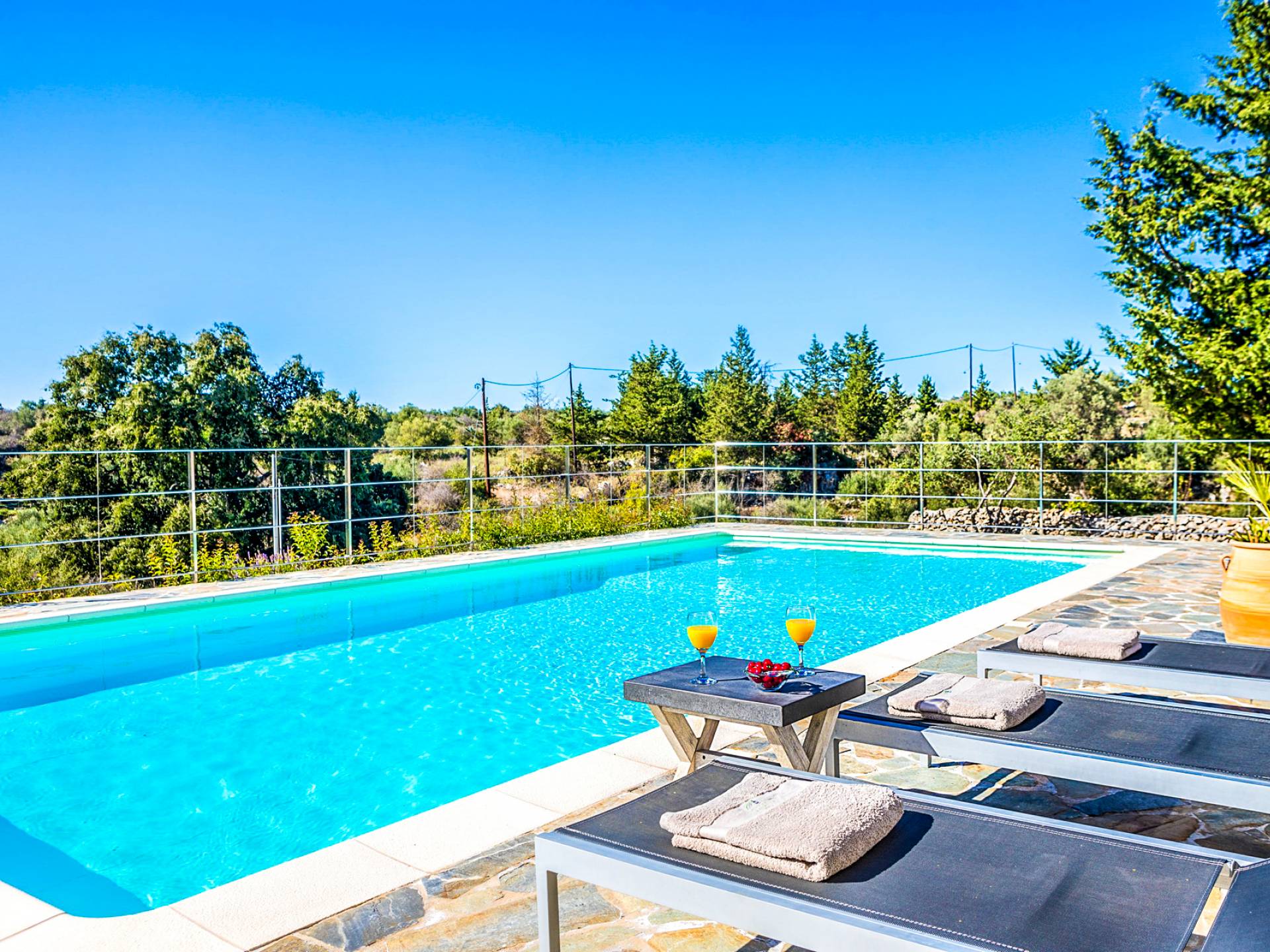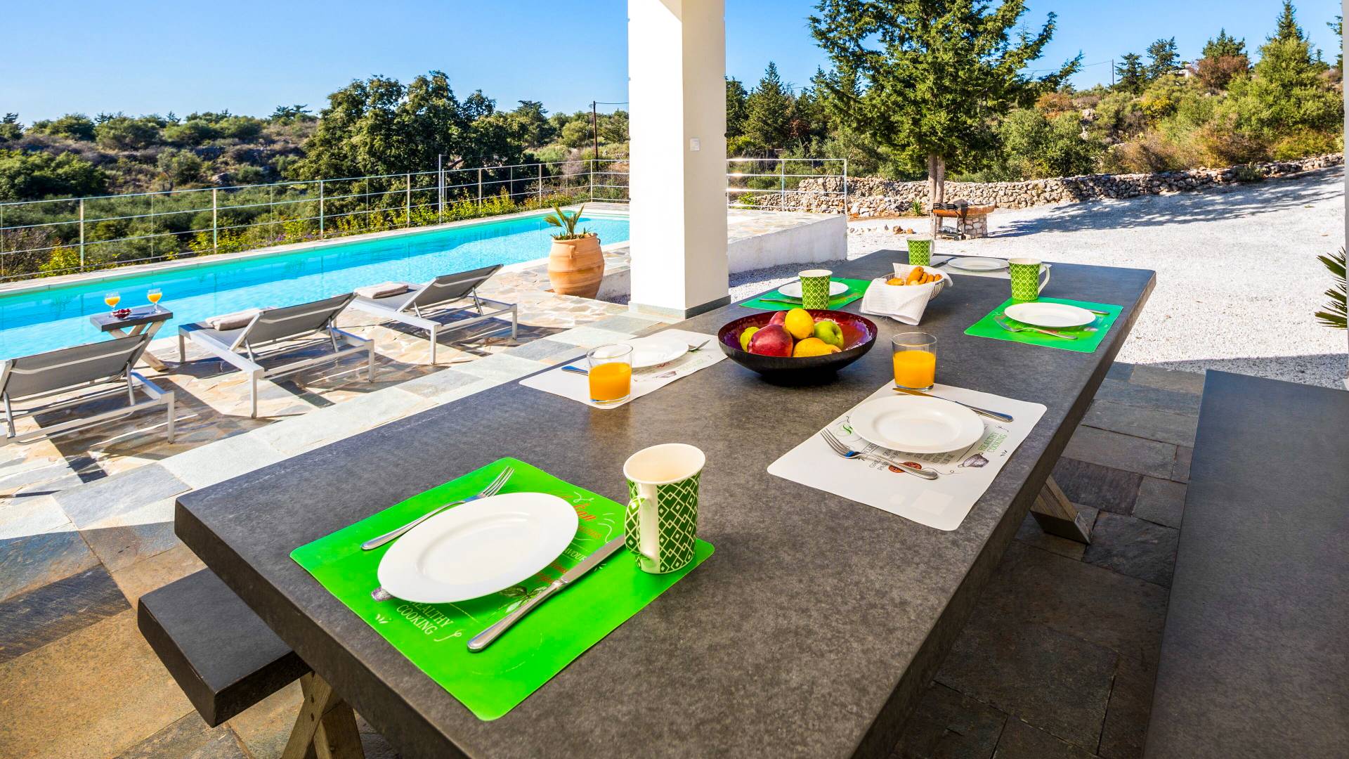 Downstairs there are two Superior bedrooms with fitted wardrobes, air-conditioning, ceiling fan, and exit directly on a private panoramic area fitted with umbrella and sunbeds. Outside there is a new Petanque or Bowling field, a panoramic veranda with a jacuzzi, and a sofa for a relaxing time under the sun. Newly built villa in Vamos, to a very high specification, it’s a contemporary property offering a wealth of superb facilities, including a relaxing jacuzzi, stunning private pool, and spacious sun terrace from which to enjoy wonderful views. The villa is designed to make your vacations a real comfort to make you feel the warmth of genuine hospitality in Crete.