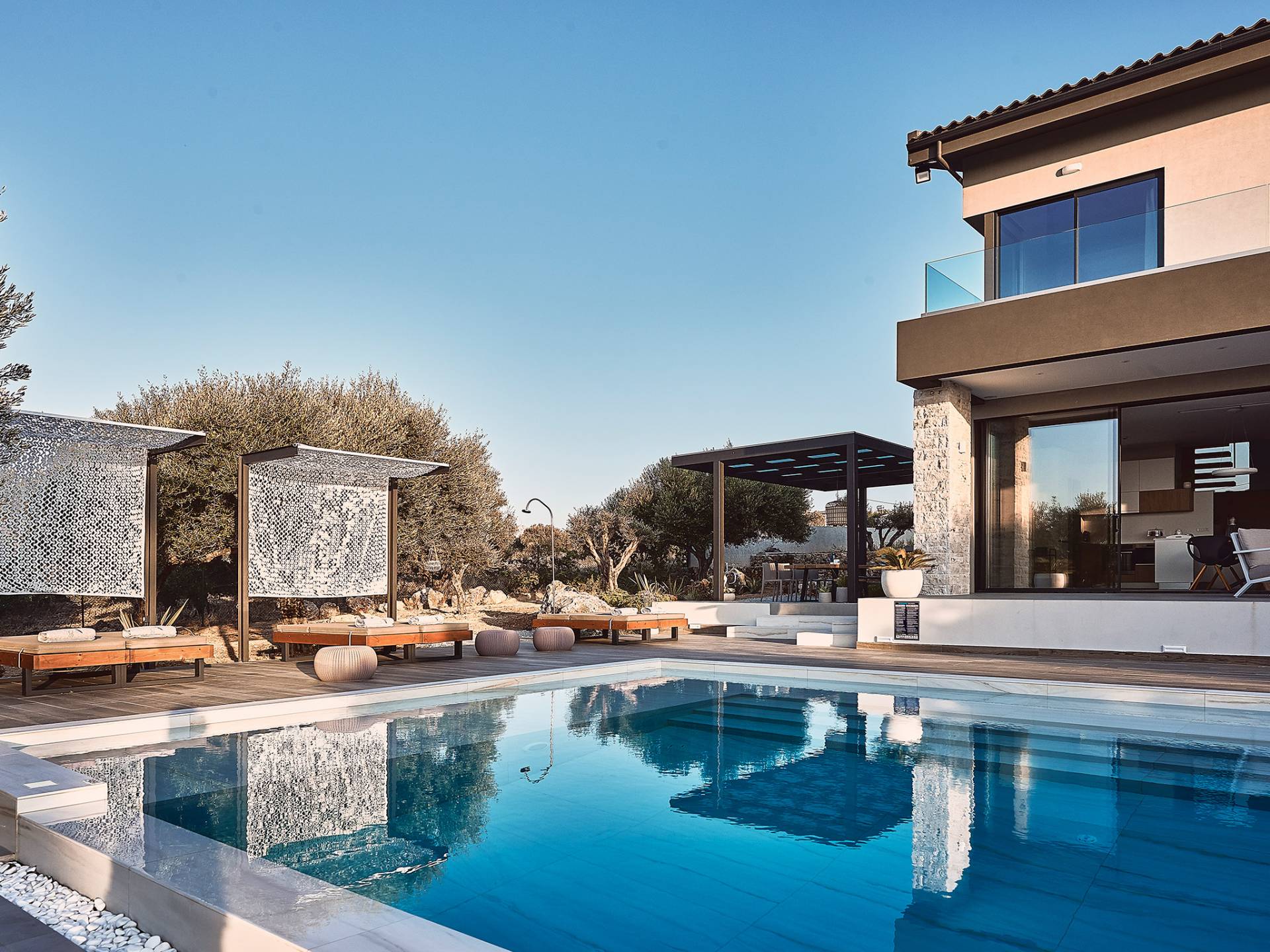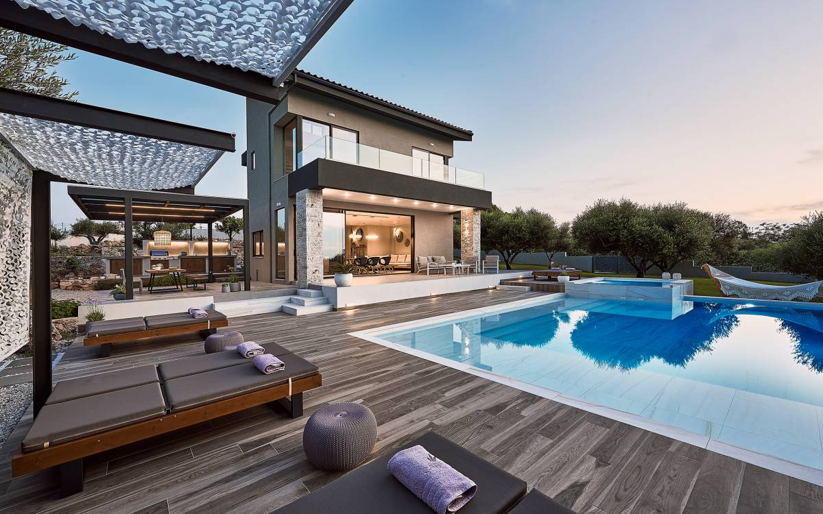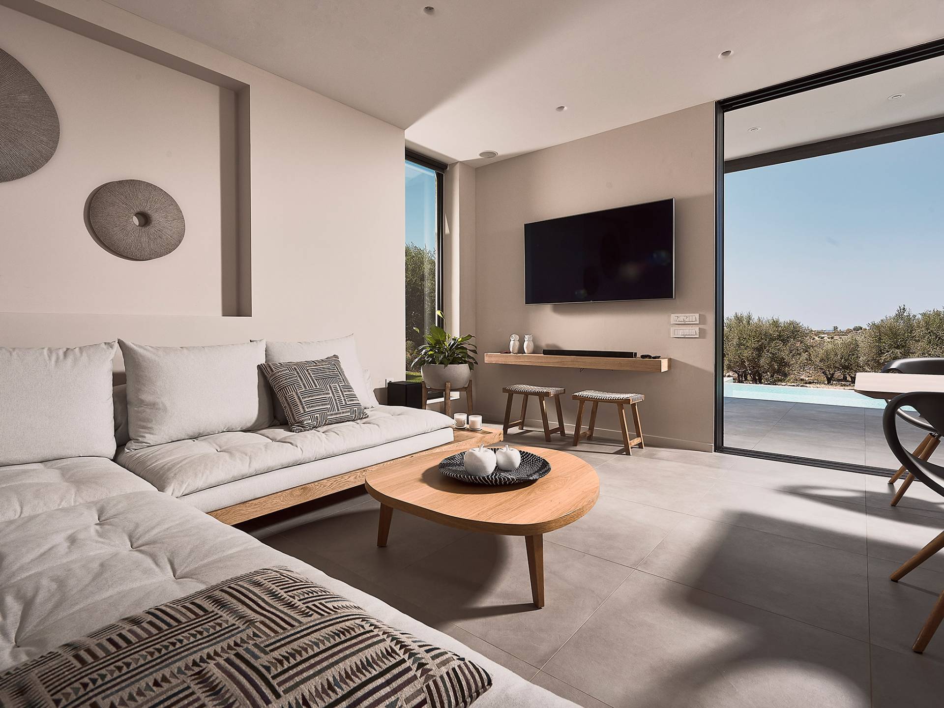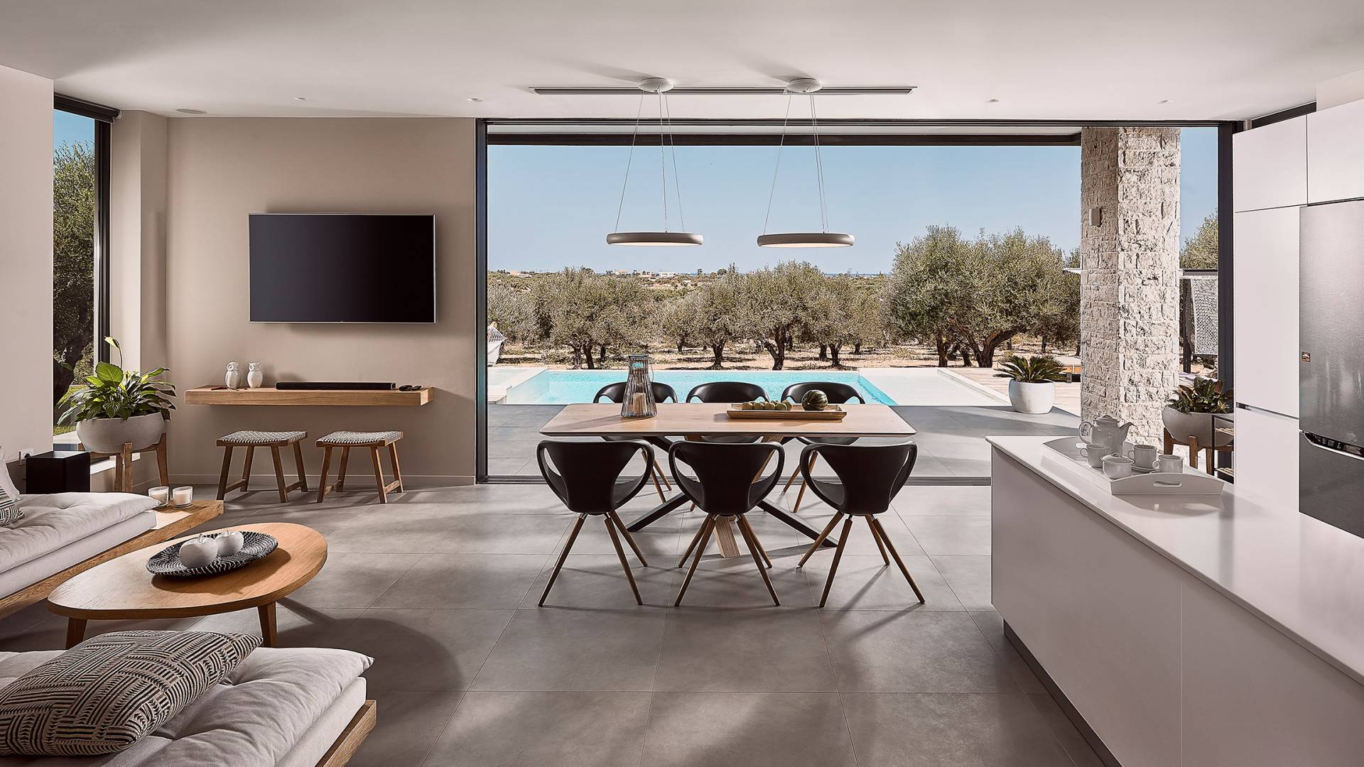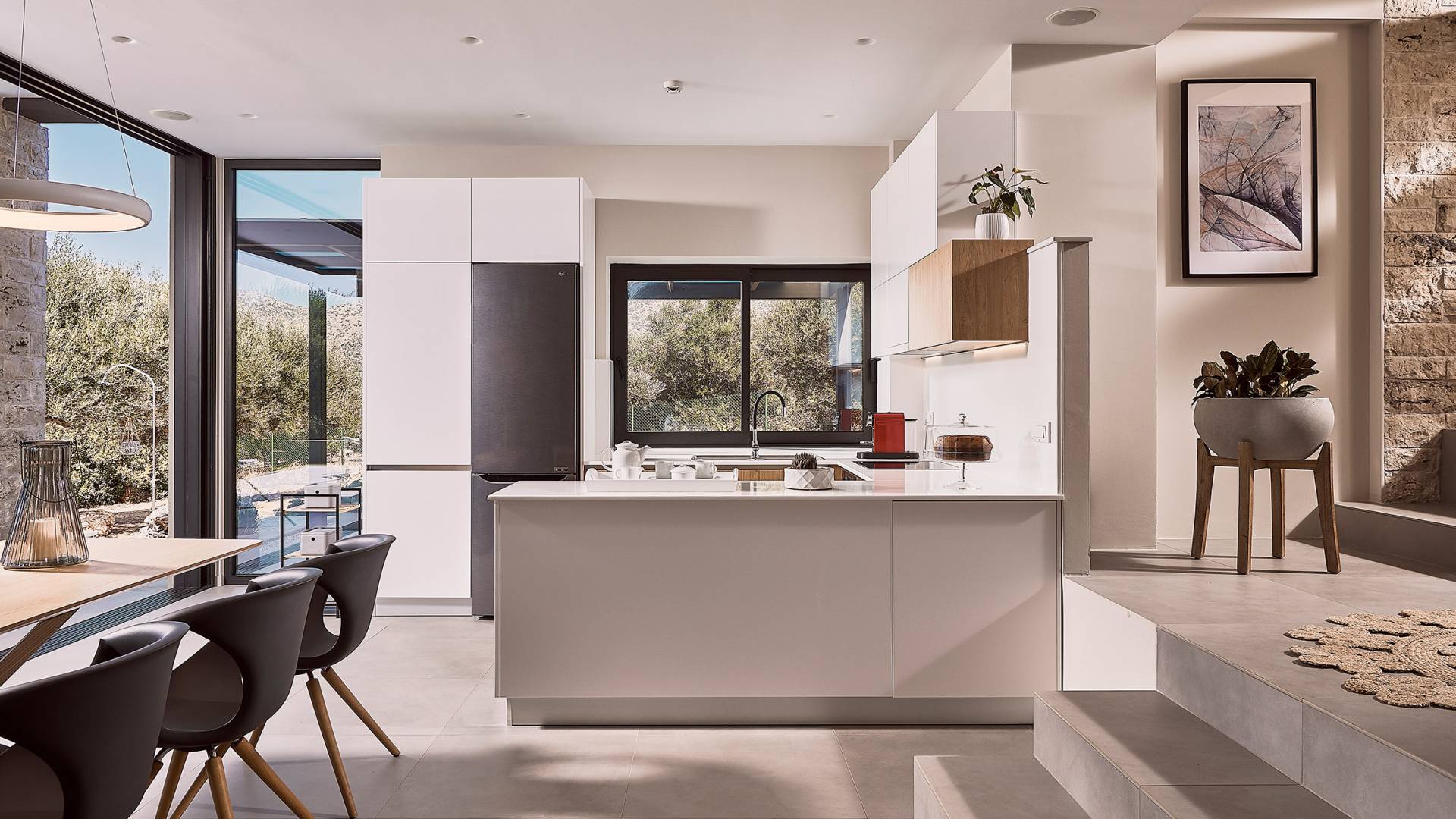 Al ingresar a la Villa, se encontrarán en un área espaciosa y diáfana que consta de la sala de estar y la cocina. La sala de estar cuenta con un cómodo sofá esquinero, un televisor de alta definición de 65 pulgadas con Netflix, cine en casa y un altavoz Bluetooth, así como un área de comedor interior, que disfruta de hermosas vistas de la naturaleza de los olivos, mientras que la cocina totalmente equipada ofrece todo lo esencial para una vida independiente. -vacaciones atendidas. Las grandes ventanas y puertas del piso al techo brindan una amplia iluminación y un fácil acceso a la terraza, así como a las áreas de la piscina y la barbacoa.