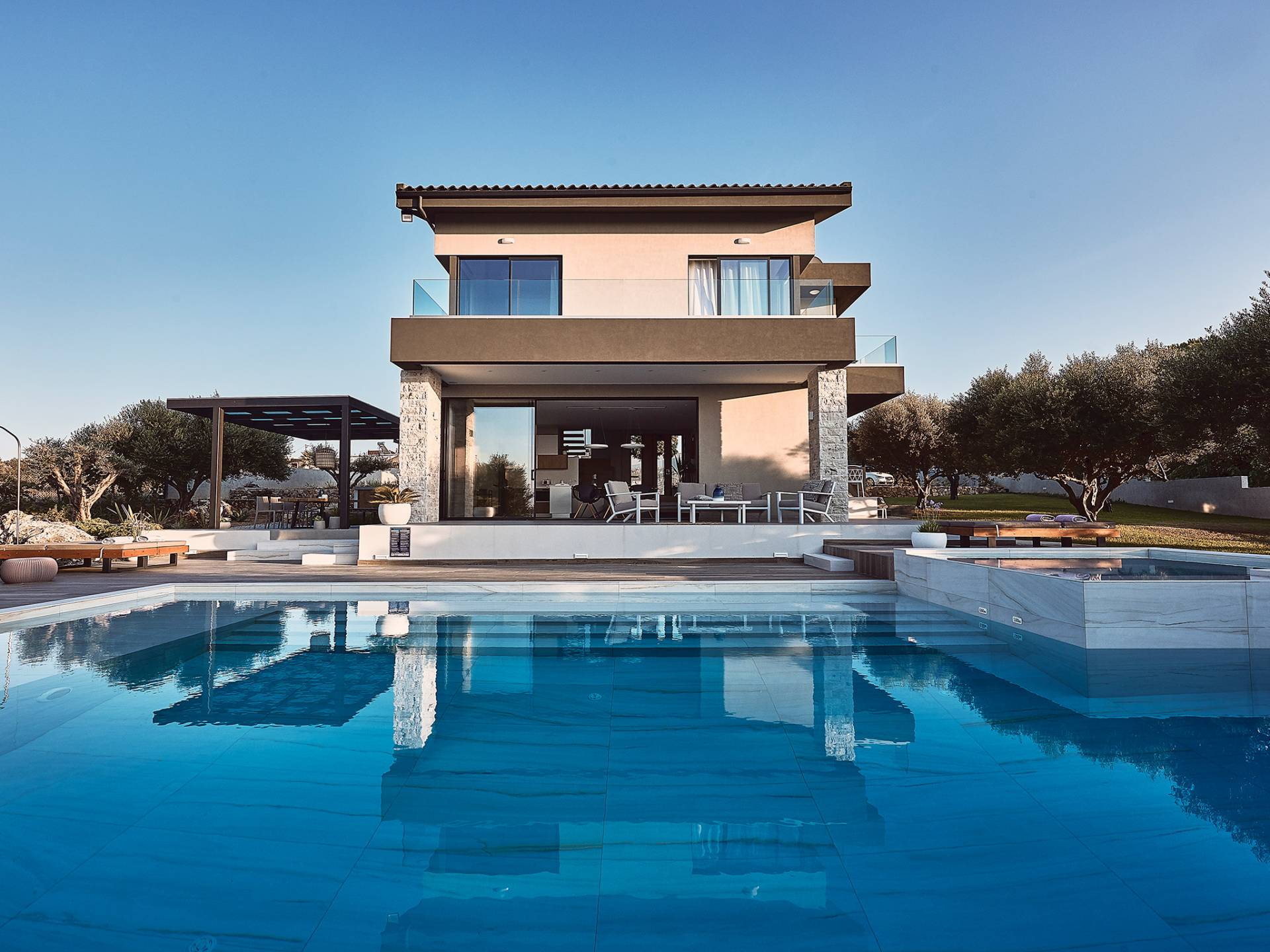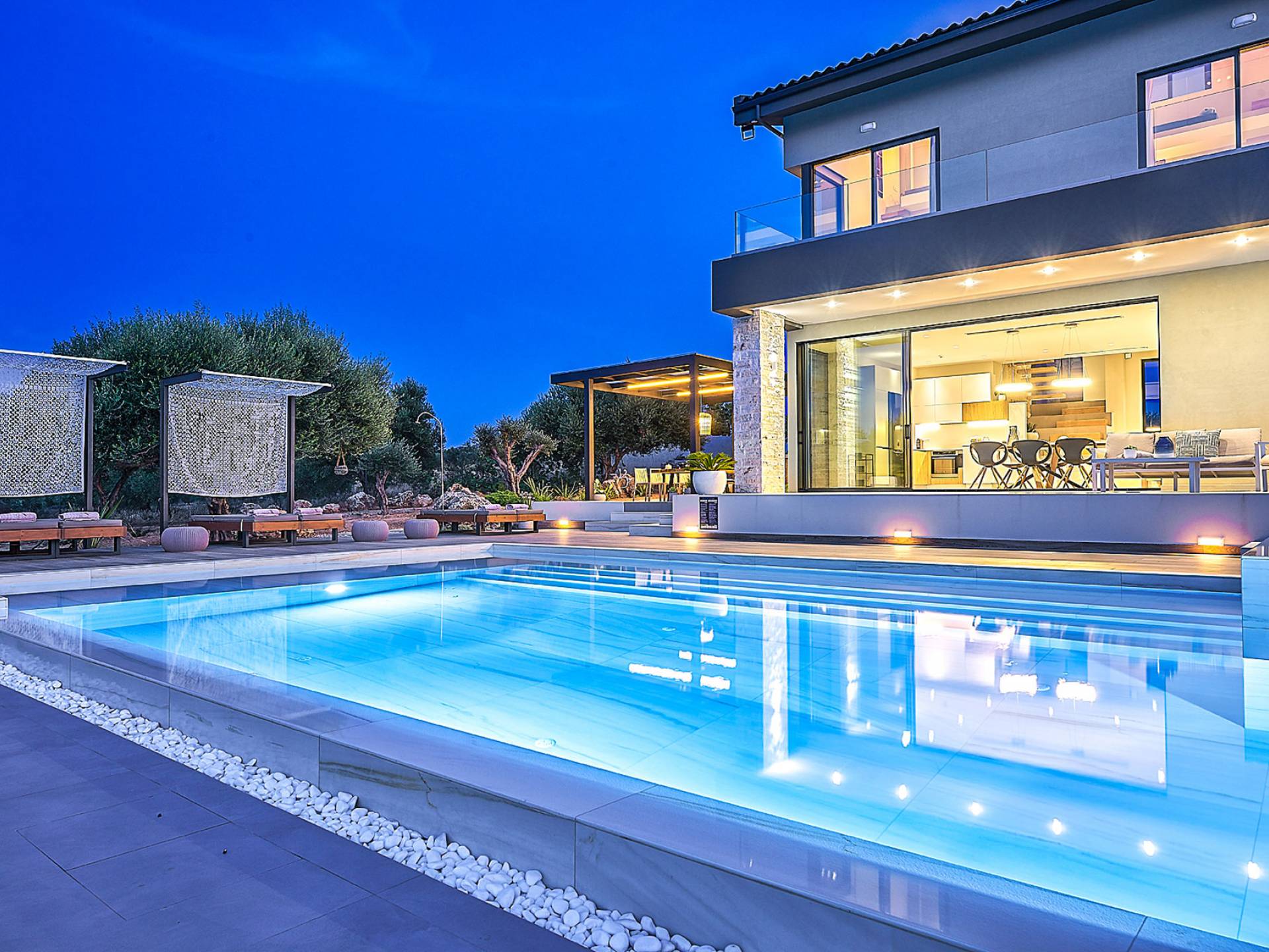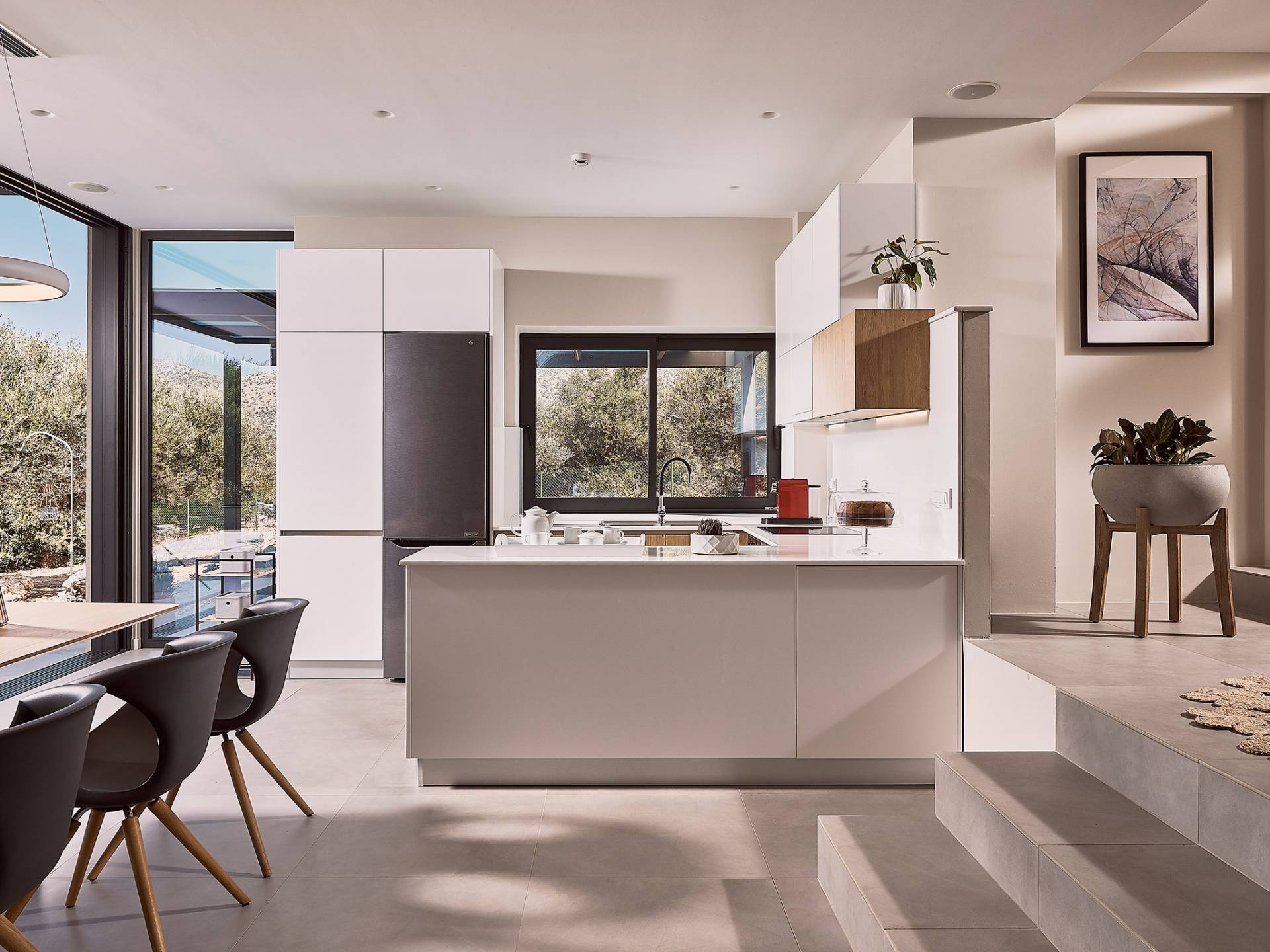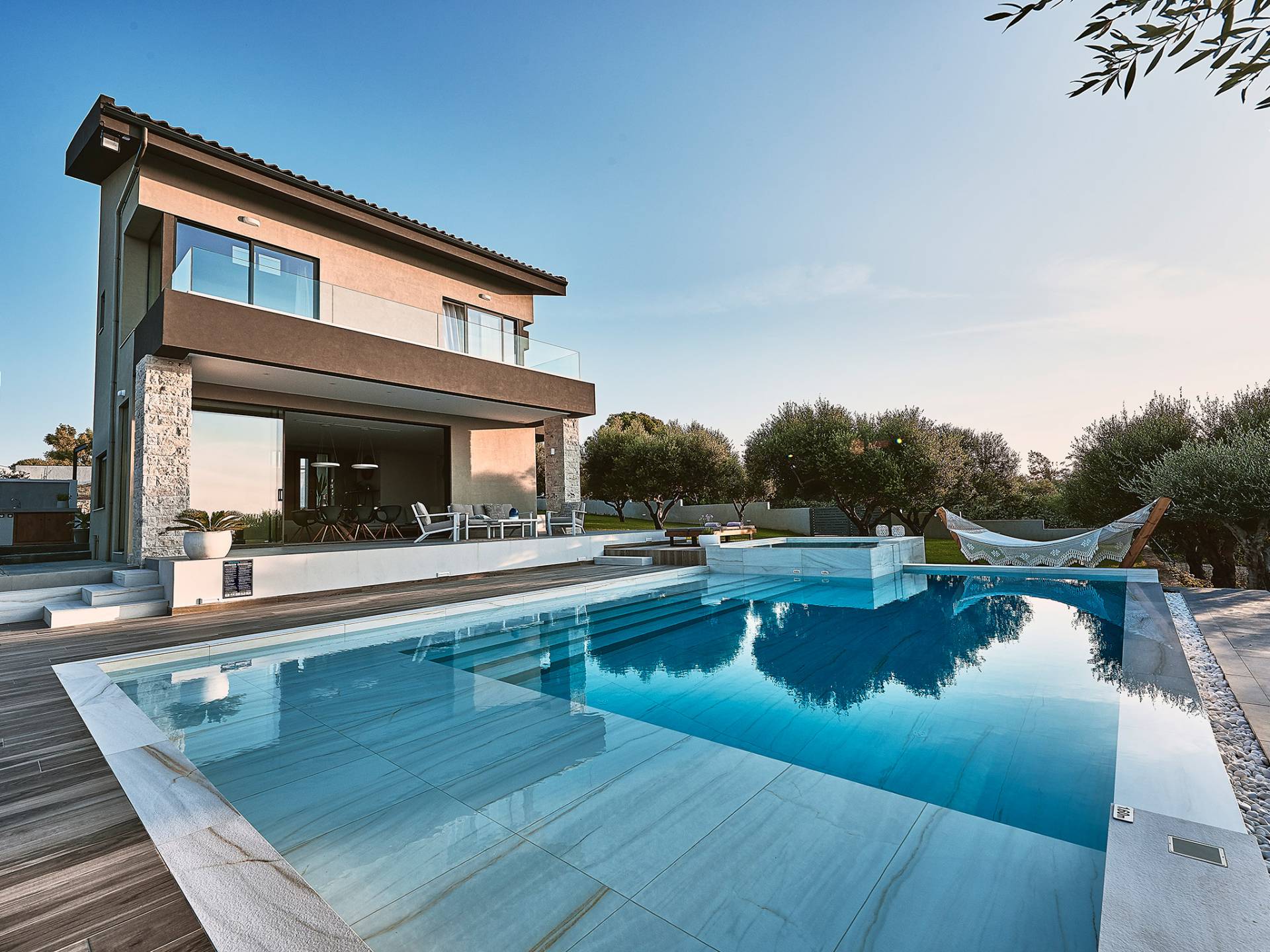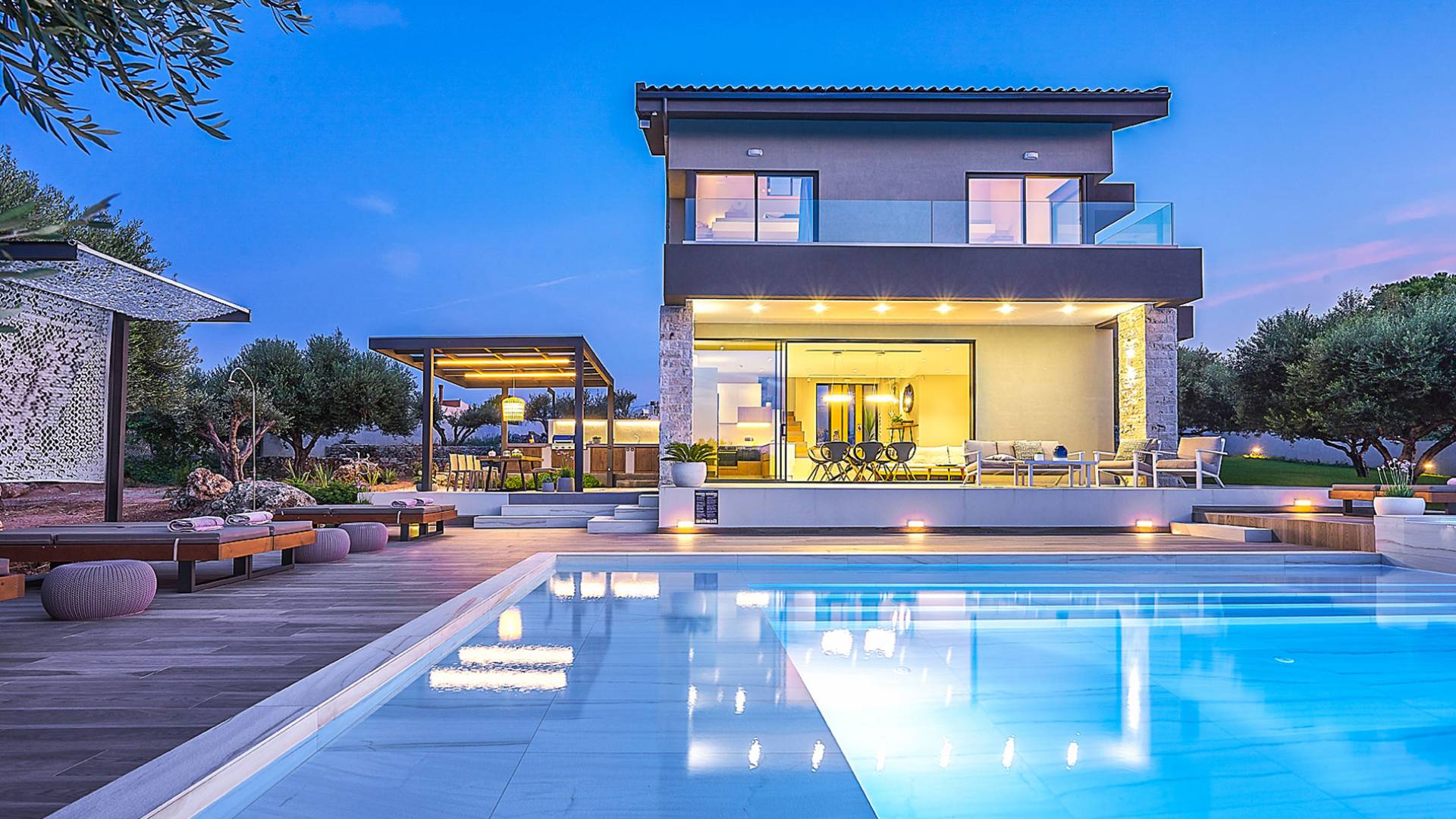 Al ingresar a la Villa, se encontrarán en un área espaciosa y diáfana que consta de la sala de estar y la cocina. La sala de estar cuenta con un cómodo sofá esquinero, un televisor de alta definición de 65 pulgadas con Netflix, cine en casa y un altavoz Bluetooth, así como un área de comedor interior, que disfruta de hermosas vistas de la naturaleza de los olivos, mientras que la cocina totalmente equipada ofrece todo lo esencial para una vida independiente. -vacaciones atendidas. Las grandes ventanas y puertas del piso al techo brindan una amplia iluminación y un fácil acceso a la terraza, así como a las áreas de la piscina y la barbacoa.
